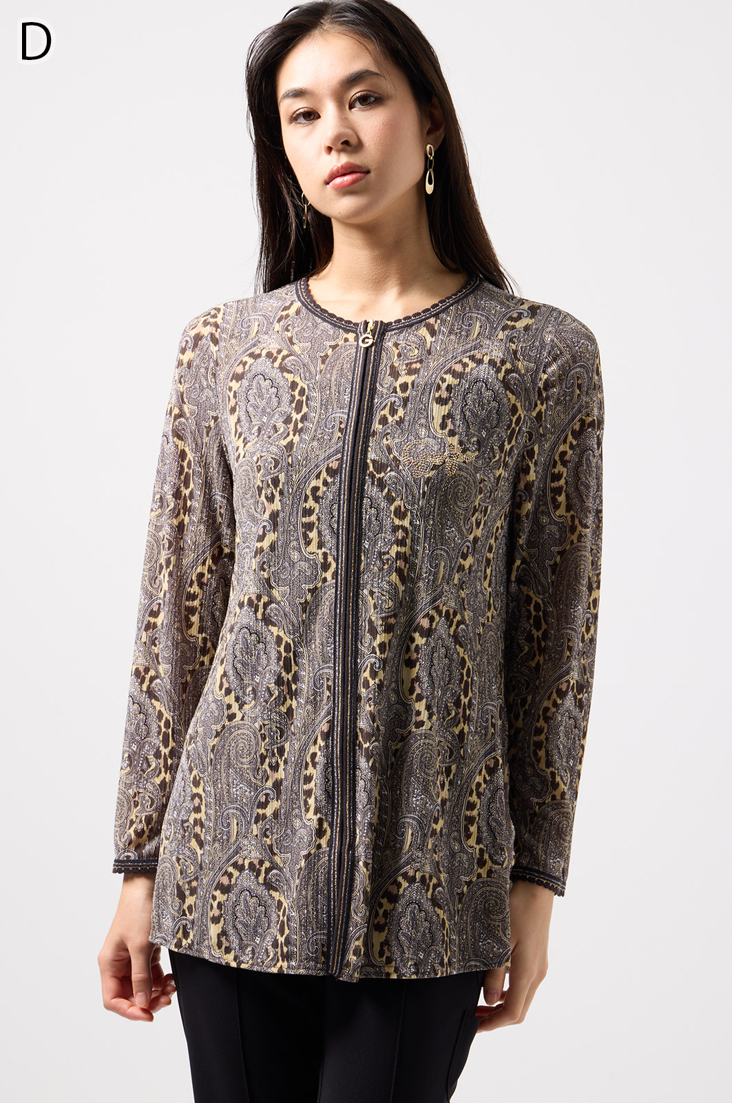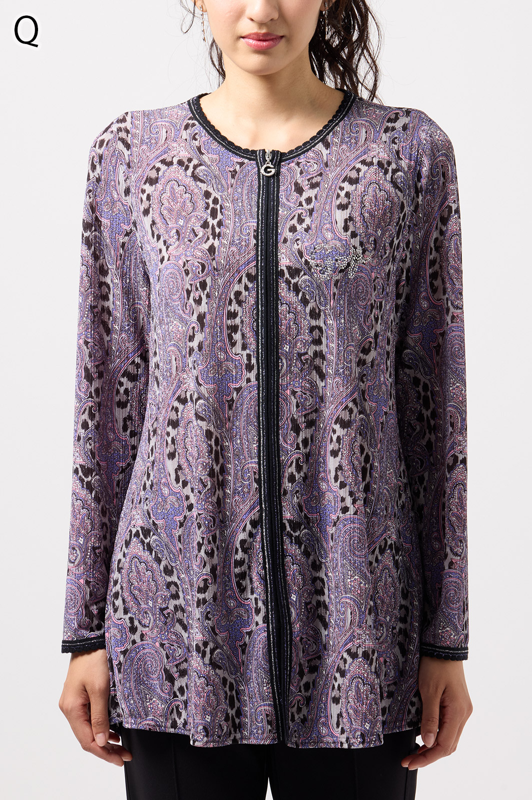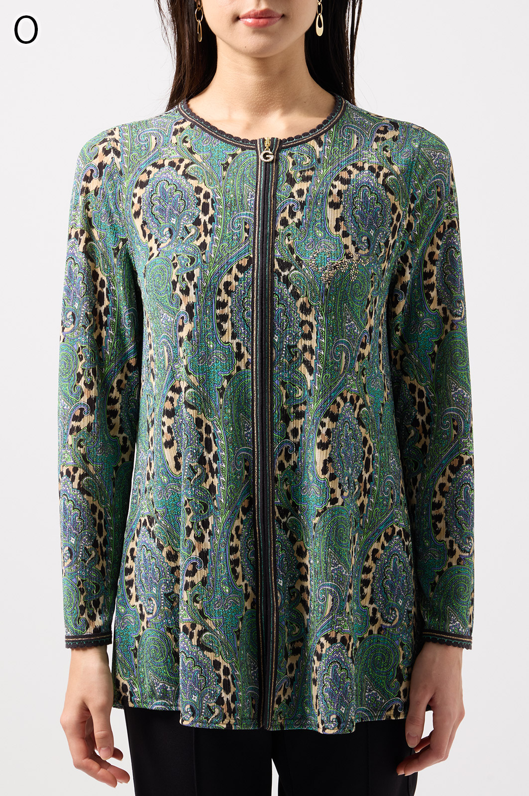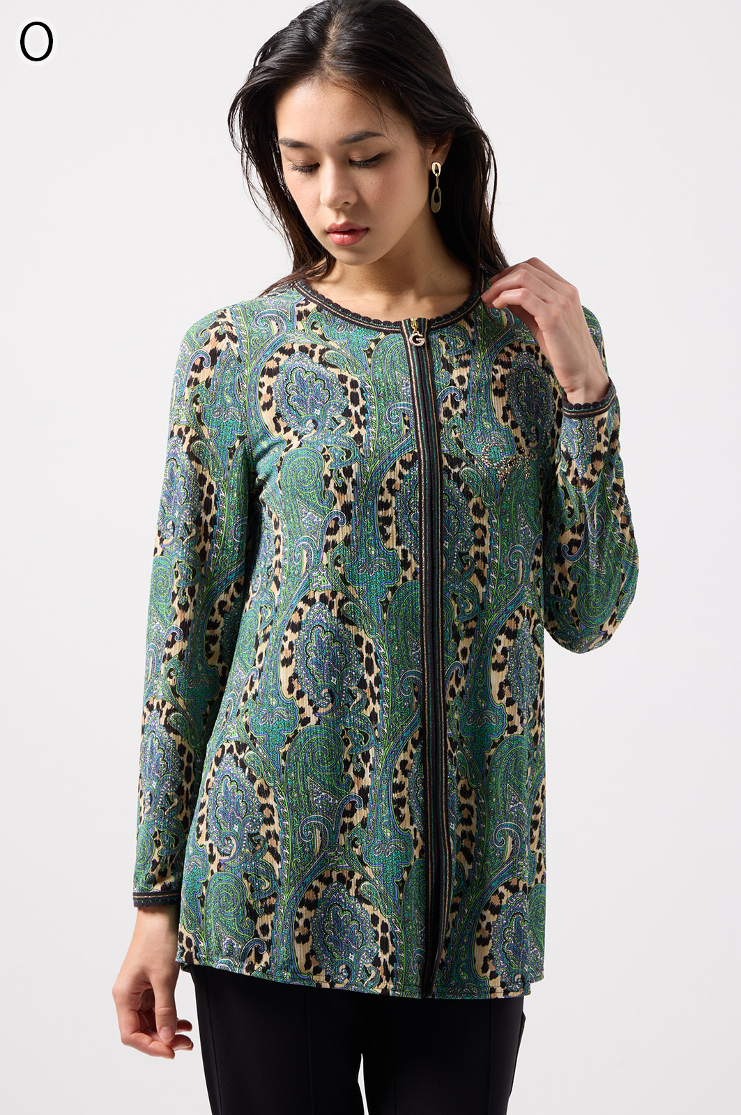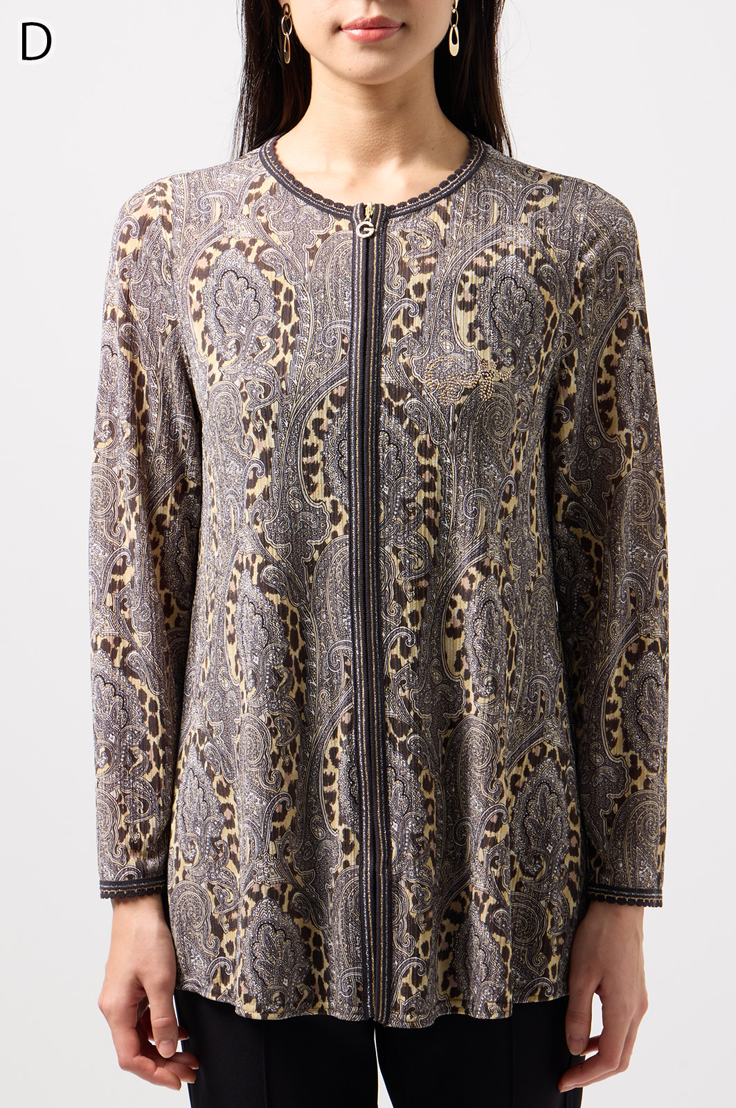 ペイズリー柄とヒョウ柄を組み合わせた、目を引くオリジナルプリントが魅力。伸びる素材で動きやすく、前ファスナー付きでサッと羽織れるTシャツタイプのトップスです。