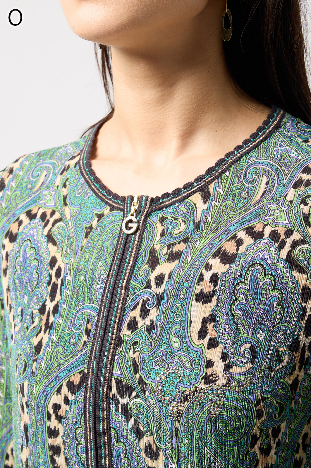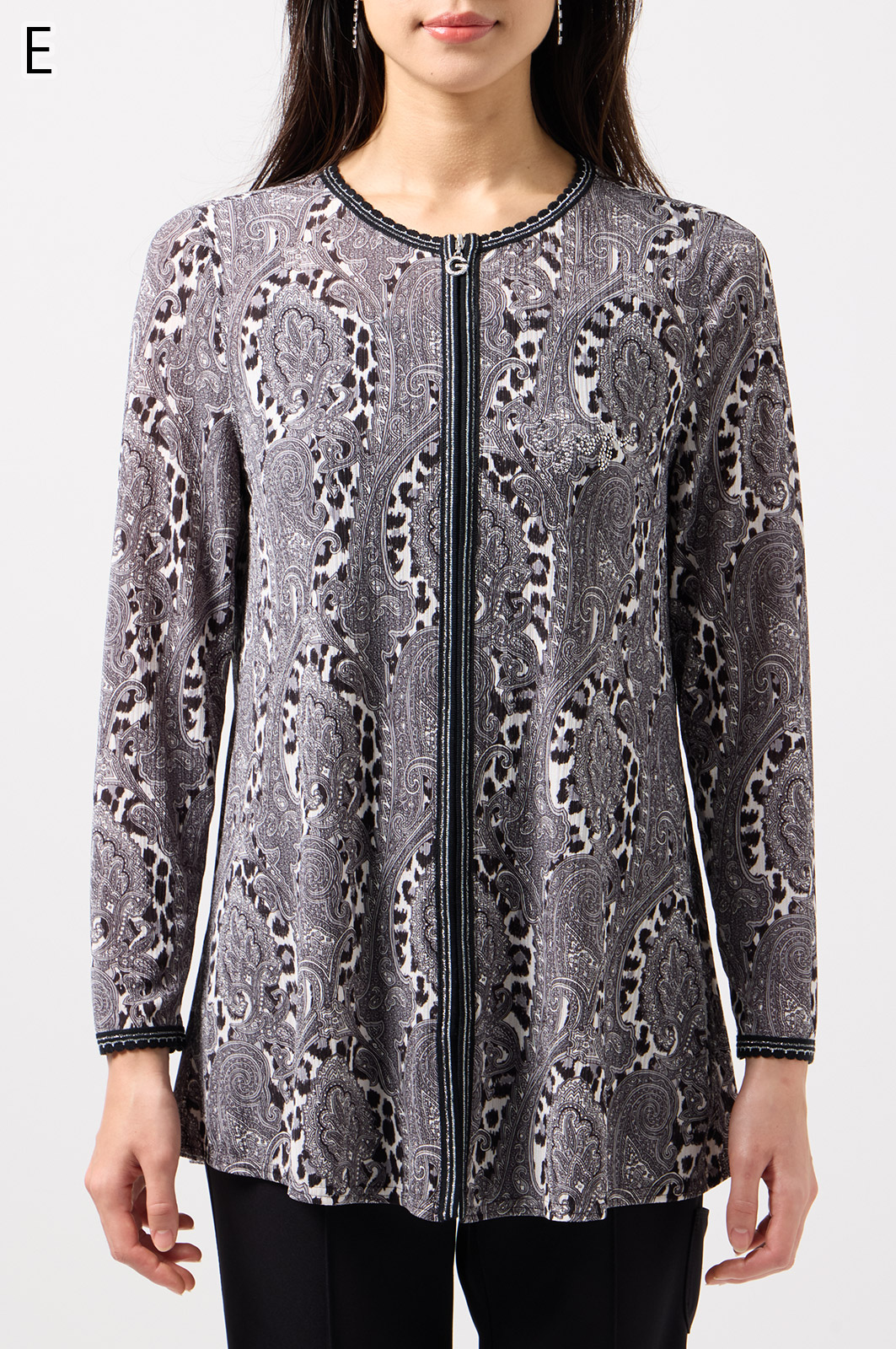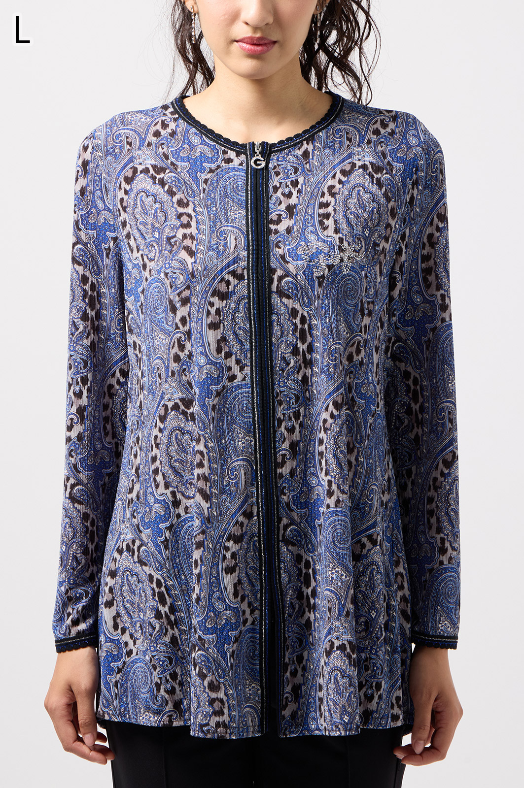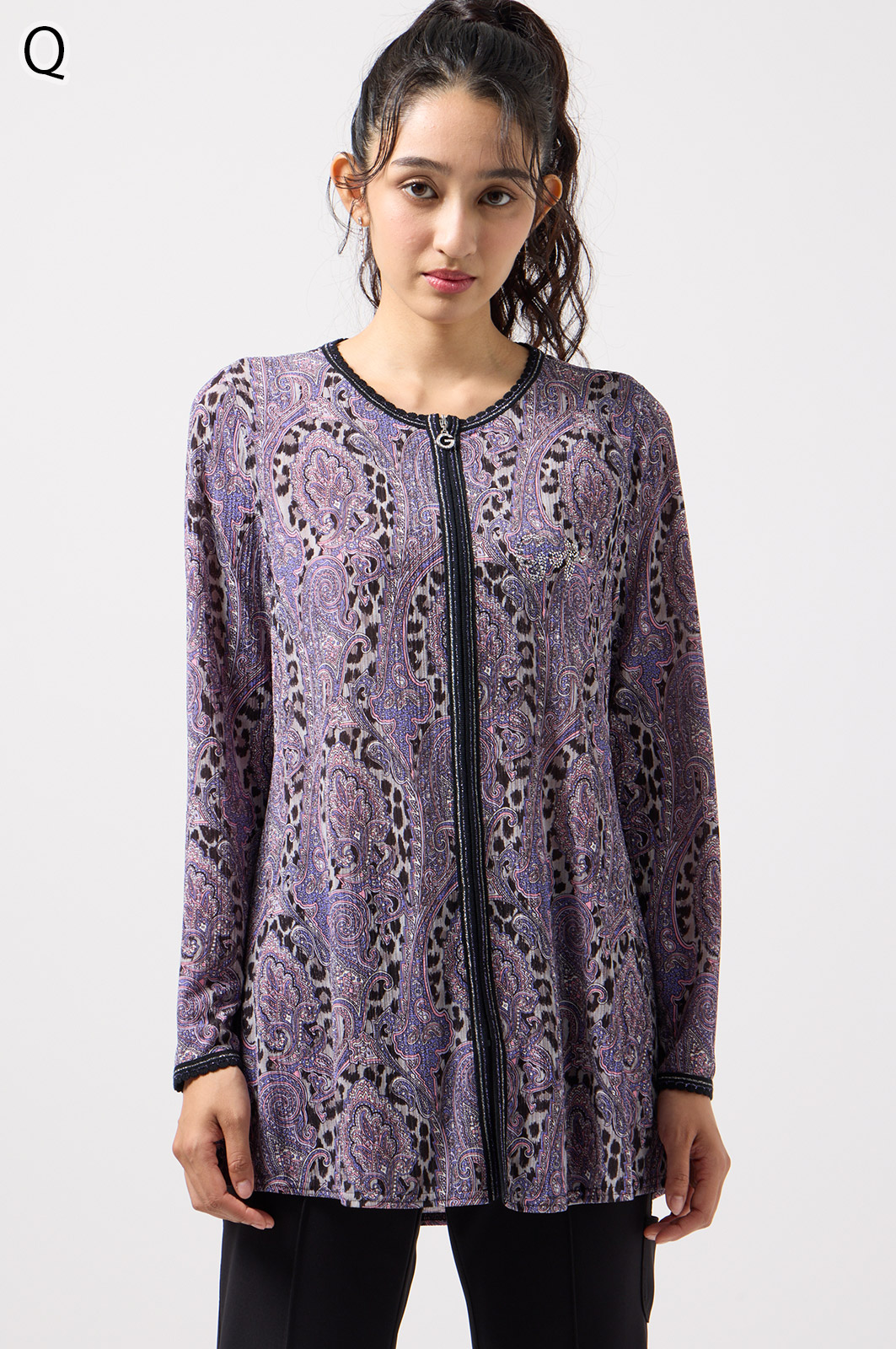 ペイズリー柄とヒョウ柄を組み合わせた、目を引くオリジナルプリントが魅力。伸びる素材で動きやすく、前ファスナー付きでサッと羽織れるTシャツタイプのトップスです。
