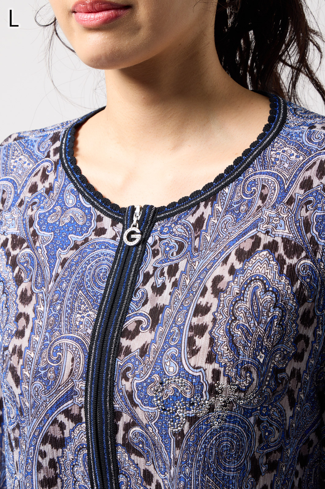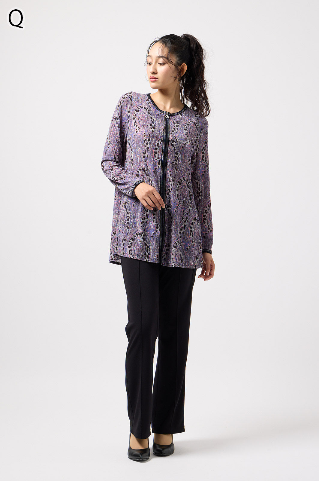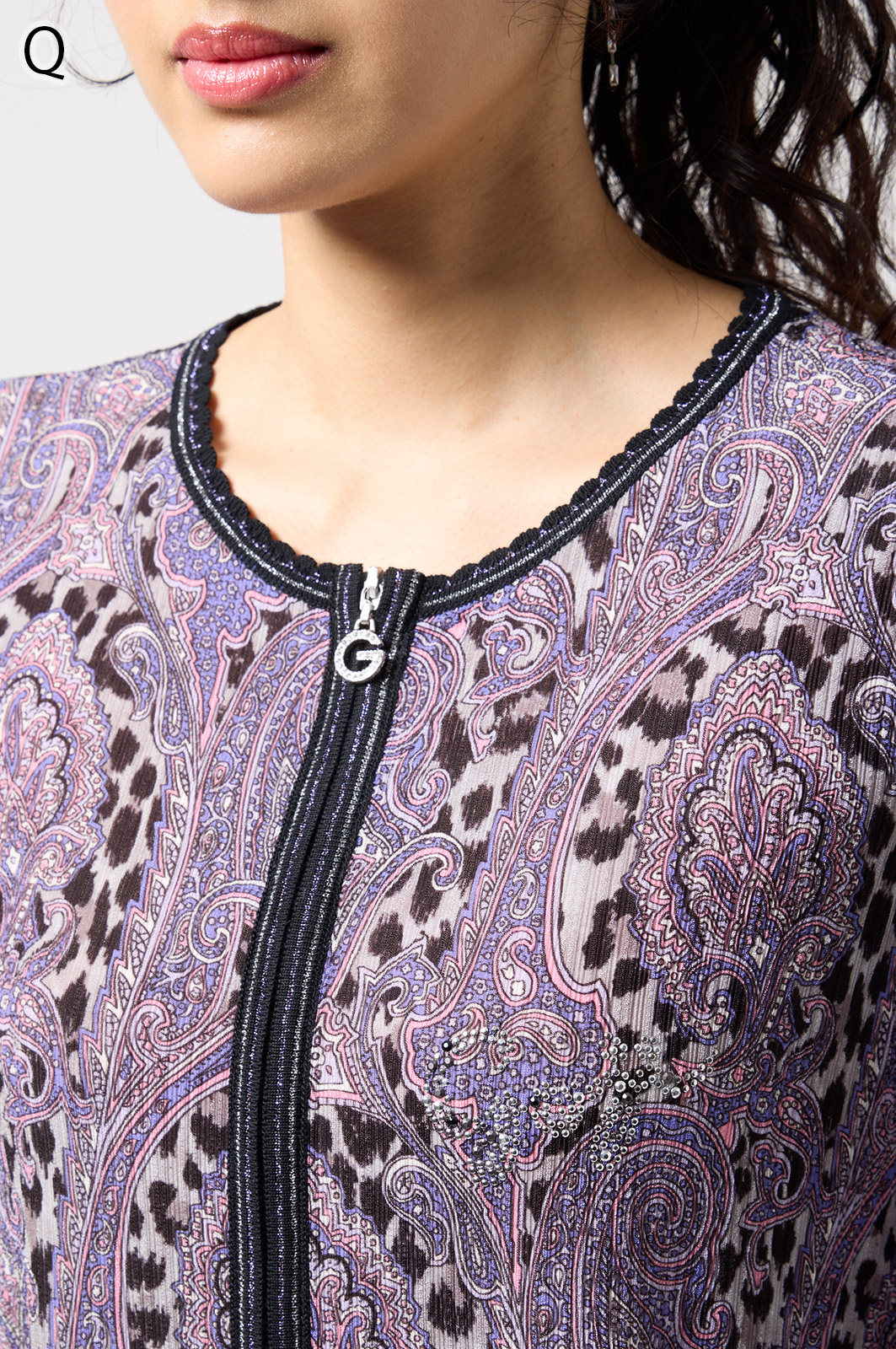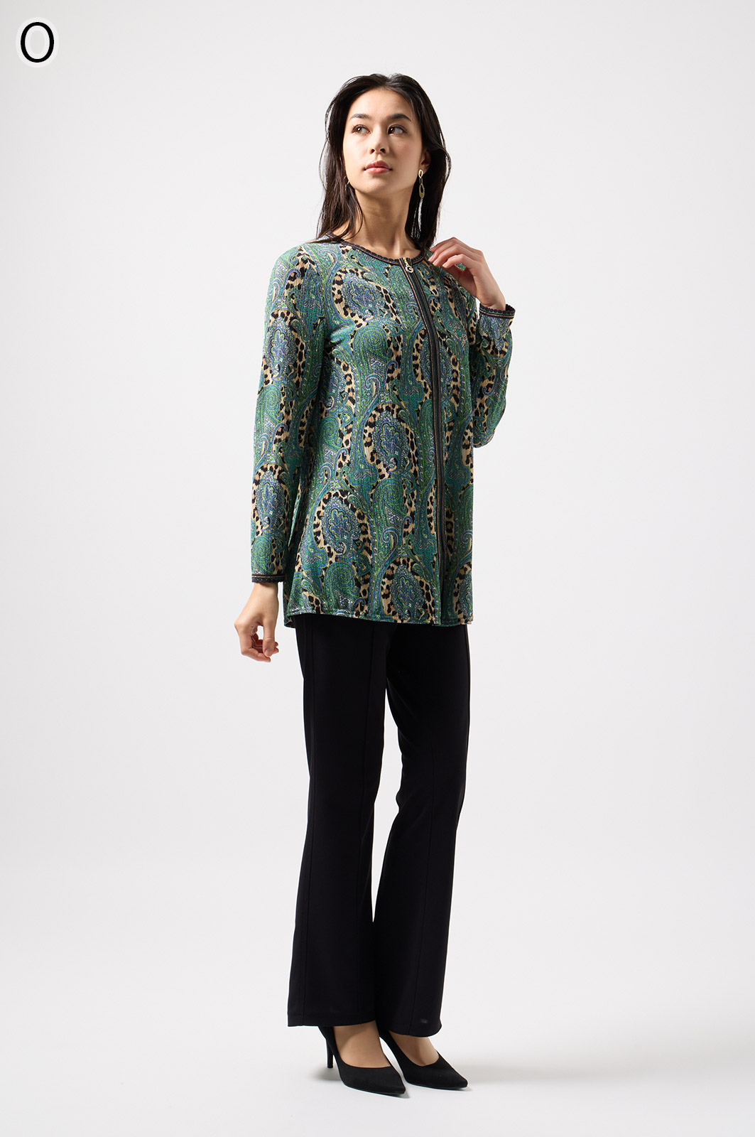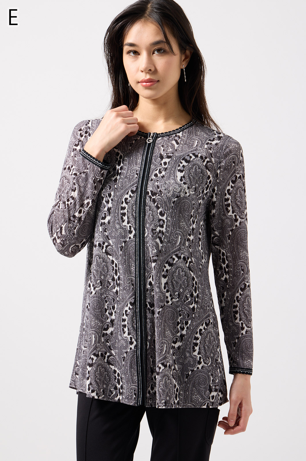 ペイズリー柄とヒョウ柄を組み合わせた、目を引くオリジナルプリントが魅力。伸びる素材で動きやすく、前ファスナー付きでサッと羽織れるTシャツタイプのトップスです。