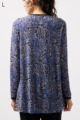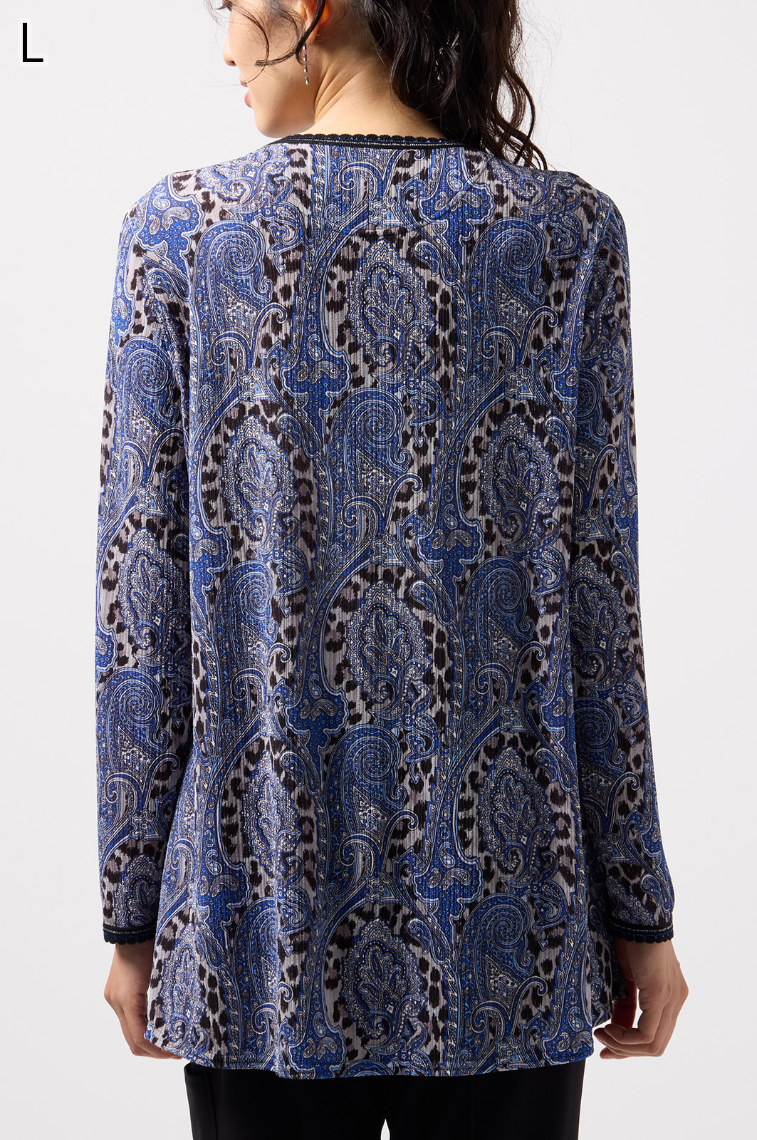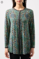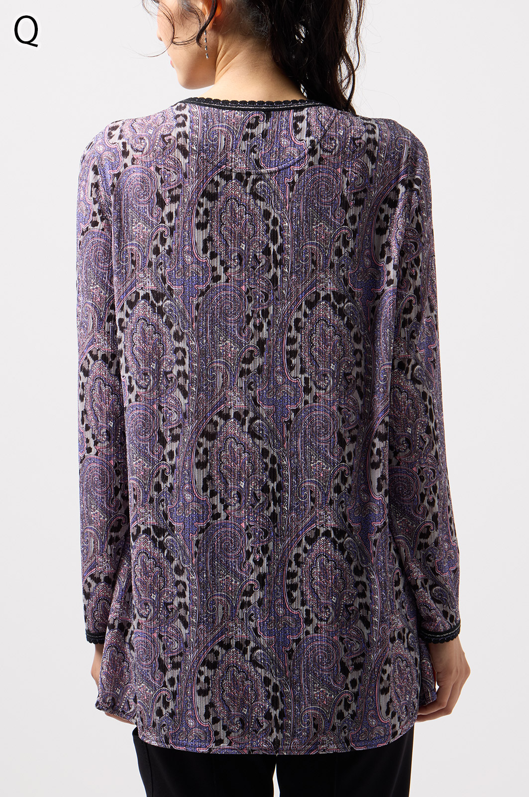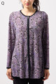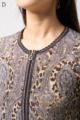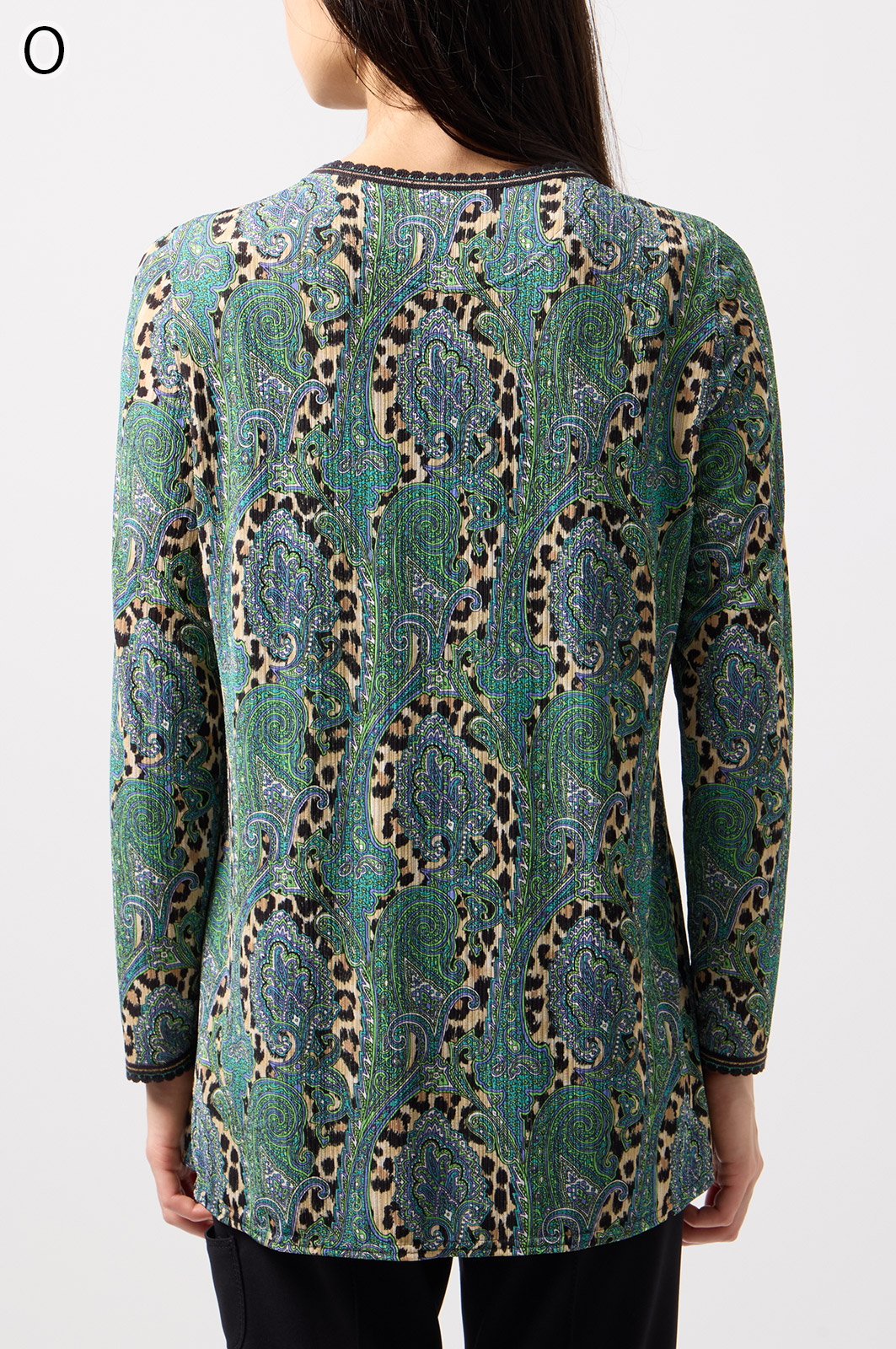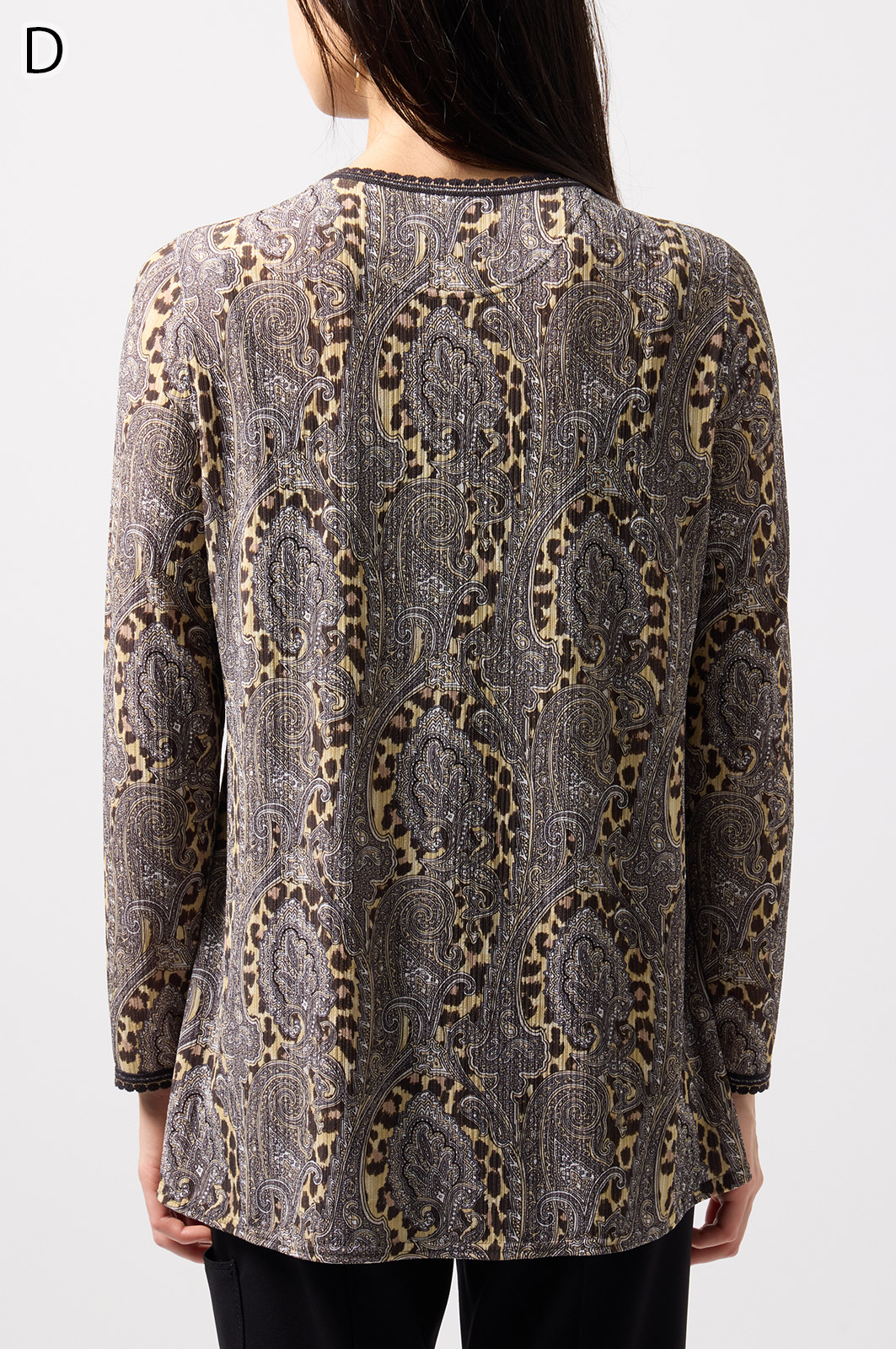 ペイズリー柄とヒョウ柄を組み合わせた、目を引くオリジナルプリントが魅力。伸びる素材で動きやすく、前ファスナー付きでサッと羽織れるTシャツタイプのトップスです。