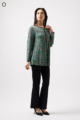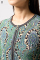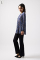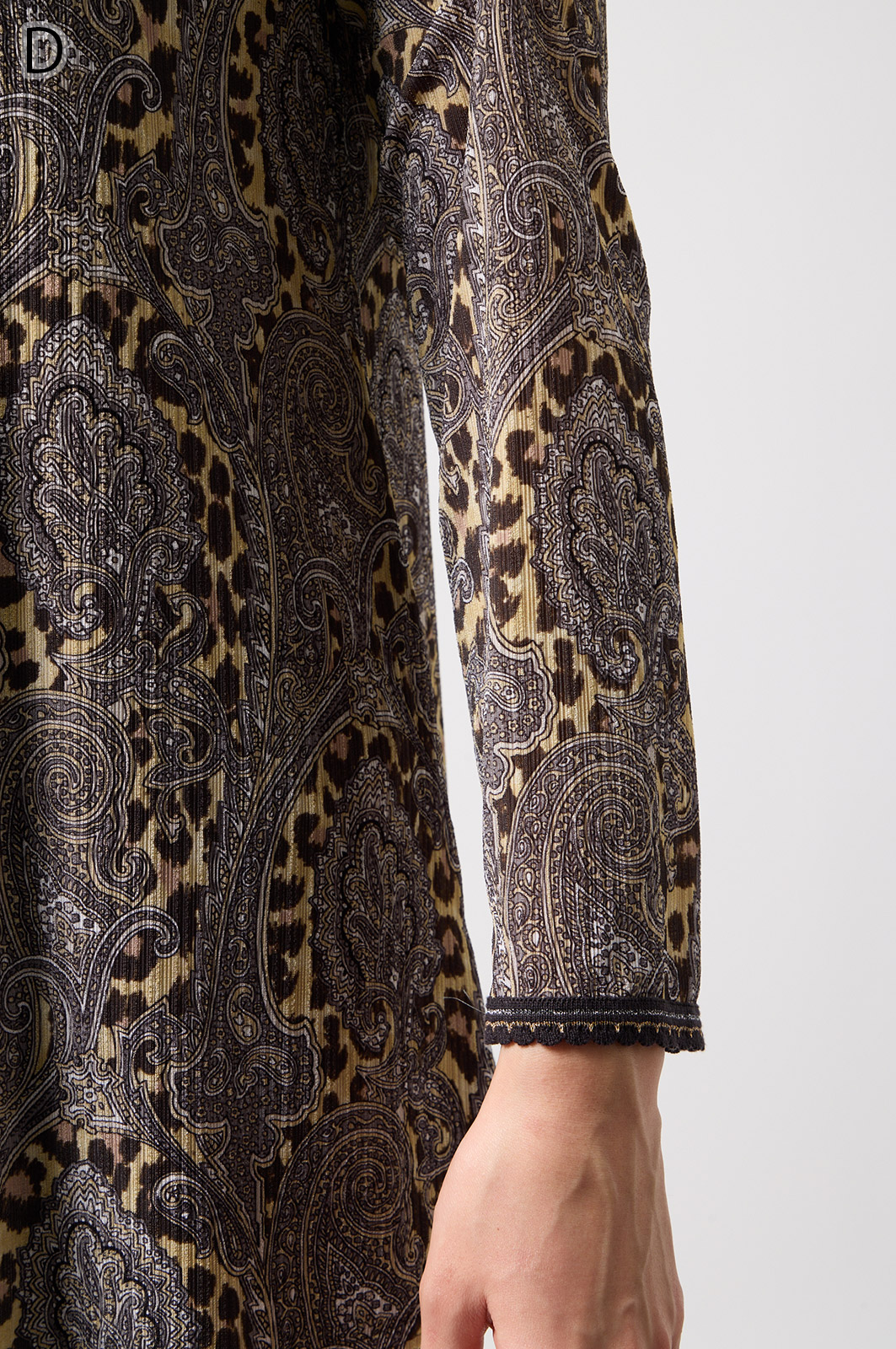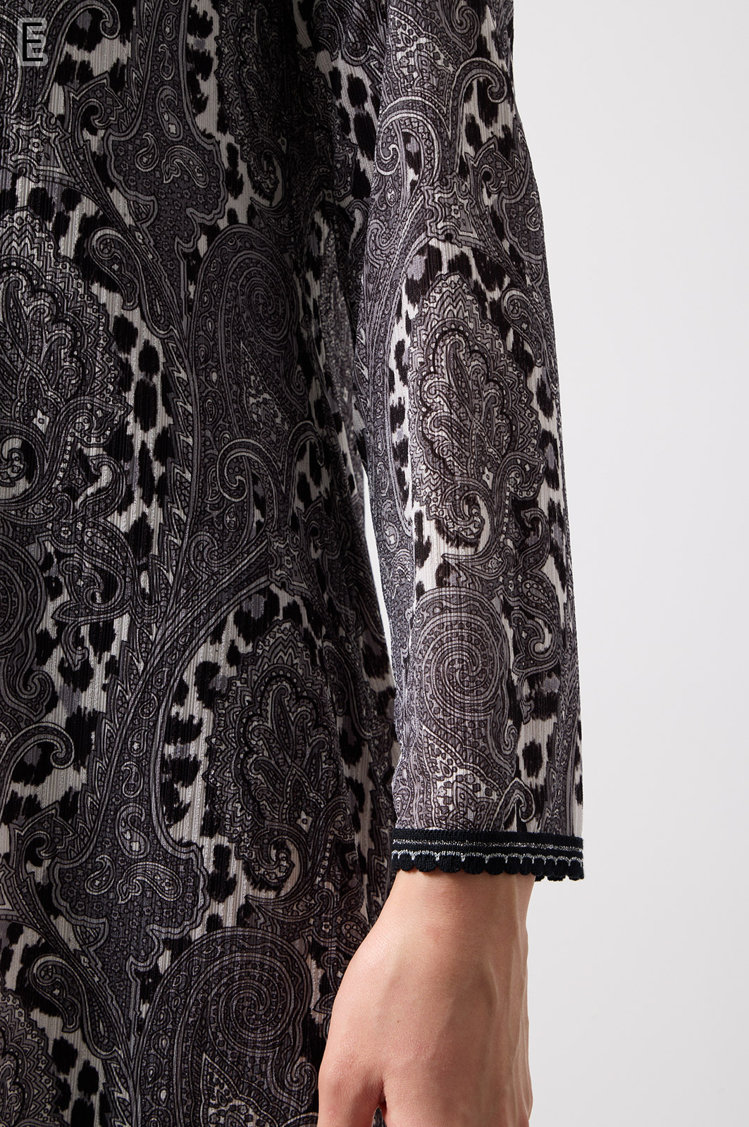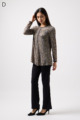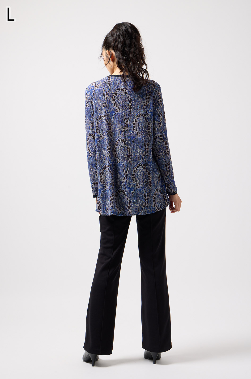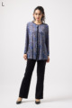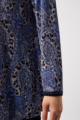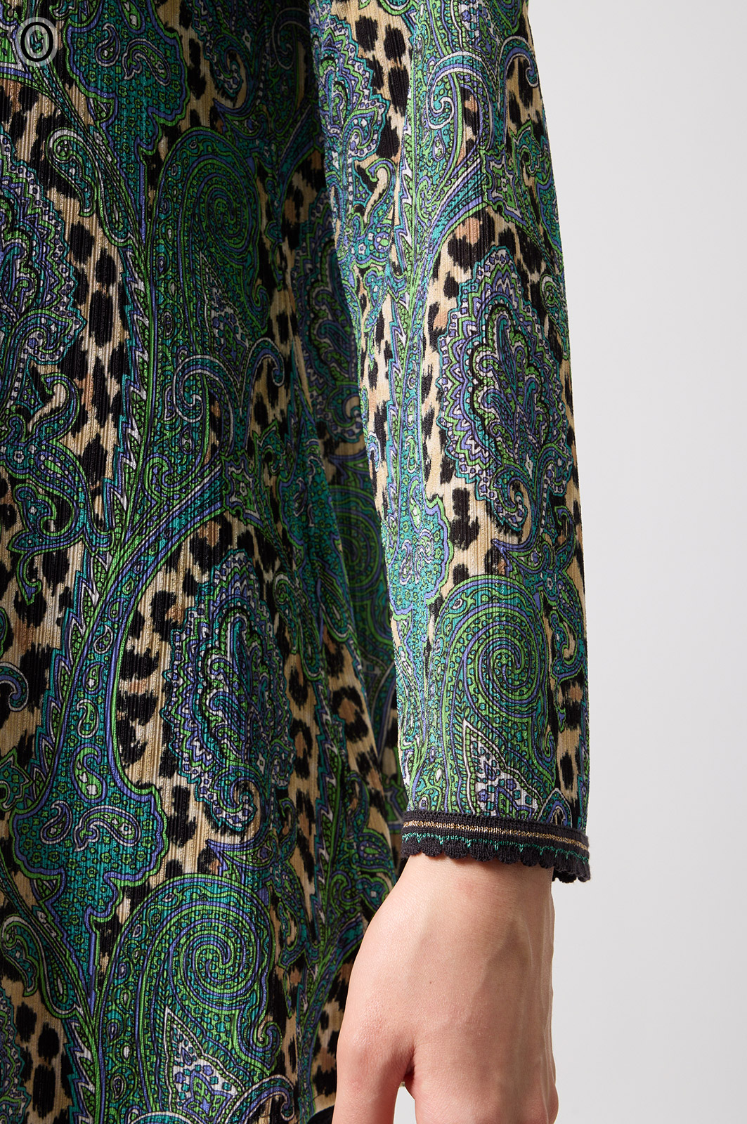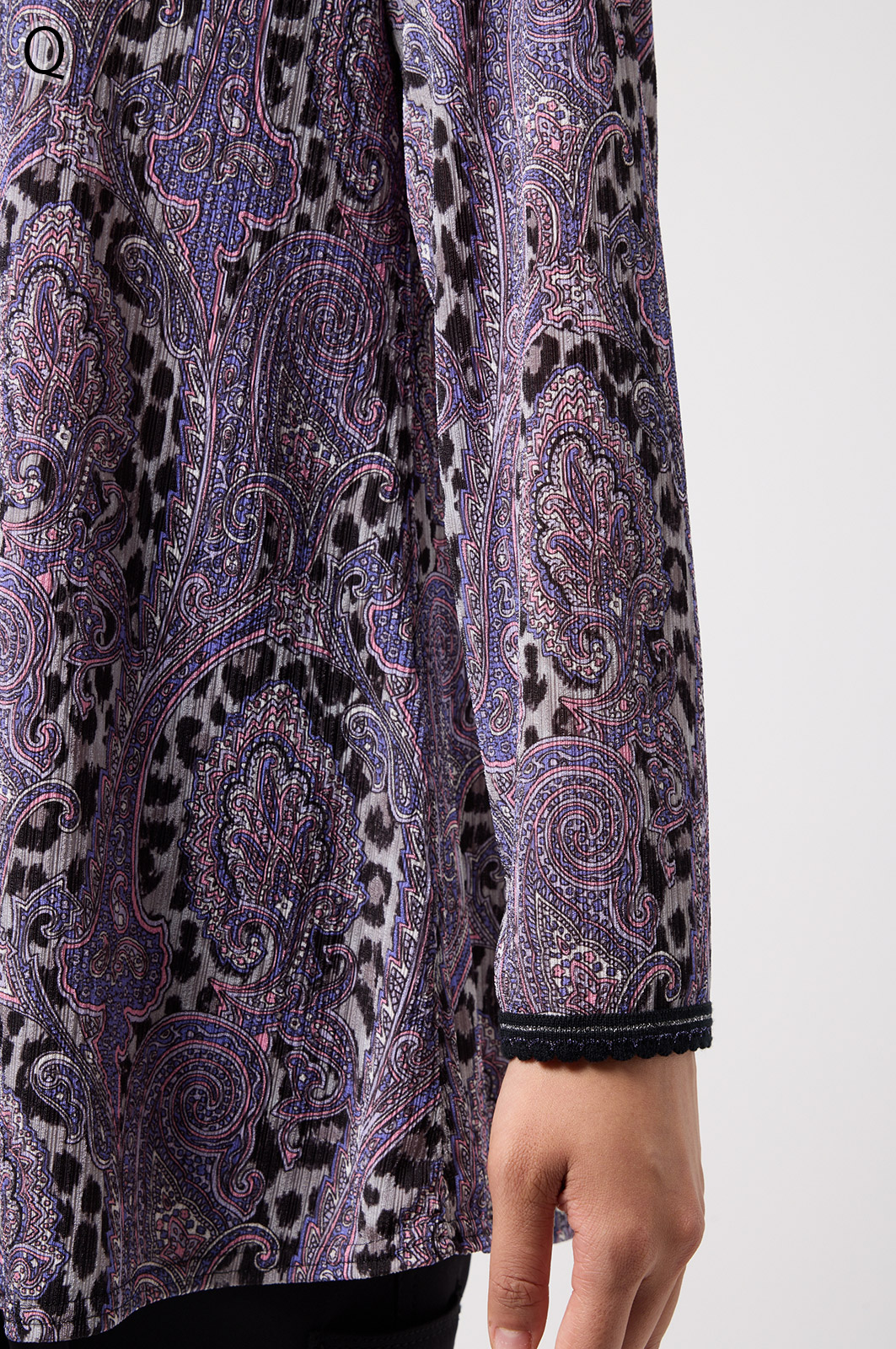 ペイズリー柄とヒョウ柄を組み合わせた、目を引くオリジナルプリントが魅力。伸びる素材で動きやすく、前ファスナー付きでサッと羽織れるTシャツタイプのトップスです。