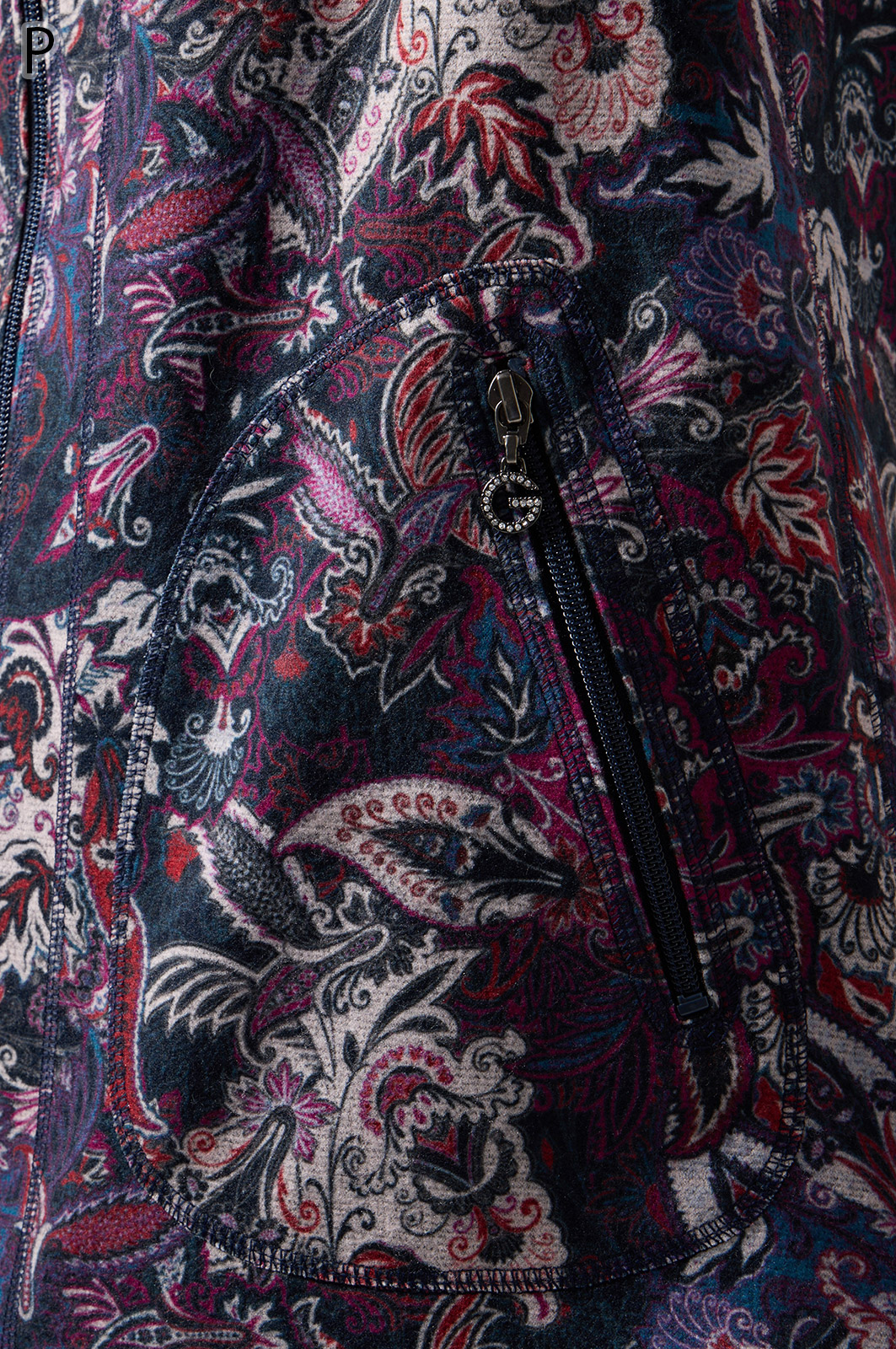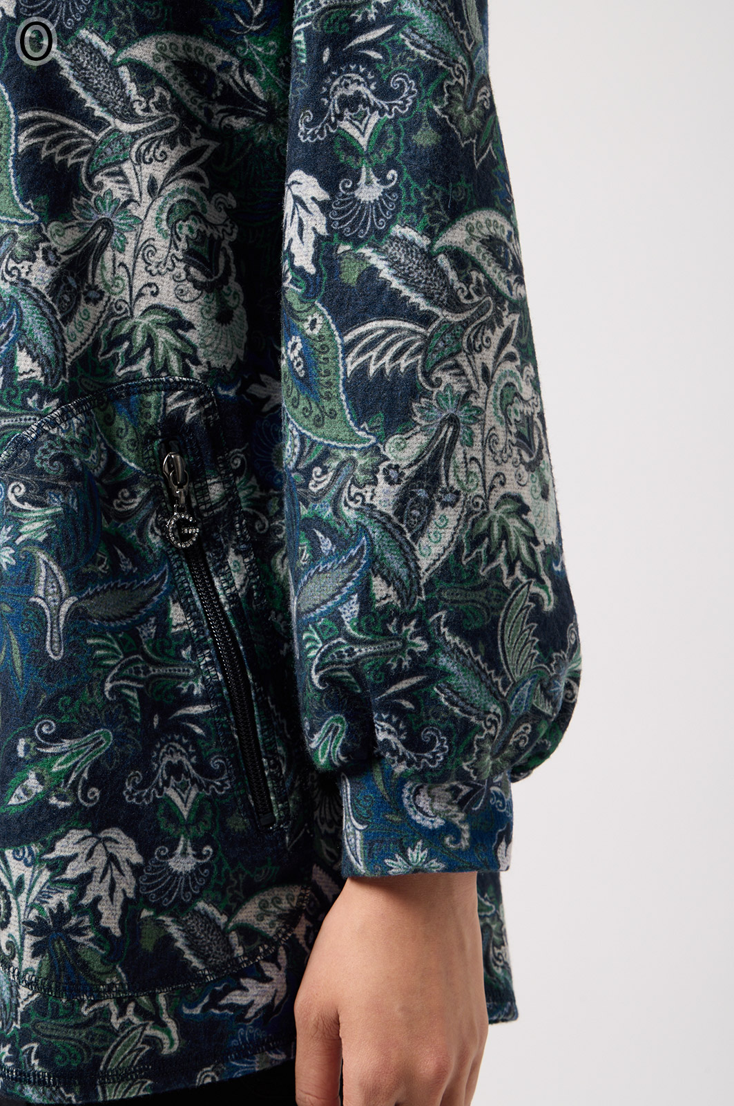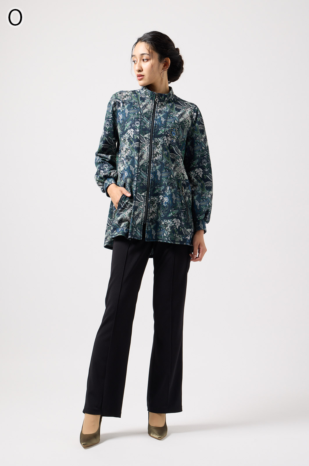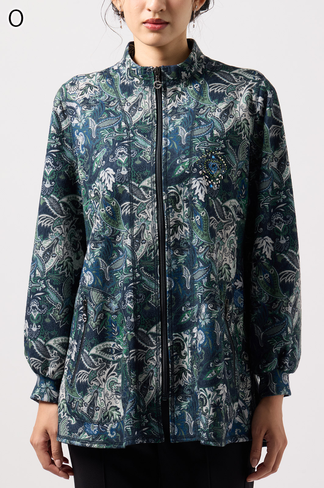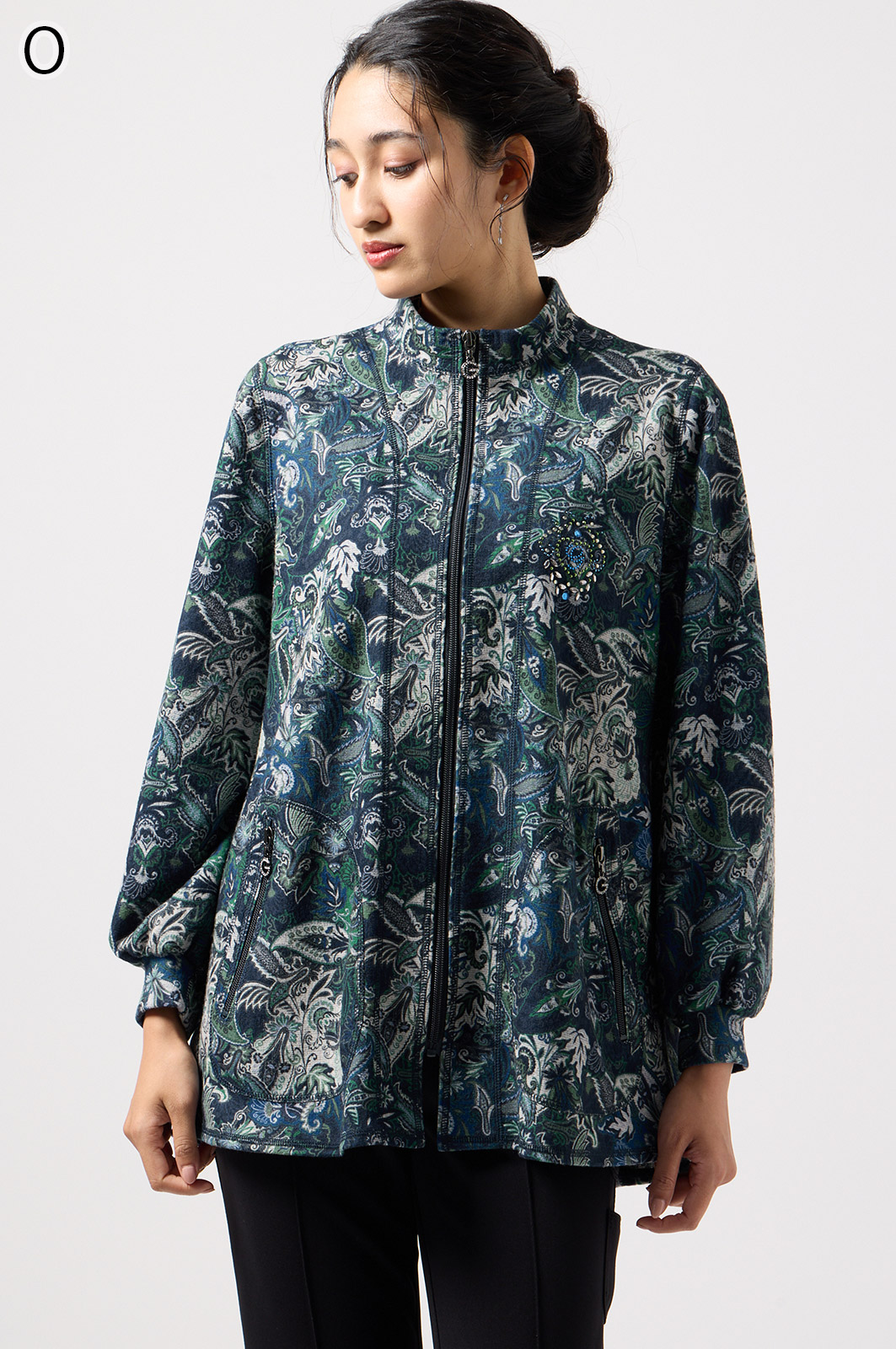 ペイズリー柄と唐草模様を組み合わせた華やかなプリントに、やわらかなニット風素材を使用。後ろに広がりをもたせたシルエットと前ファスナーで、気軽に羽織れて上品さも演出。