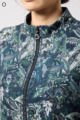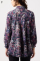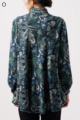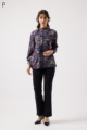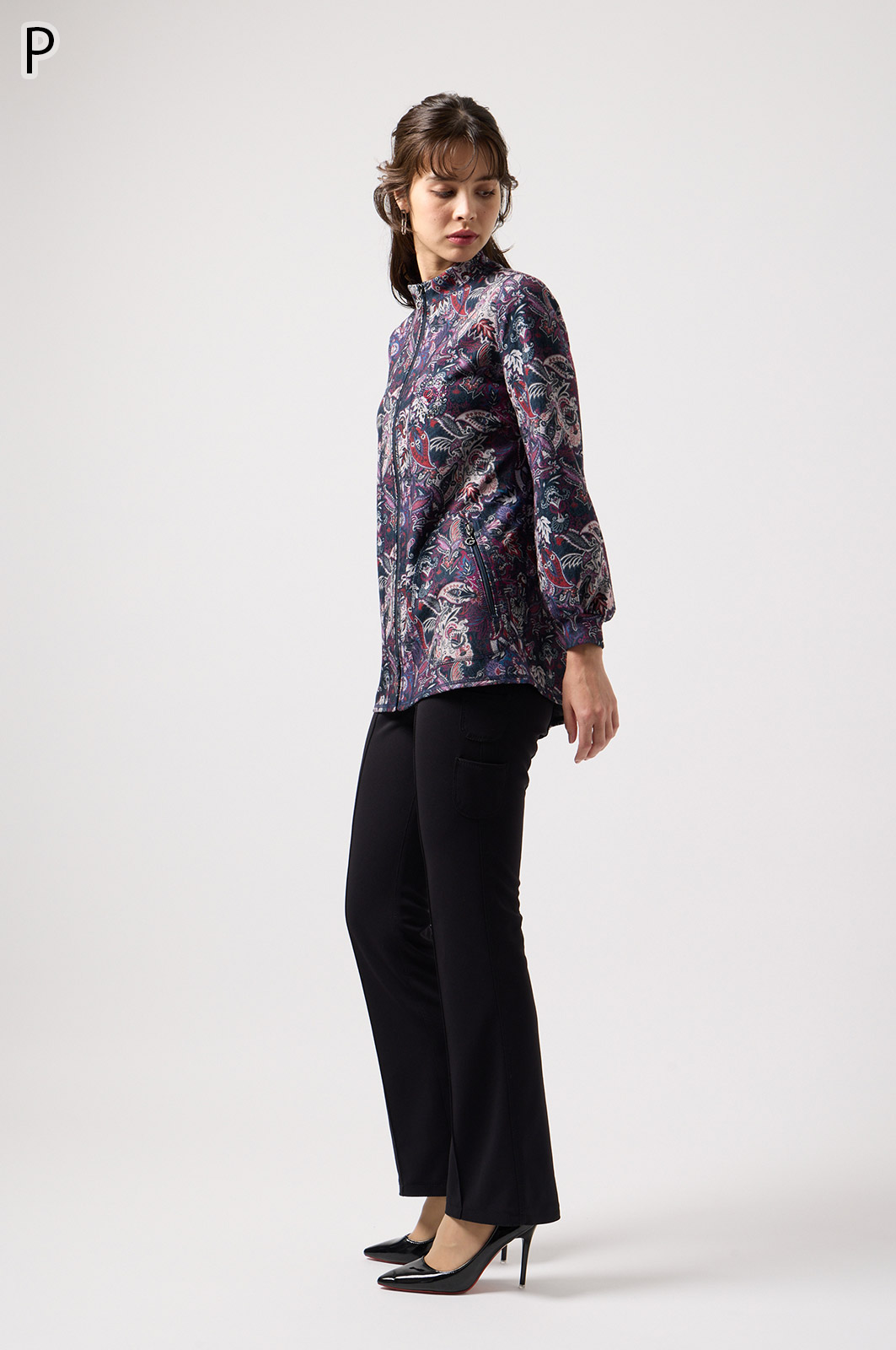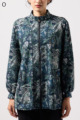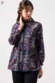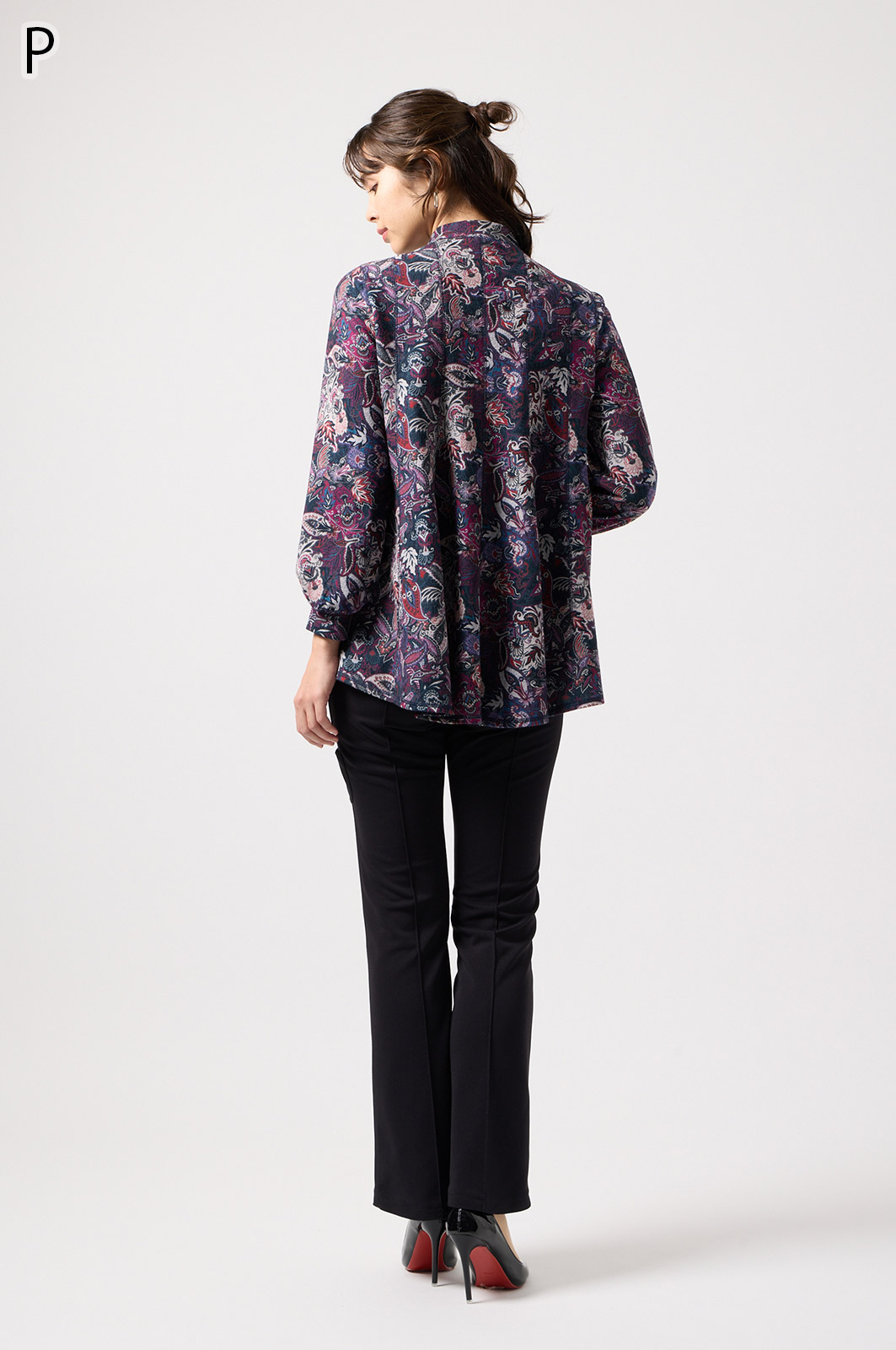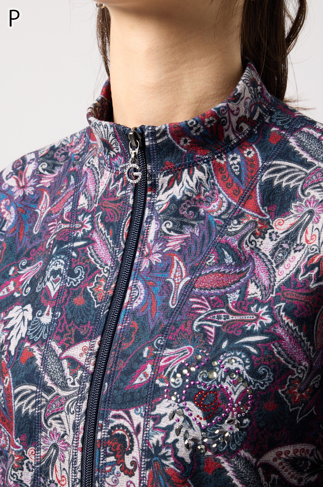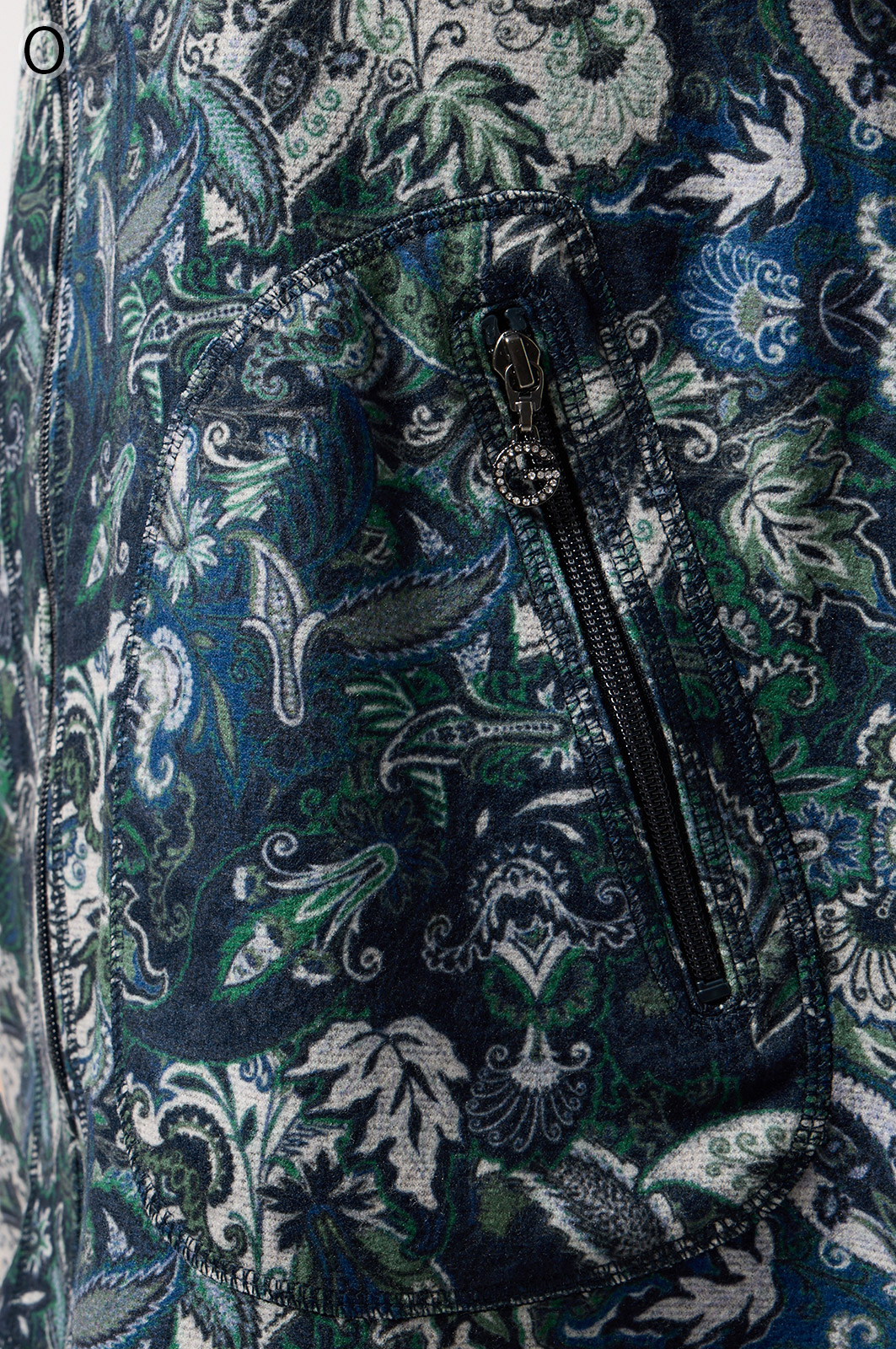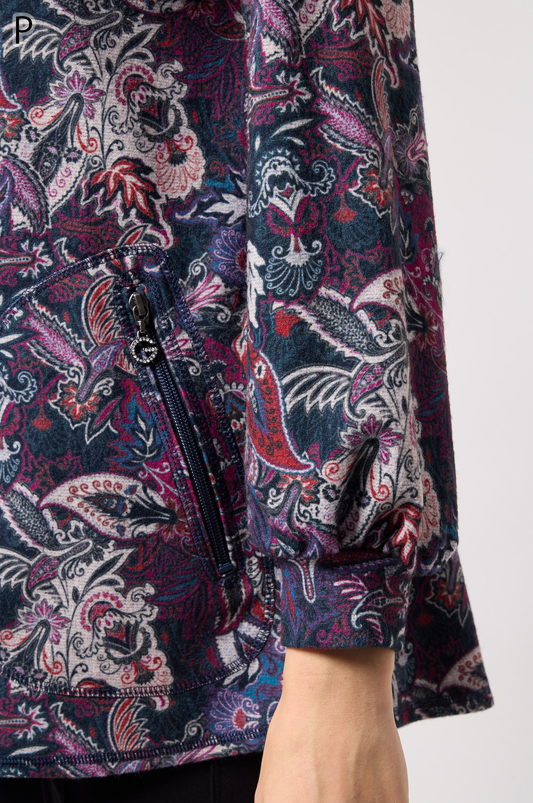 ペイズリー柄と唐草模様を組み合わせた華やかなプリントに、やわらかなニット風素材を使用。後ろに広がりをもたせたシルエットと前ファスナーで、気軽に羽織れて上品さも演出。