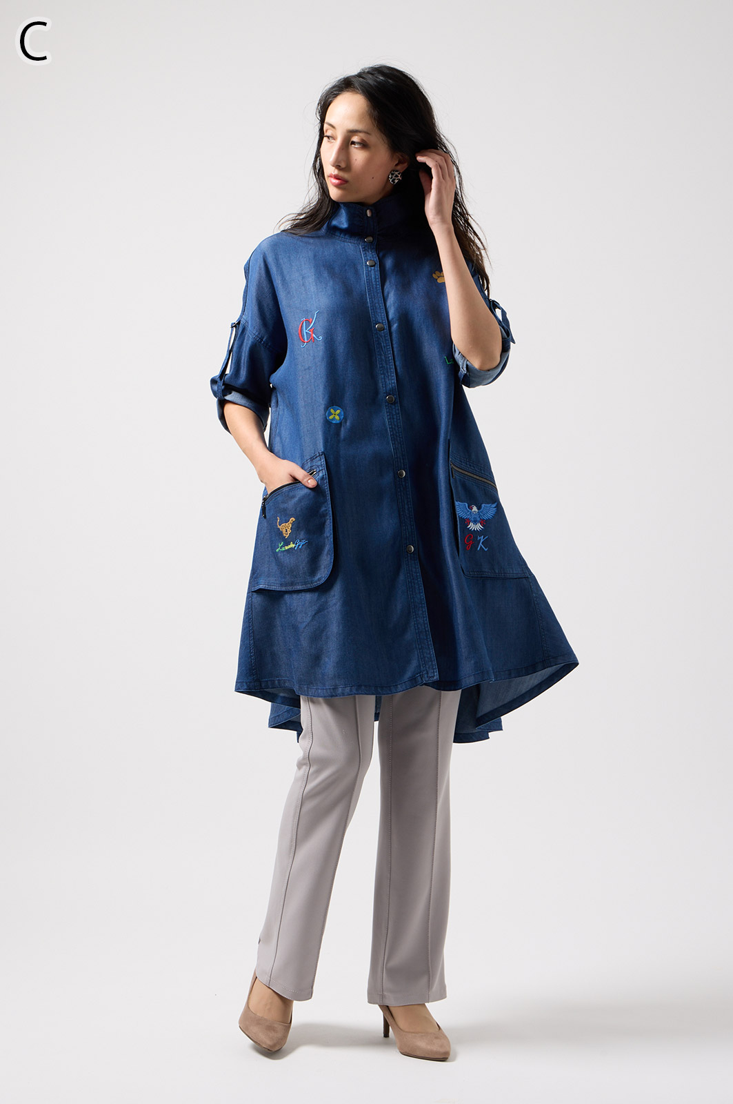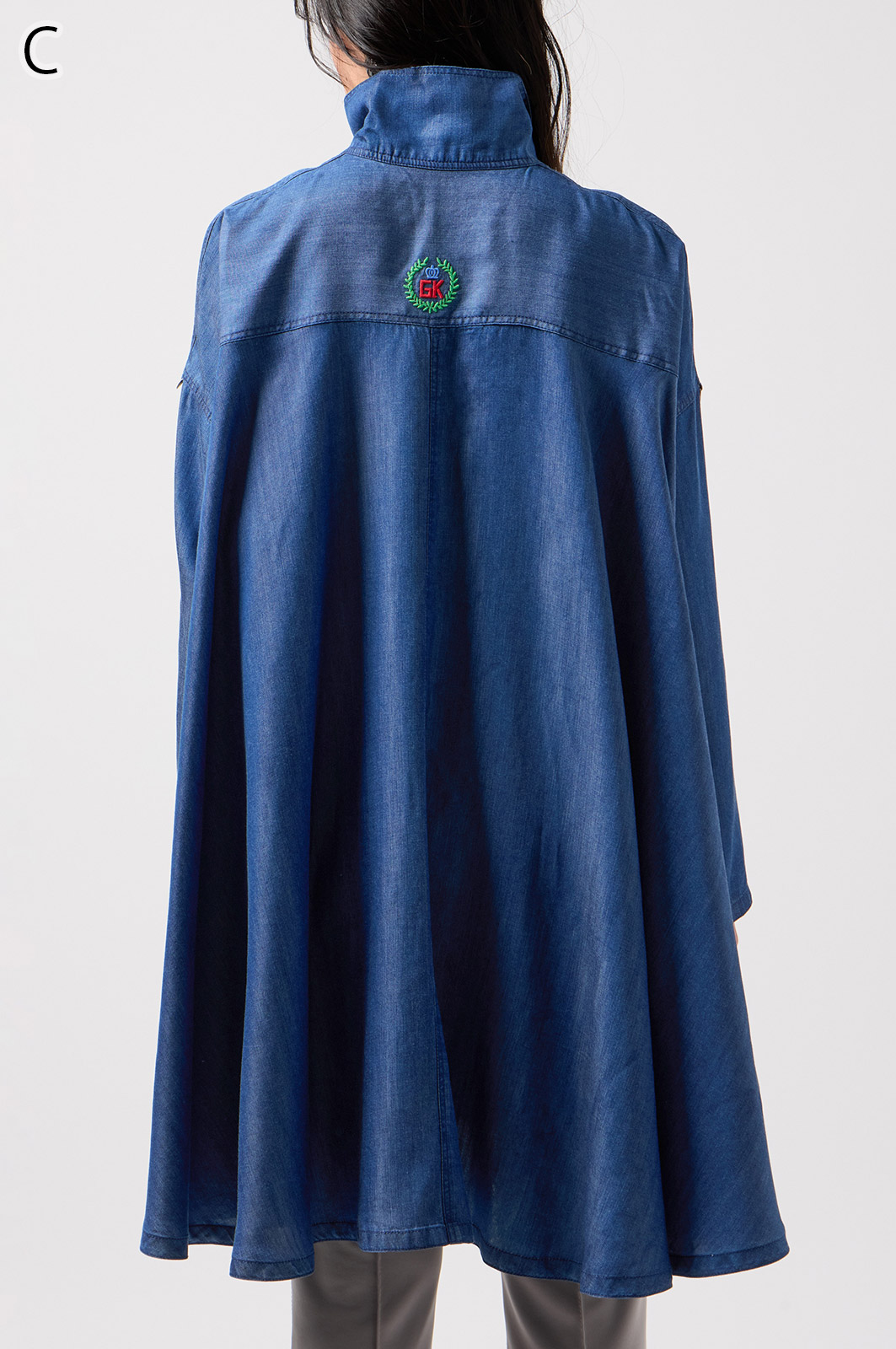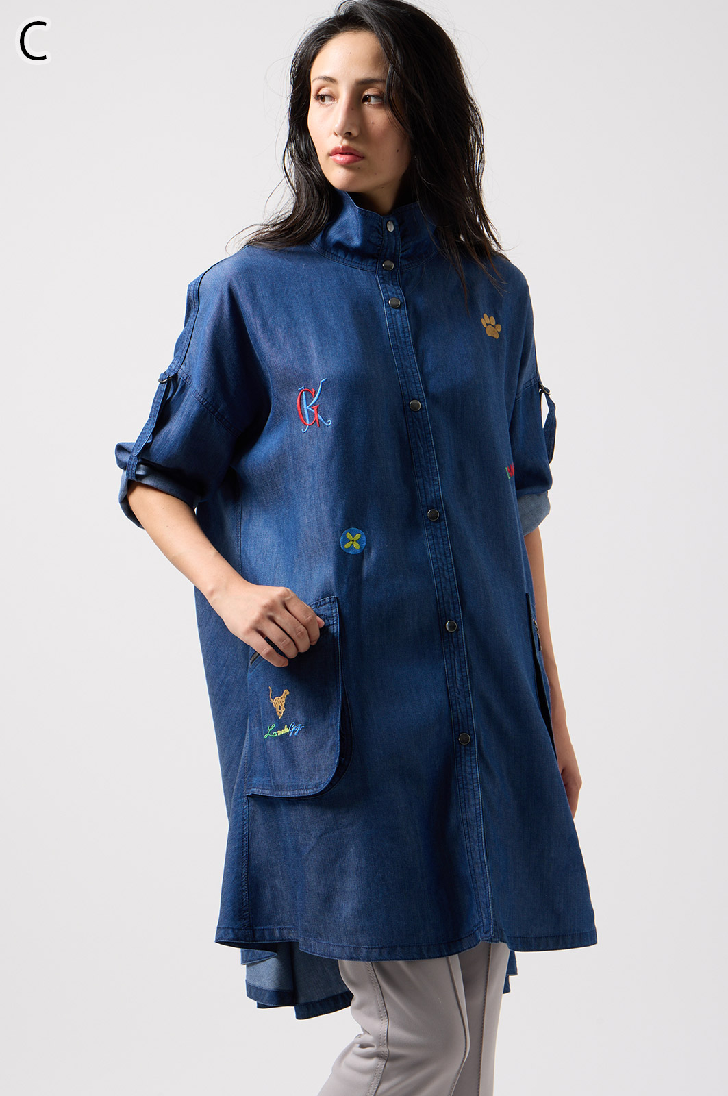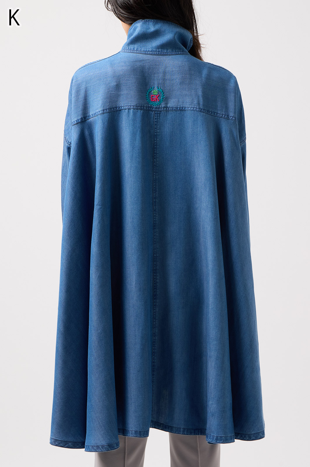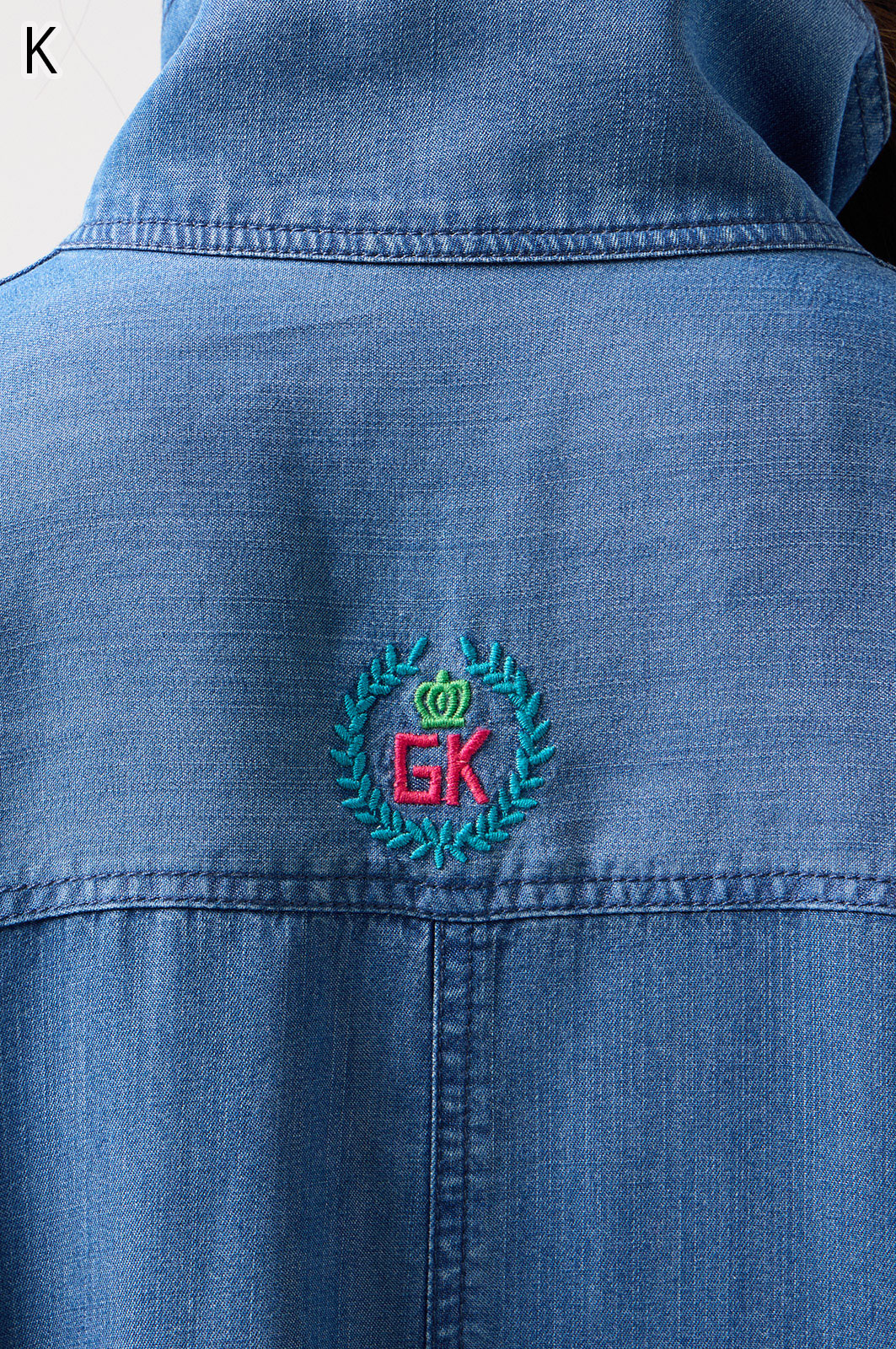 やわらかなテンセル素材100%のデニム生地に、こだわりの刺しゅうを全体に施した羽織りブラウス。ゆったり広がるフレアシルエットで、季節を問わず軽やかに着こなせます。