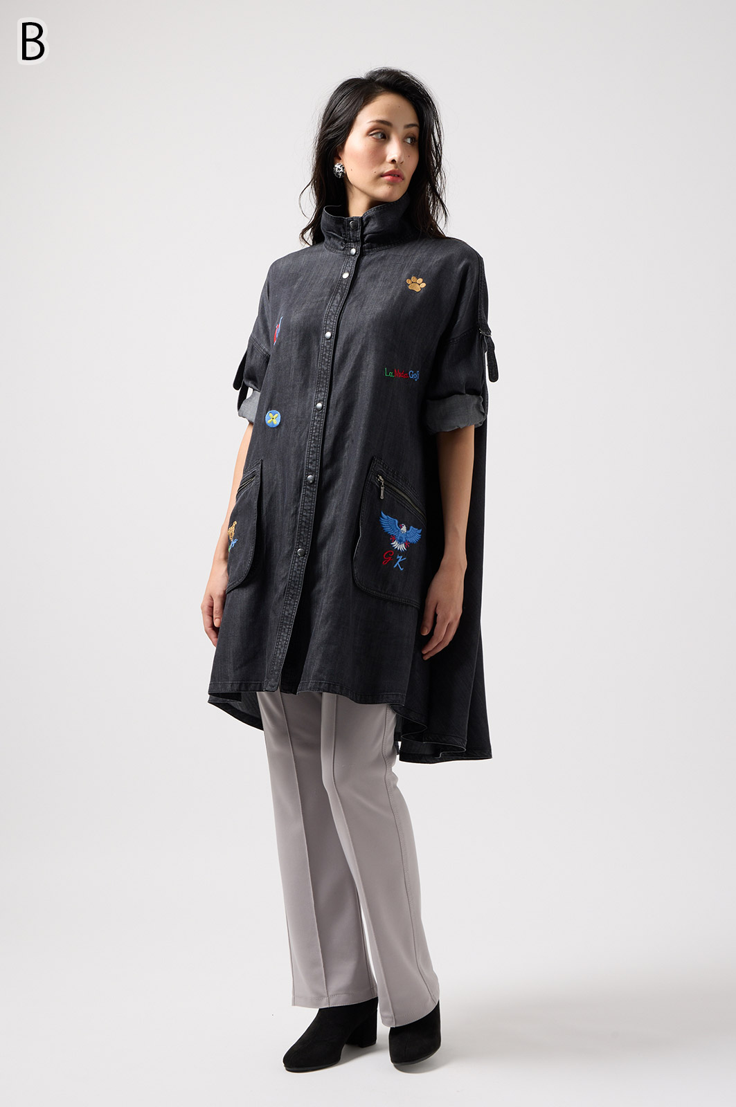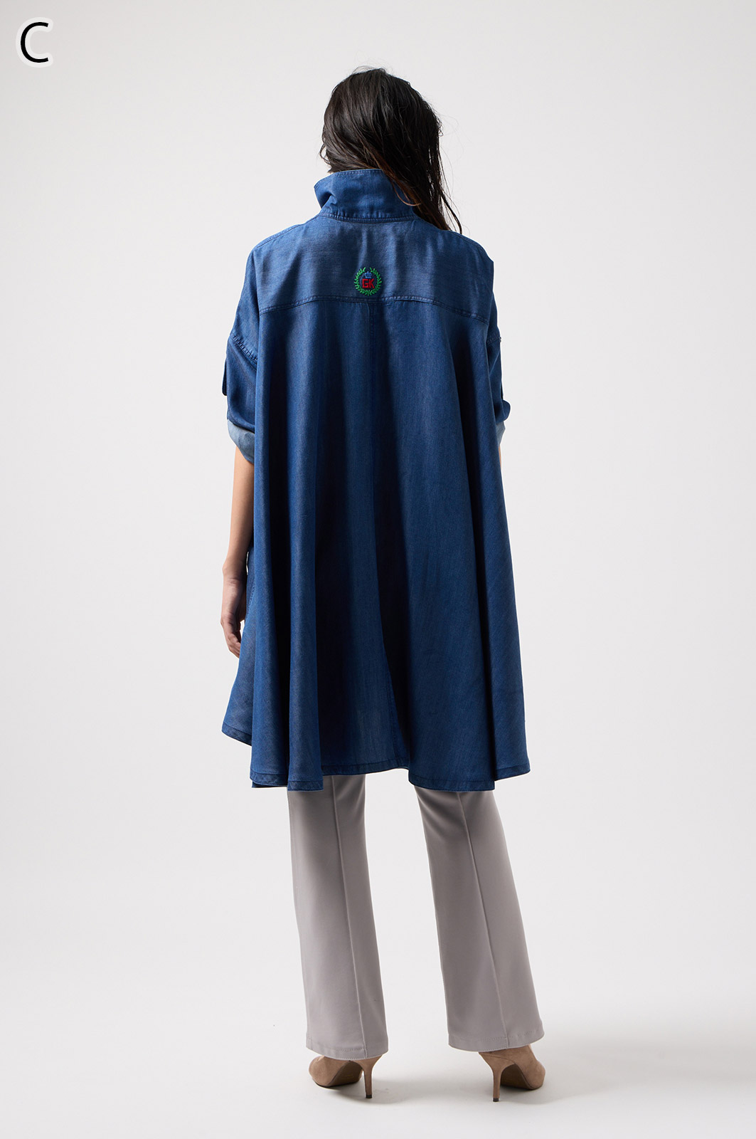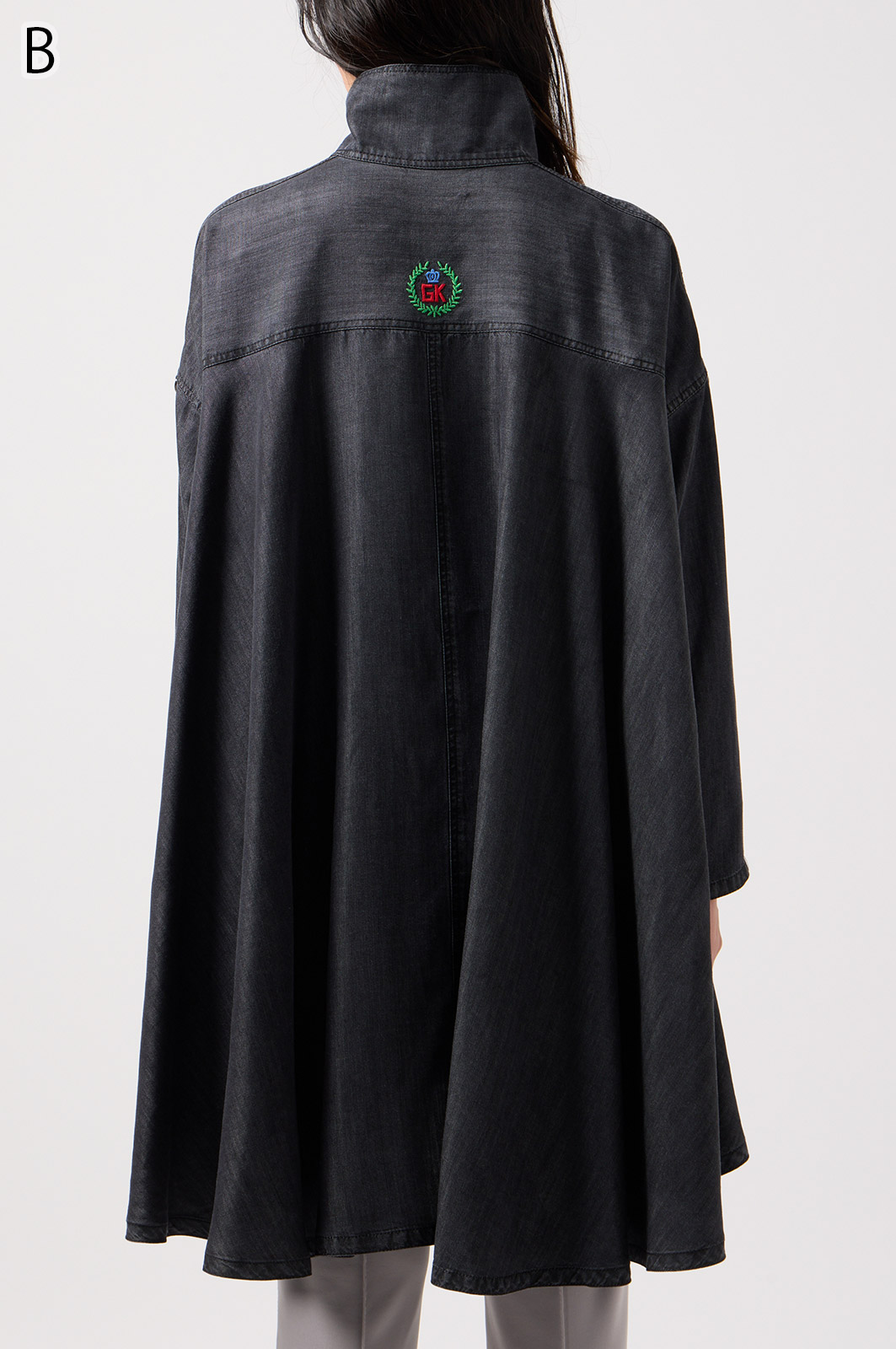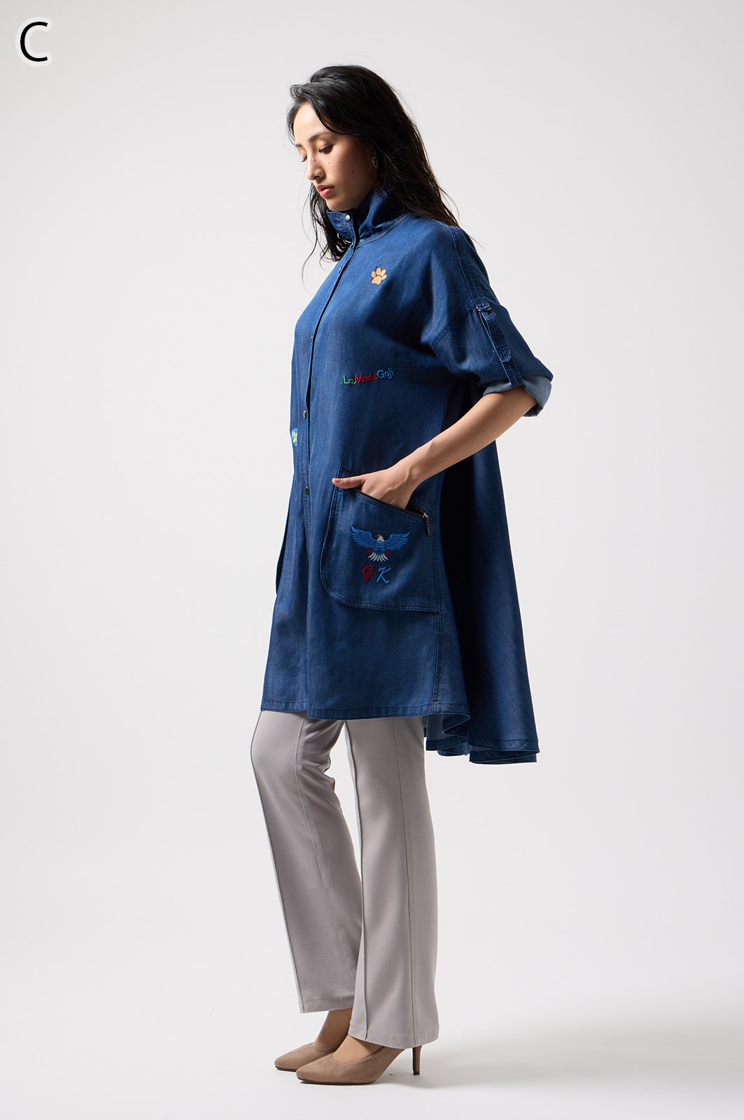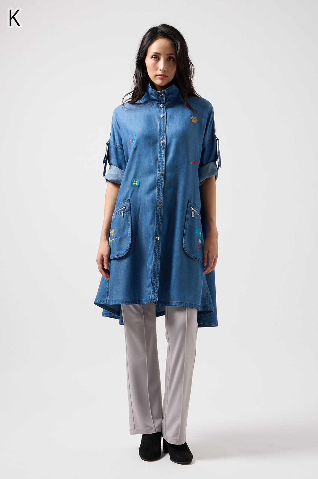 やわらかなテンセル素材100%のデニム生地に、こだわりの刺しゅうを全体に施した羽織りブラウス。ゆったり広がるフレアシルエットで、季節を問わず軽やかに着こなせます。