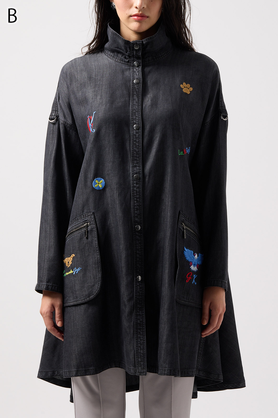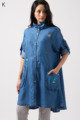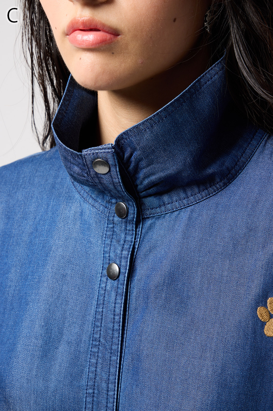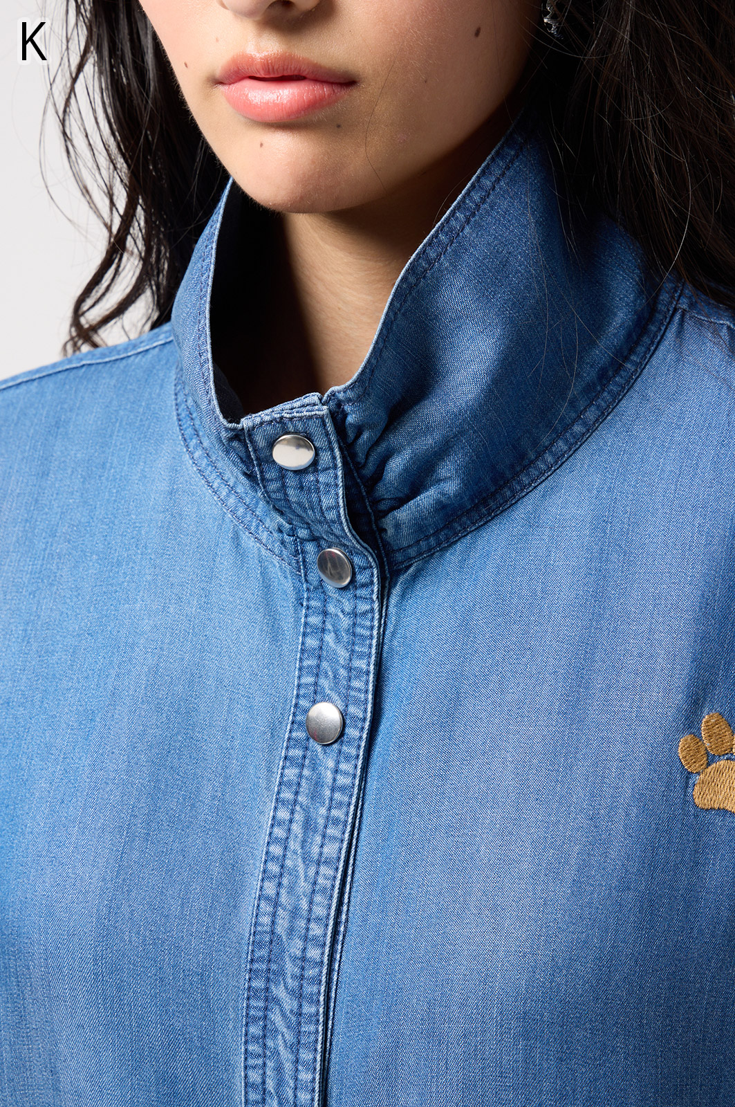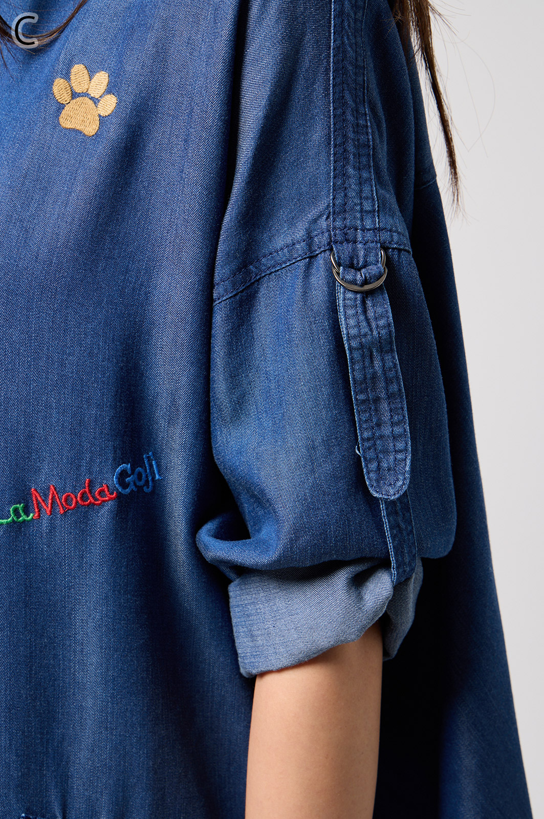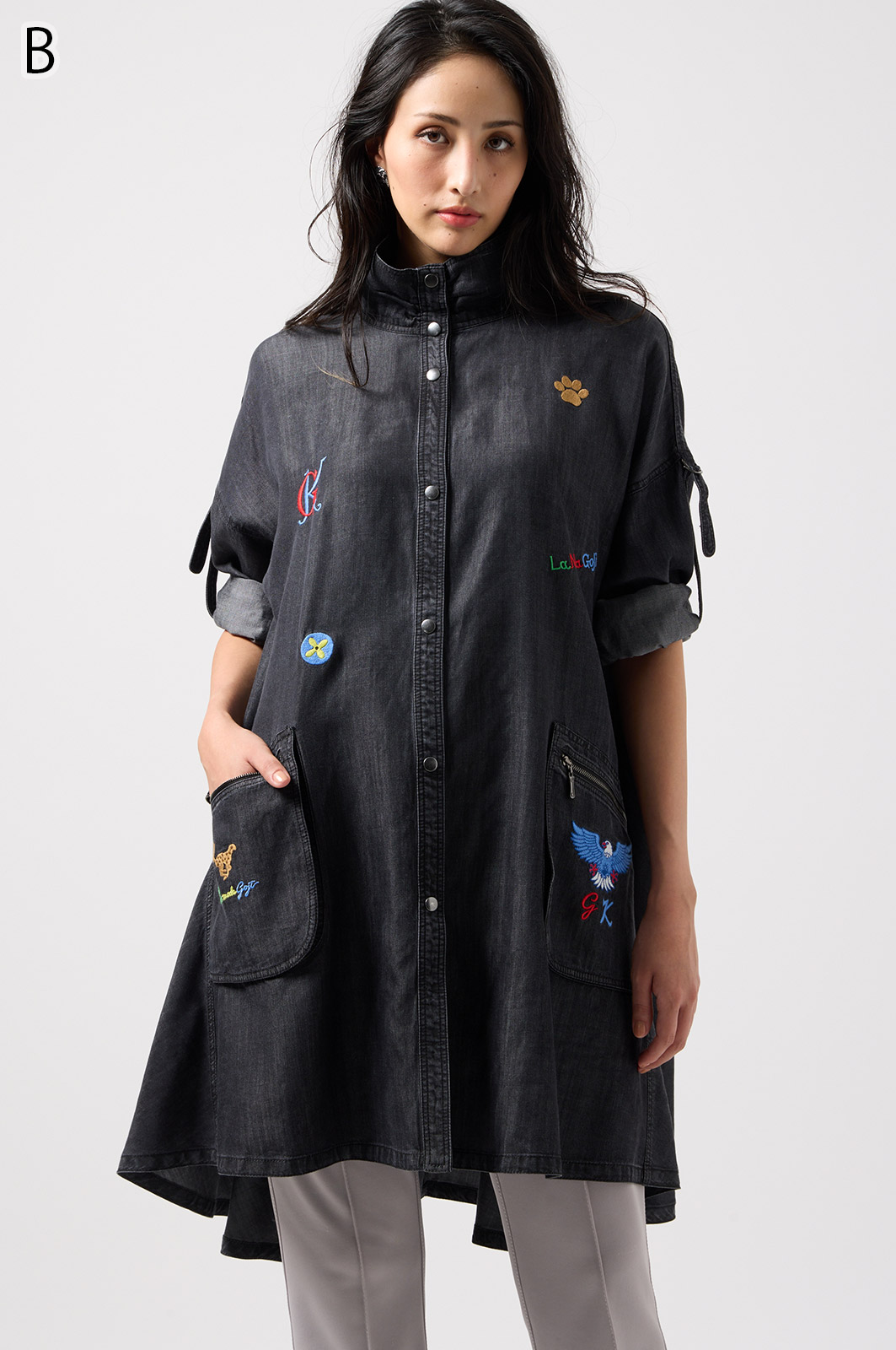 やわらかなテンセル素材100%のデニム生地に、こだわりの刺しゅうを全体に施した羽織りブラウス。ゆったり広がるフレアシルエットで、季節を問わず軽やかに着こなせます。