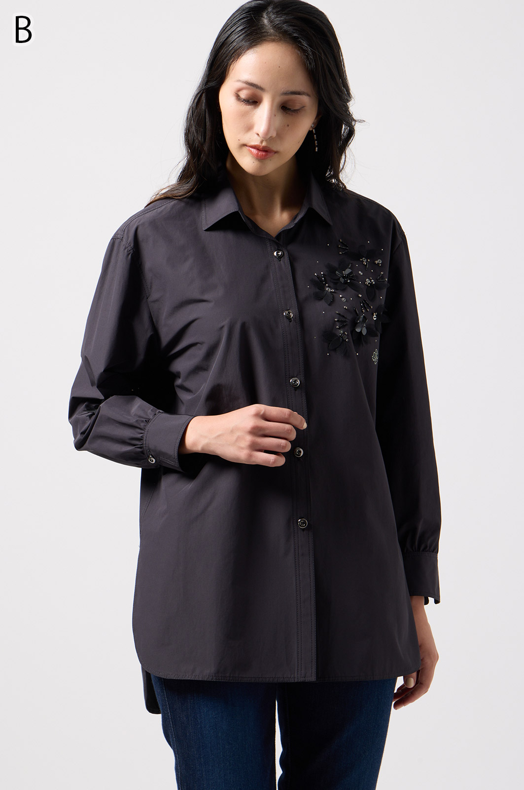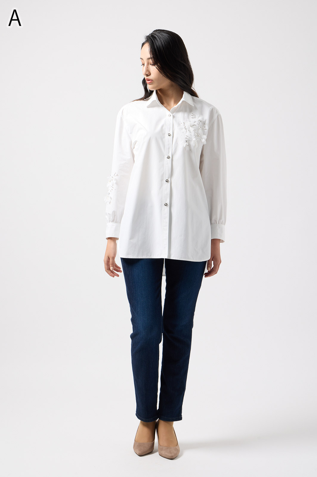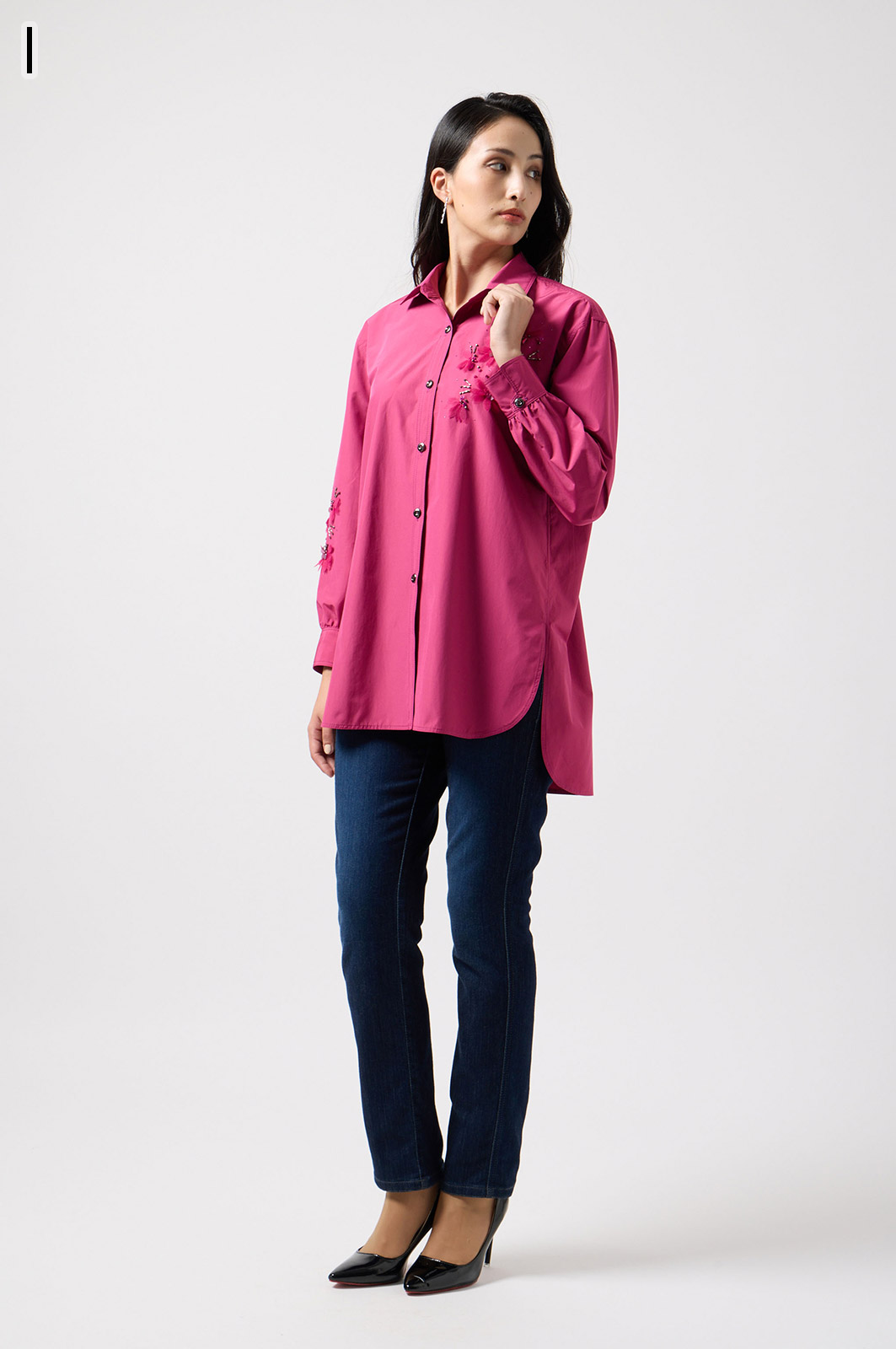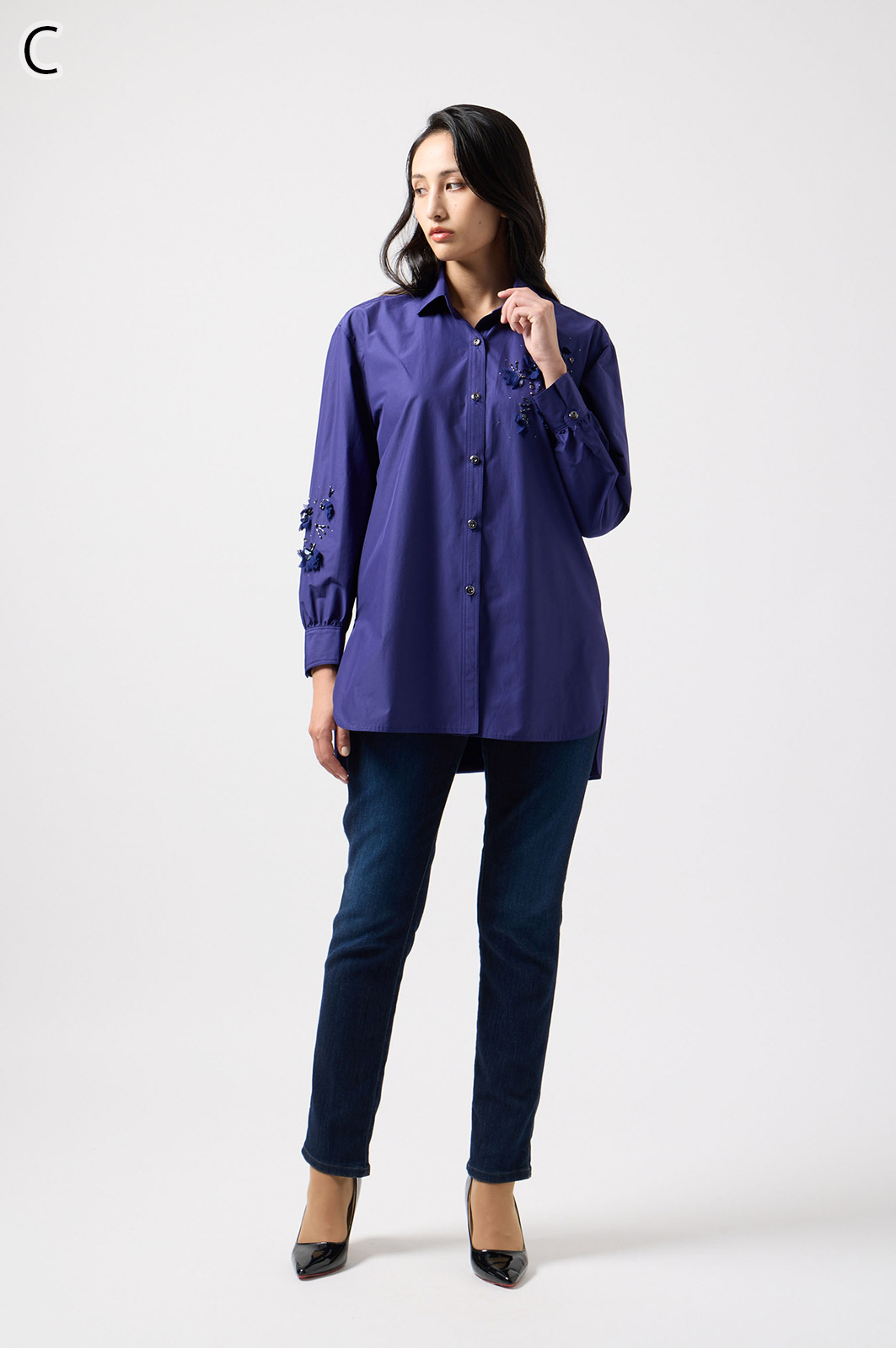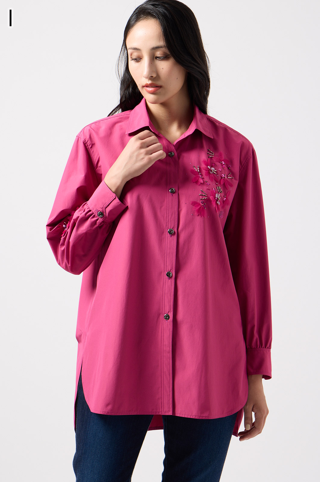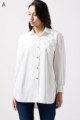 季節を問わず着られるやわらかな綿混素材のシャツ。ひらひらと花びらのようなデザインが、さりげなく可愛らしさを引き立ててくれる一枚です。