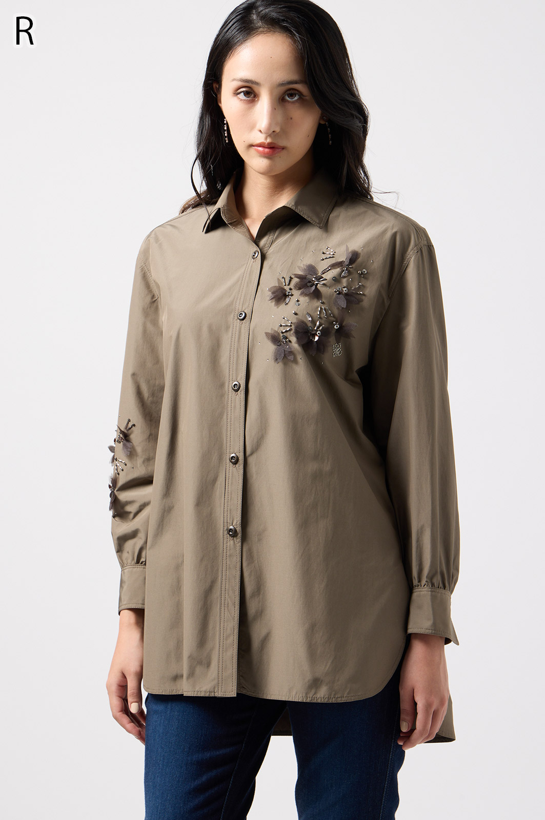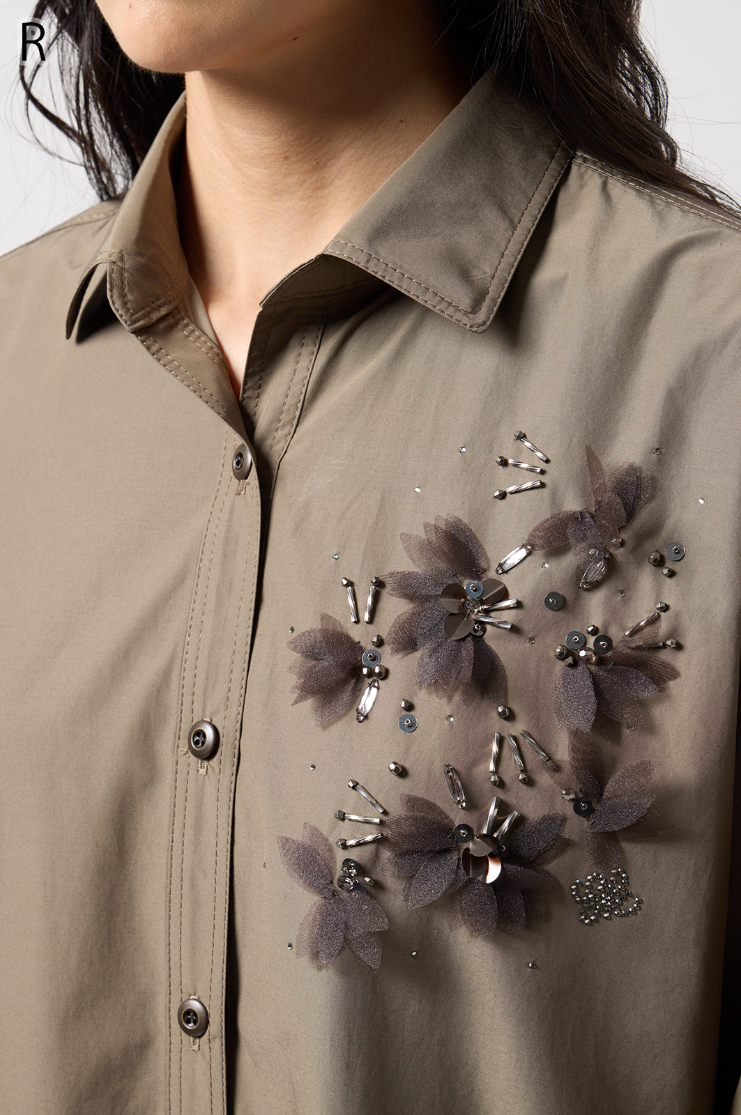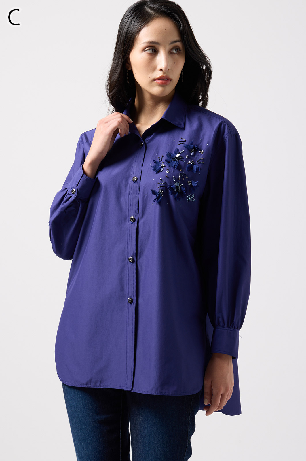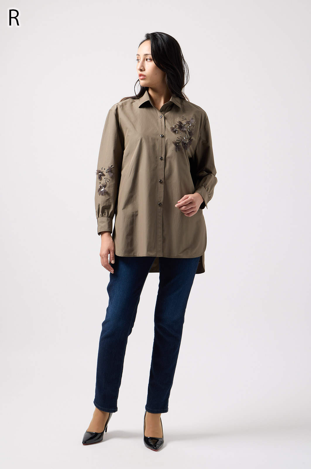 季節を問わず着られるやわらかな綿混素材のシャツ。ひらひらと花びらのようなデザインが、さりげなく可愛らしさを引き立ててくれる一枚です。