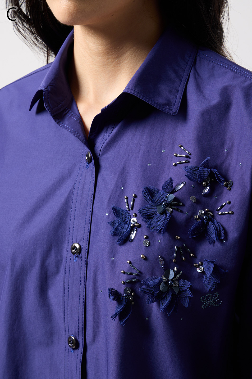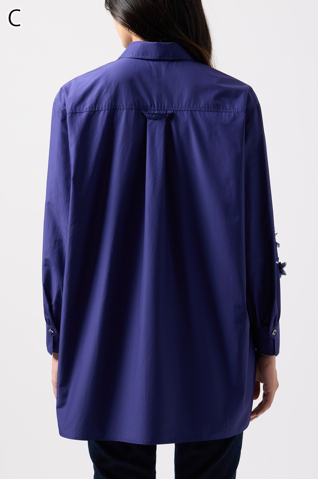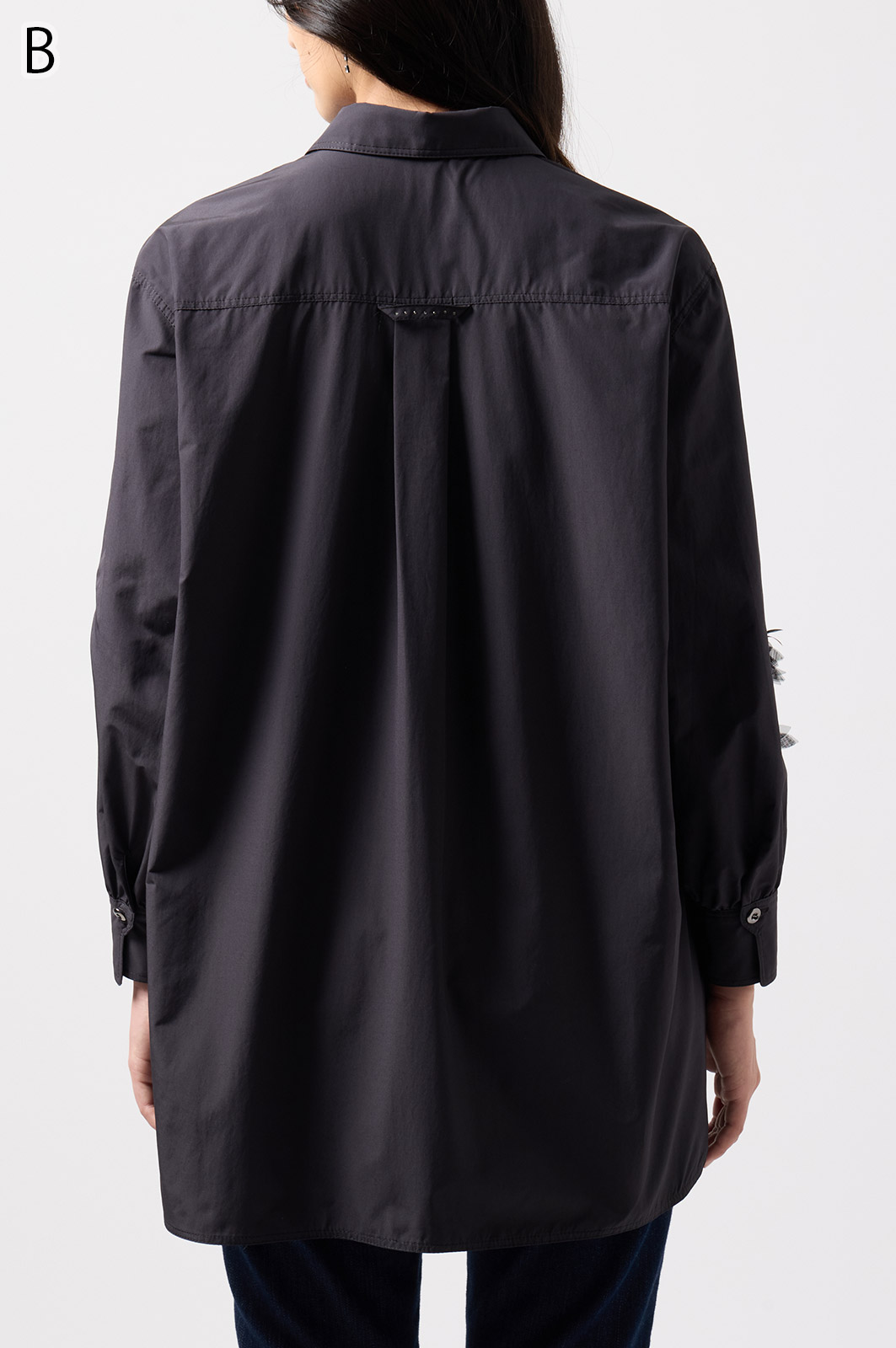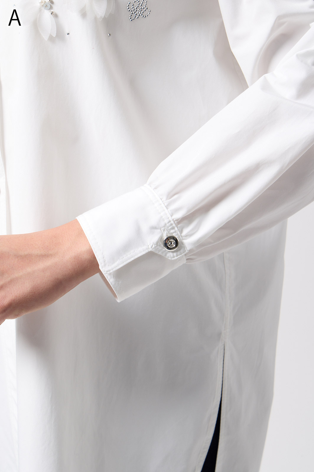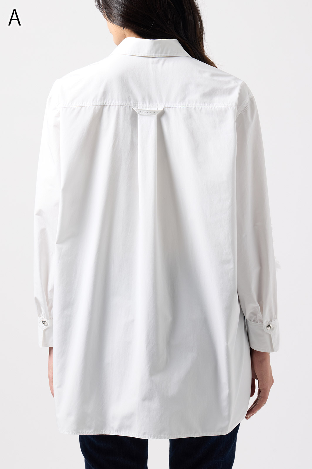 季節を問わず着られるやわらかな綿混素材のシャツ。ひらひらと花びらのようなデザインが、さりげなく可愛らしさを引き立ててくれる一枚です。