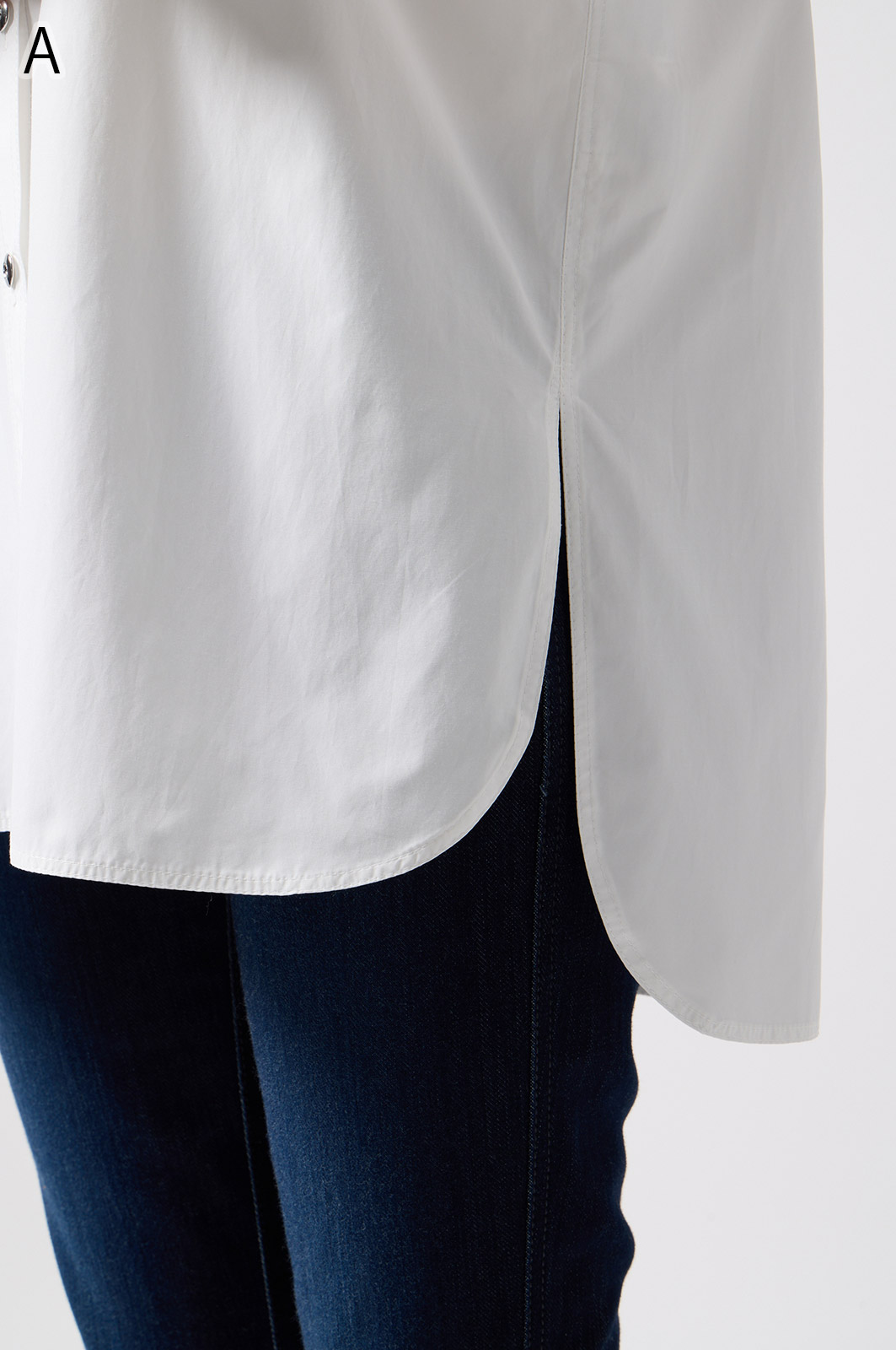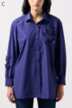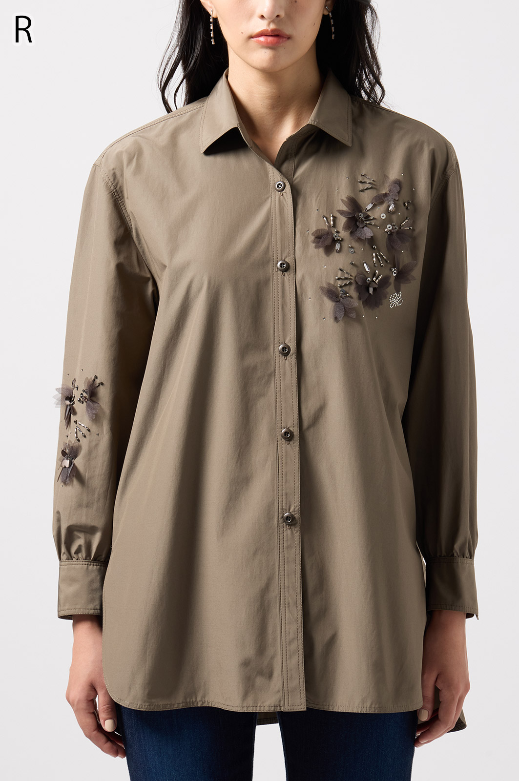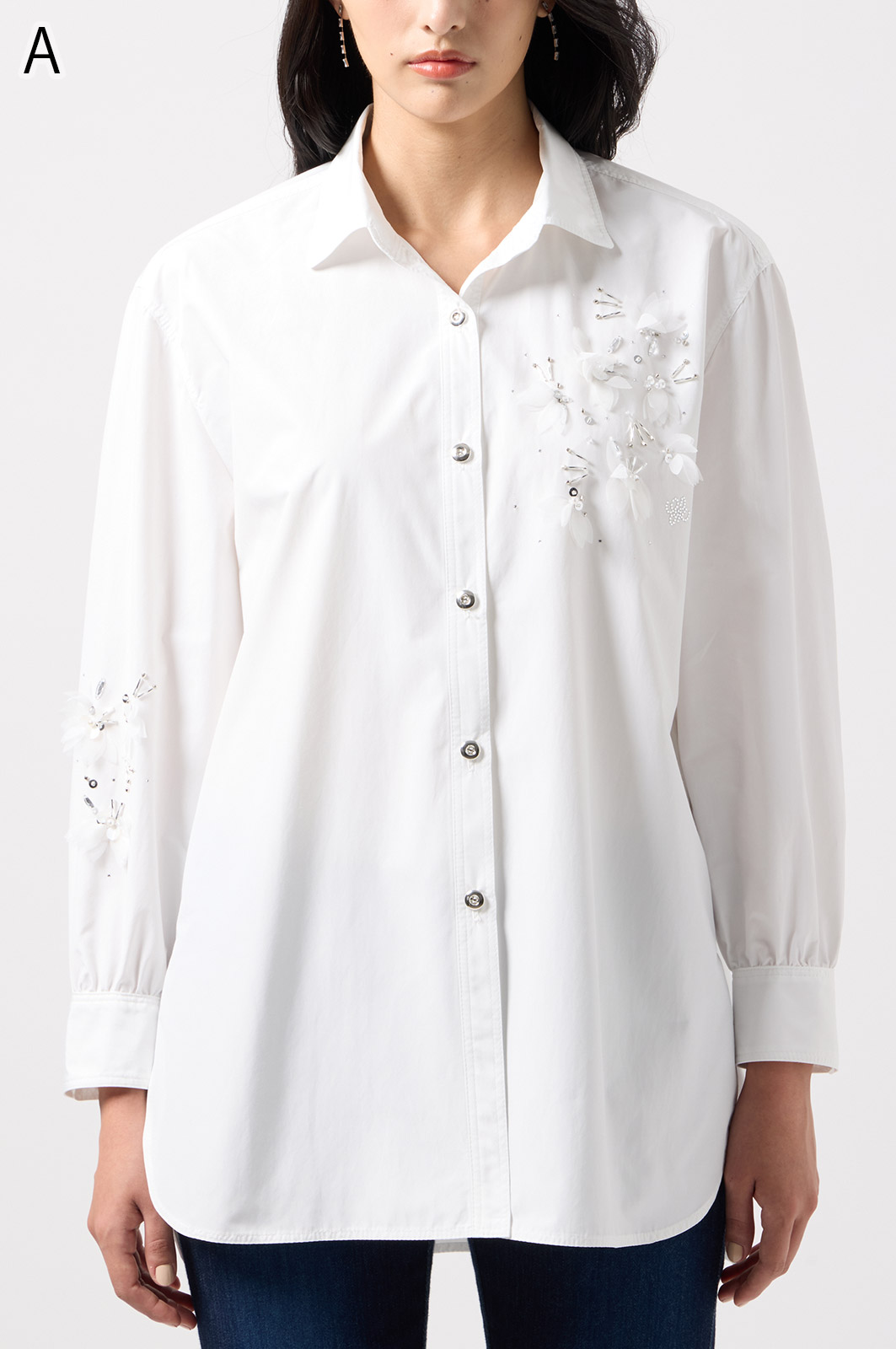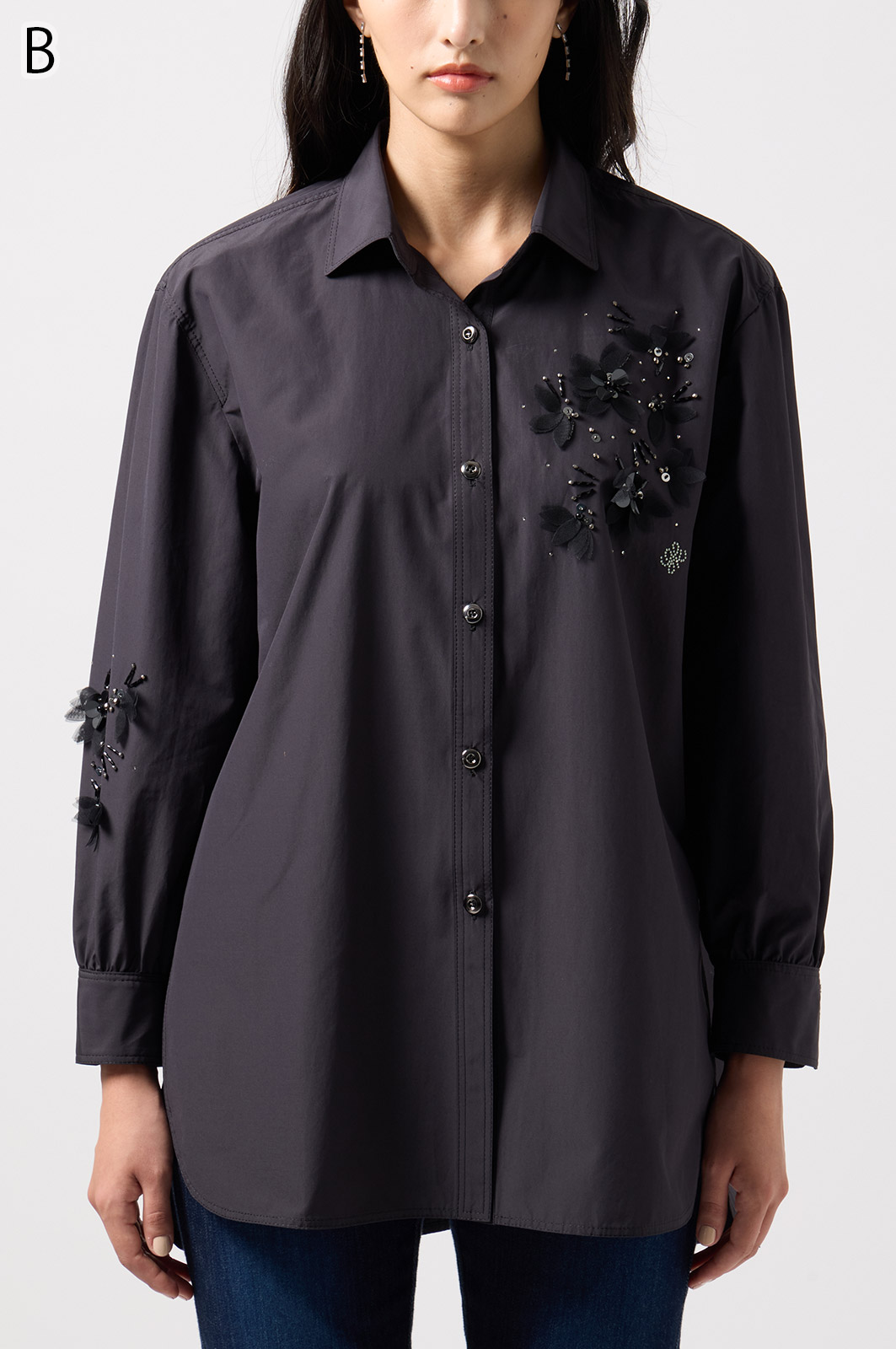 季節を問わず着られるやわらかな綿混素材のシャツ。ひらひらと花びらのようなデザインが、さりげなく可愛らしさを引き立ててくれる一枚です。