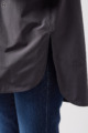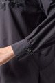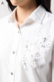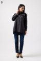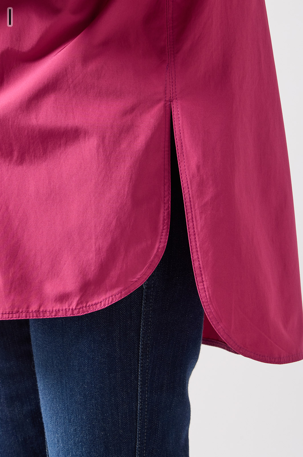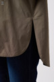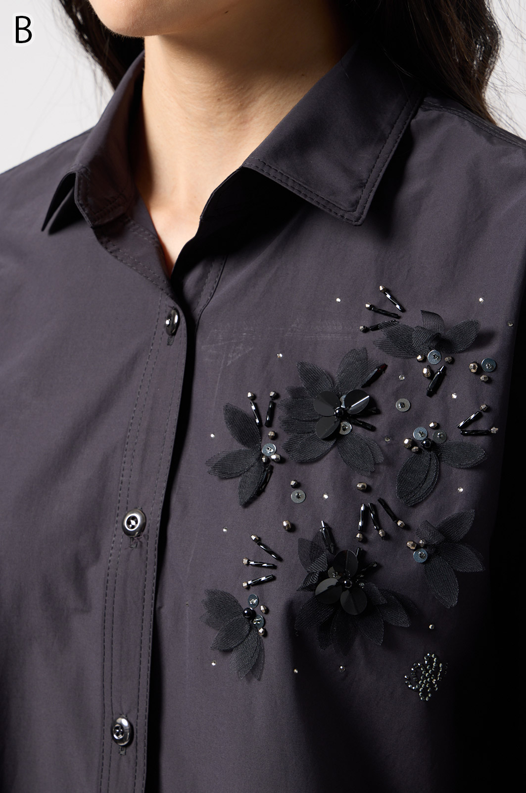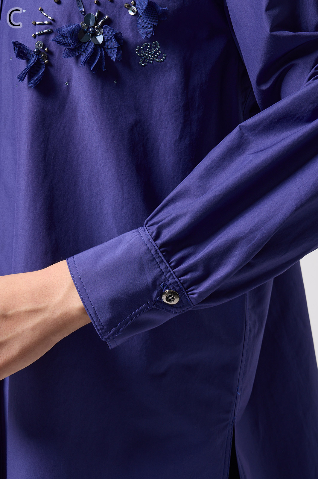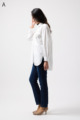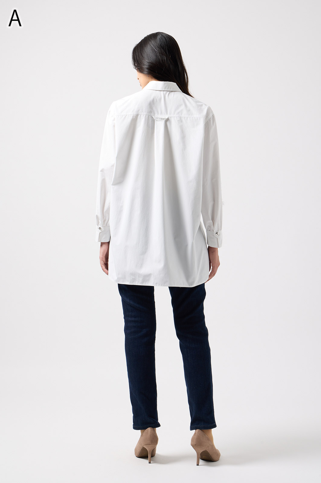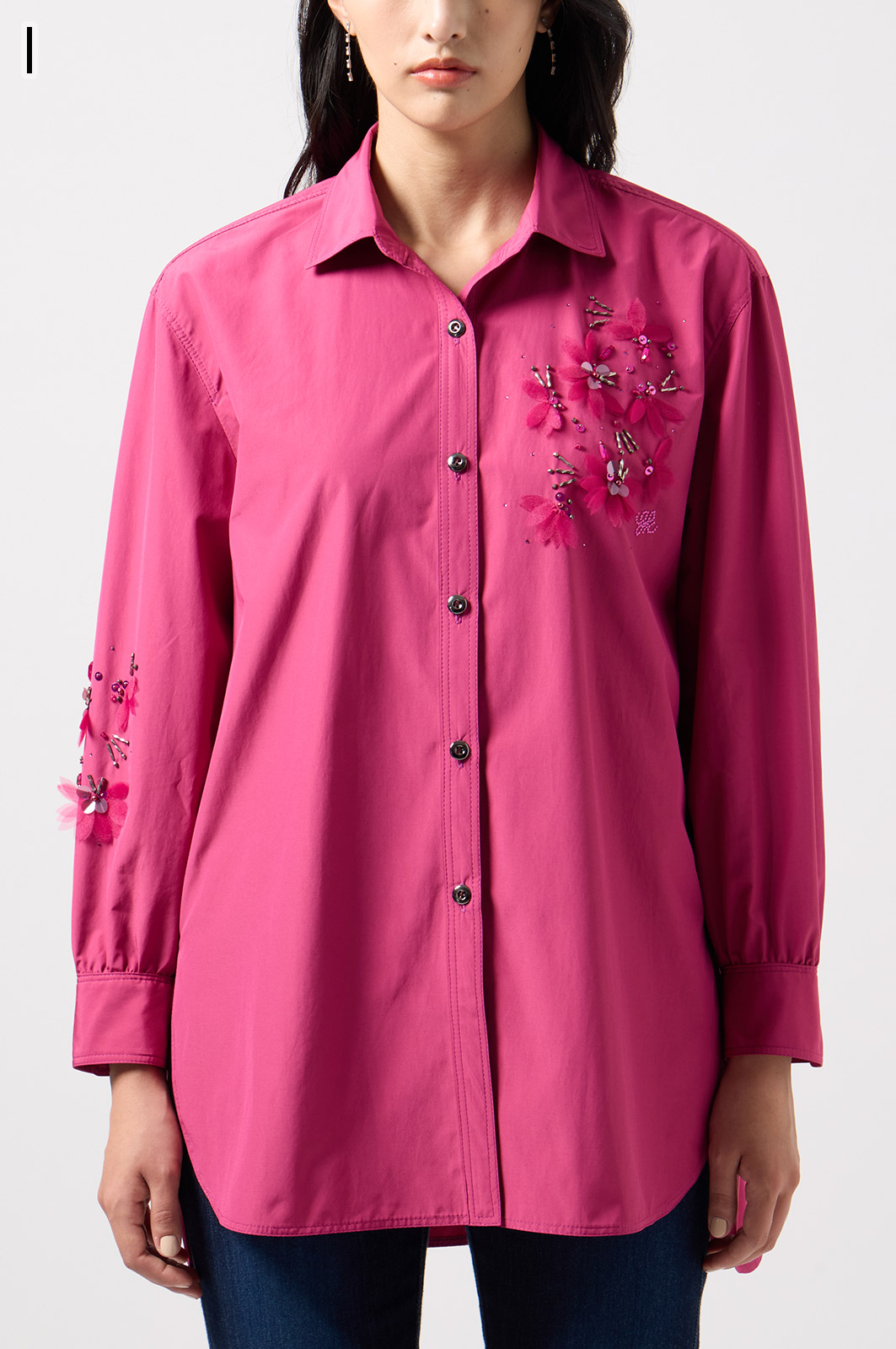 季節を問わず着られるやわらかな綿混素材のシャツ。ひらひらと花びらのようなデザインが、さりげなく可愛らしさを引き立ててくれる一枚です。