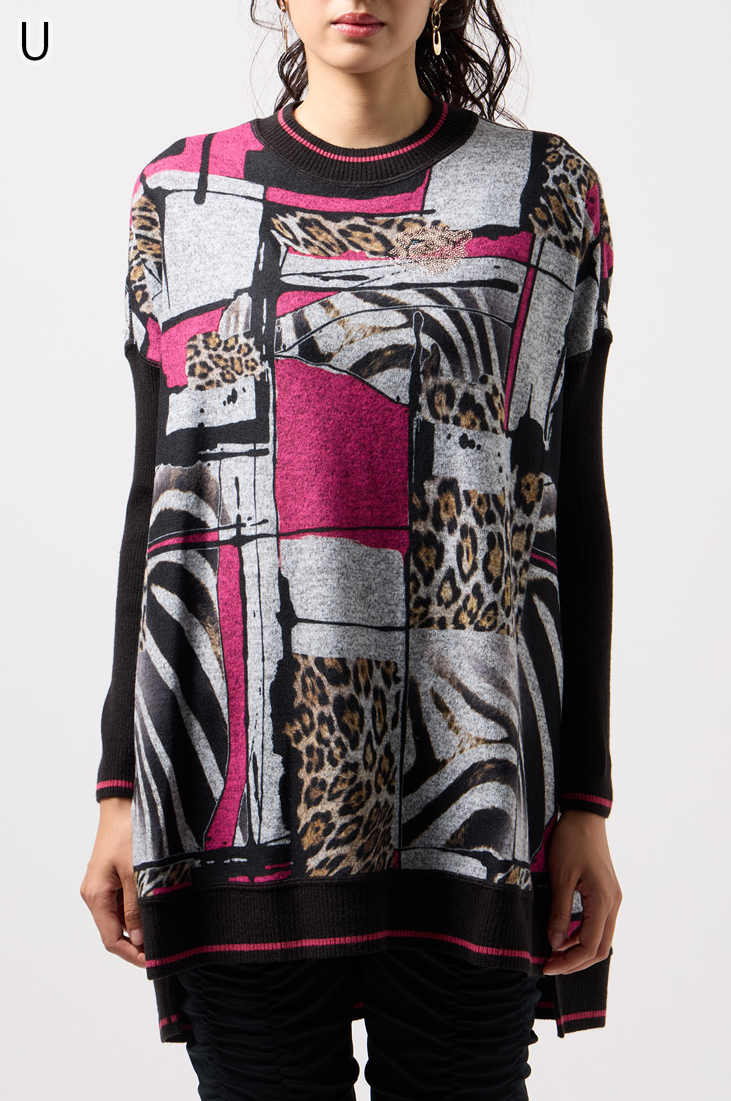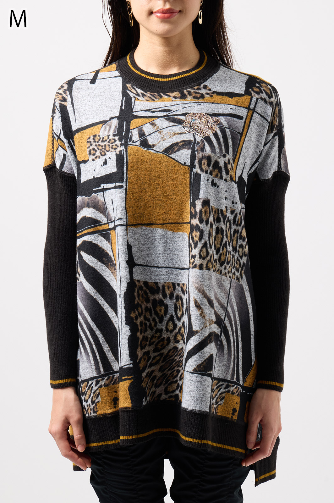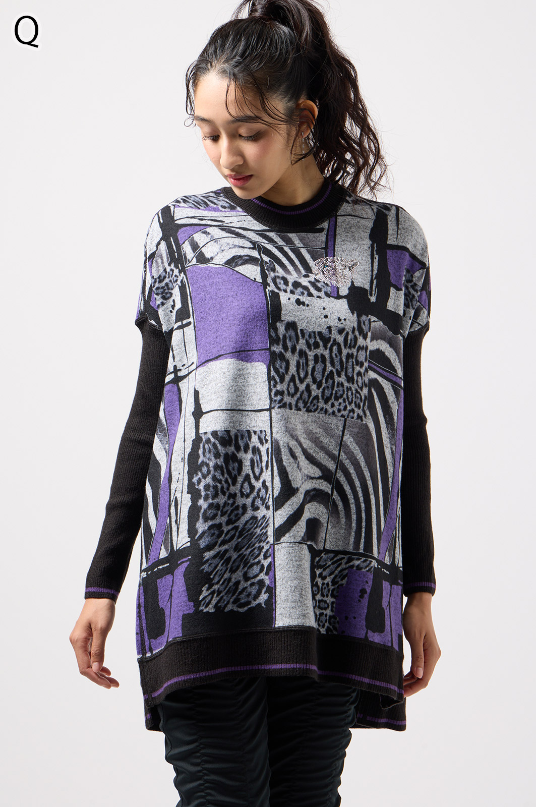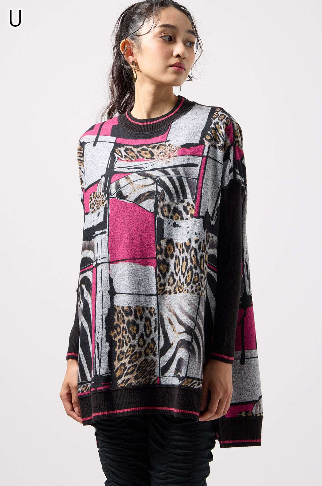 ヒョウ柄と幾何学柄が融合した個性際立つニット素材のTシャツ。衿・袖・裾にニットを使用し、上品なアクセントをプラス。程よいフィット感で快適な着心地を叶えます。