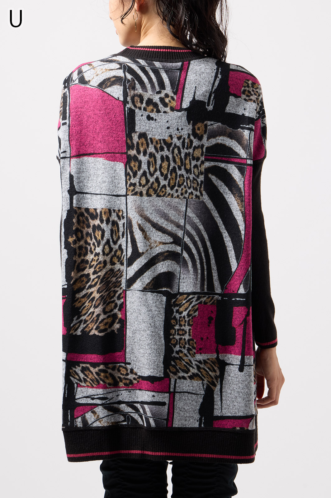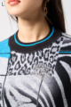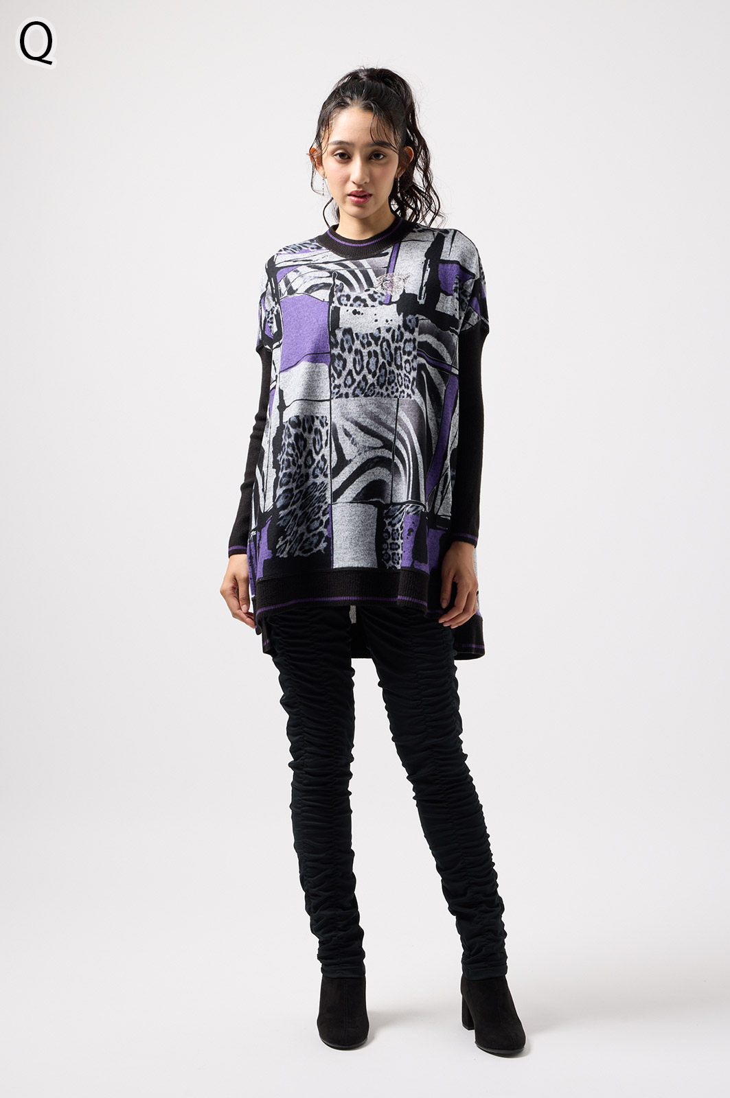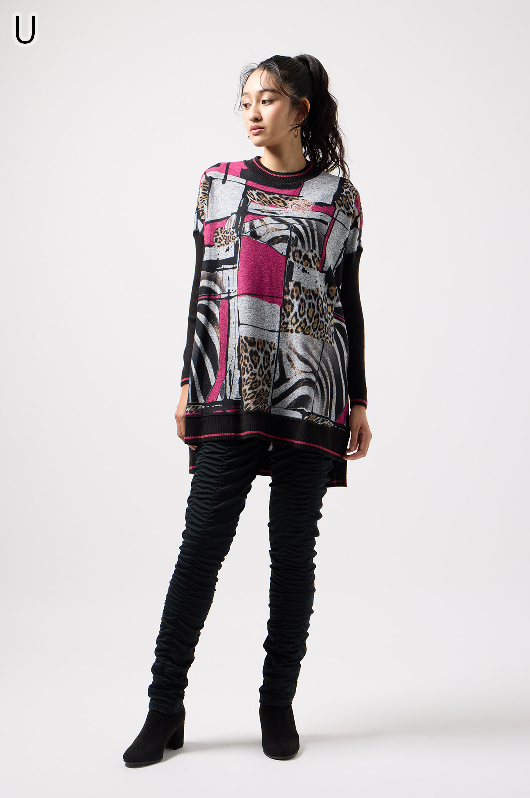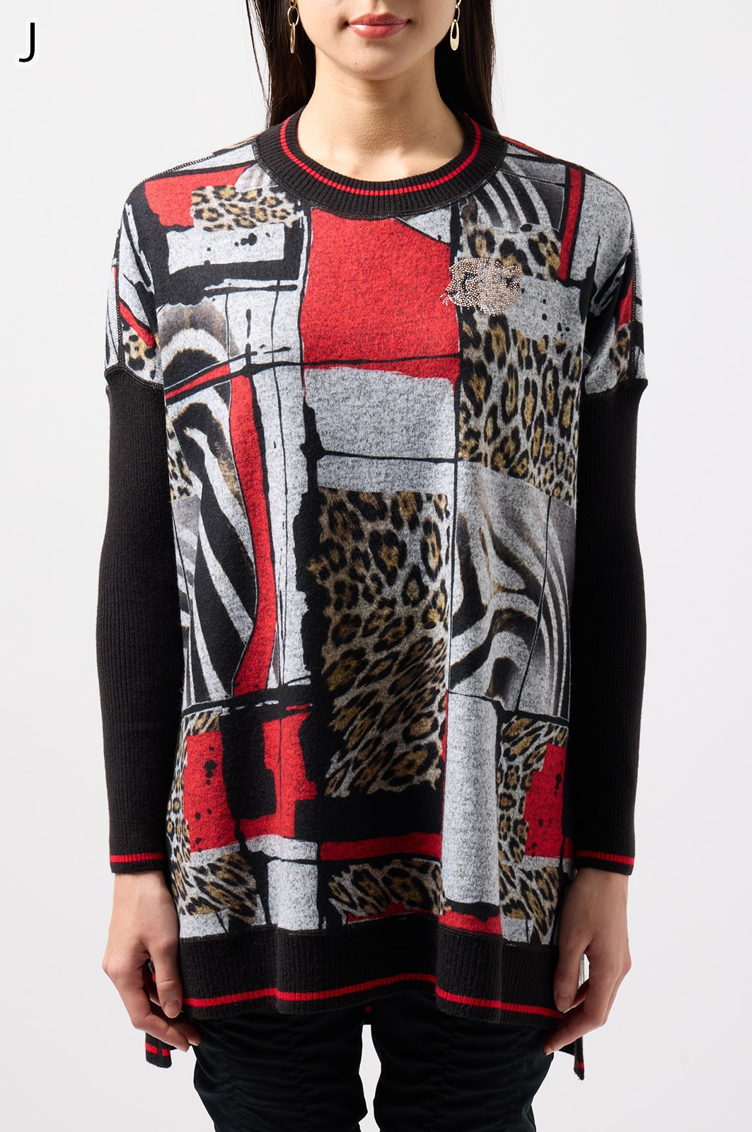 ヒョウ柄と幾何学柄が融合した個性際立つニット素材のTシャツ。衿・袖・裾にニットを使用し、上品なアクセントをプラス。程よいフィット感で快適な着心地を叶えます。