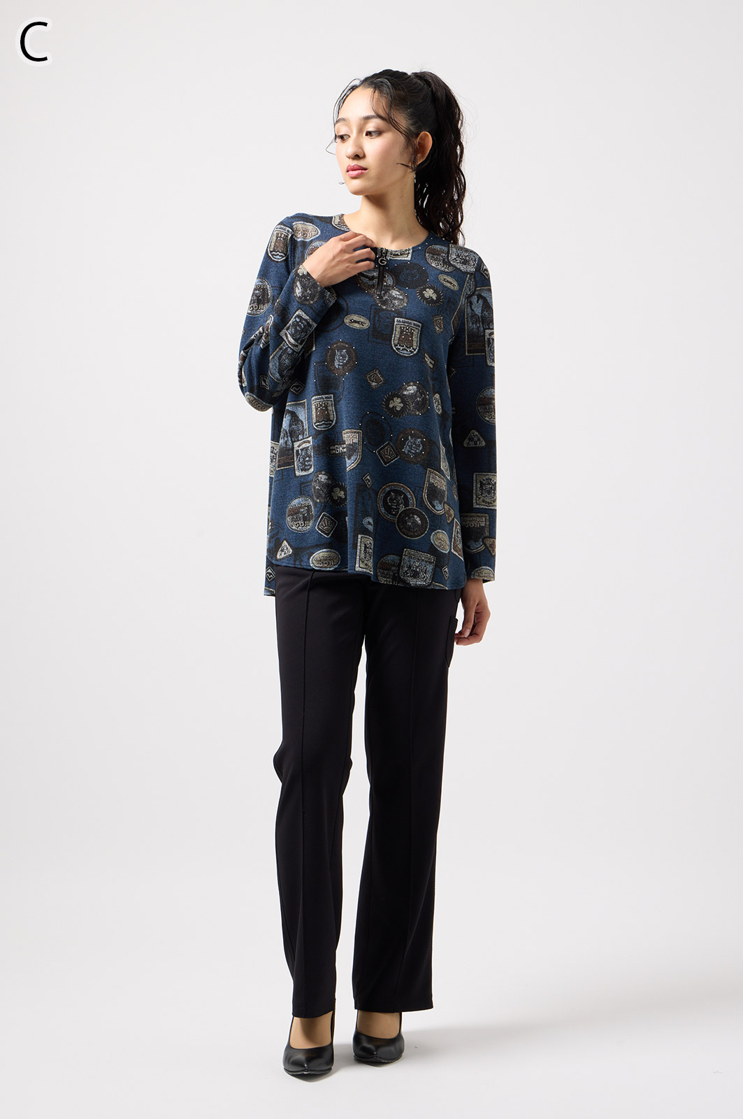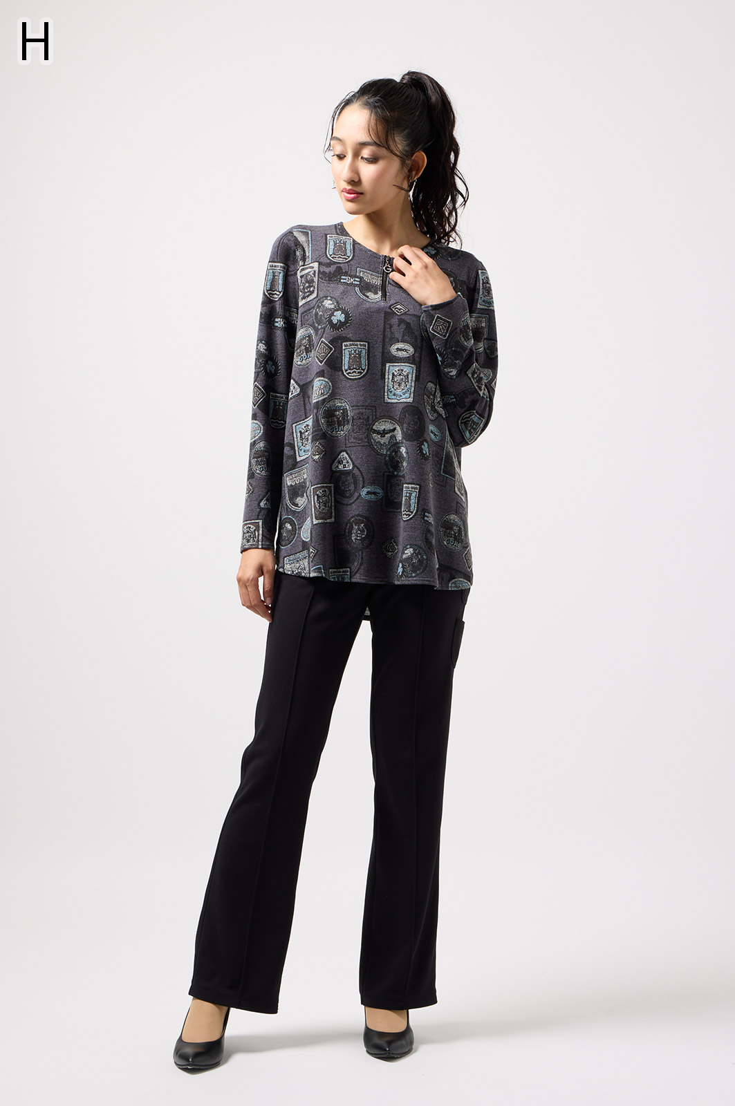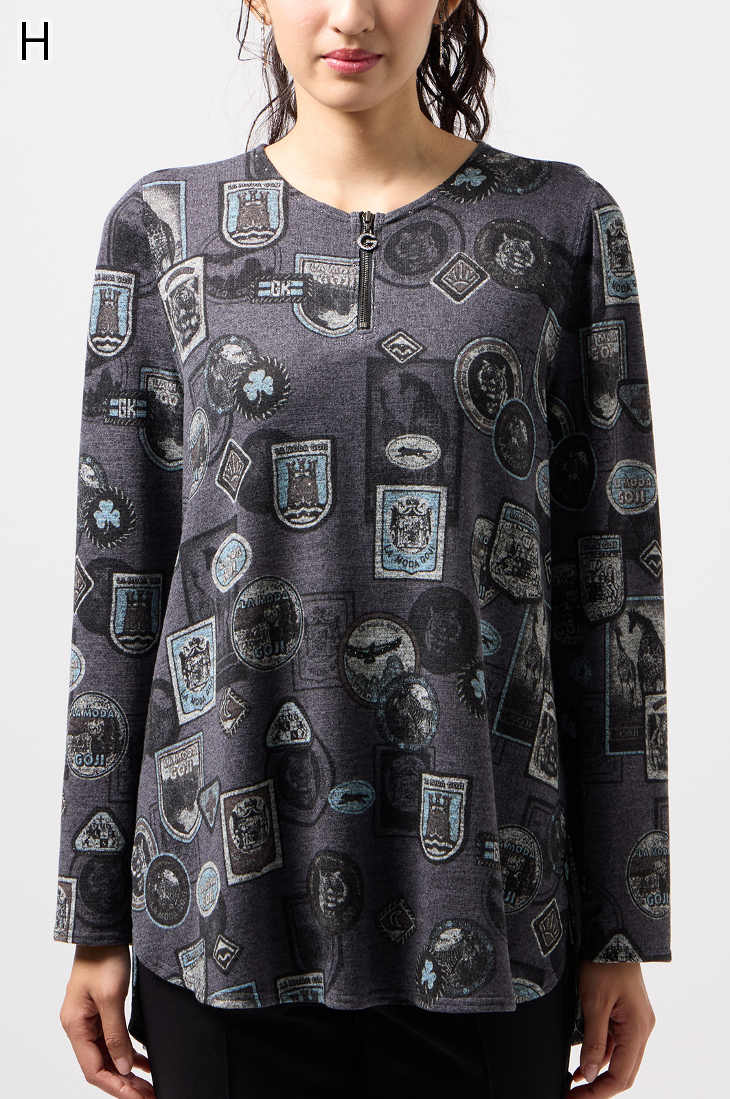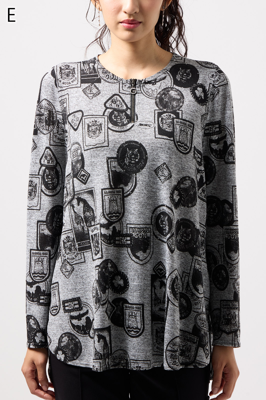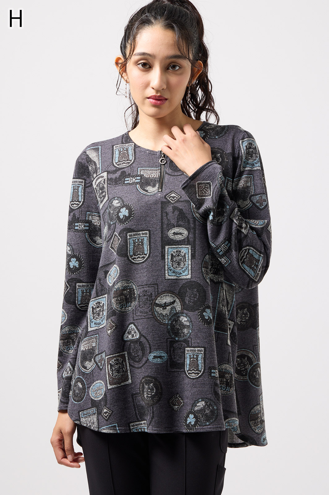 やわらかい肌ざわりのニット生地に、個性が光るオリジナル柄をプリント。前ファスナーで着脱しやすく、ゆったり広がるAラインが体のラインをきれいに見せてくれます。