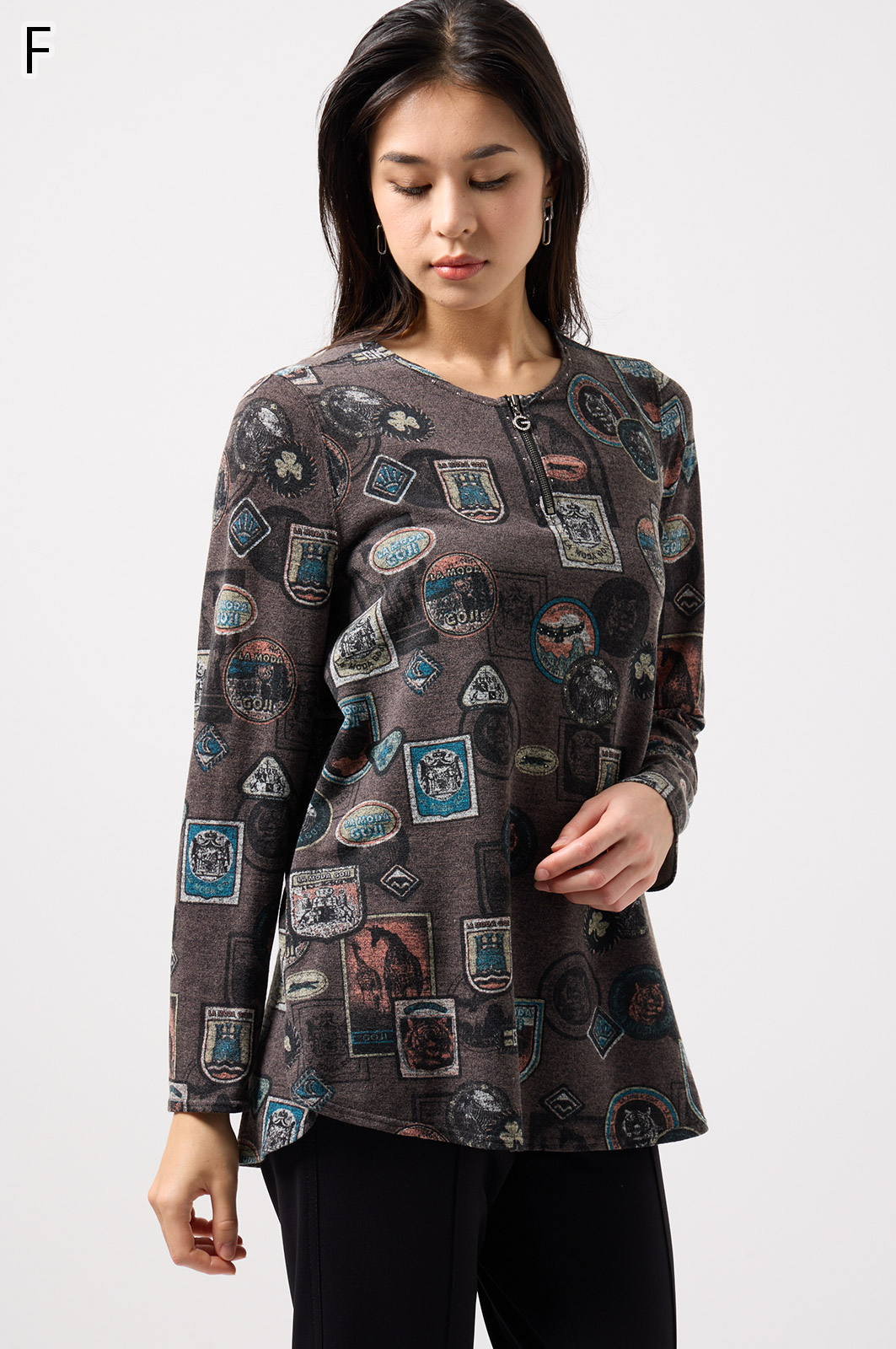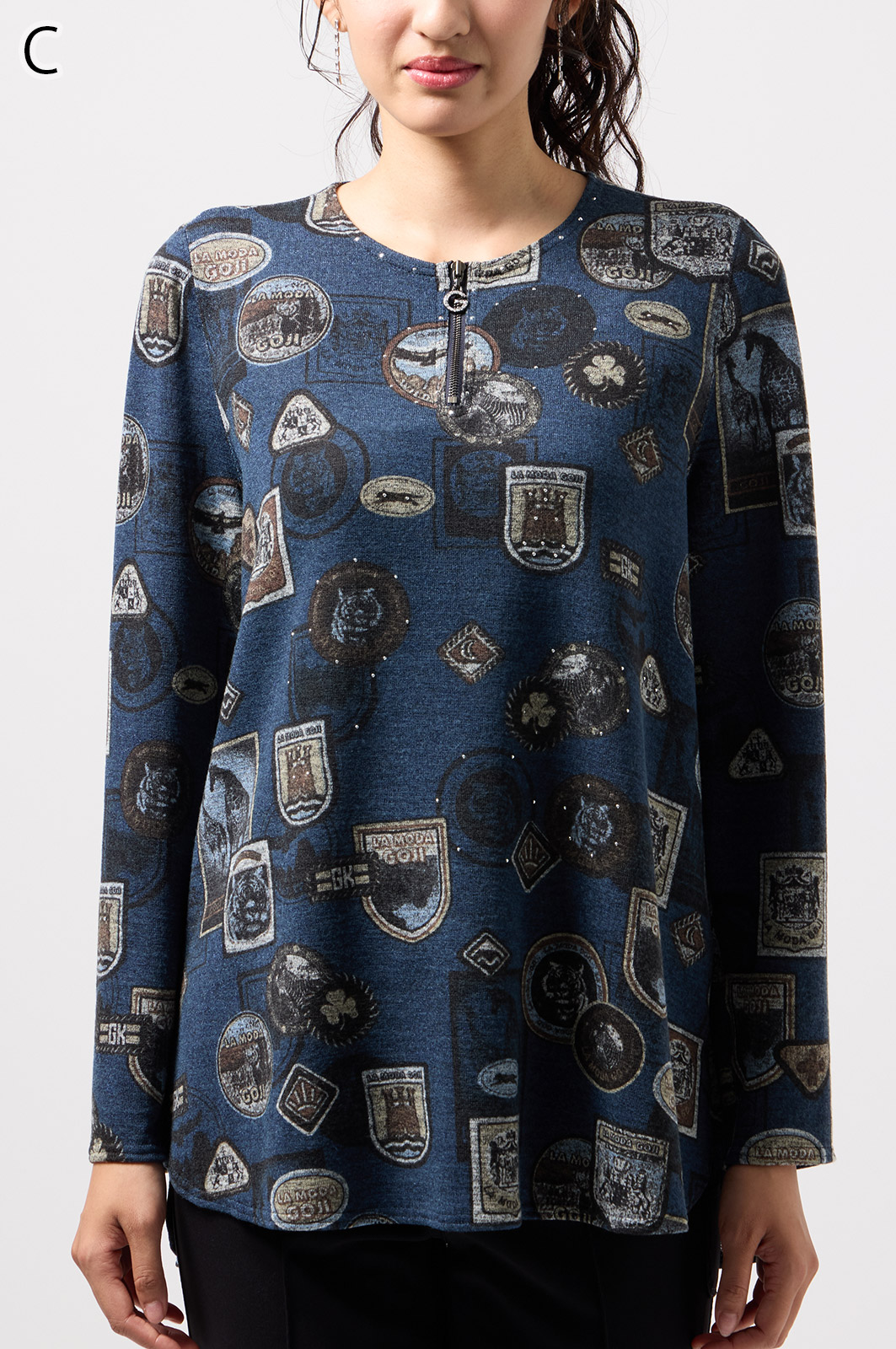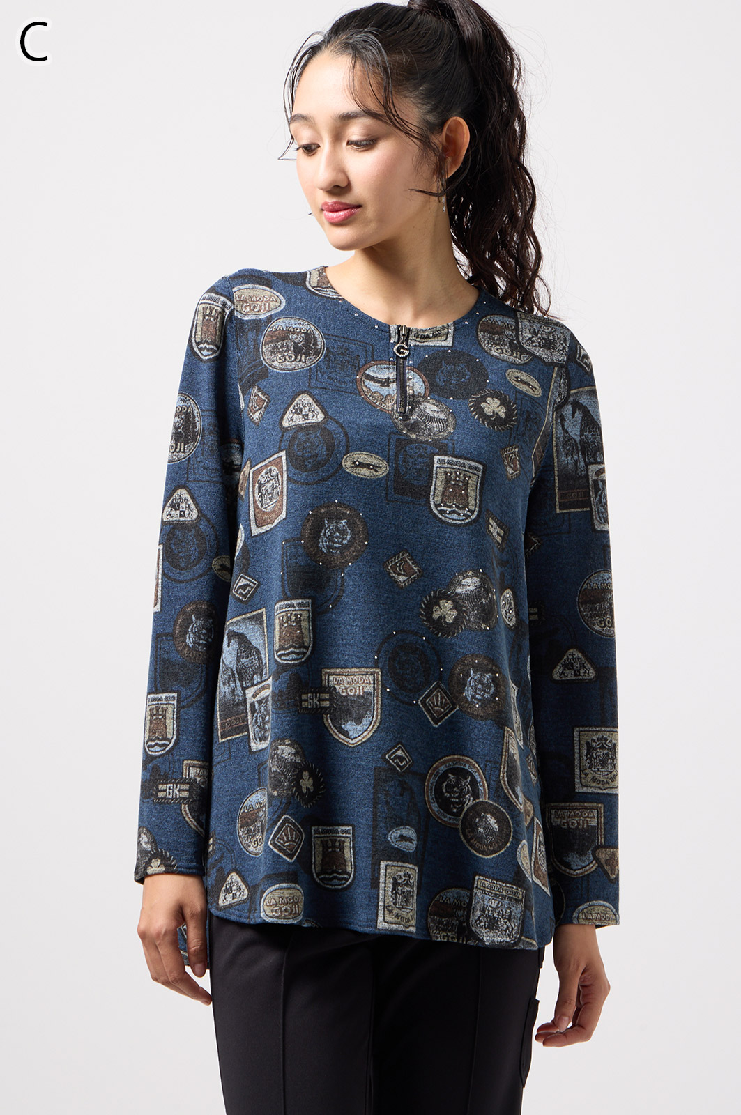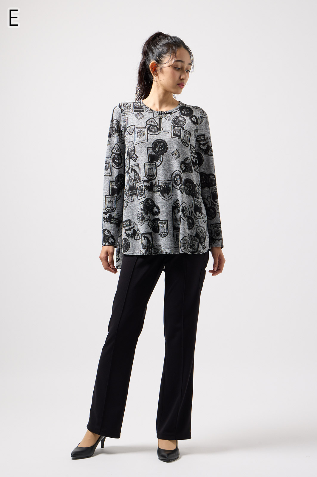 やわらかい肌ざわりのニット生地に、個性が光るオリジナル柄をプリント。前ファスナーで着脱しやすく、ゆったり広がるAラインが体のラインをきれいに見せてくれます。
