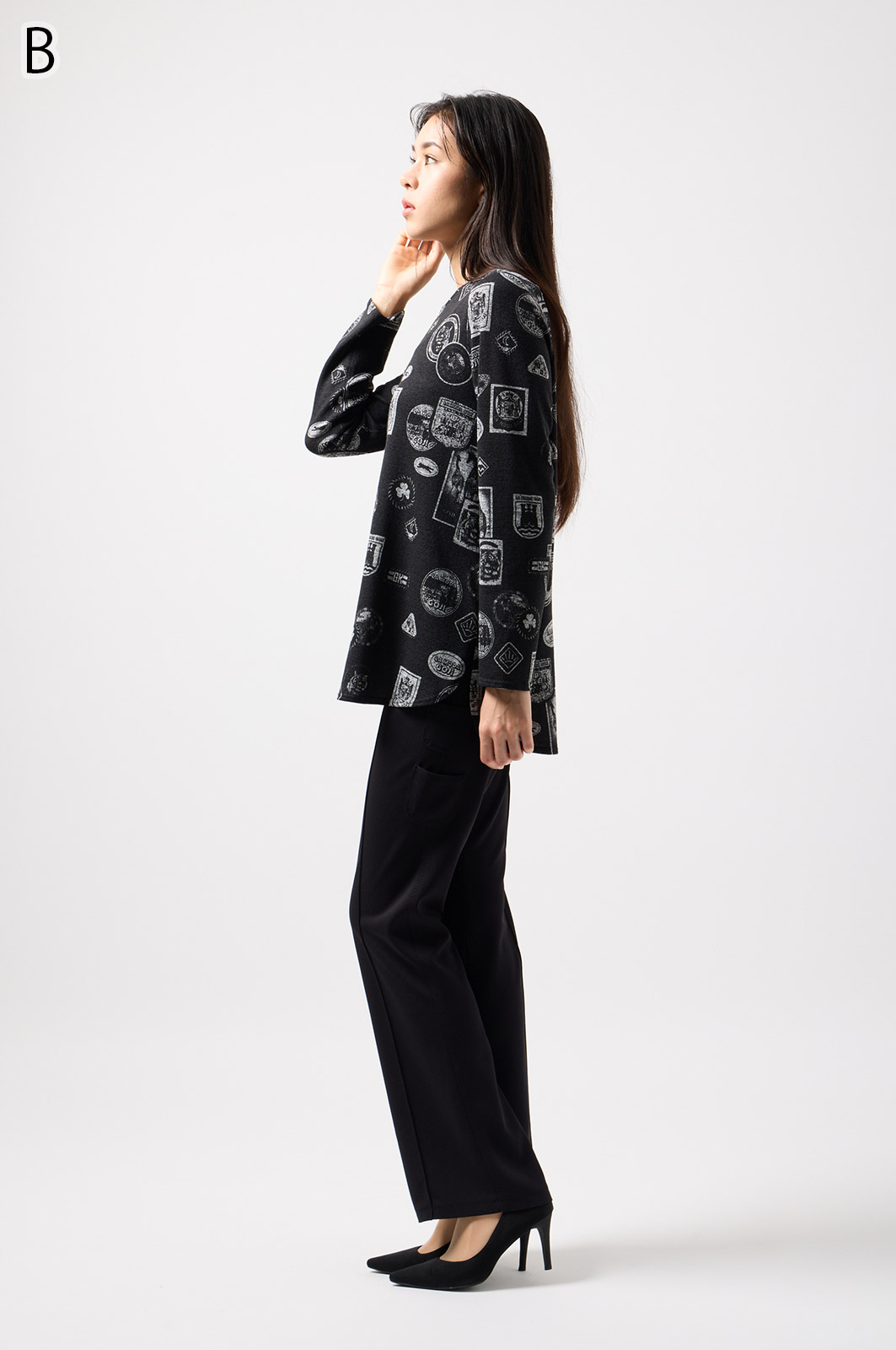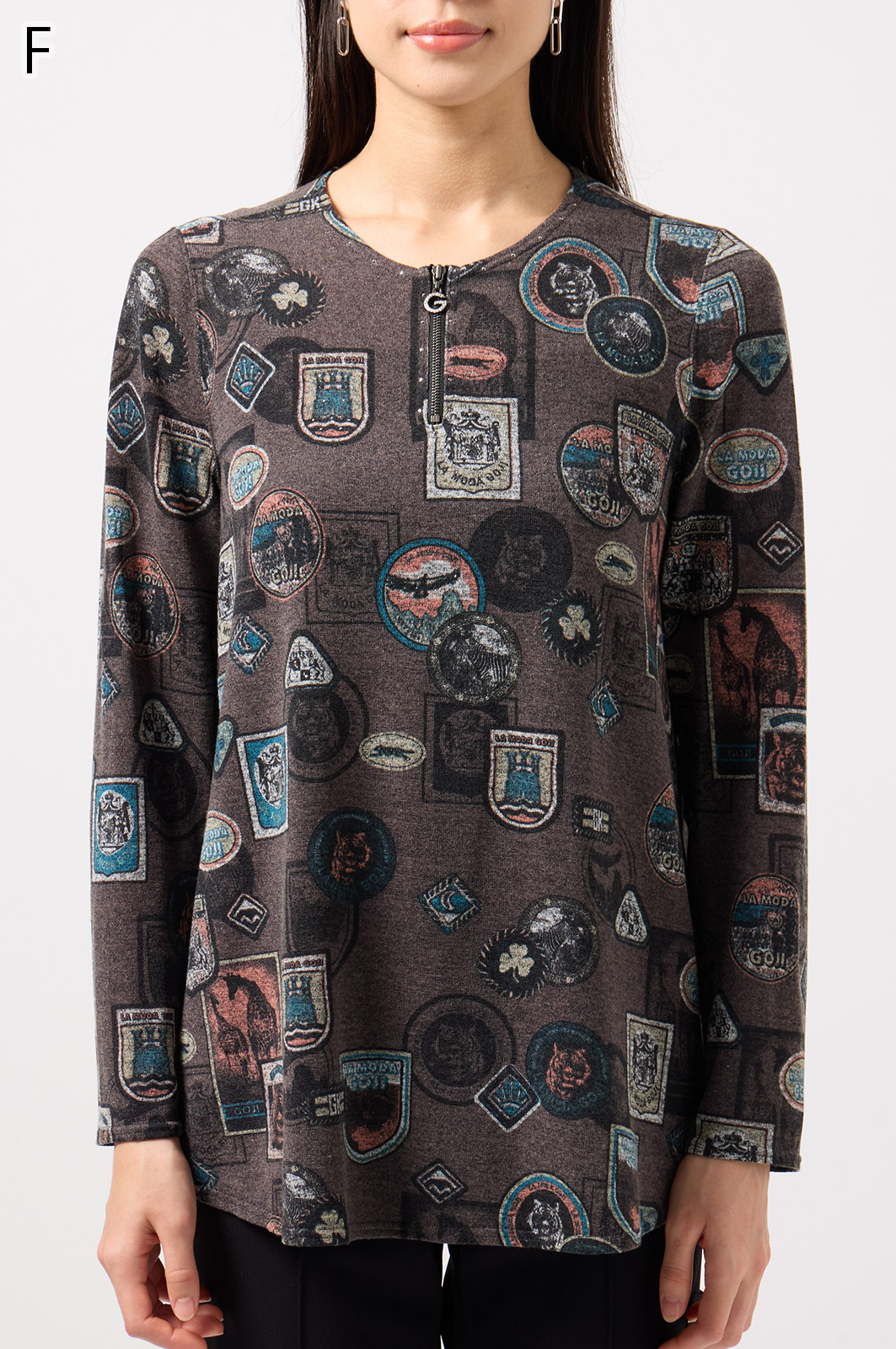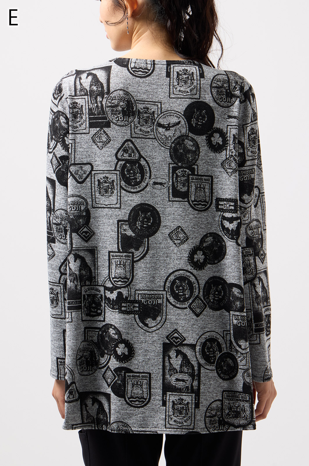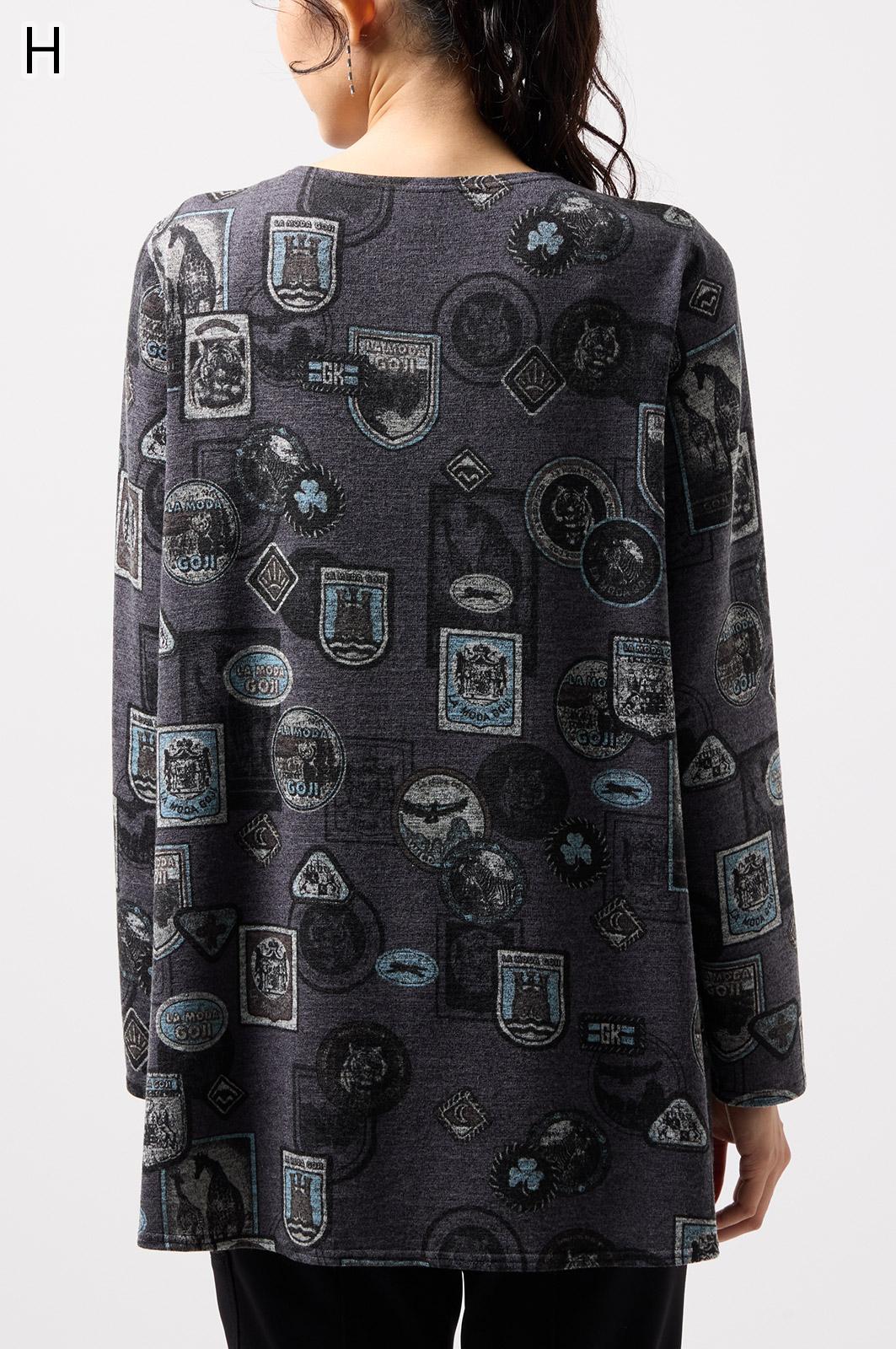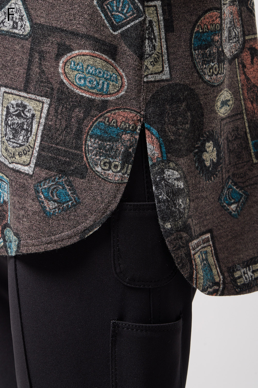 やわらかい肌ざわりのニット生地に、個性が光るオリジナル柄をプリント。前ファスナーで着脱しやすく、ゆったり広がるAラインが体のラインをきれいに見せてくれます。
