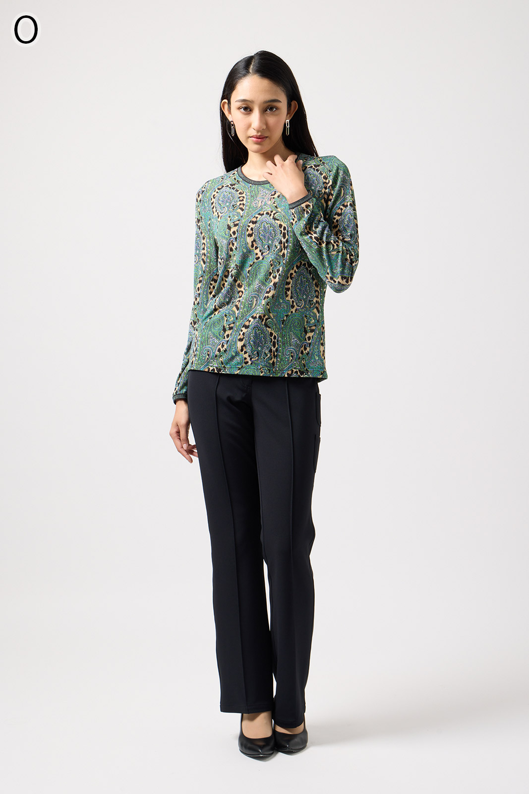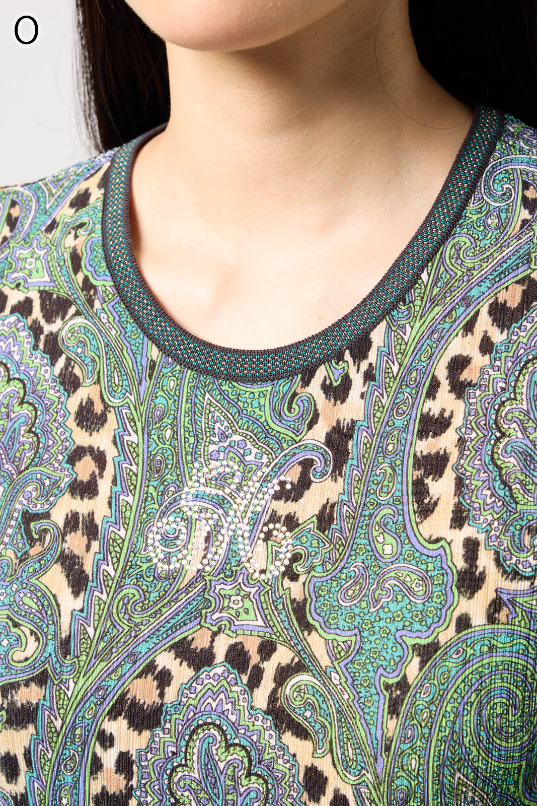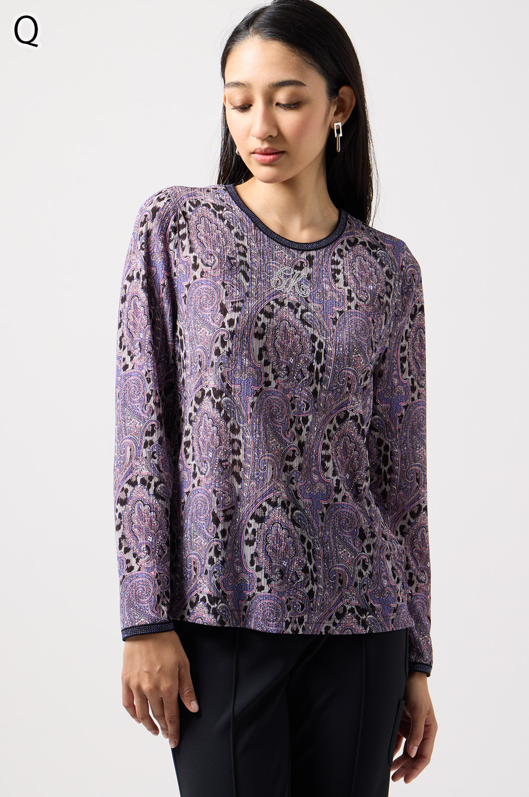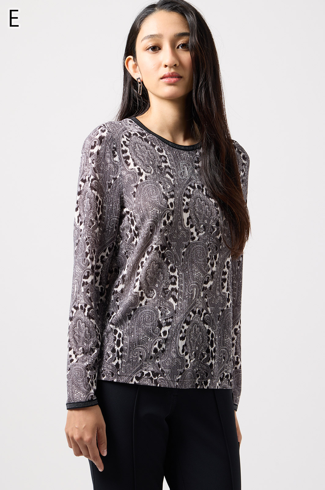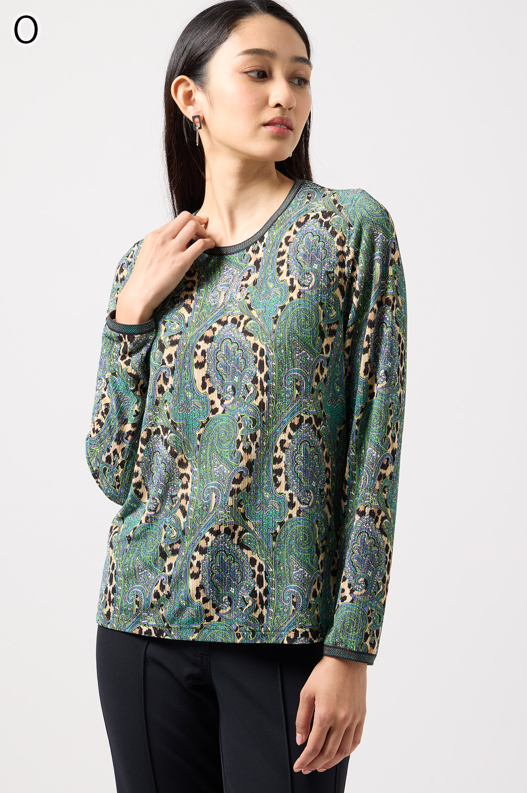 ペイズリーとヒョウ柄を組み合わせた、目を引くオリジナルプリントが魅力。やわらかく伸びる素材で、動きやすく快適な着心地。首元すっきりのノーカラーデザインで、重ね着もしやすいインナー向きのTシャツです。