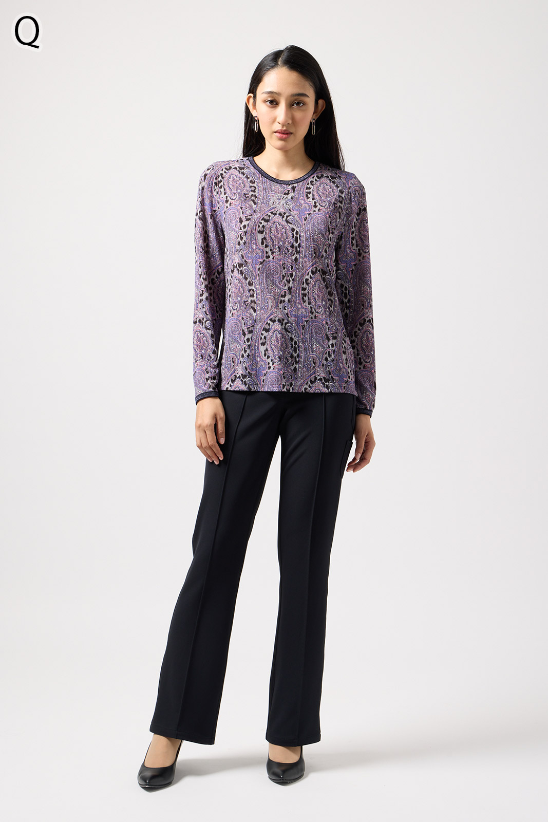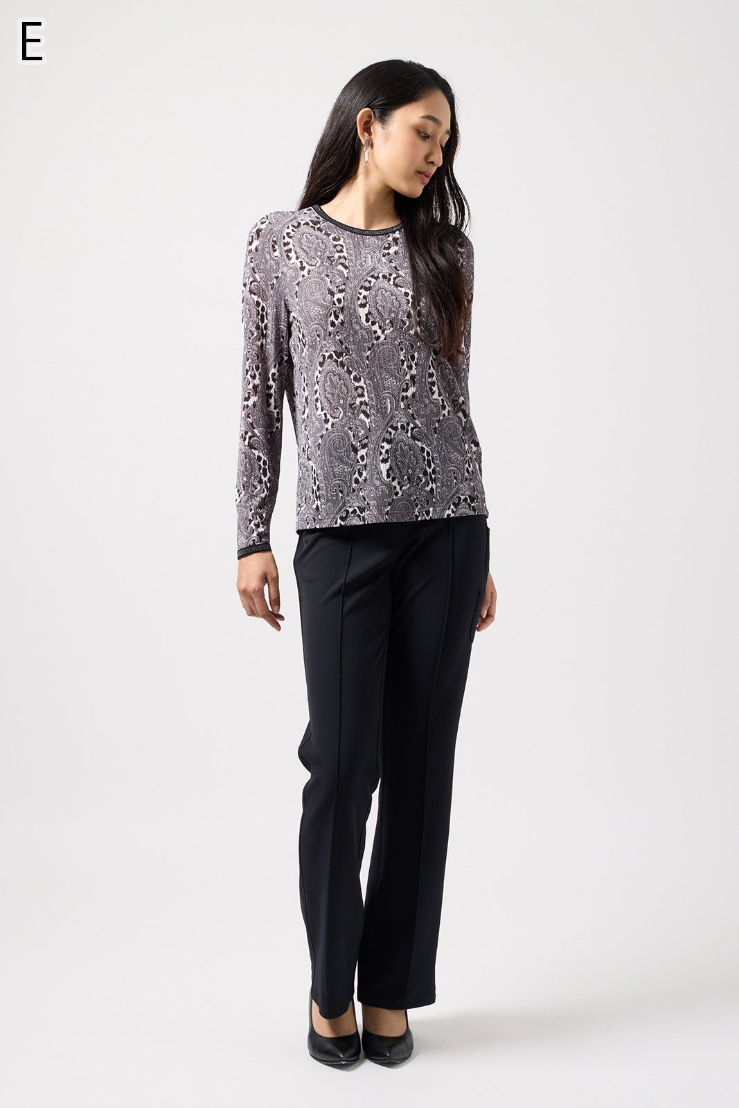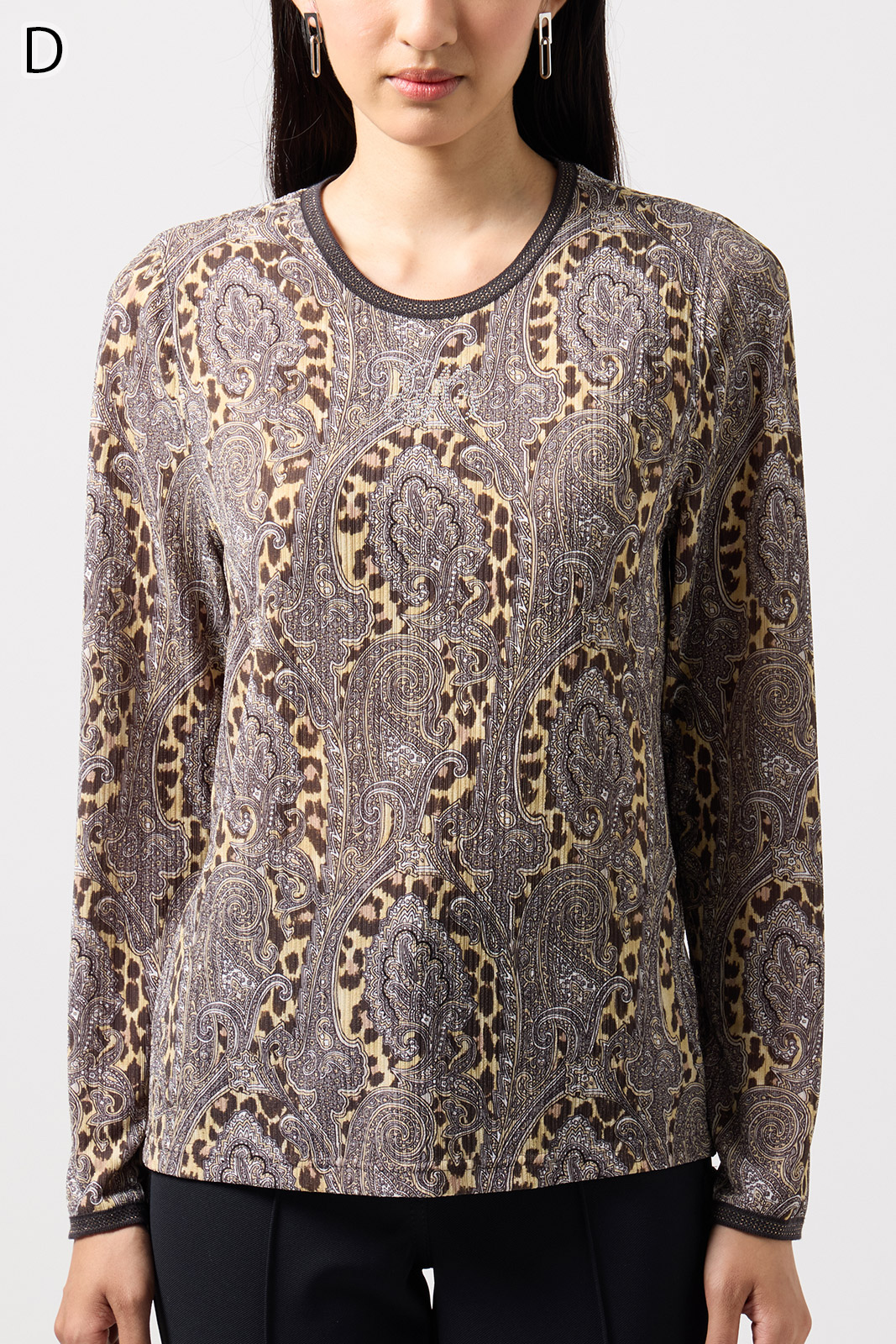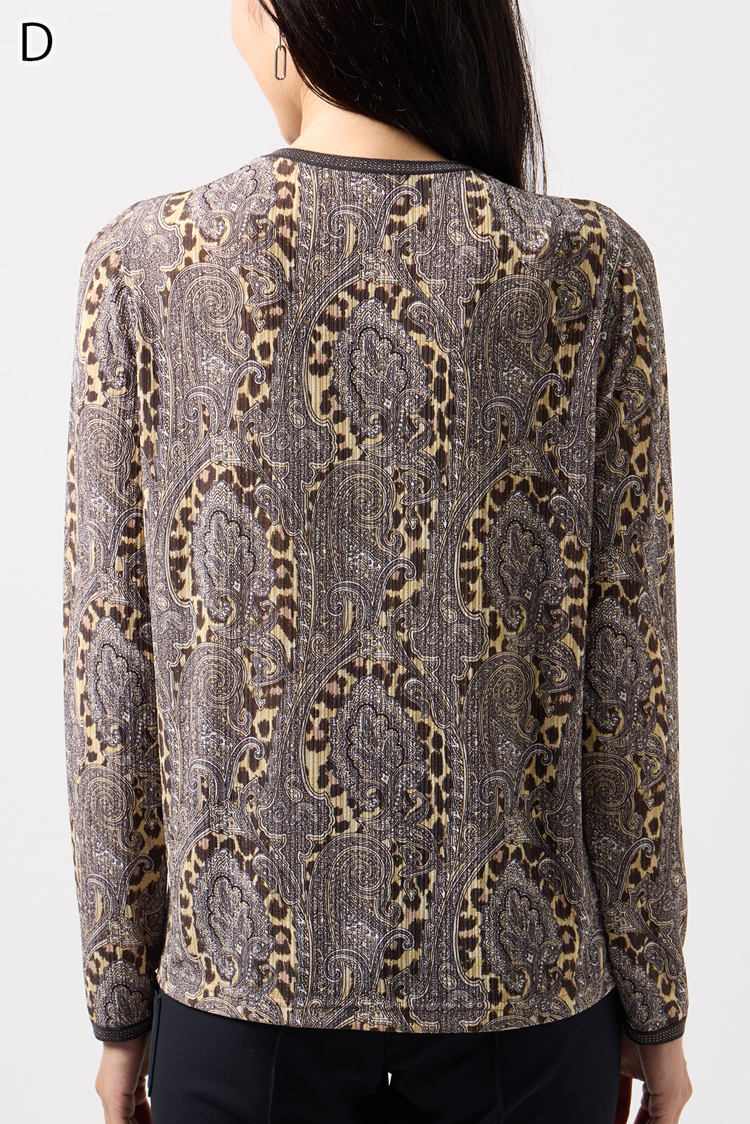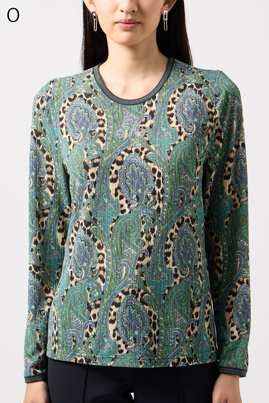 ペイズリーとヒョウ柄を組み合わせた、目を引くオリジナルプリントが魅力。やわらかく伸びる素材で、動きやすく快適な着心地。首元すっきりのノーカラーデザインで、重ね着もしやすいインナー向きのTシャツです。