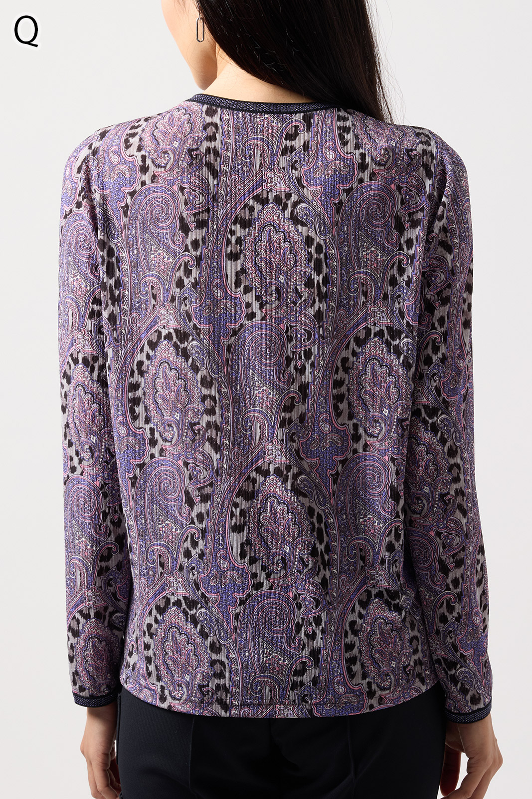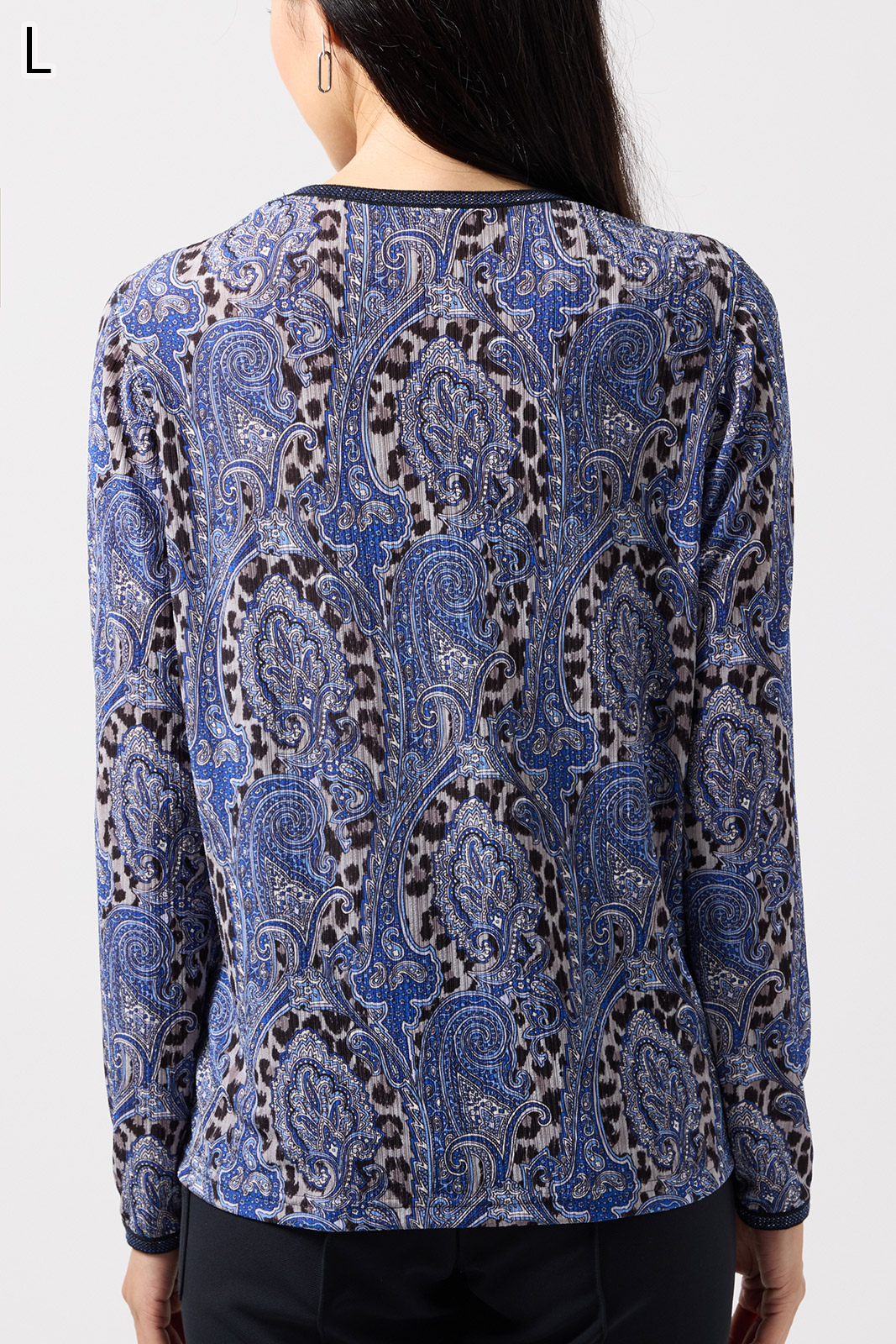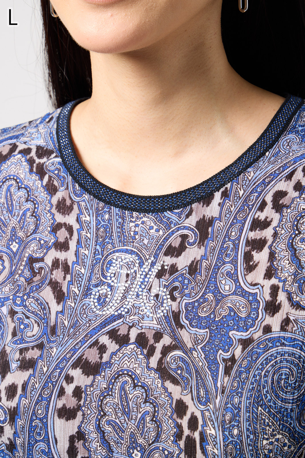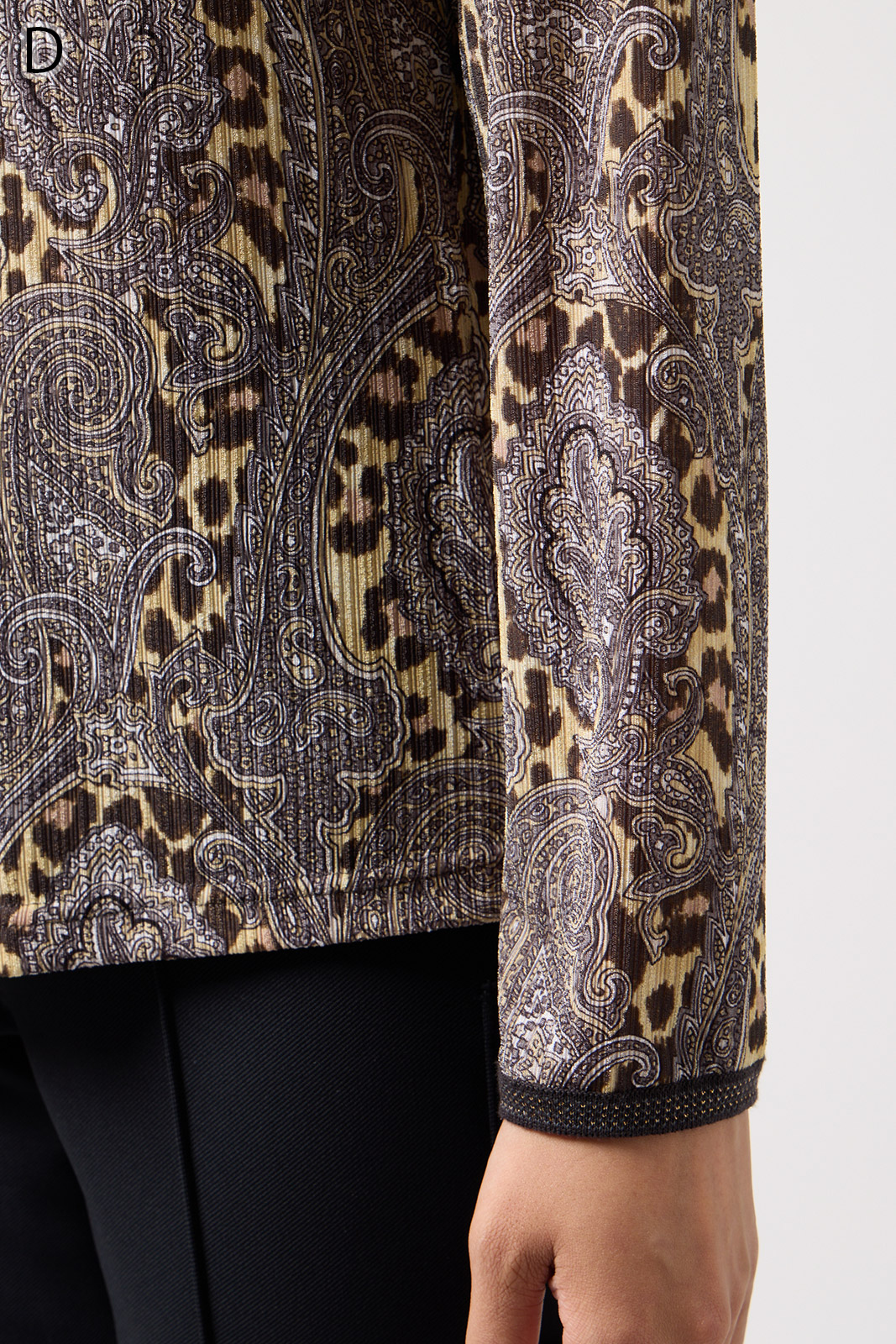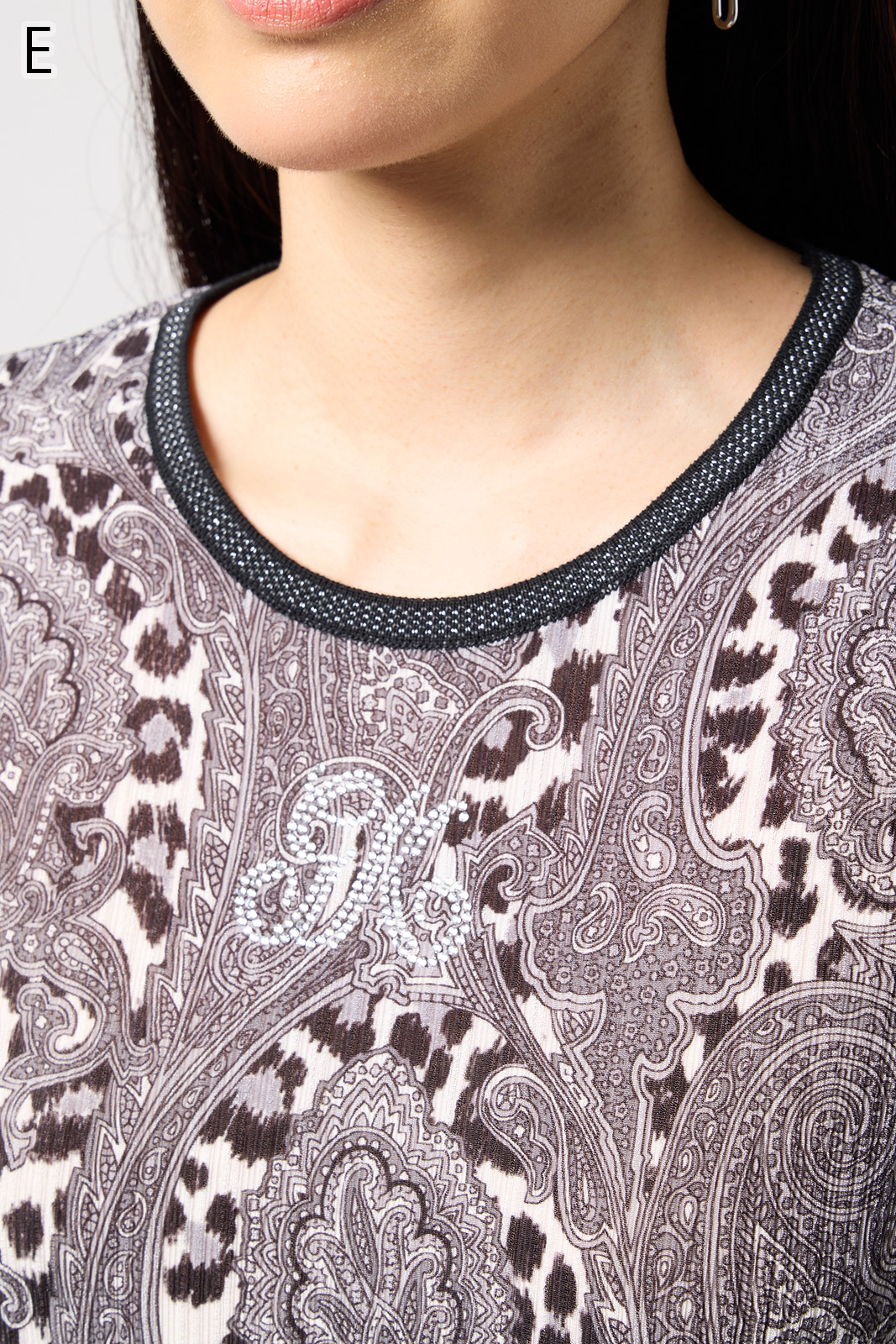 ペイズリーとヒョウ柄を組み合わせた、目を引くオリジナルプリントが魅力。やわらかく伸びる素材で、動きやすく快適な着心地。首元すっきりのノーカラーデザインで、重ね着もしやすいインナー向きのTシャツです。