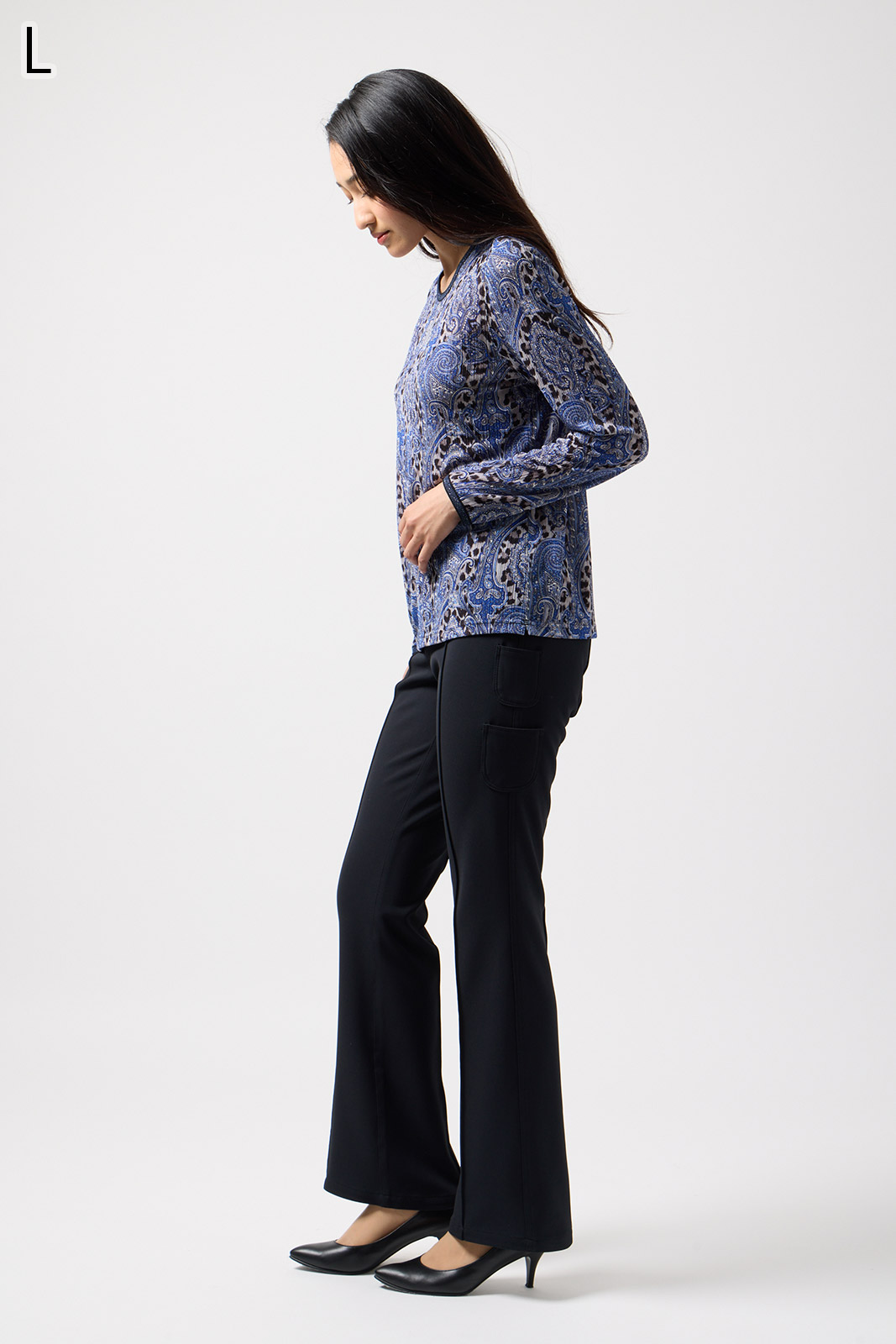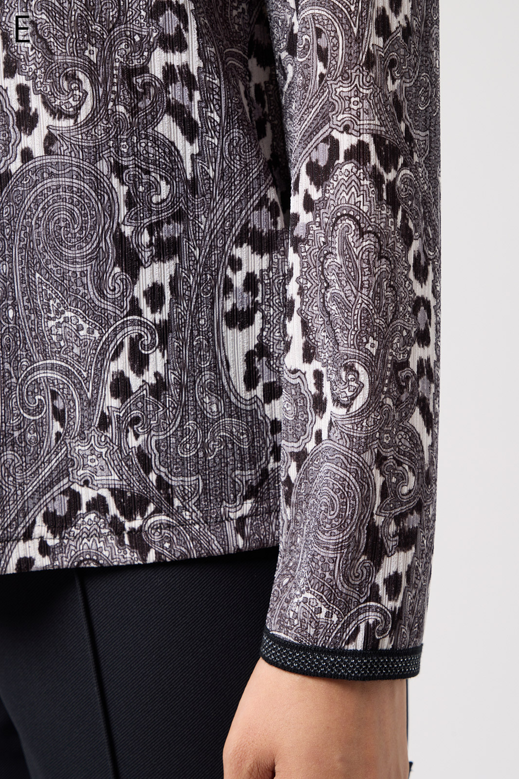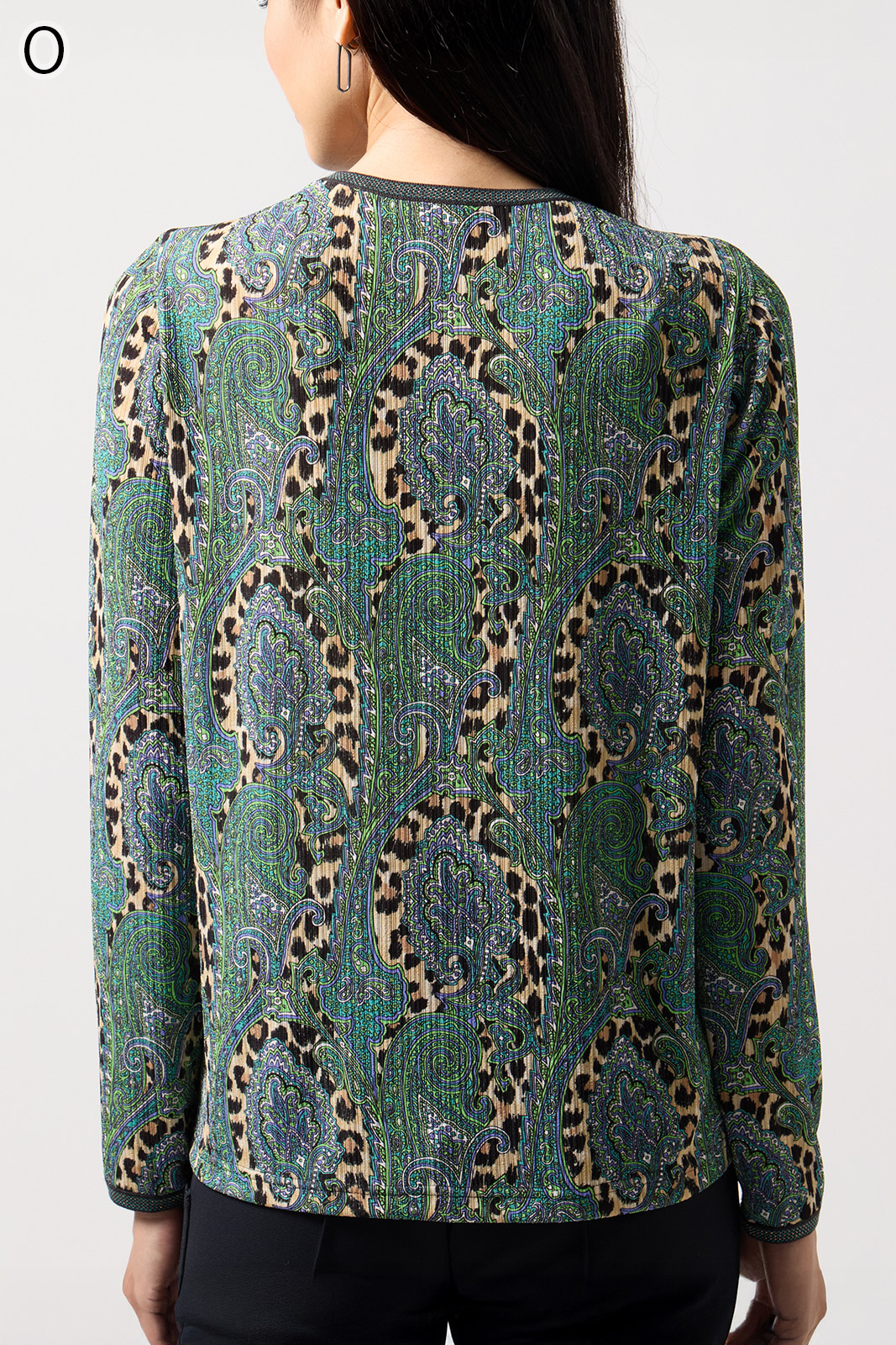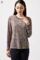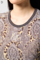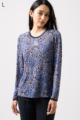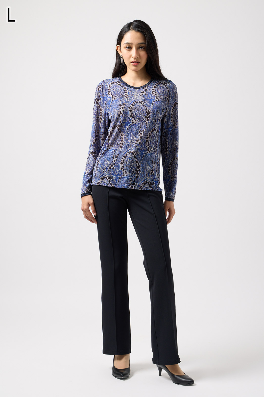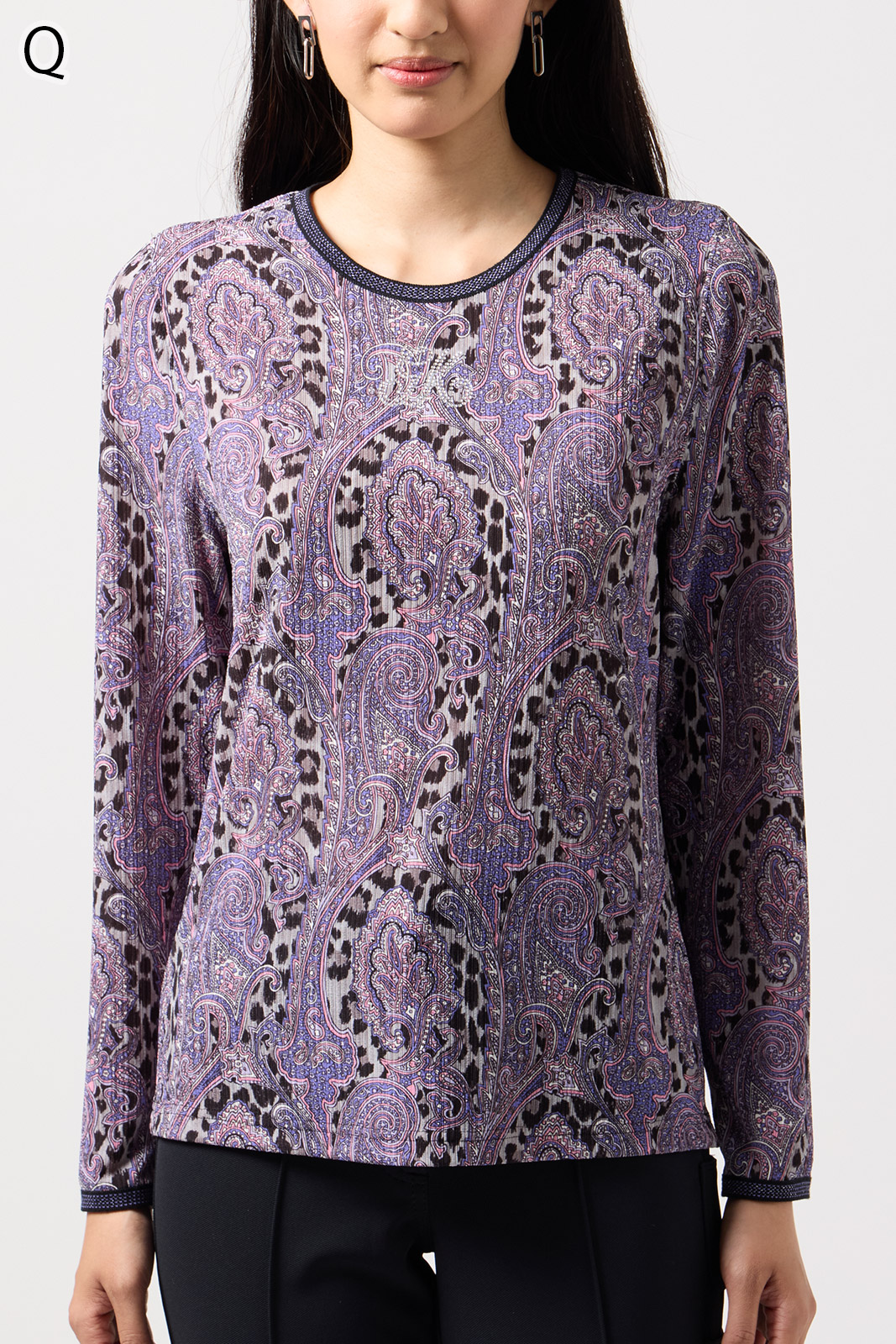 ペイズリーとヒョウ柄を組み合わせた、目を引くオリジナルプリントが魅力。やわらかく伸びる素材で、動きやすく快適な着心地。首元すっきりのノーカラーデザインで、重ね着もしやすいインナー向きのTシャツです。