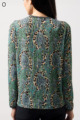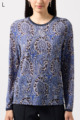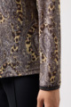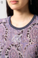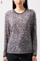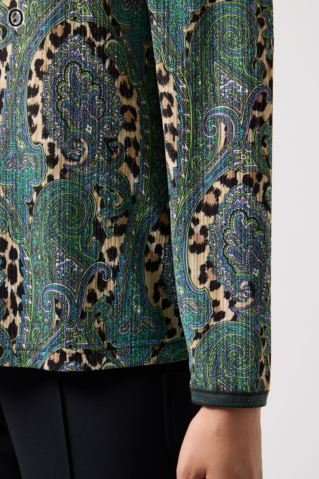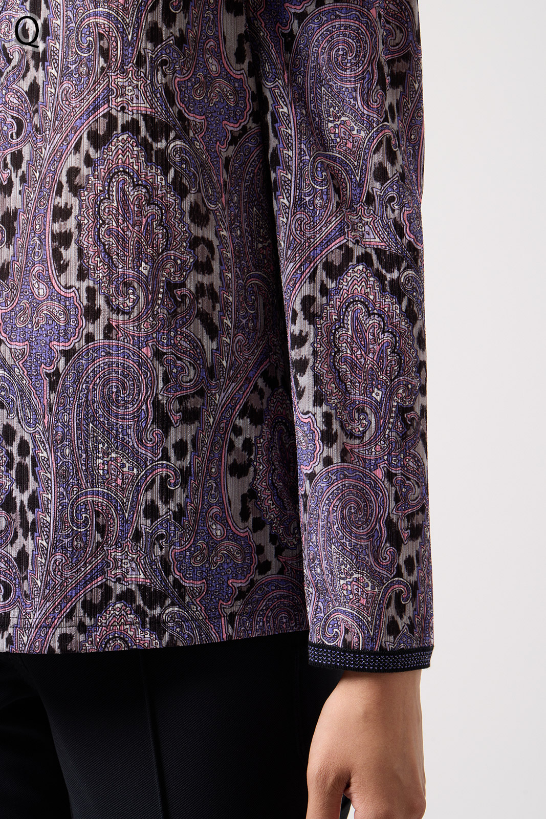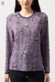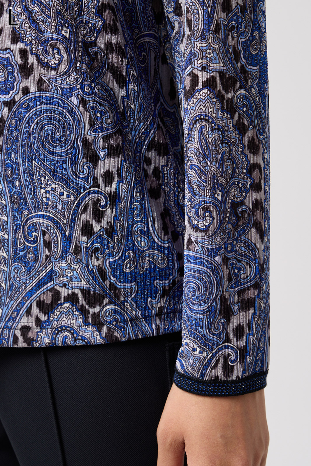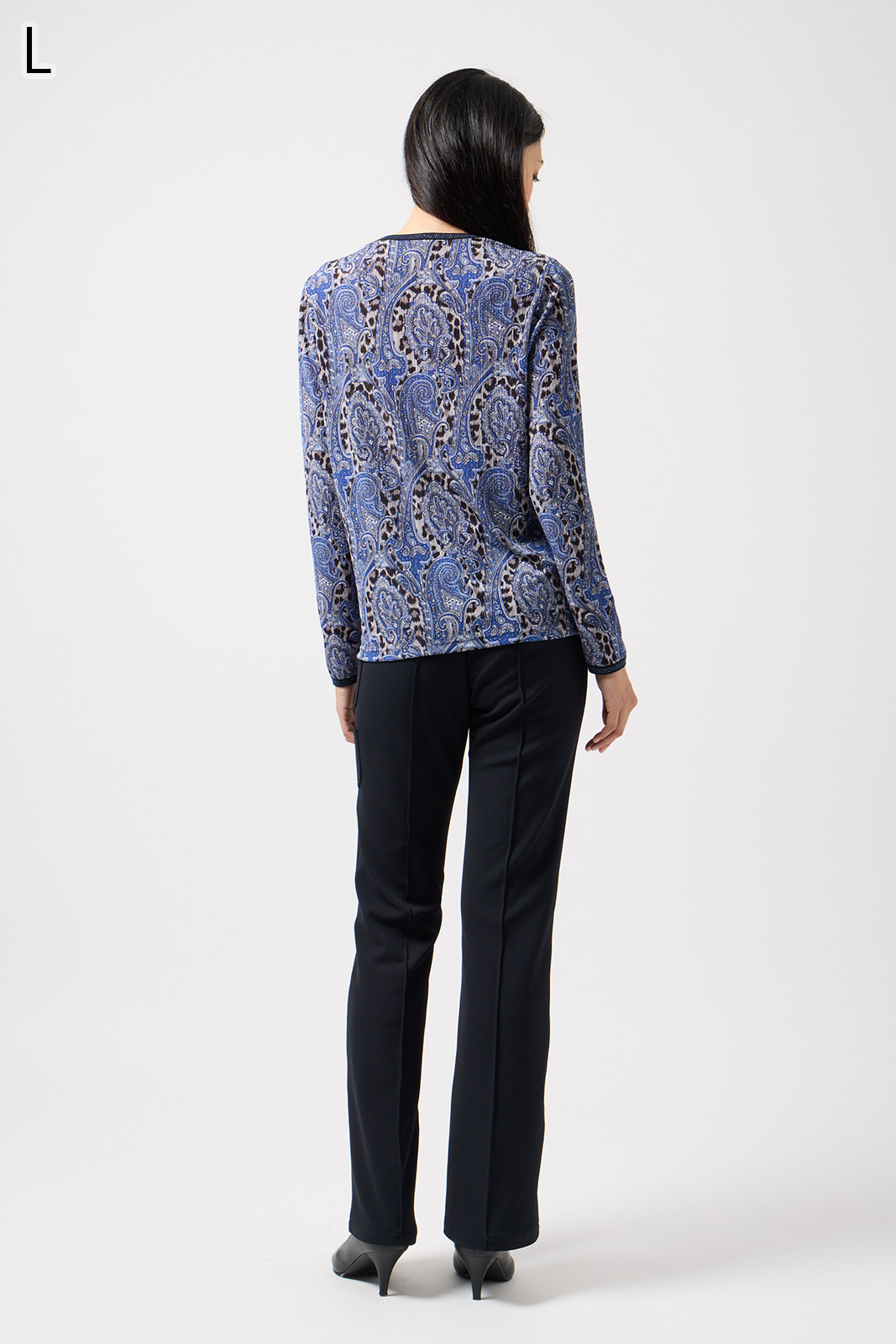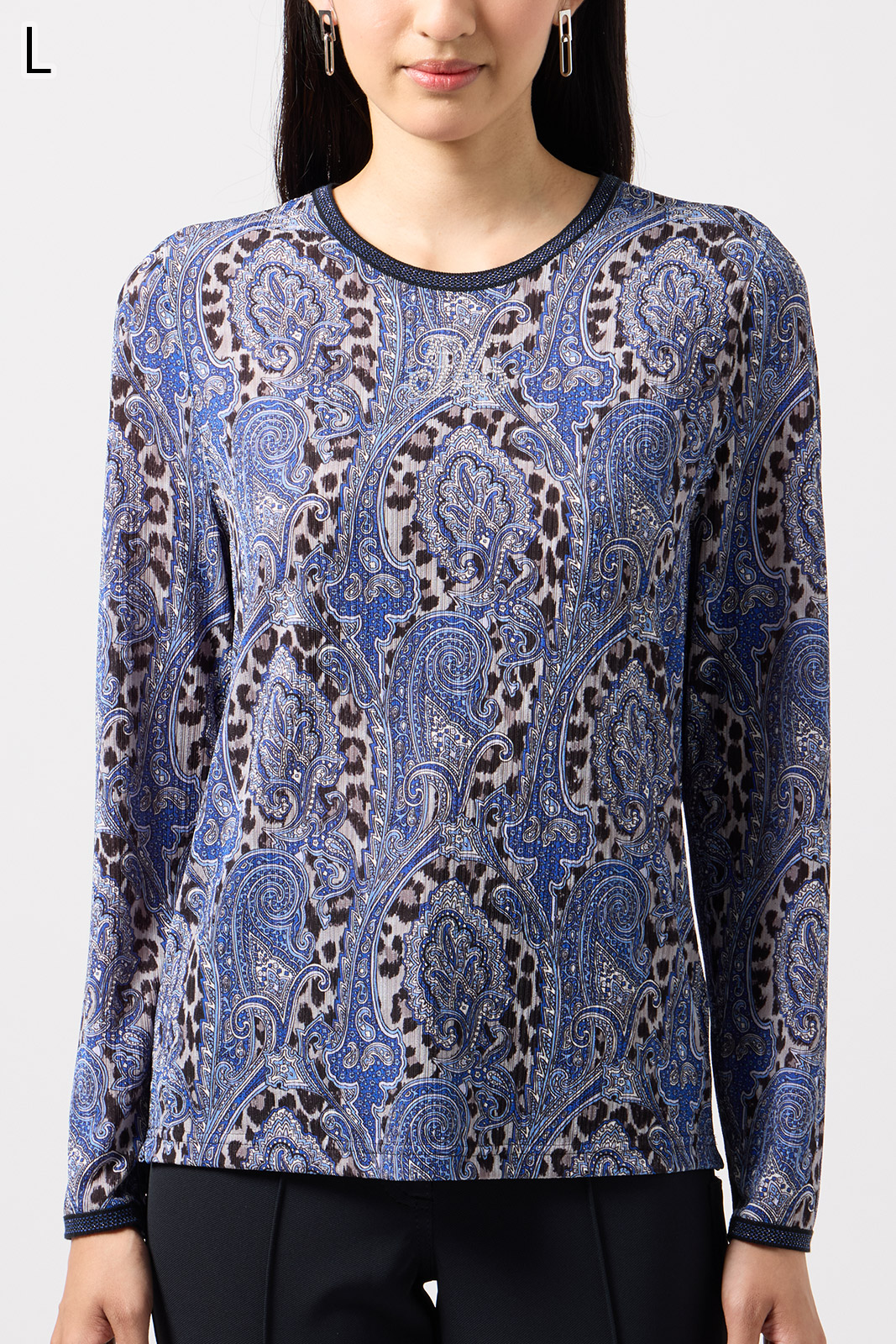 ペイズリーとヒョウ柄を組み合わせた、目を引くオリジナルプリントが魅力。やわらかく伸びる素材で、動きやすく快適な着心地。首元すっきりのノーカラーデザインで、重ね着もしやすいインナー向きのTシャツです。