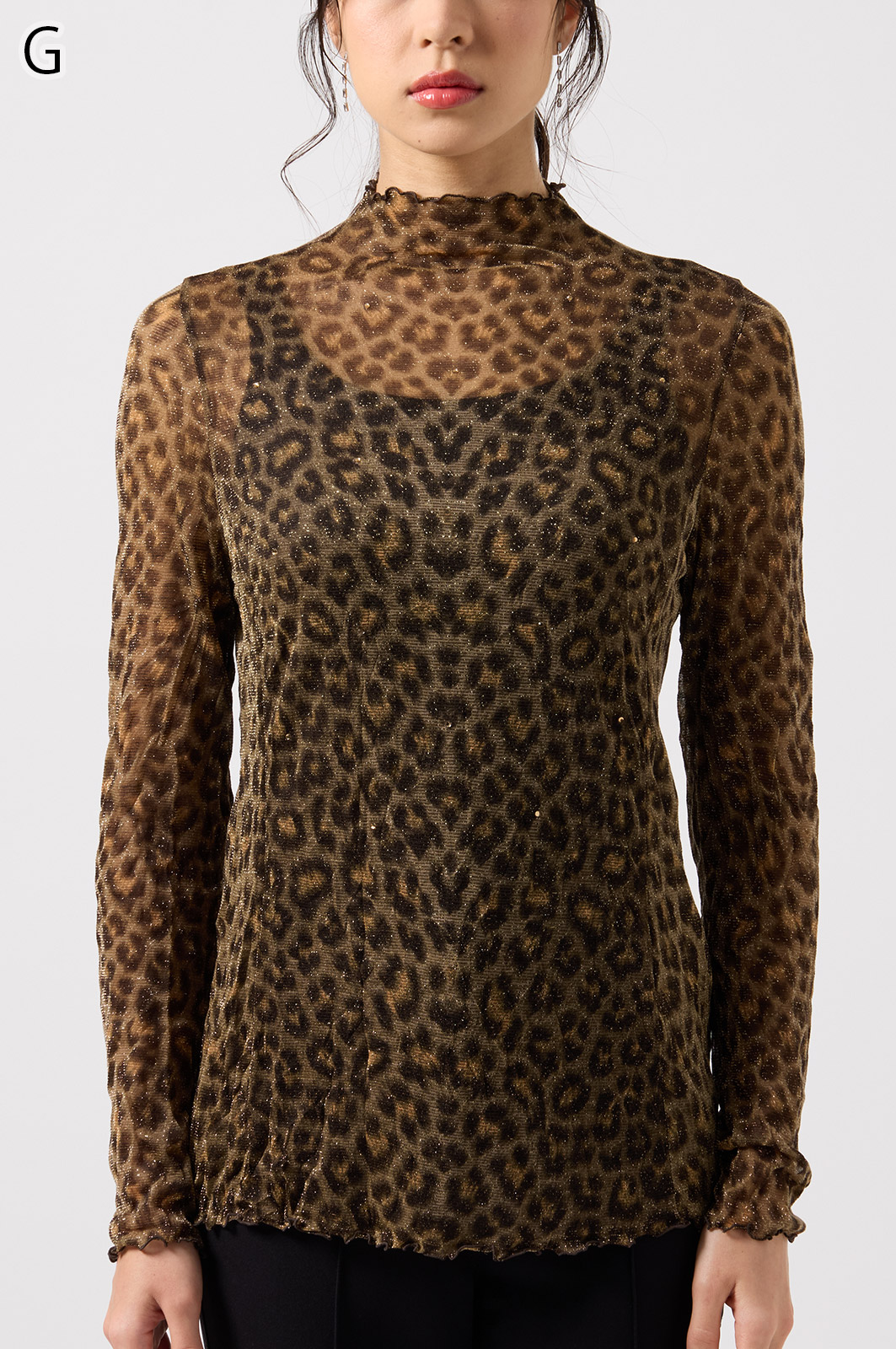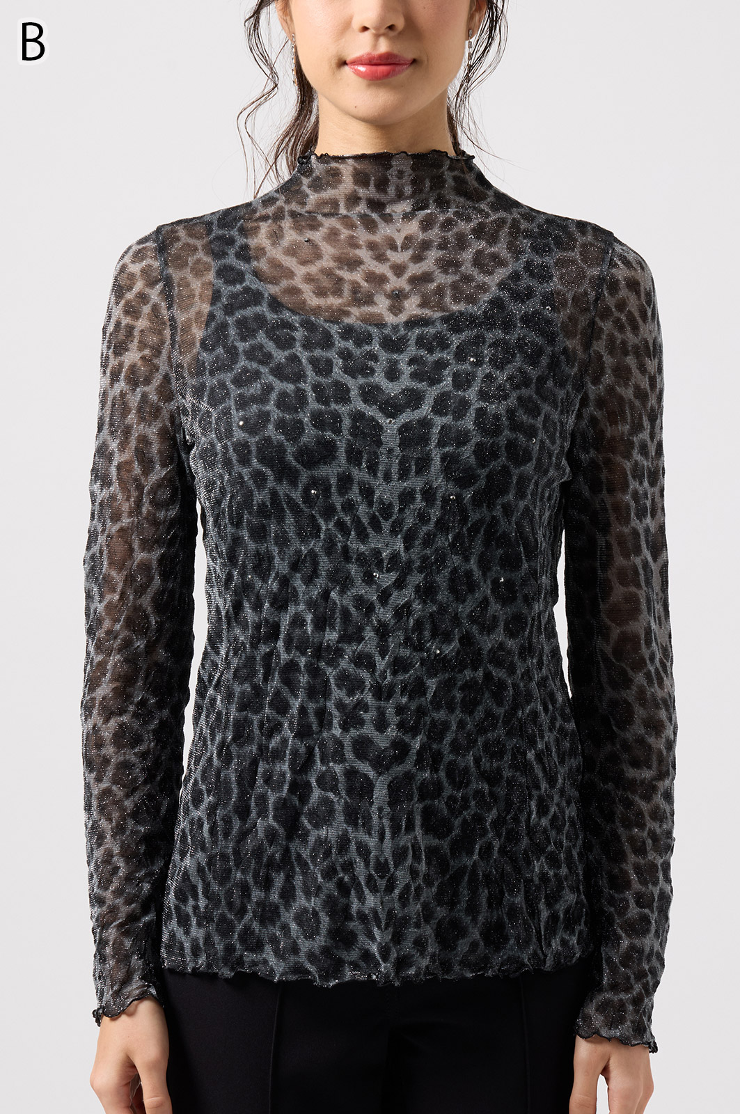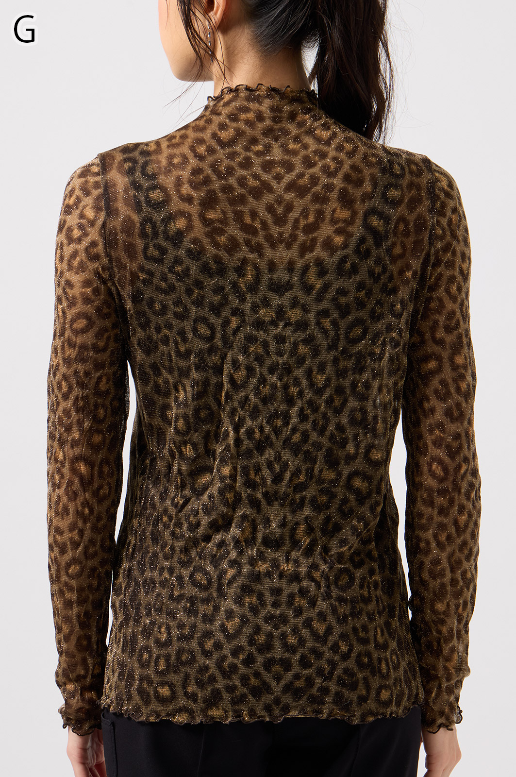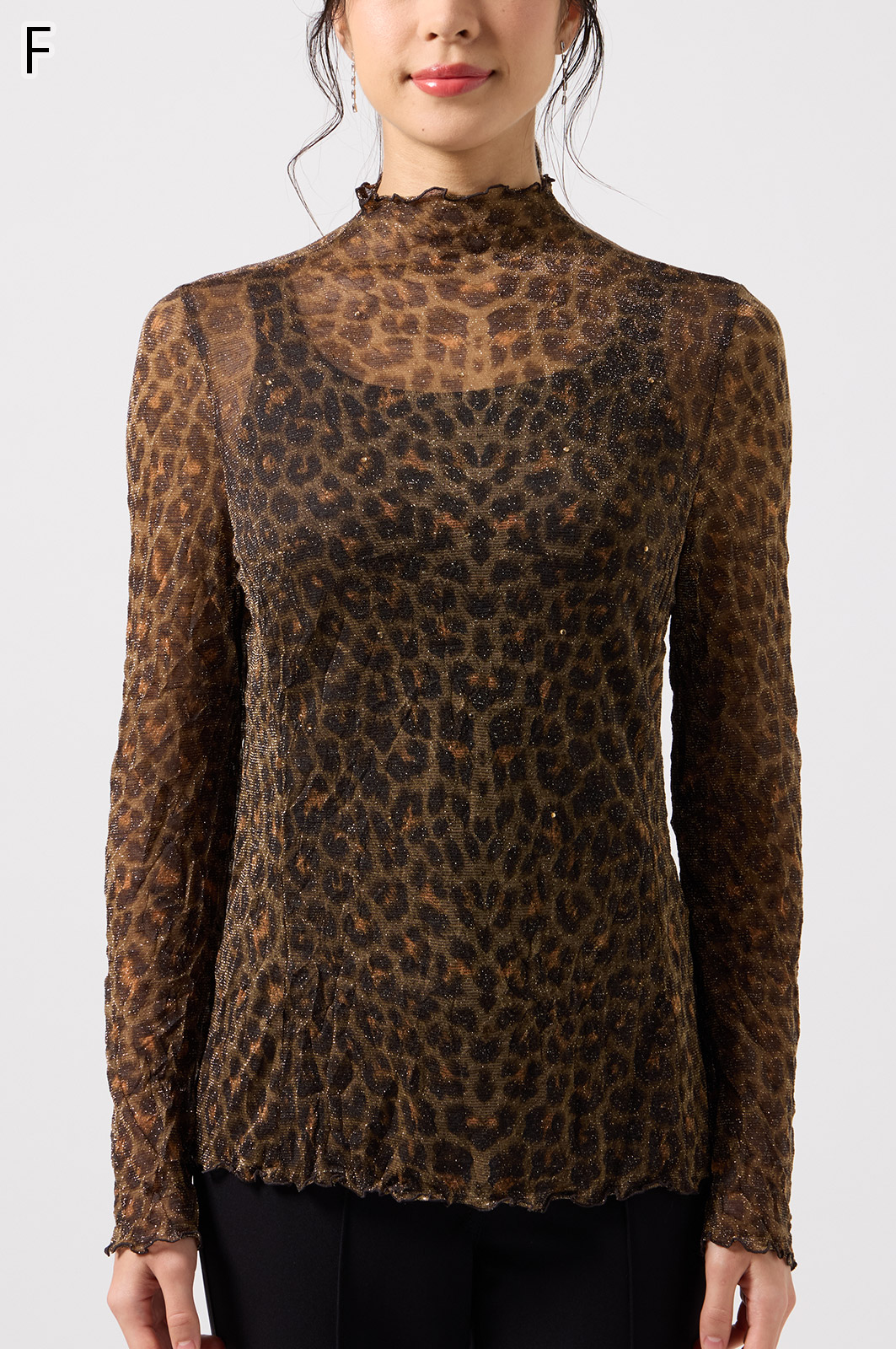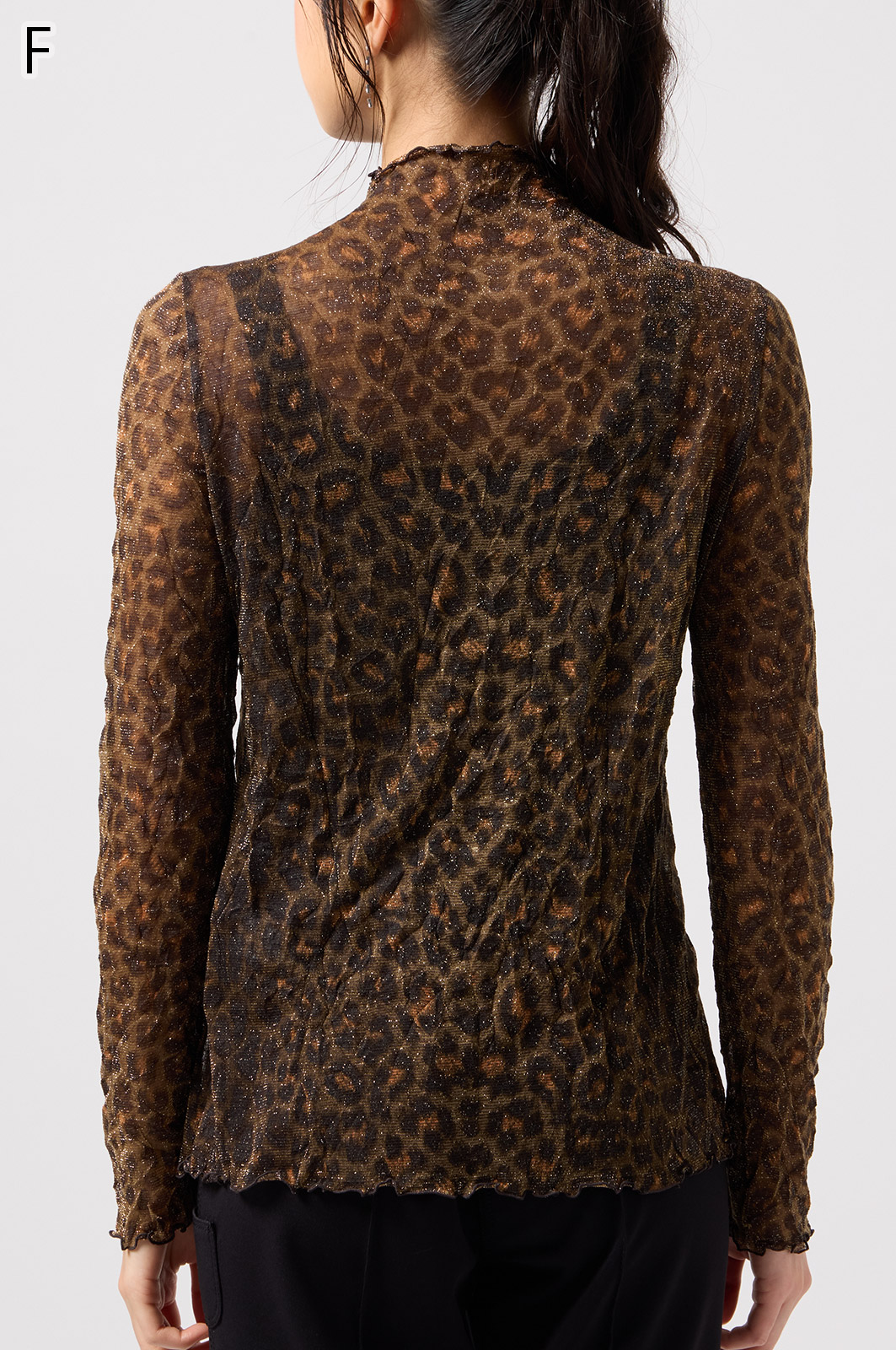 キラッと光るヒョウ柄のメッシュ素材に、細かなシワ加工を加えたインナーTシャツ。軽やかで動きのある表情が魅力。一枚で着ても、重ねても華やかさを演出できます♪