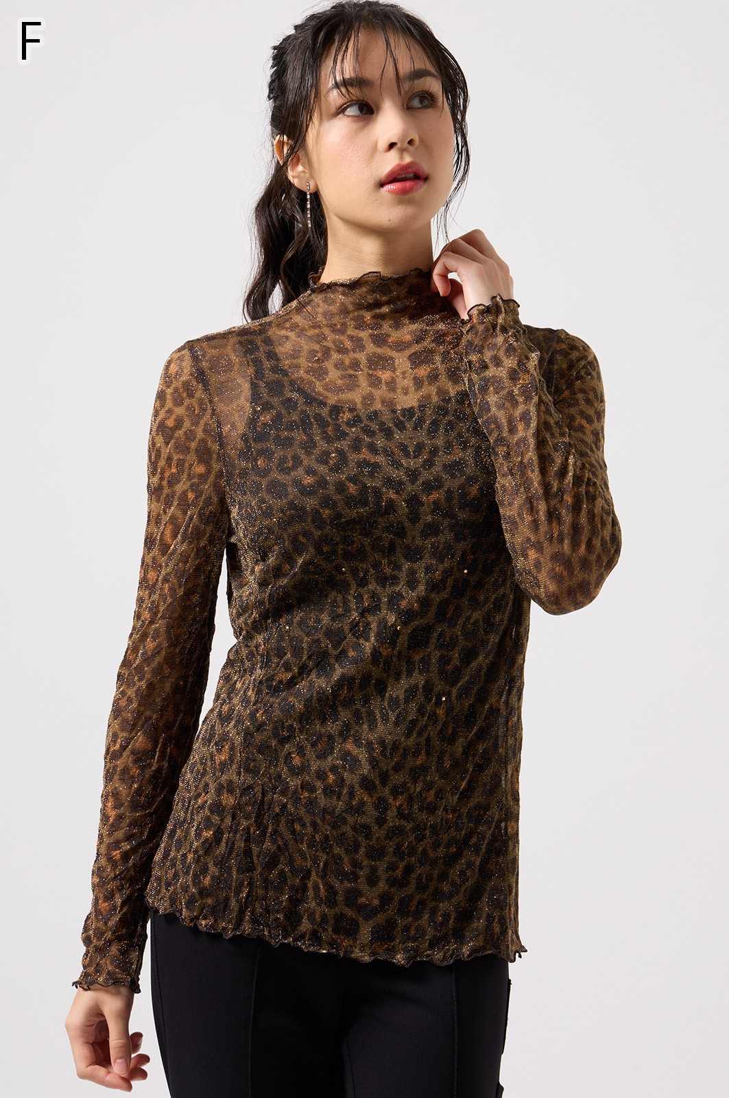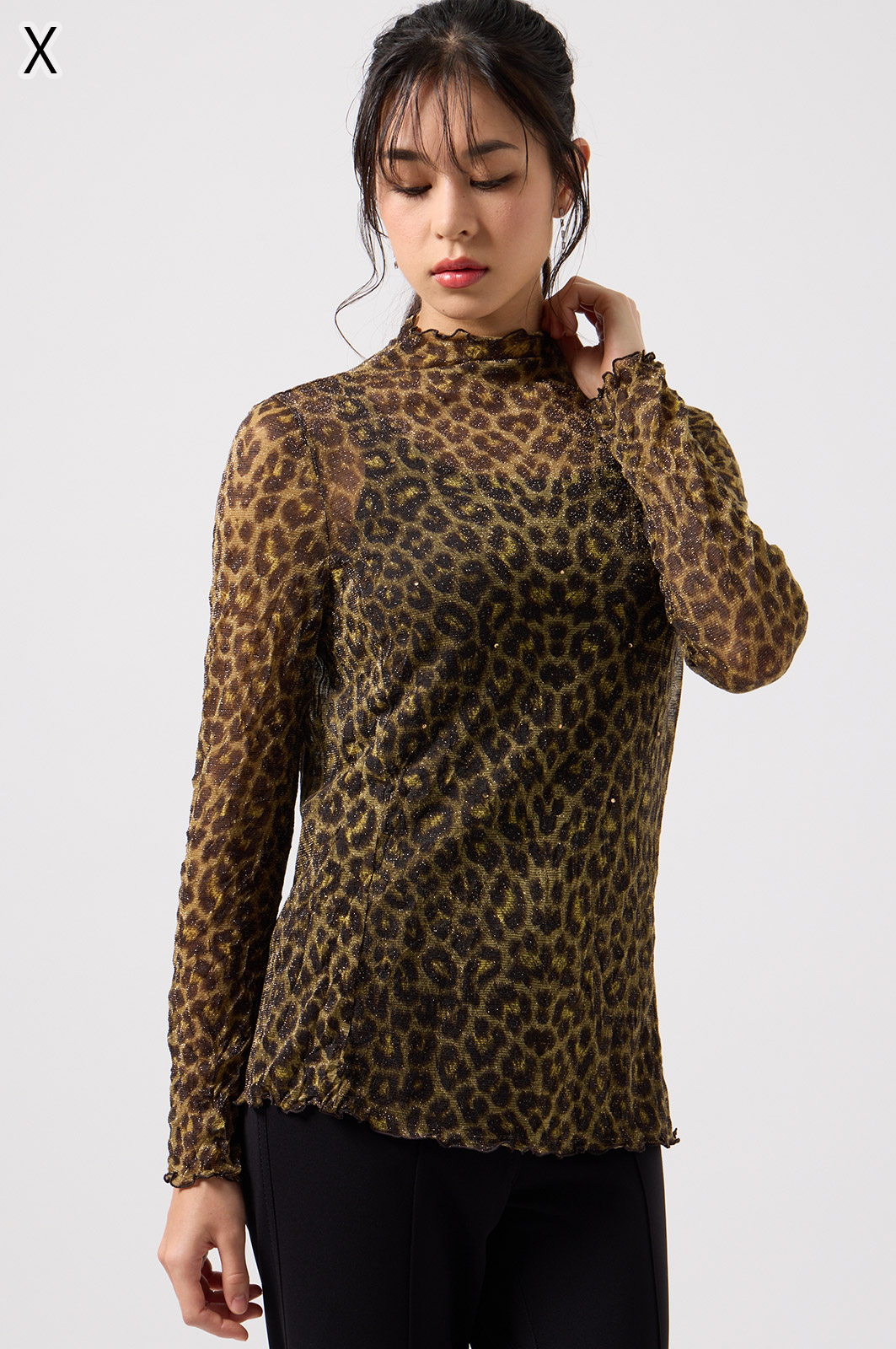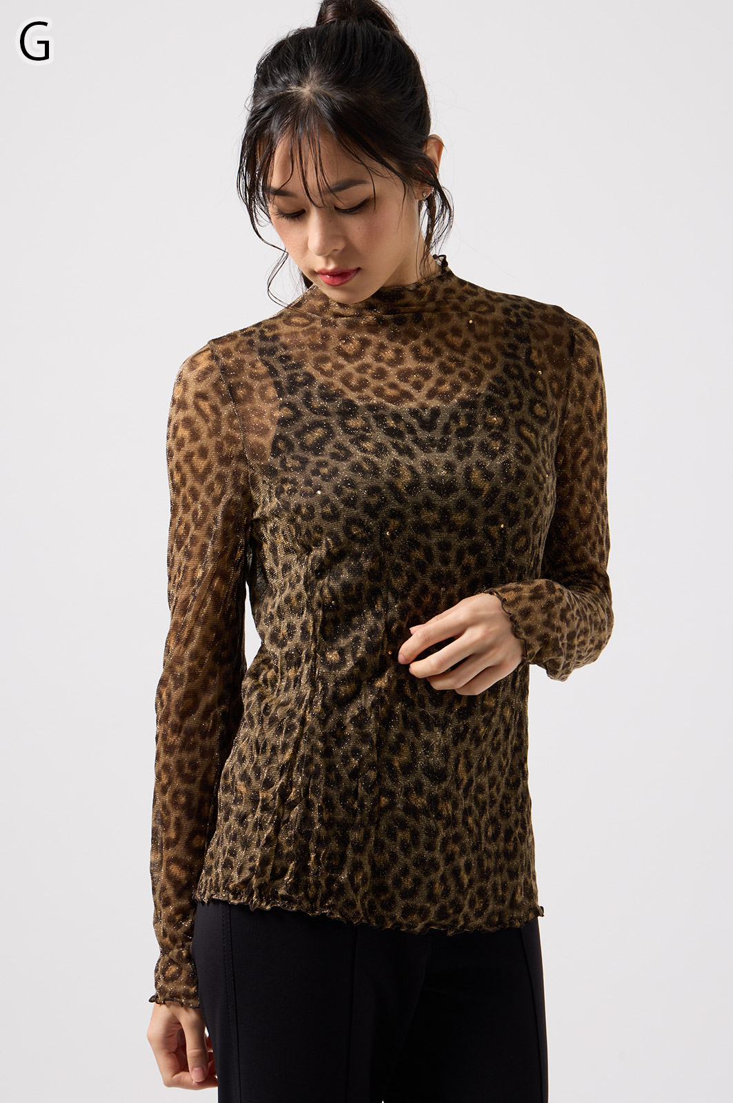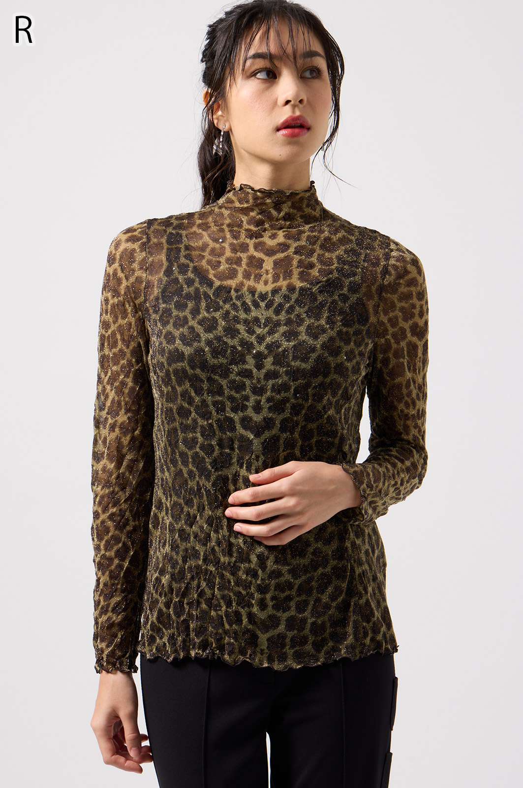 キラッと光るヒョウ柄のメッシュ素材に、細かなシワ加工を加えたインナーTシャツ。軽やかで動きのある表情が魅力。一枚で着ても、重ねても華やかさを演出できます♪