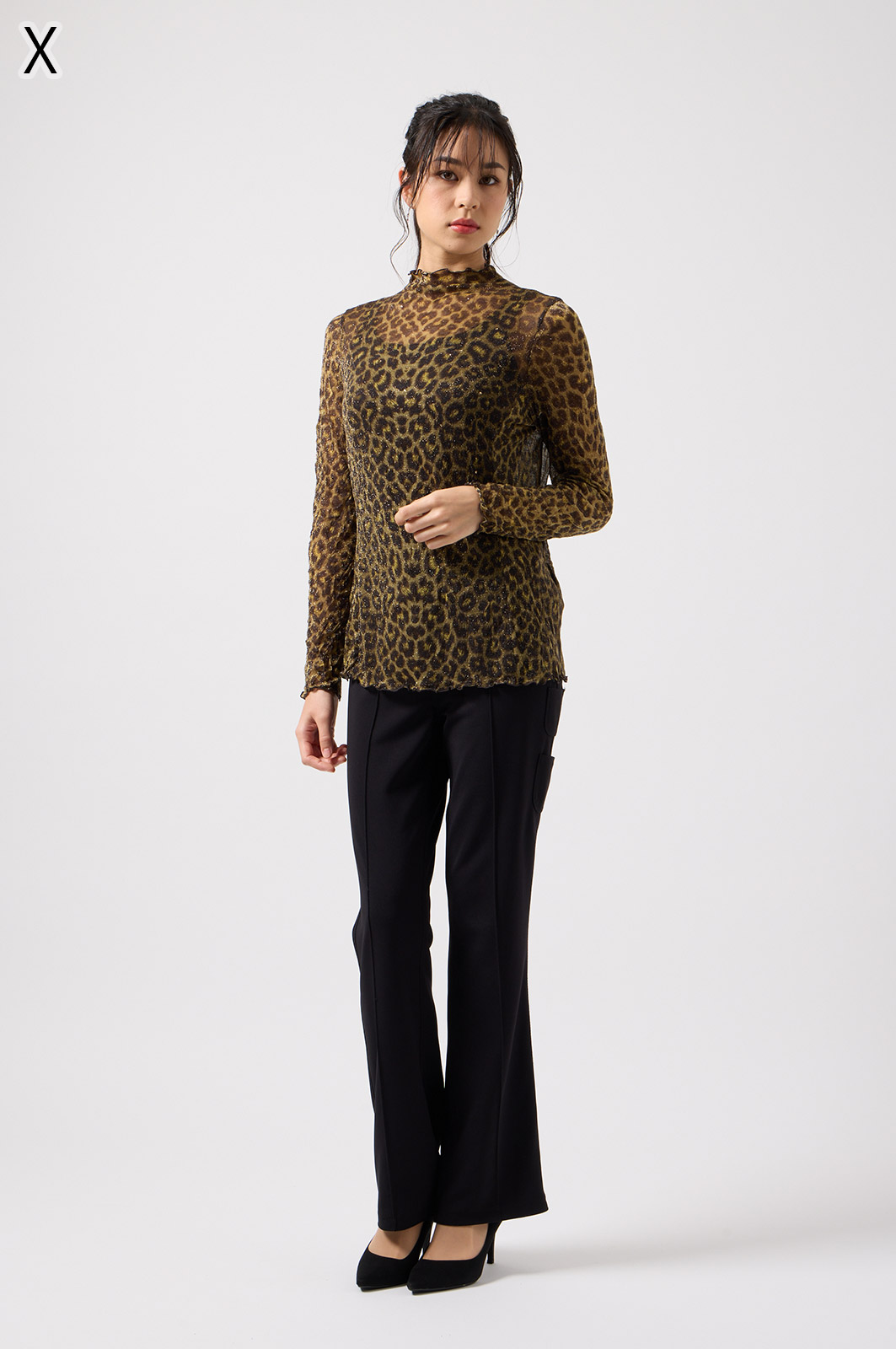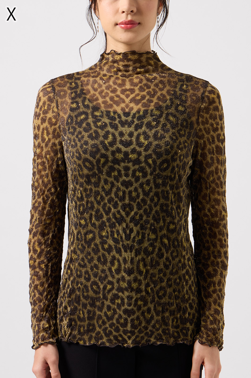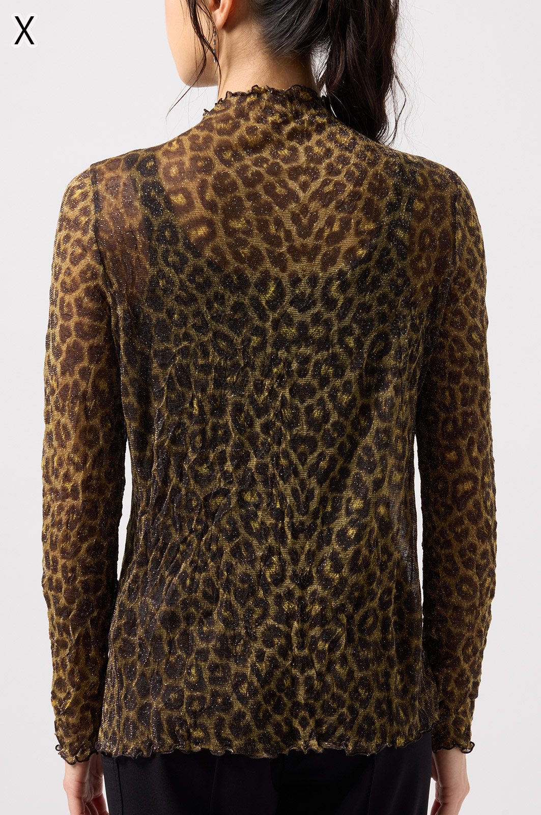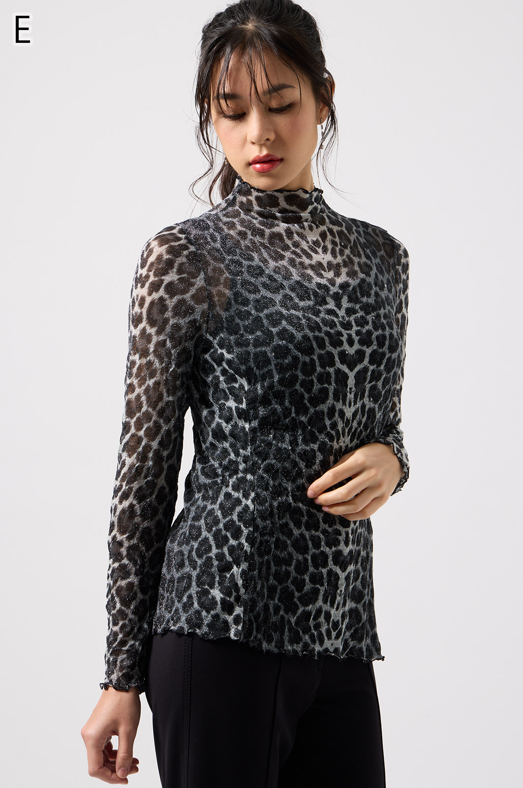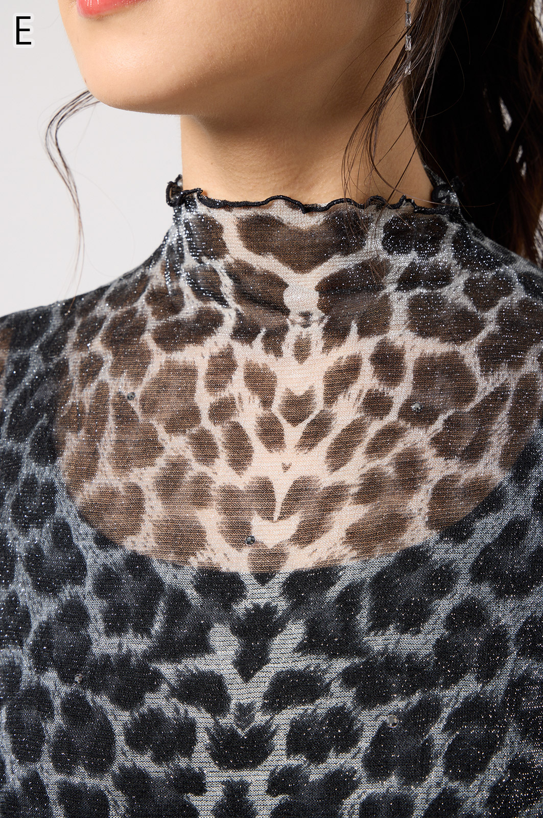 キラッと光るヒョウ柄のメッシュ素材に、細かなシワ加工を加えたインナーTシャツ。軽やかで動きのある表情が魅力。一枚で着ても、重ねても華やかさを演出できます♪