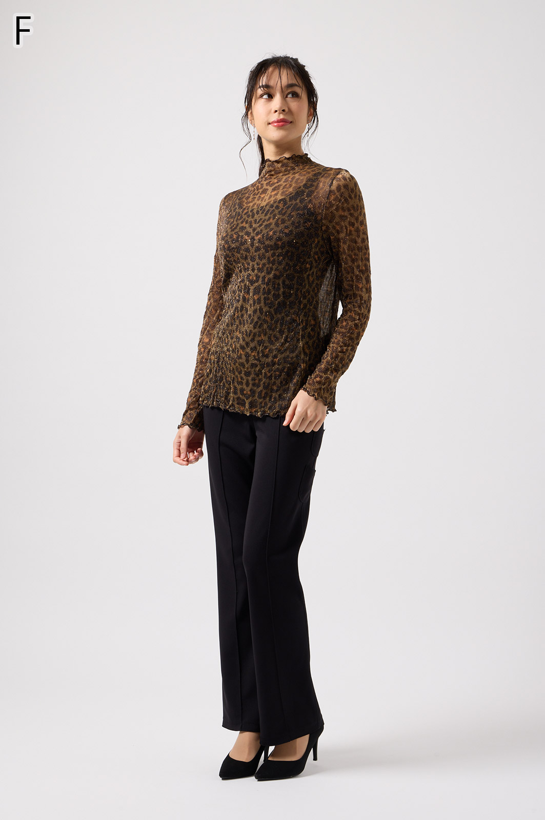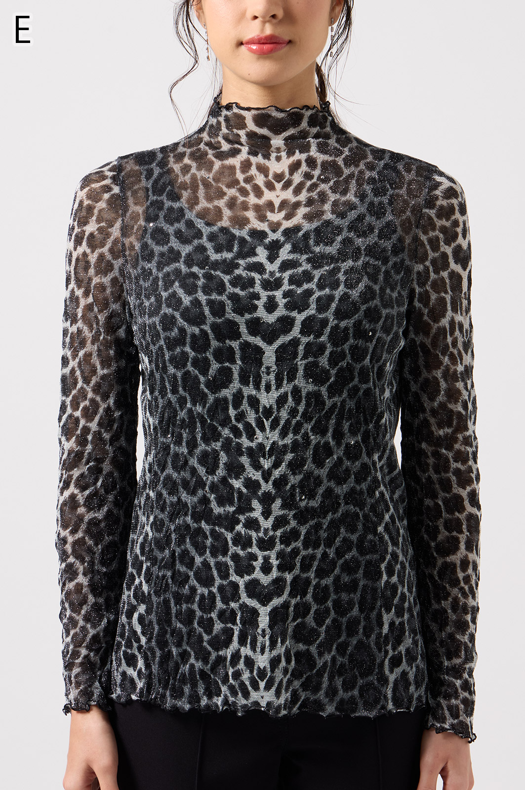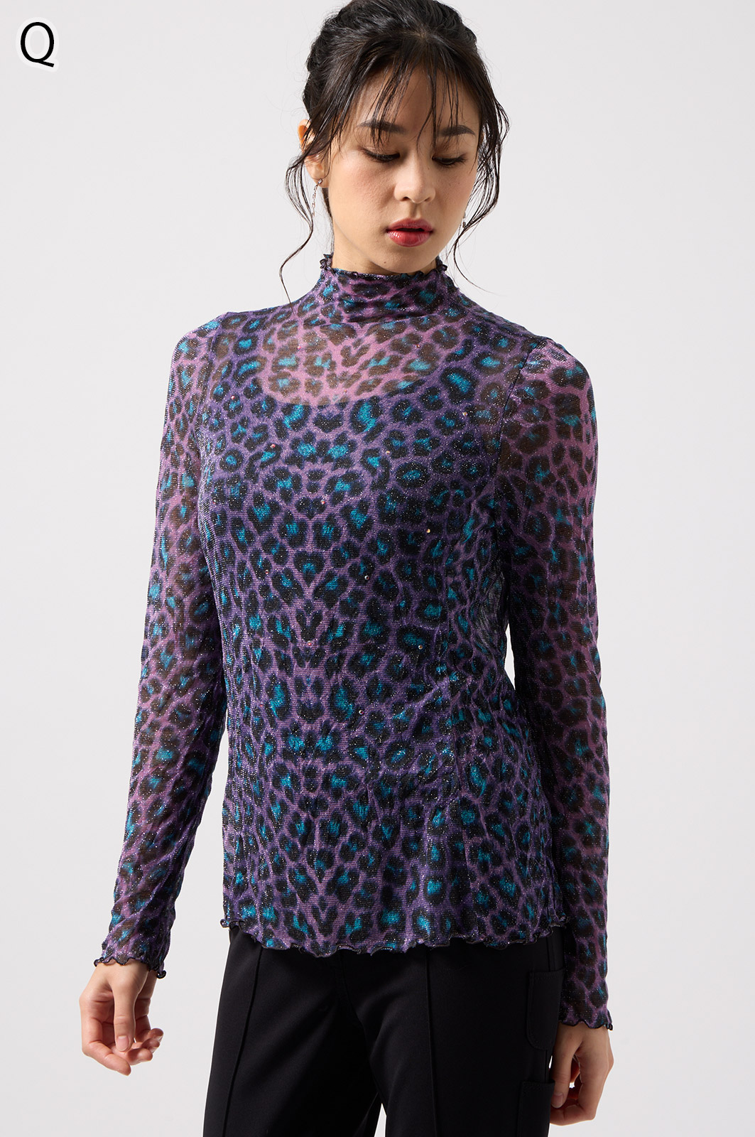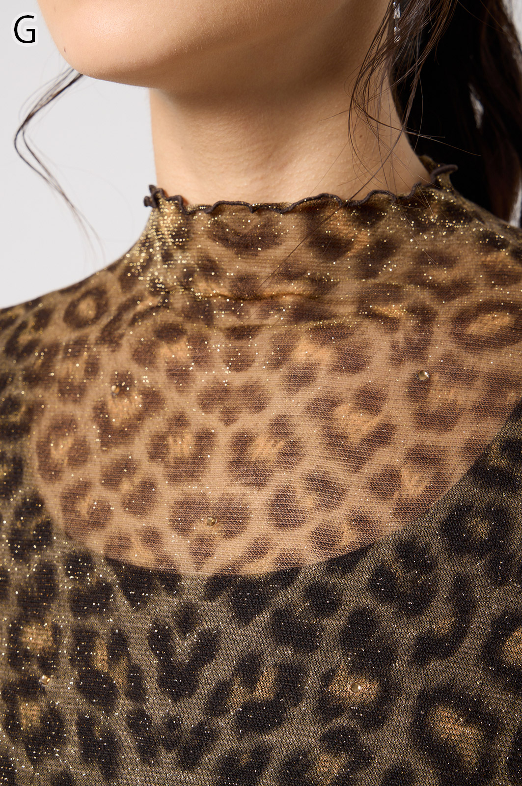 キラッと光るヒョウ柄のメッシュ素材に、細かなシワ加工を加えたインナーTシャツ。軽やかで動きのある表情が魅力。一枚で着ても、重ねても華やかさを演出できます♪