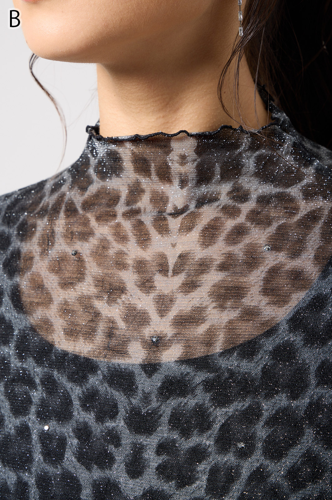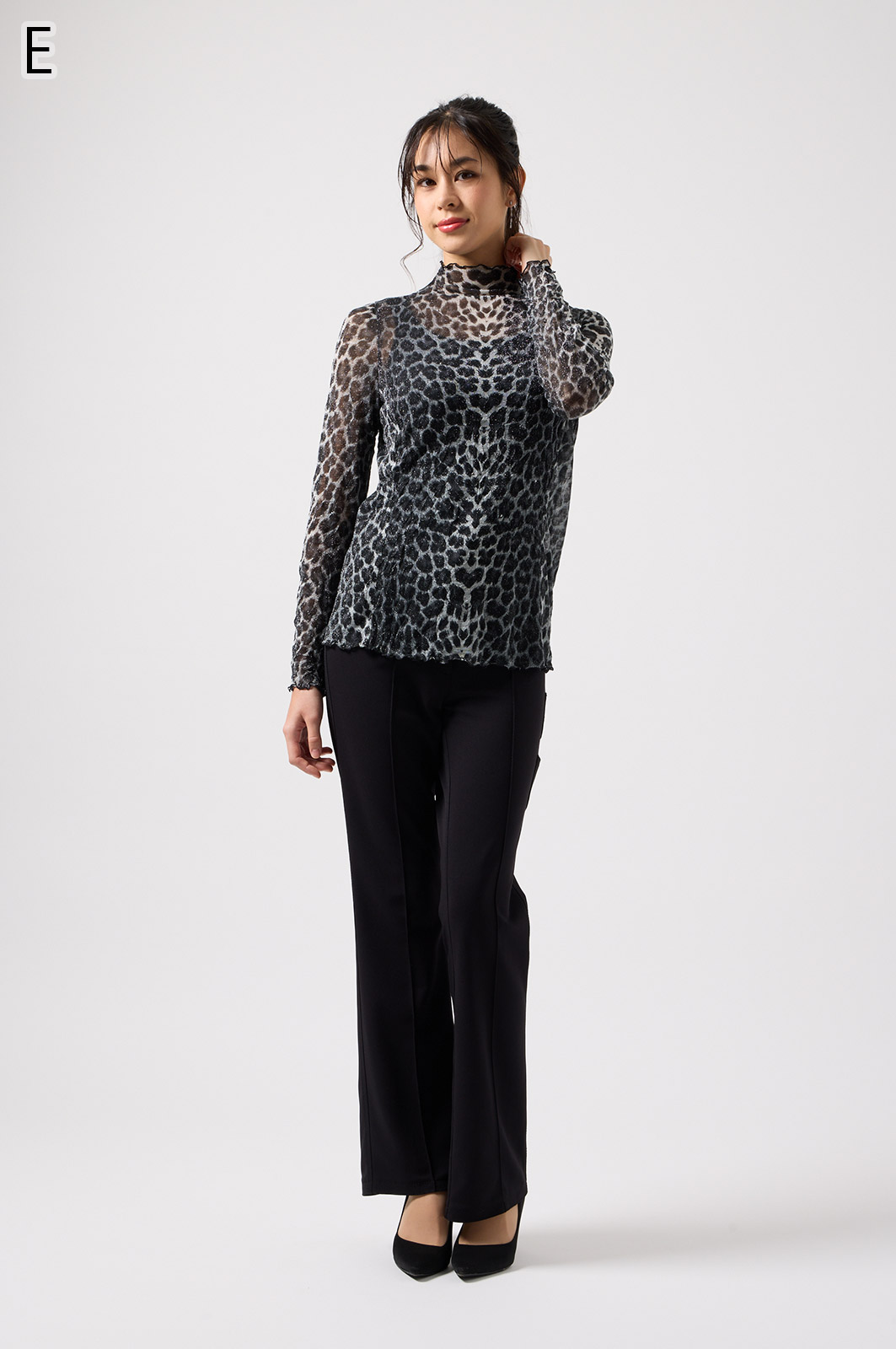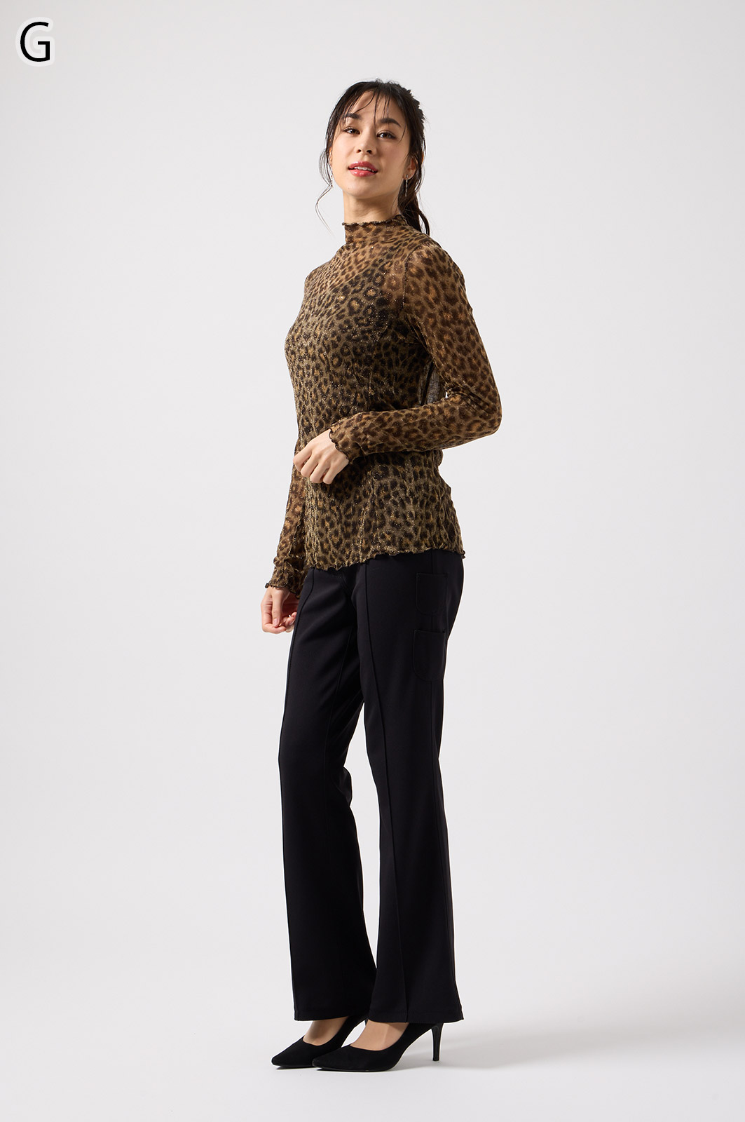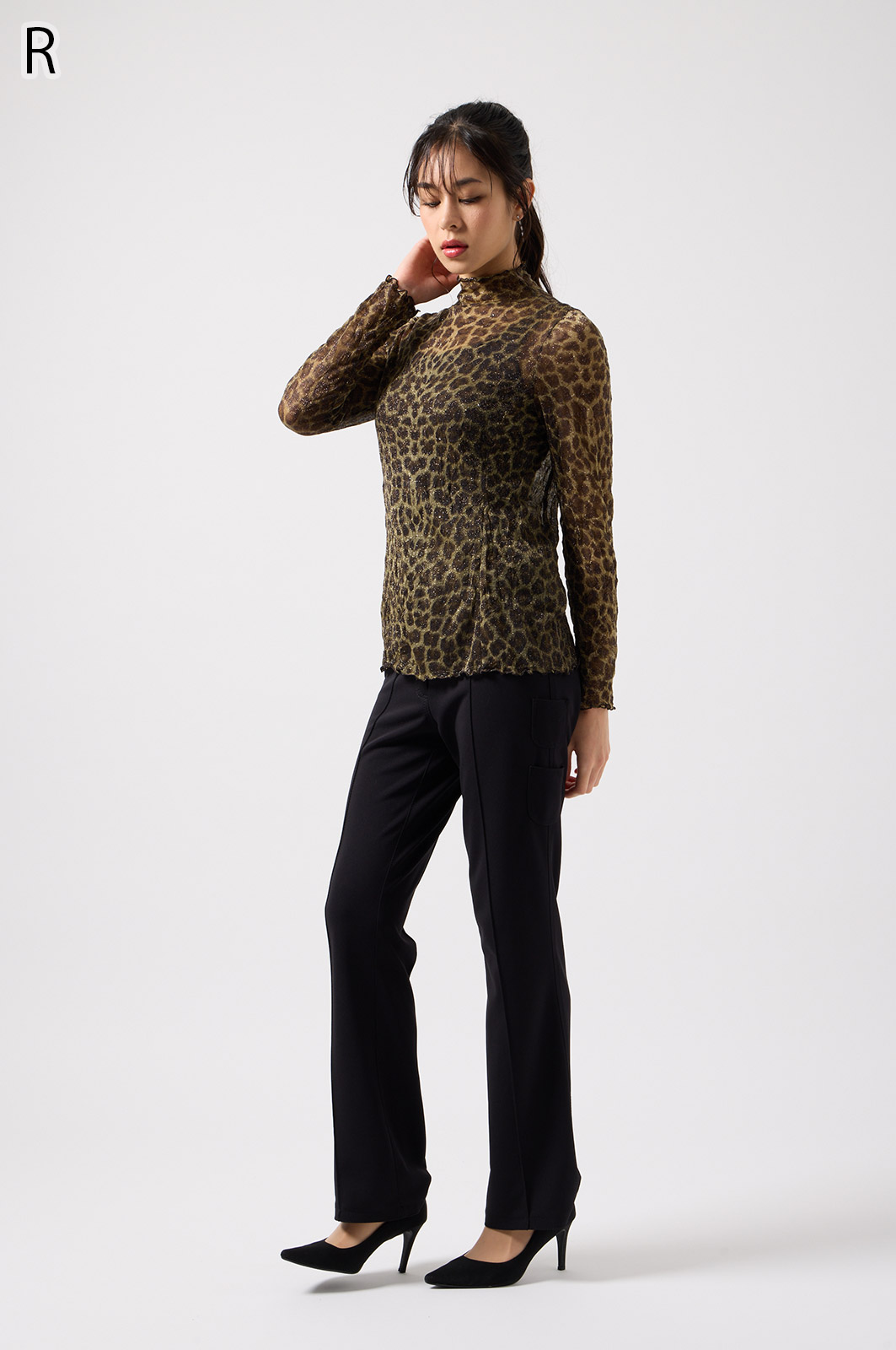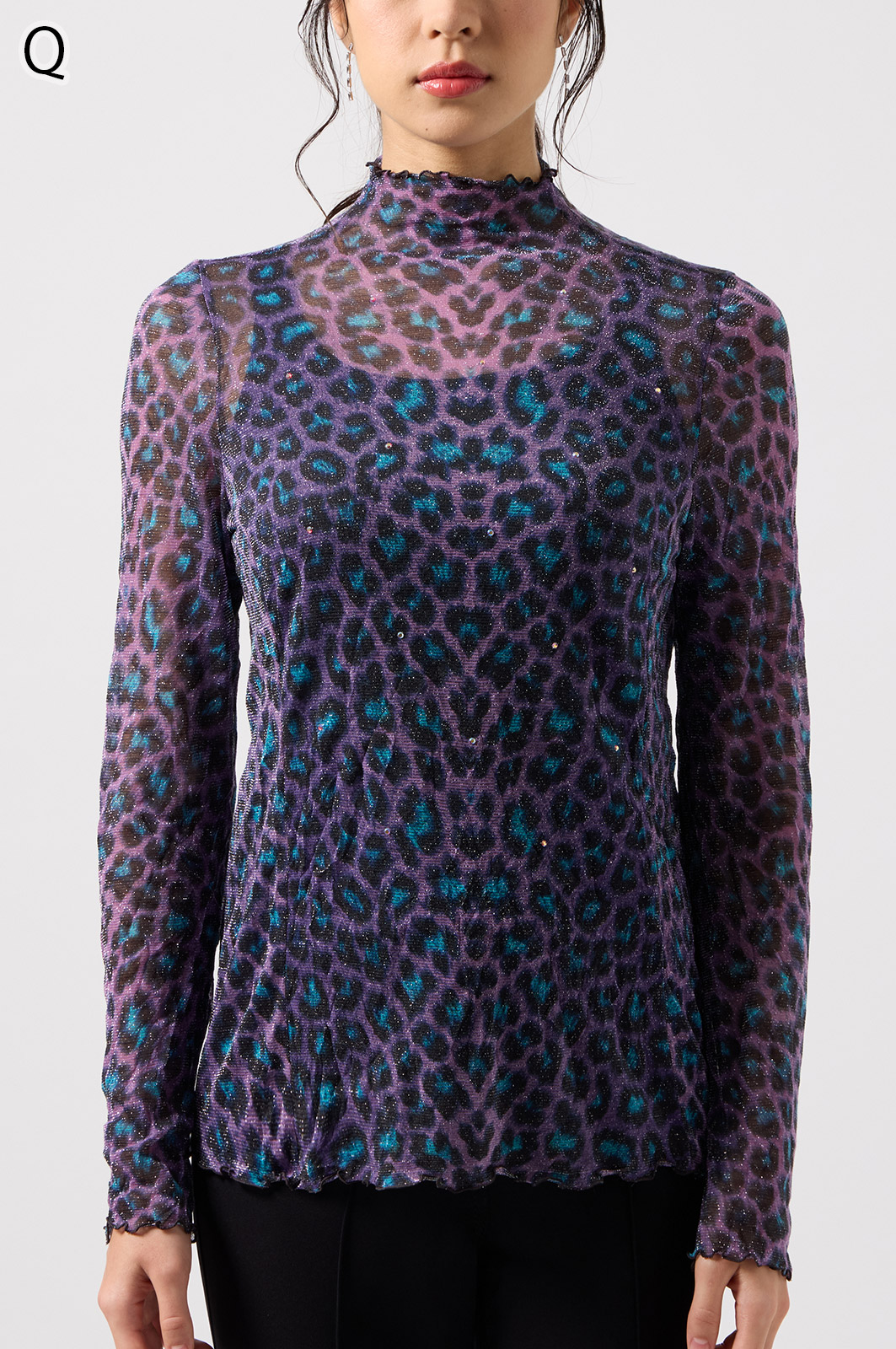 キラッと光るヒョウ柄のメッシュ素材に、細かなシワ加工を加えたインナーTシャツ。軽やかで動きのある表情が魅力。一枚で着ても、重ねても華やかさを演出できます♪