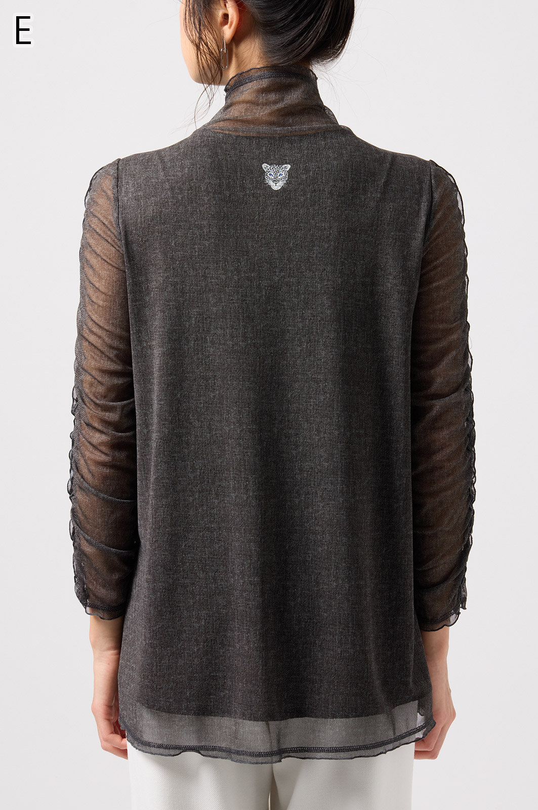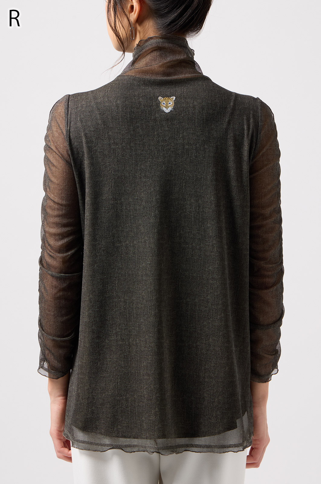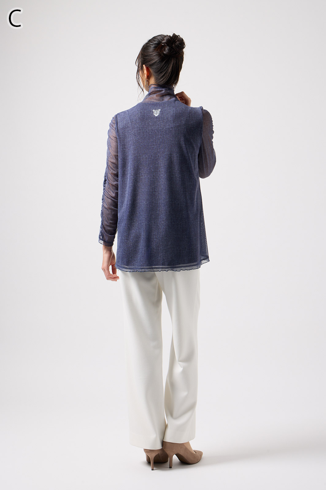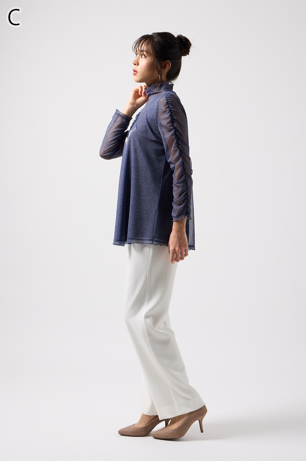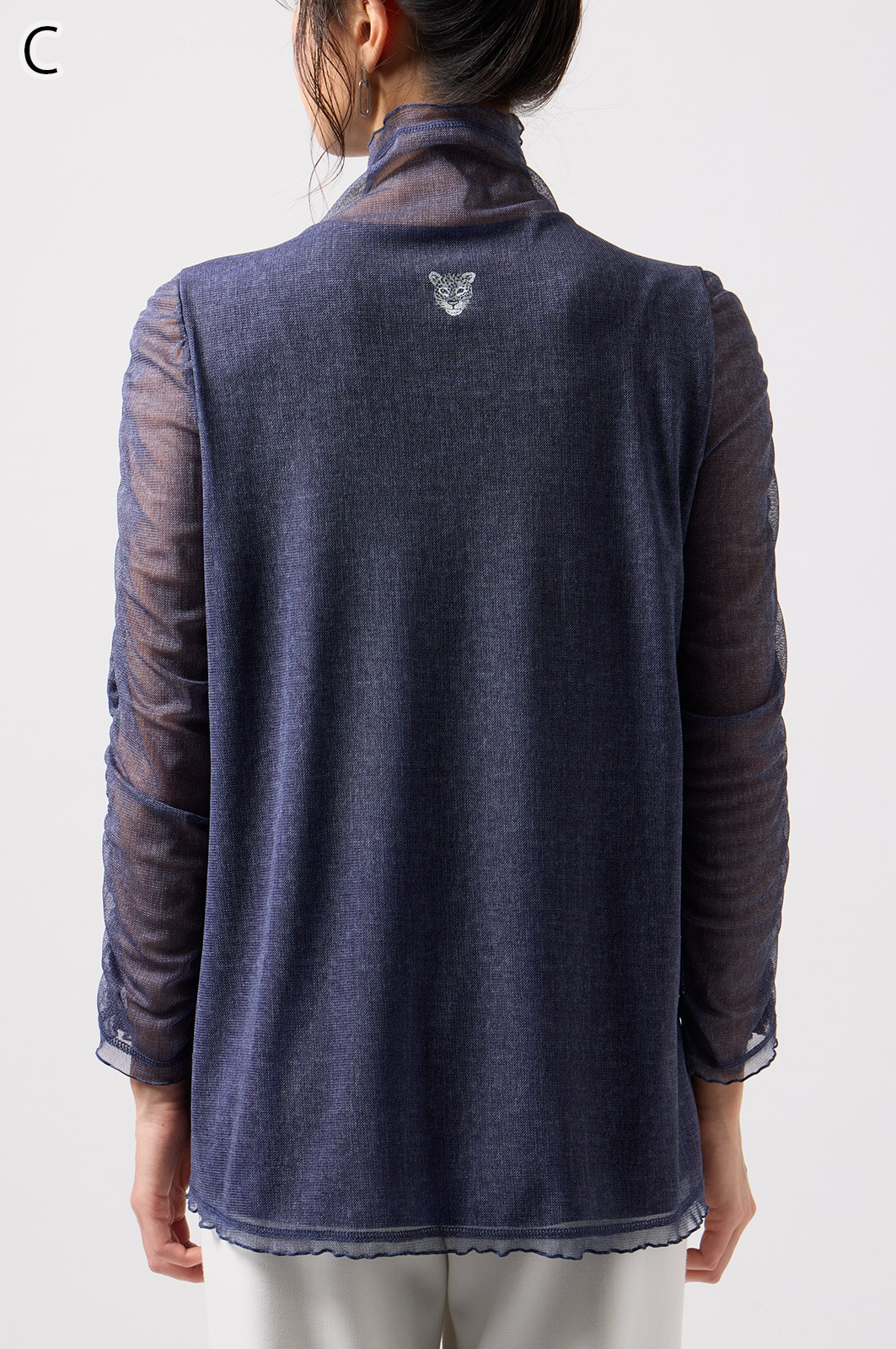 ほんのり透け感のあるメッシュ生地に、前身ごろだけニットを重ねた2枚仕立てのTシャツ。体のラインを拾いにくいAラインで、晩夏から初秋にかけてサラッと着られる便利な一枚です。