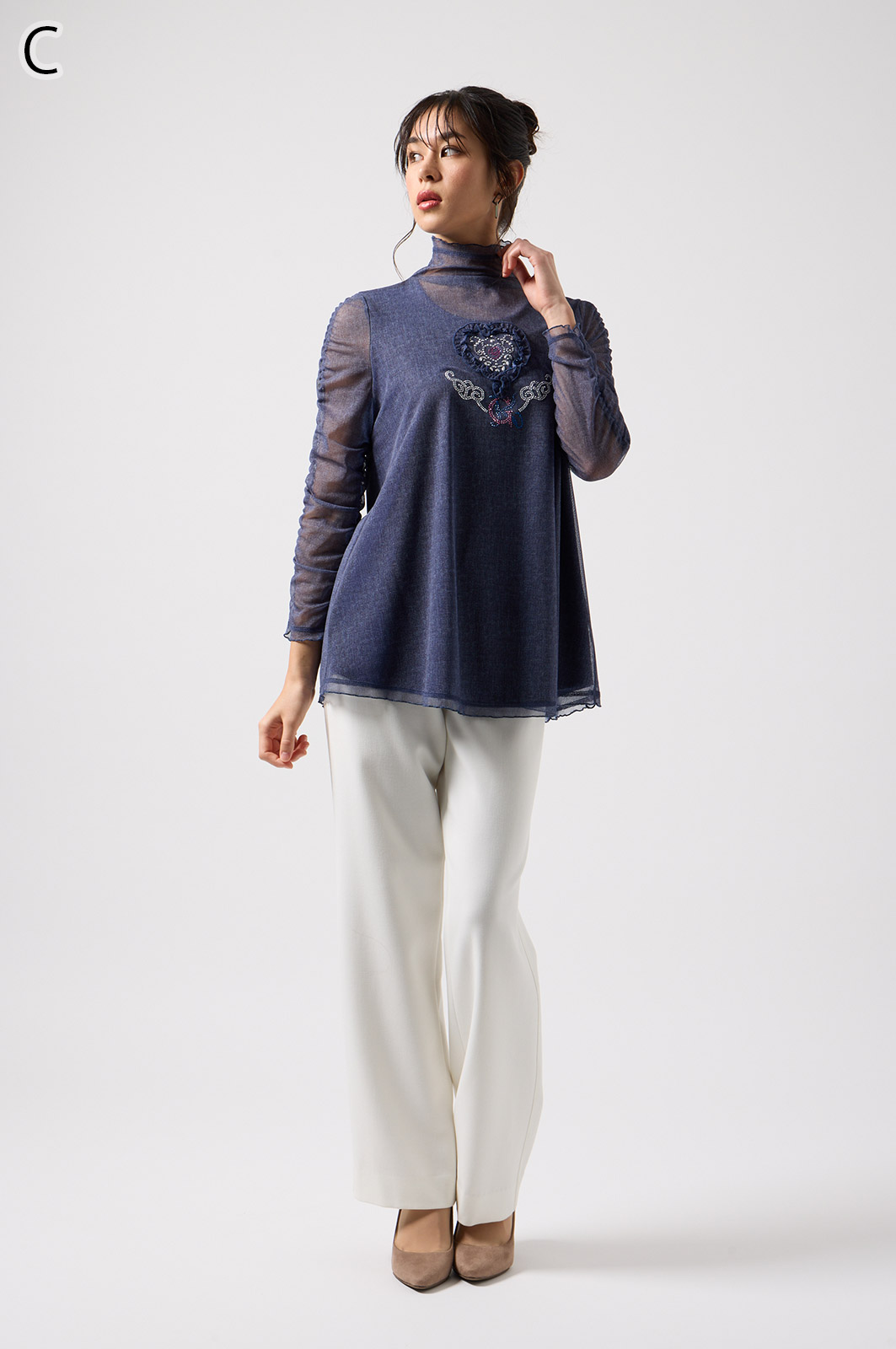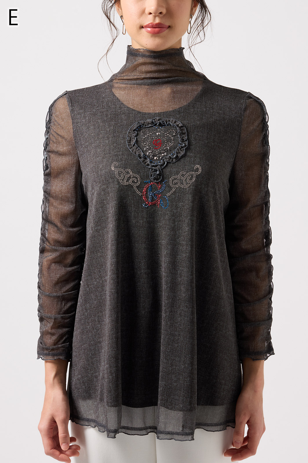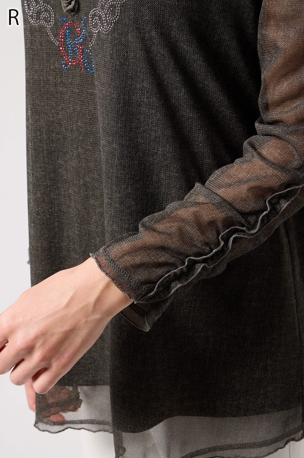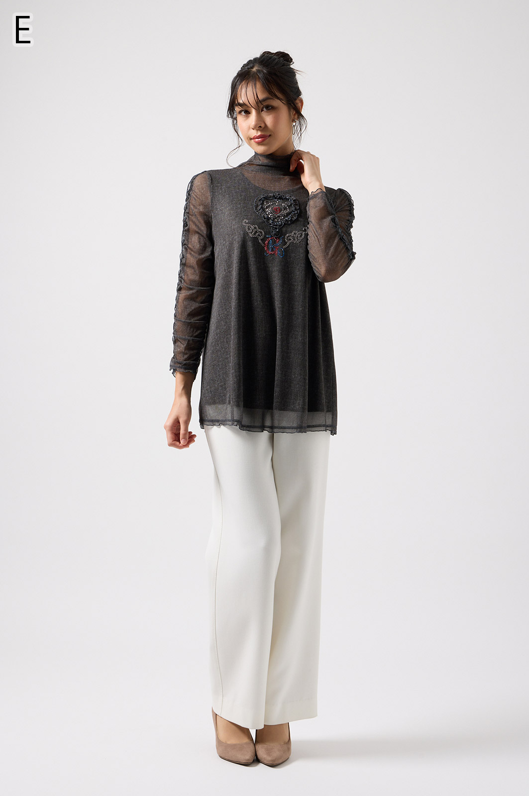 ほんのり透け感のあるメッシュ生地に、前身ごろだけニットを重ねた2枚仕立てのTシャツ。体のラインを拾いにくいAラインで、晩夏から初秋にかけてサラッと着られる便利な一枚です。