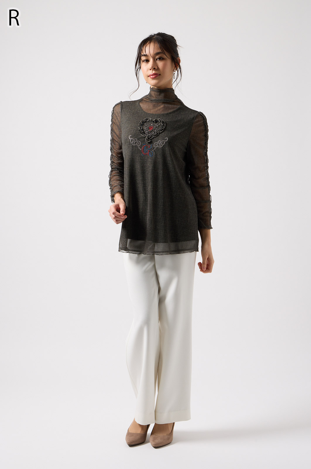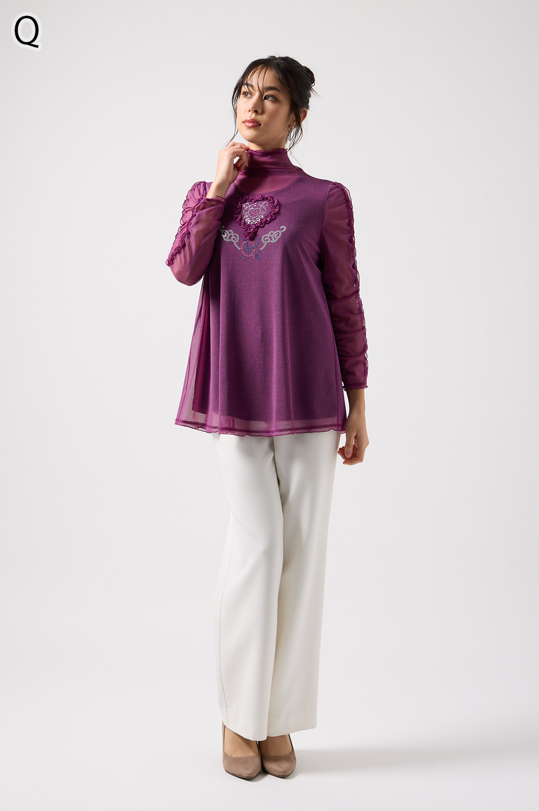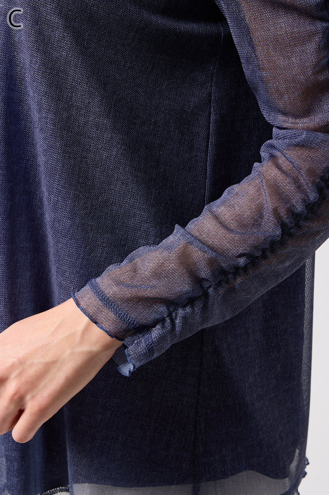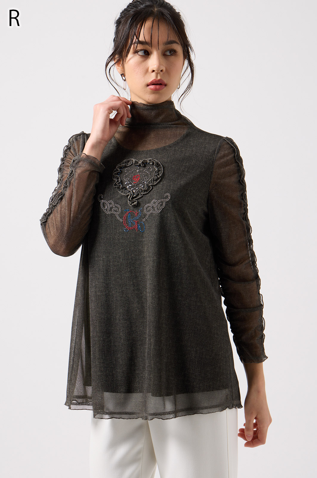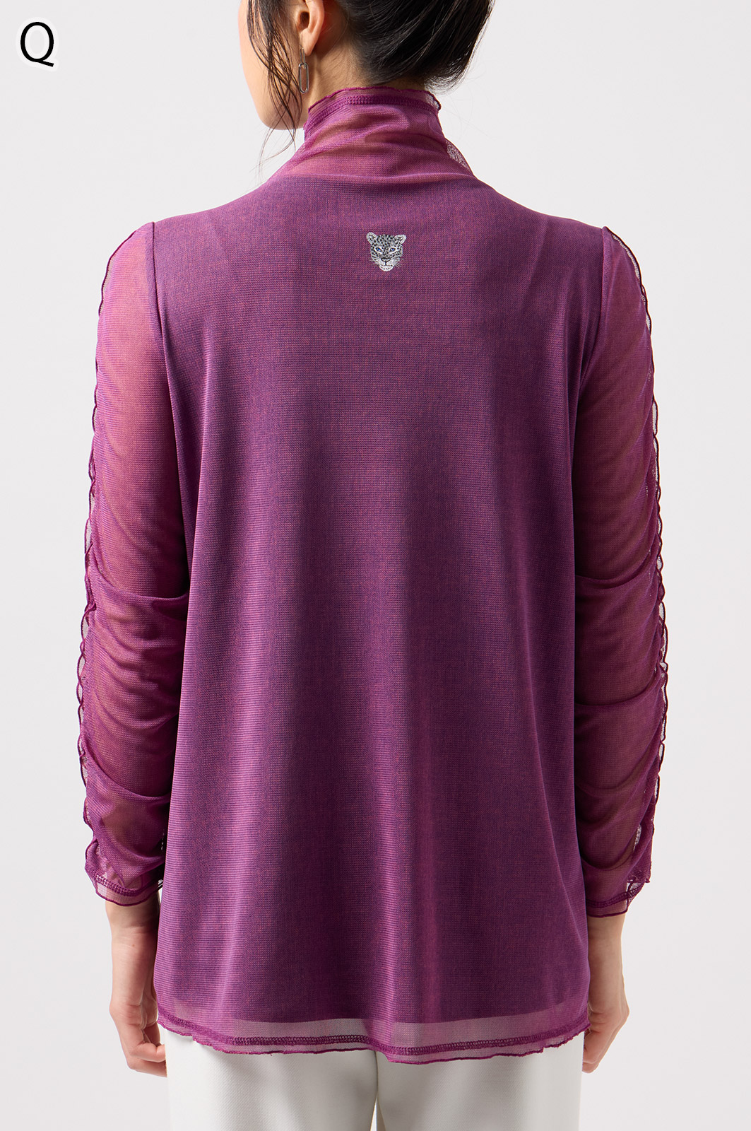 ほんのり透け感のあるメッシュ生地に、前身ごろだけニットを重ねた2枚仕立てのTシャツ。体のラインを拾いにくいAラインで、晩夏から初秋にかけてサラッと着られる便利な一枚です。