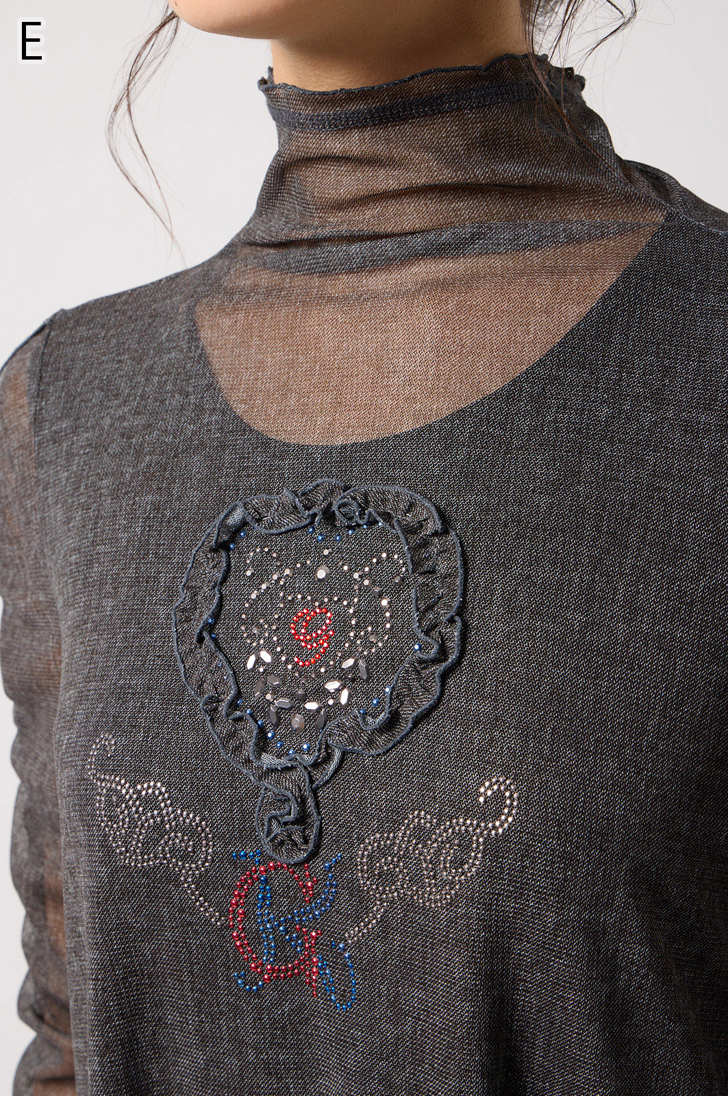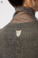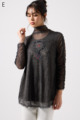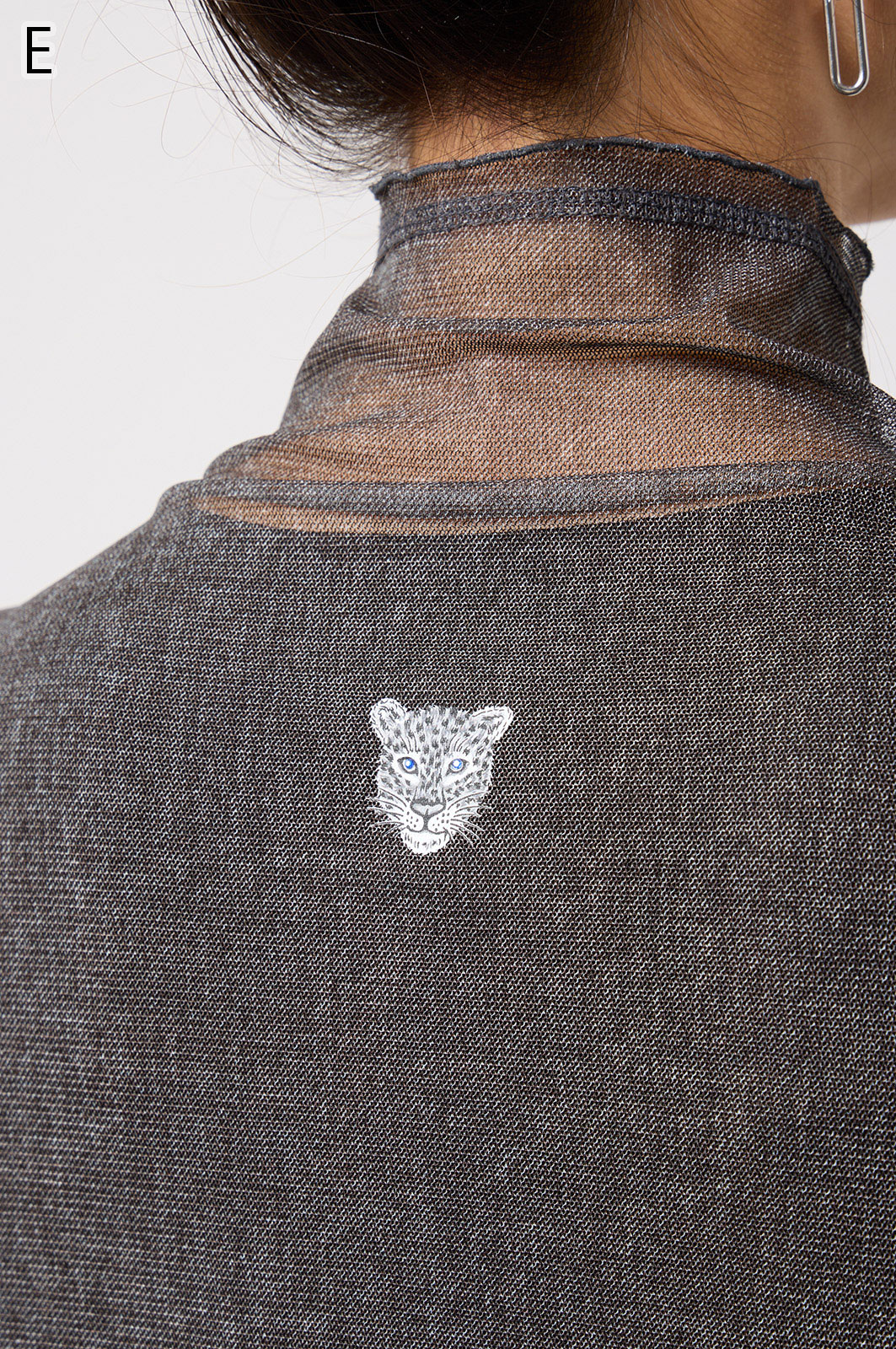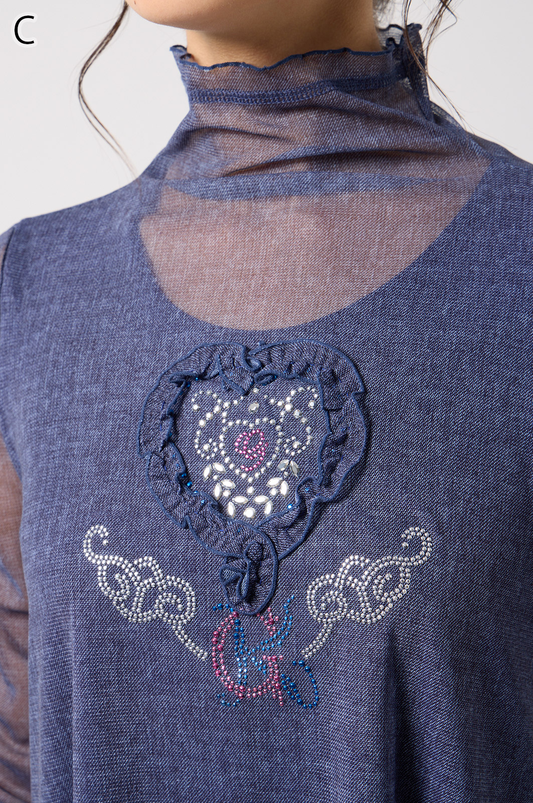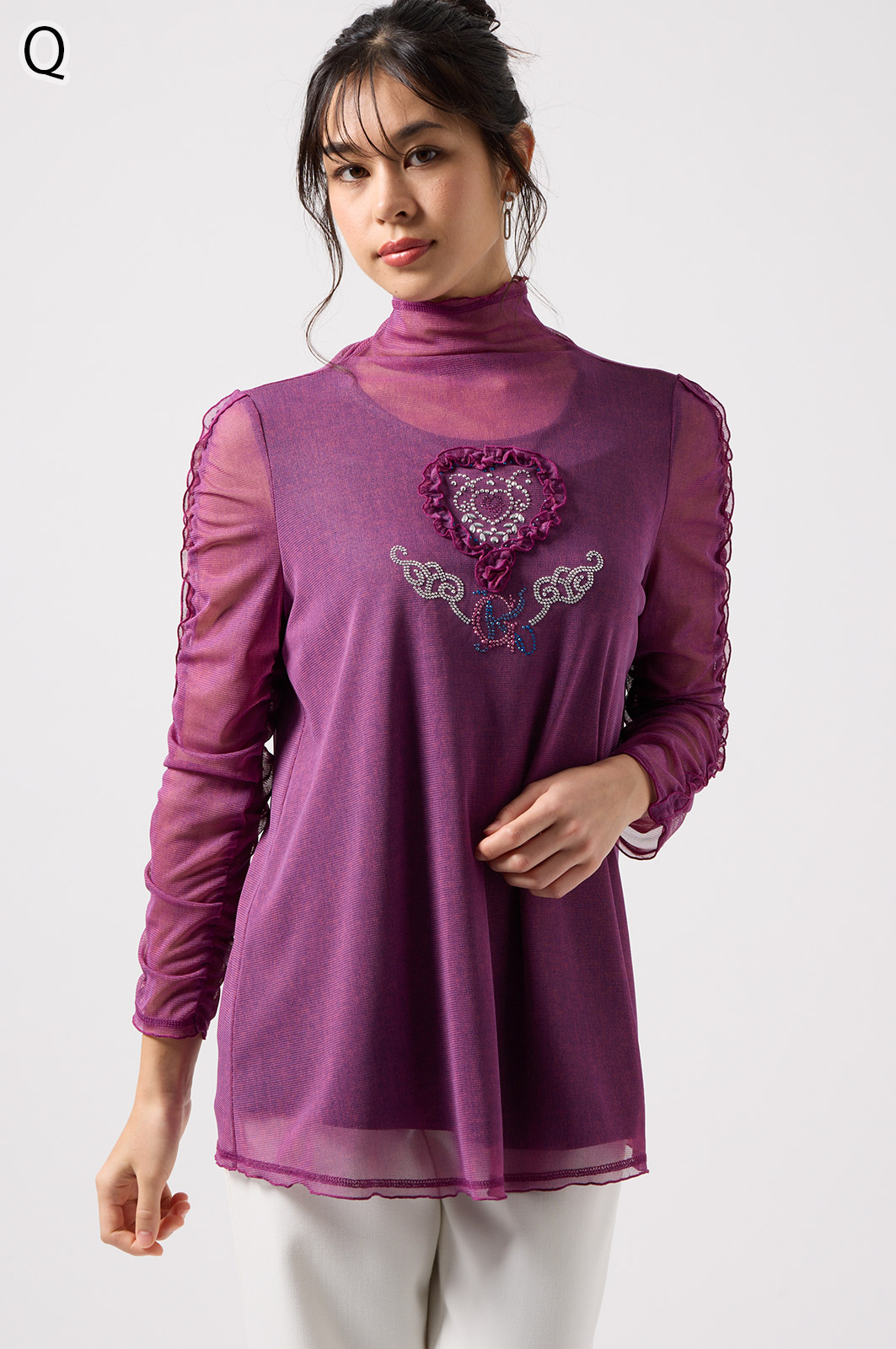 ほんのり透け感のあるメッシュ生地に、前身ごろだけニットを重ねた2枚仕立てのTシャツ。体のラインを拾いにくいAラインで、晩夏から初秋にかけてサラッと着られる便利な一枚です。
