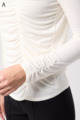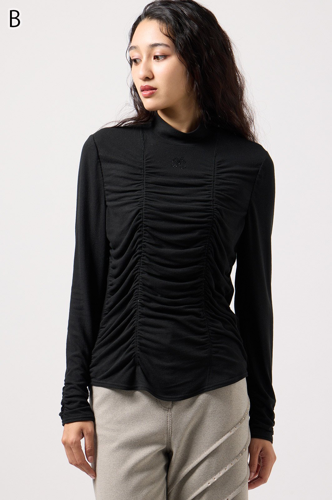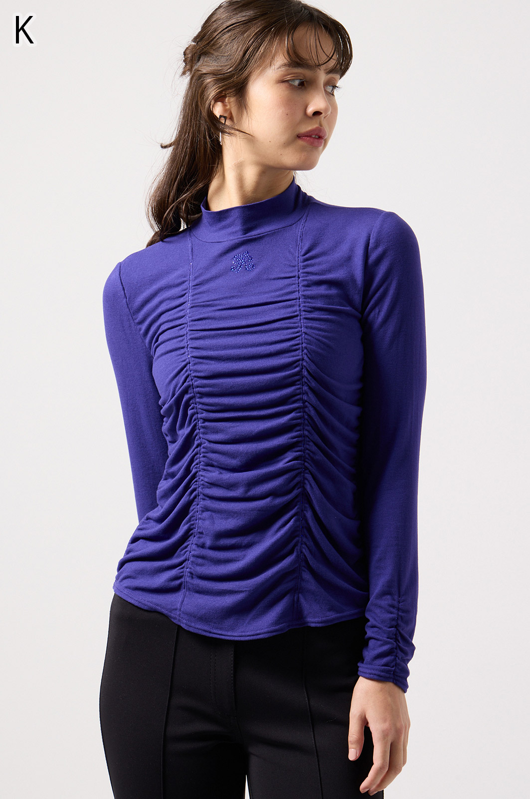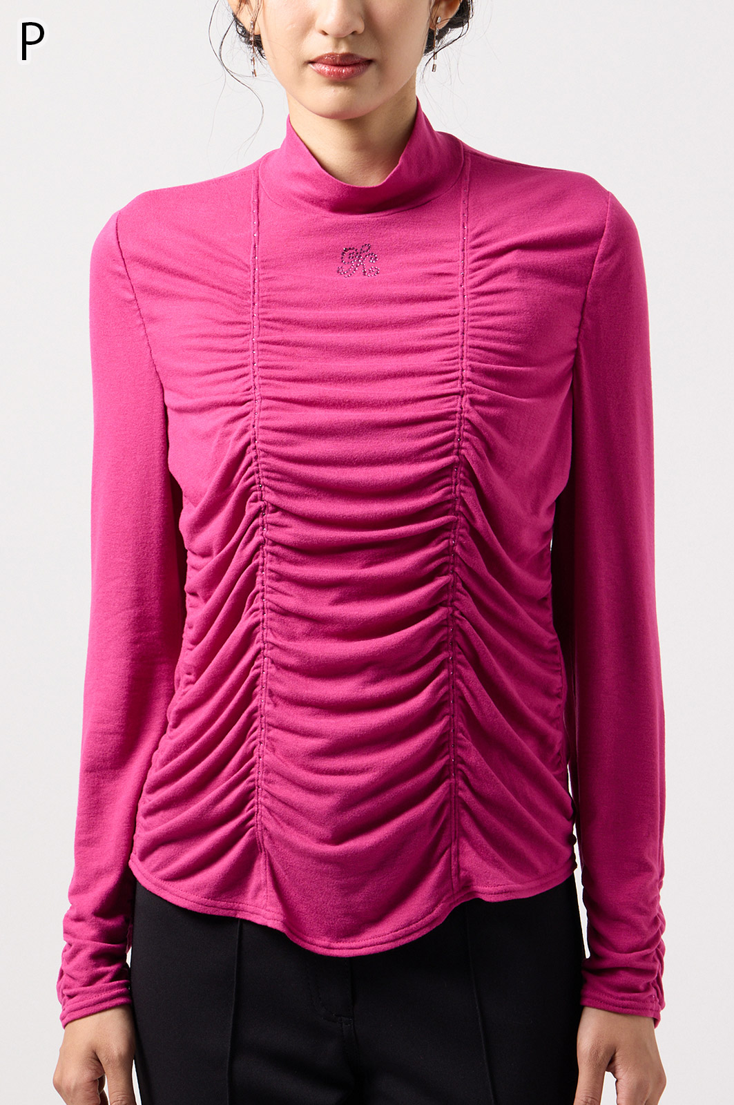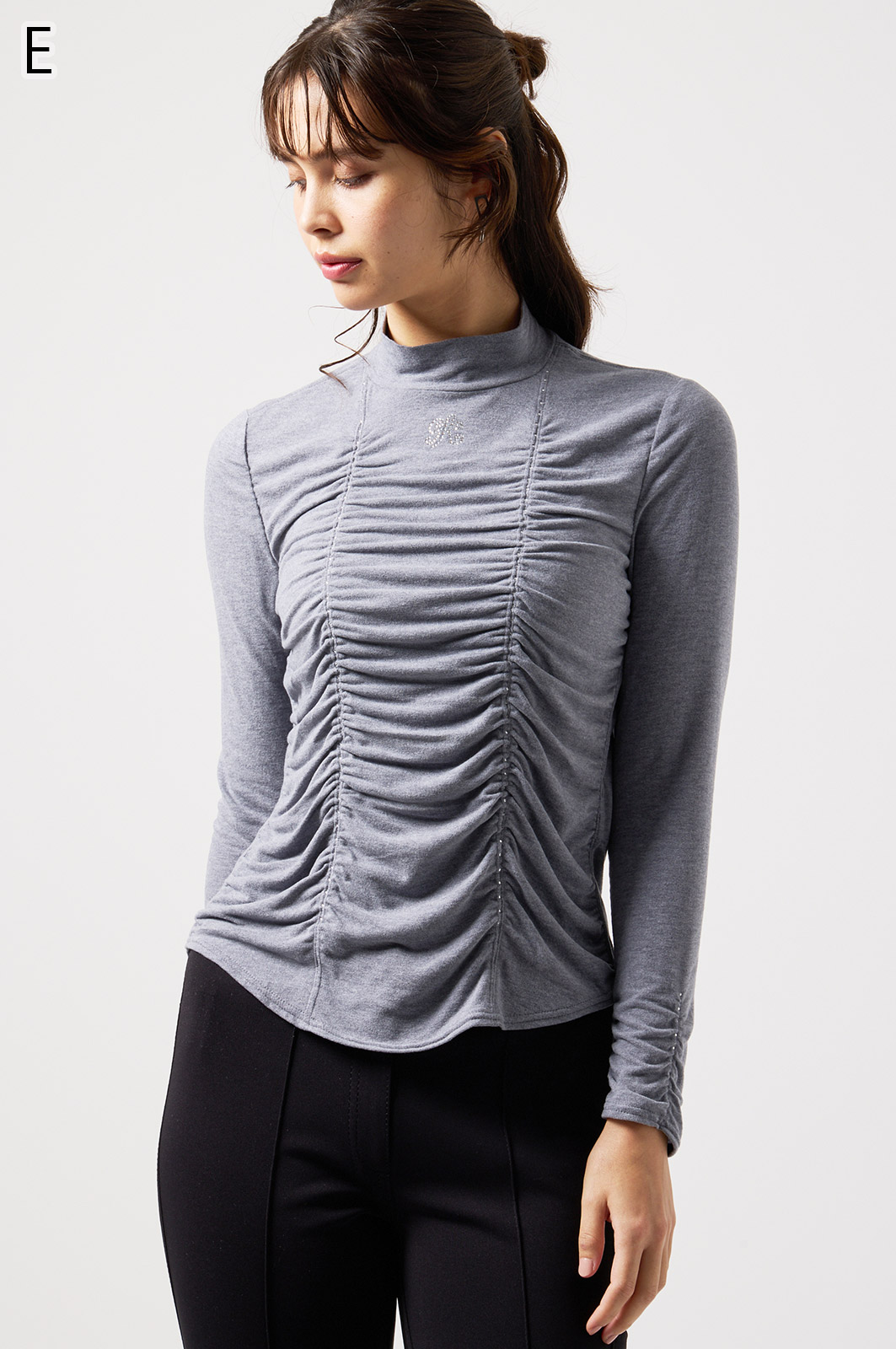 ふんわりやわらかいガーゼ風の素材で、軽いのにあたたかみのある着心地。前側に寄せたギャザーがアクセントになった、1枚でも重ね着でも使える万能インナーTシャツ。