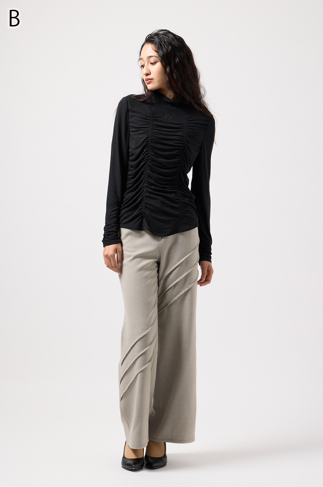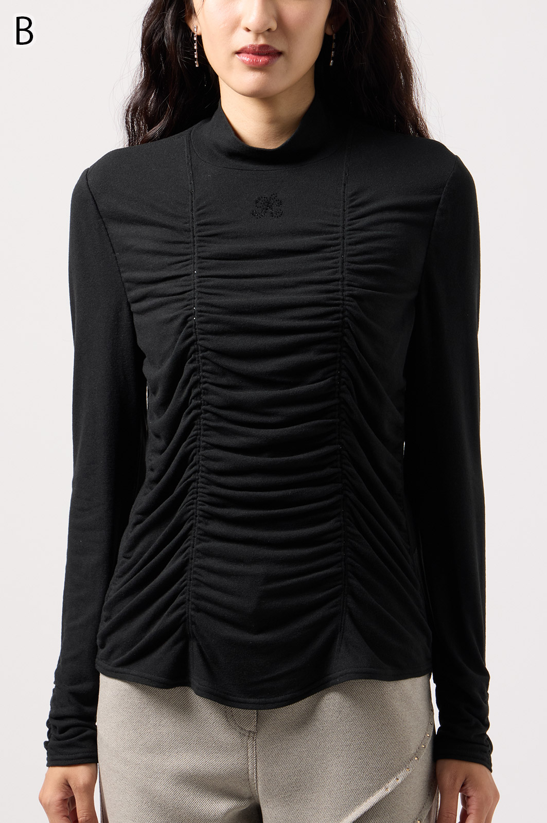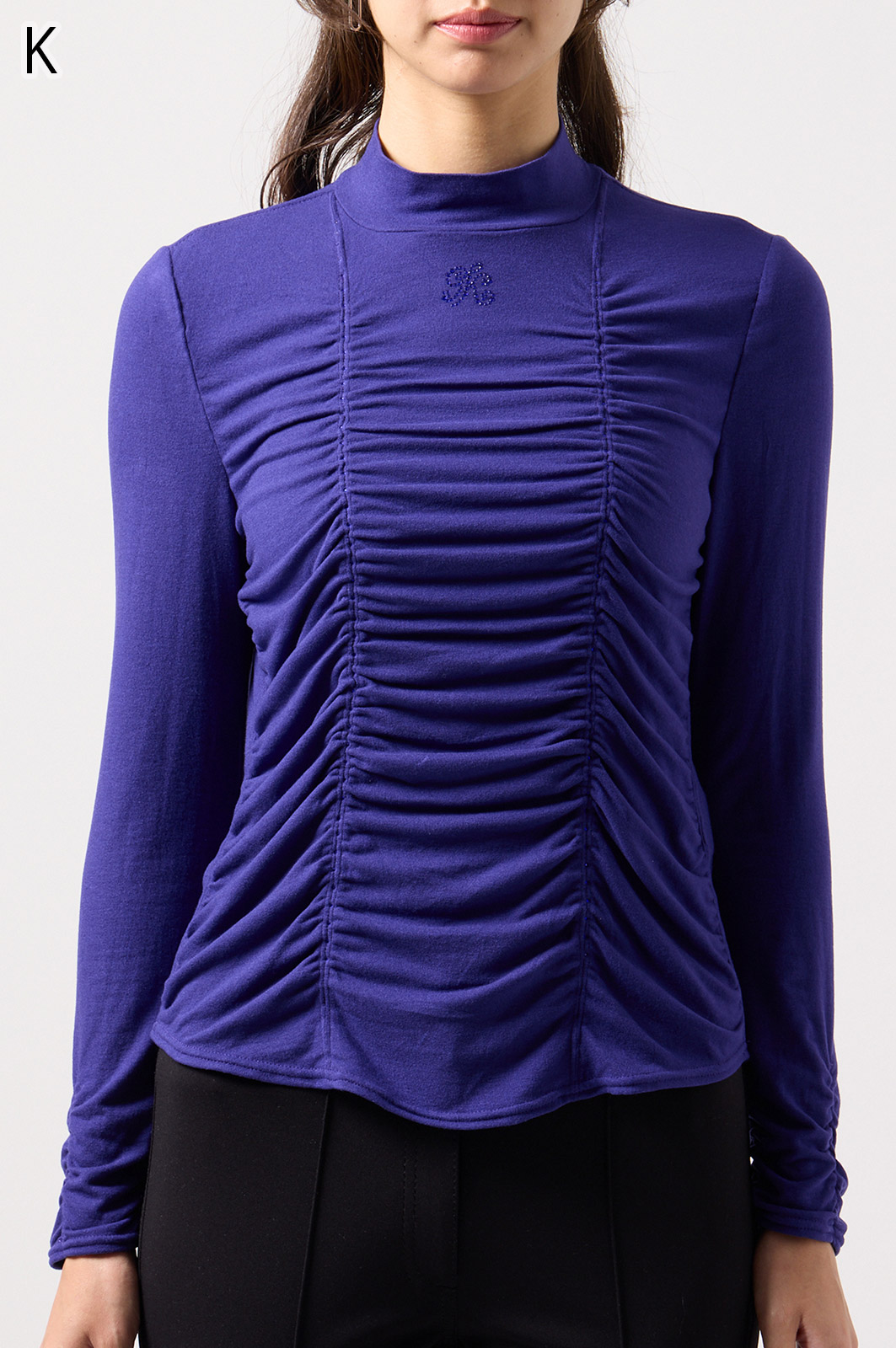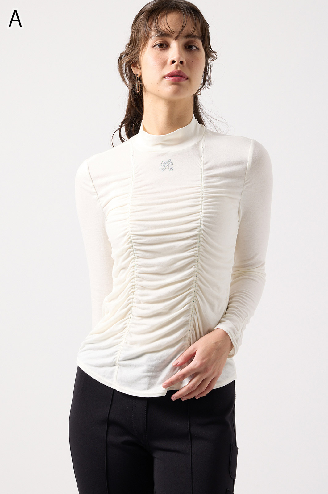 ふんわりやわらかいガーゼ風の素材で、軽いのにあたたかみのある着心地。前側に寄せたギャザーがアクセントになった、1枚でも重ね着でも使える万能インナーTシャツ。