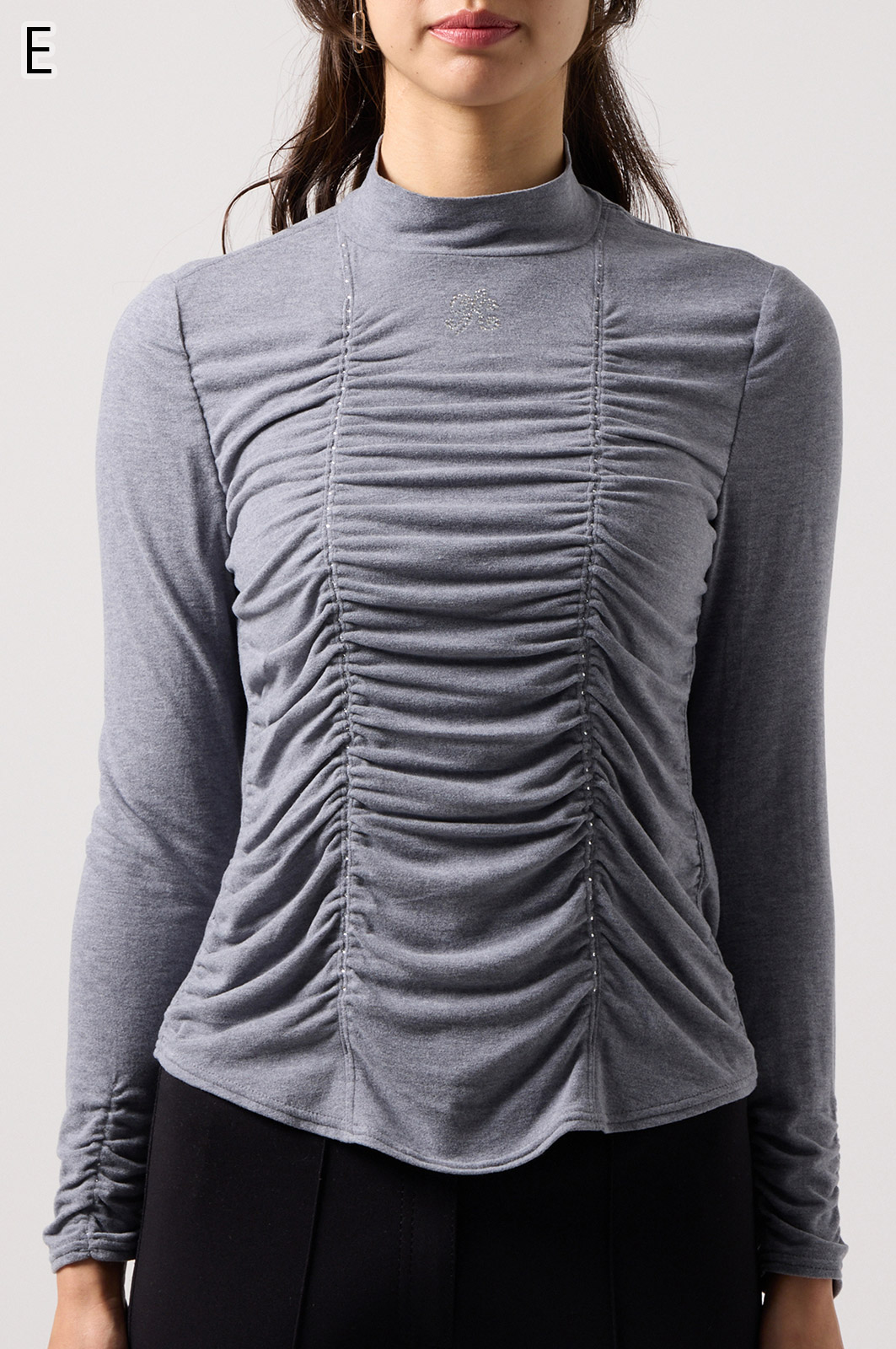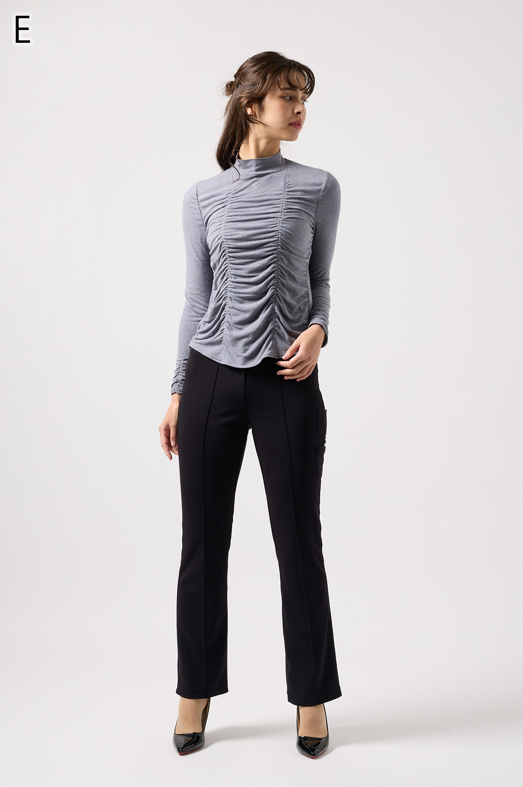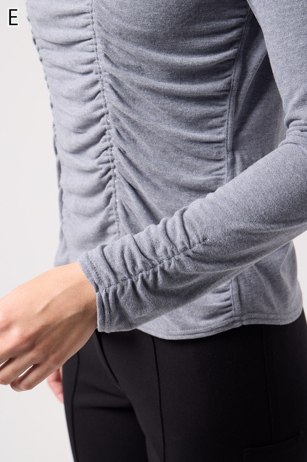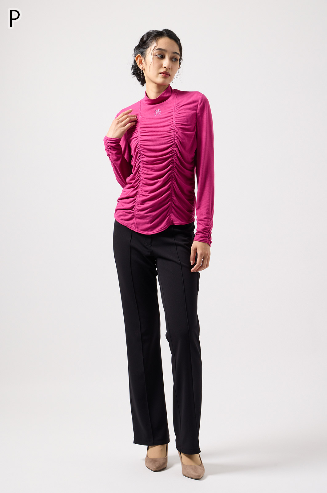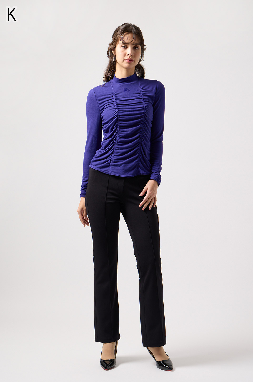 ふんわりやわらかいガーゼ風の素材で、軽いのにあたたかみのある着心地。前側に寄せたギャザーがアクセントになった、1枚でも重ね着でも使える万能インナーTシャツ。