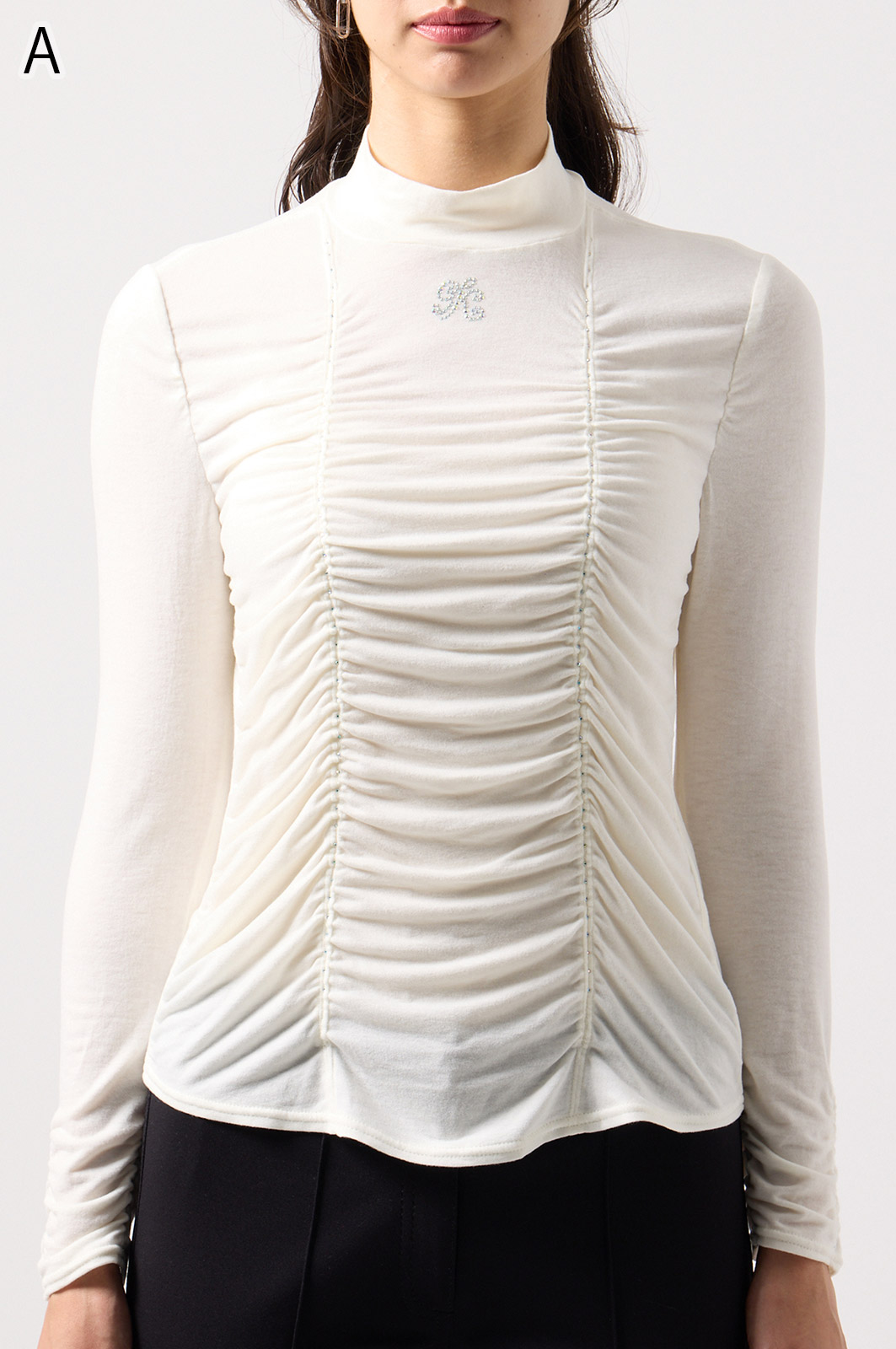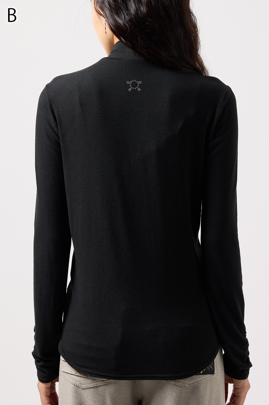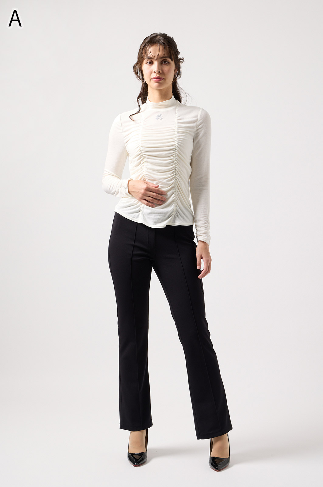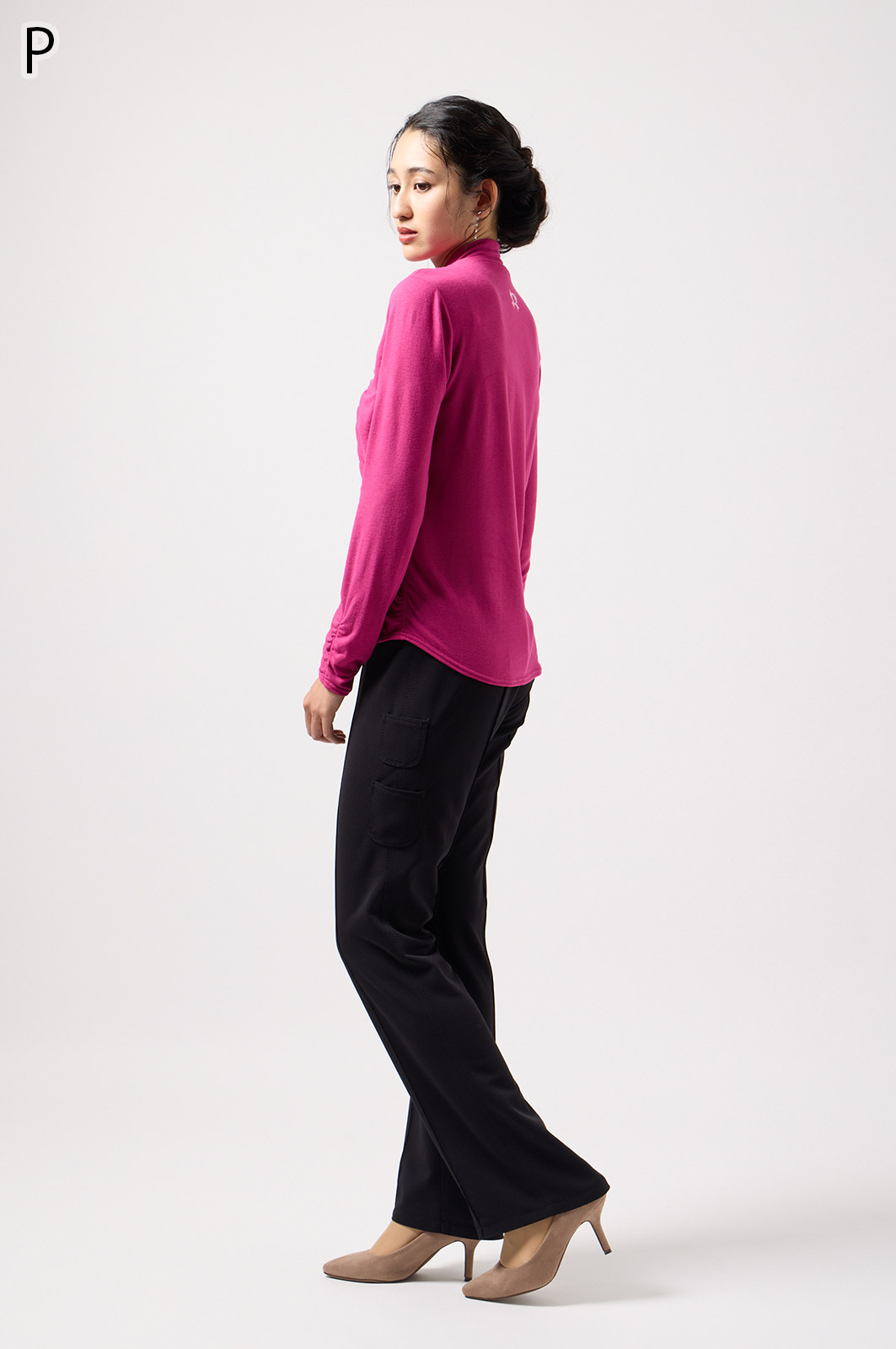 ふんわりやわらかいガーゼ風の素材で、軽いのにあたたかみのある着心地。前側に寄せたギャザーがアクセントになった、1枚でも重ね着でも使える万能インナーTシャツ。