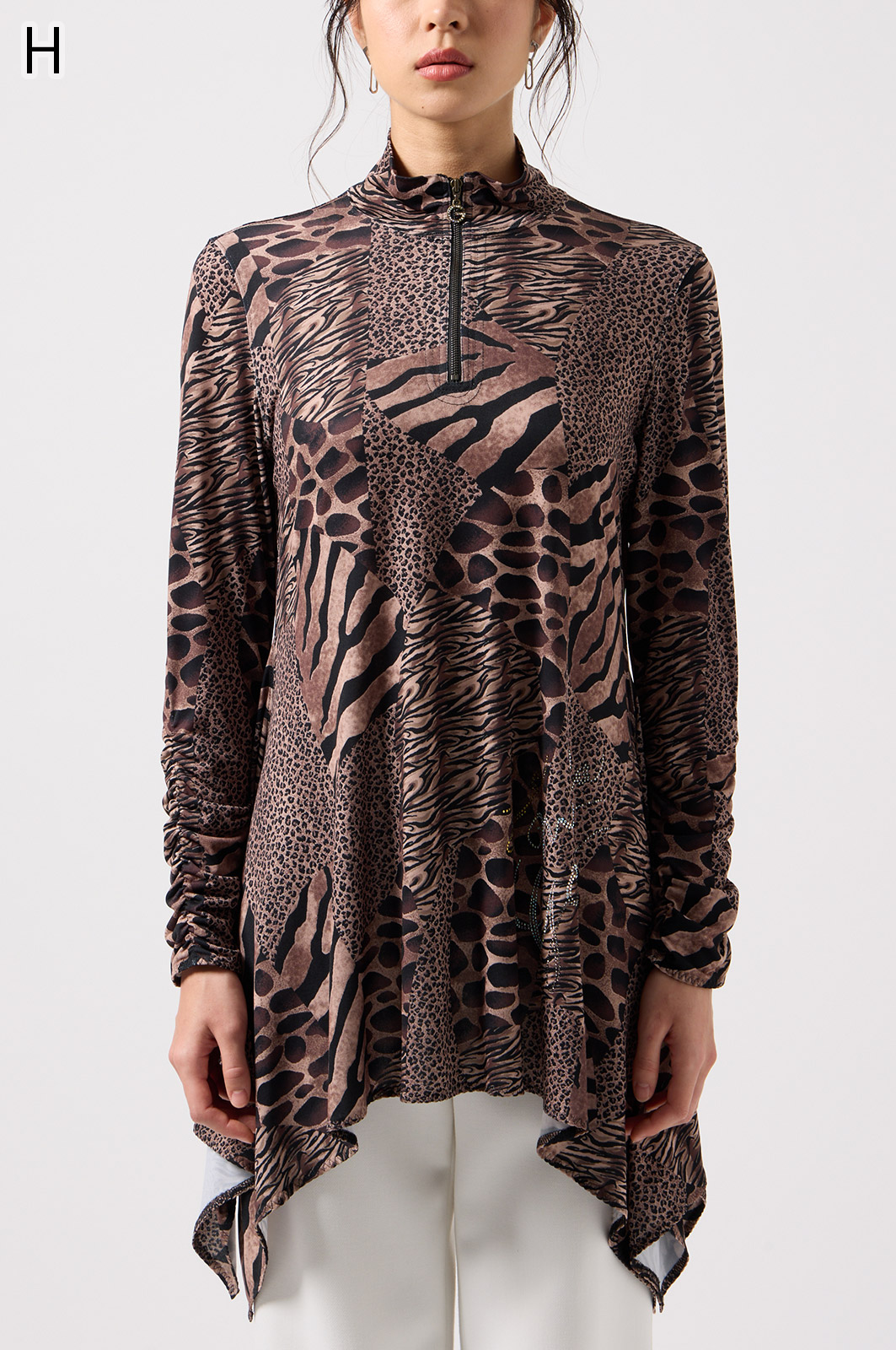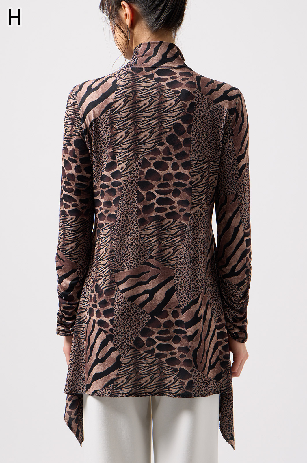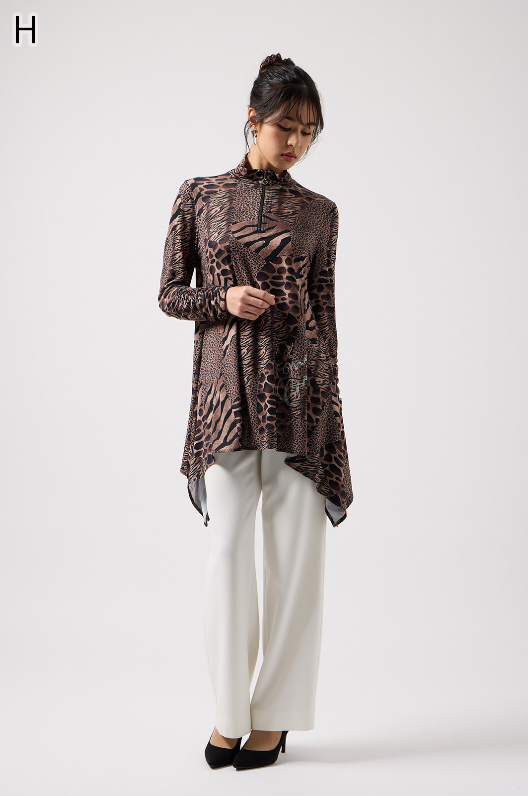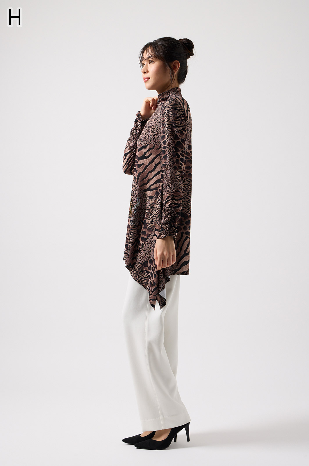 やわらかなニット素材にアニマル柄をのせた、大人っぽく着られるチュニック丈Tシャツ。ヒップまで隠れる丈感で体型カバーも◎。動きのある裾ラインが、シンプルすぎない華やかさをプラスしてくれます。