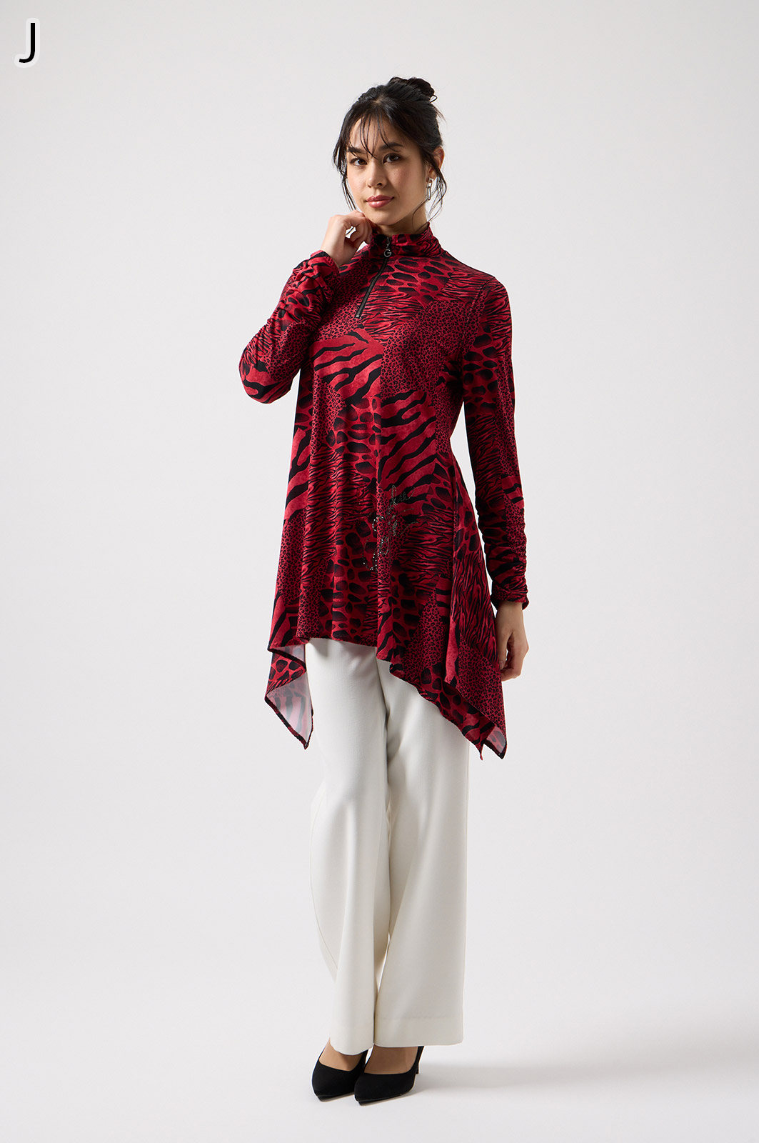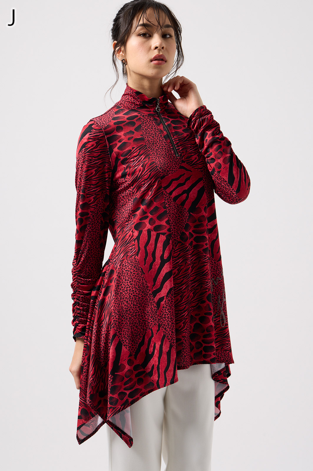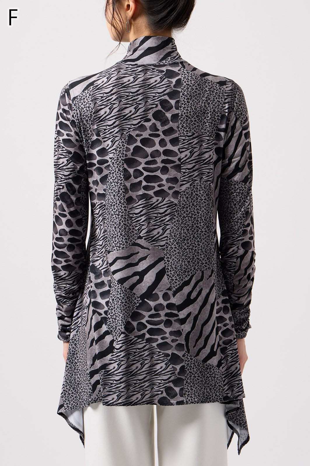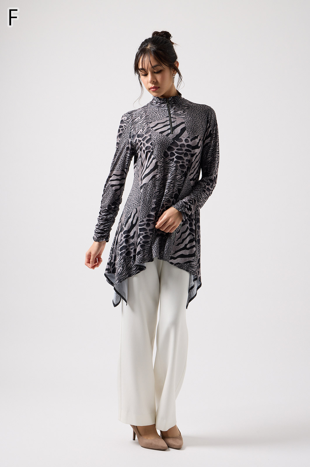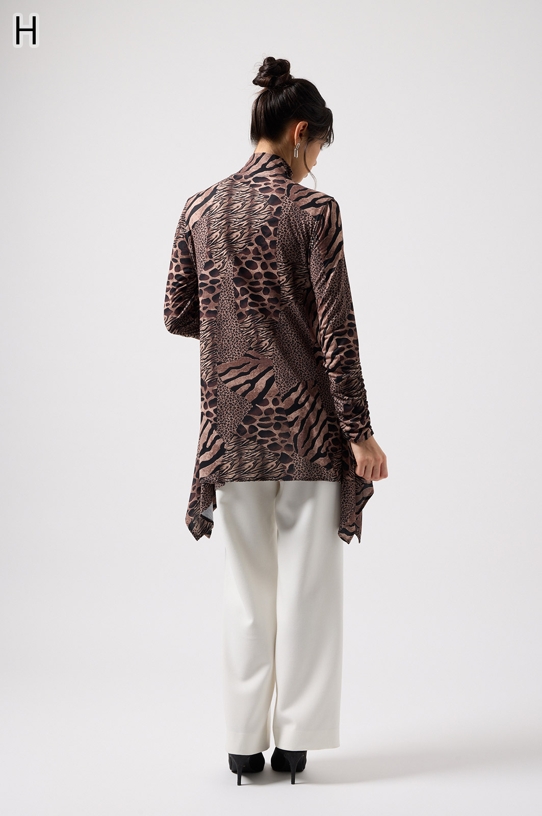 やわらかなニット素材にアニマル柄をのせた、大人っぽく着られるチュニック丈Tシャツ。ヒップまで隠れる丈感で体型カバーも◎。動きのある裾ラインが、シンプルすぎない華やかさをプラスしてくれます。