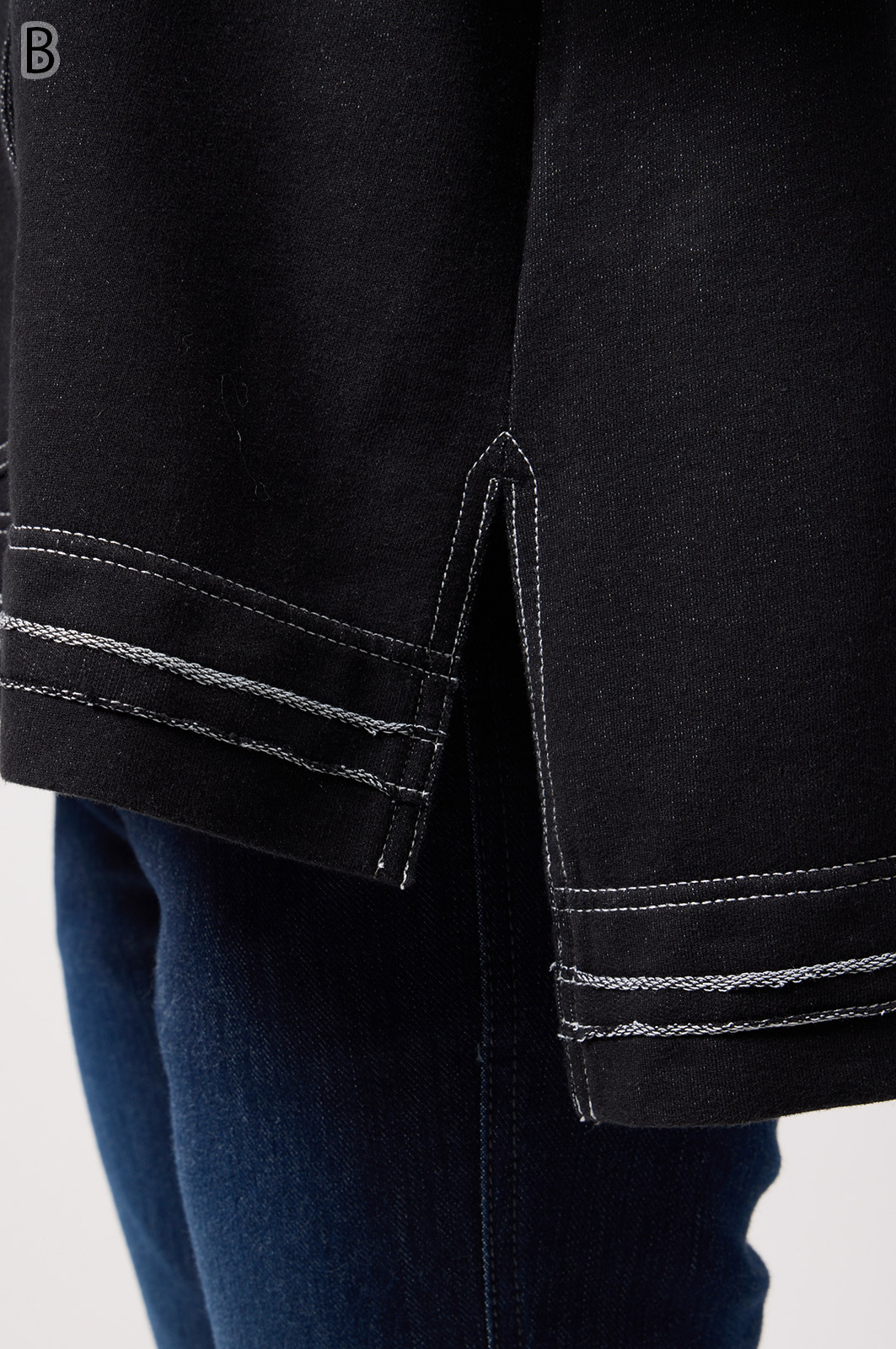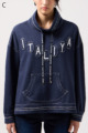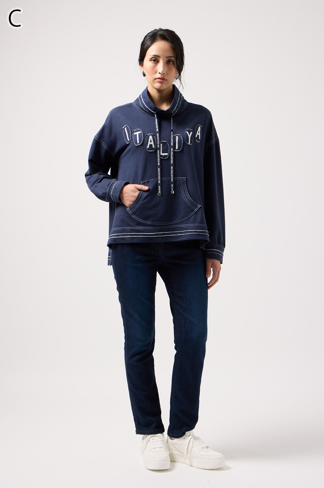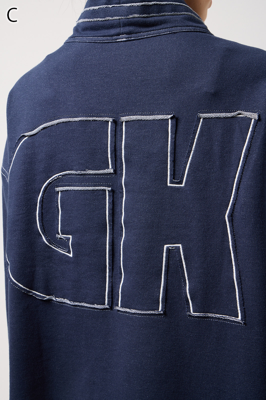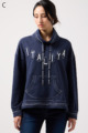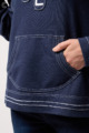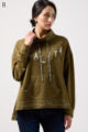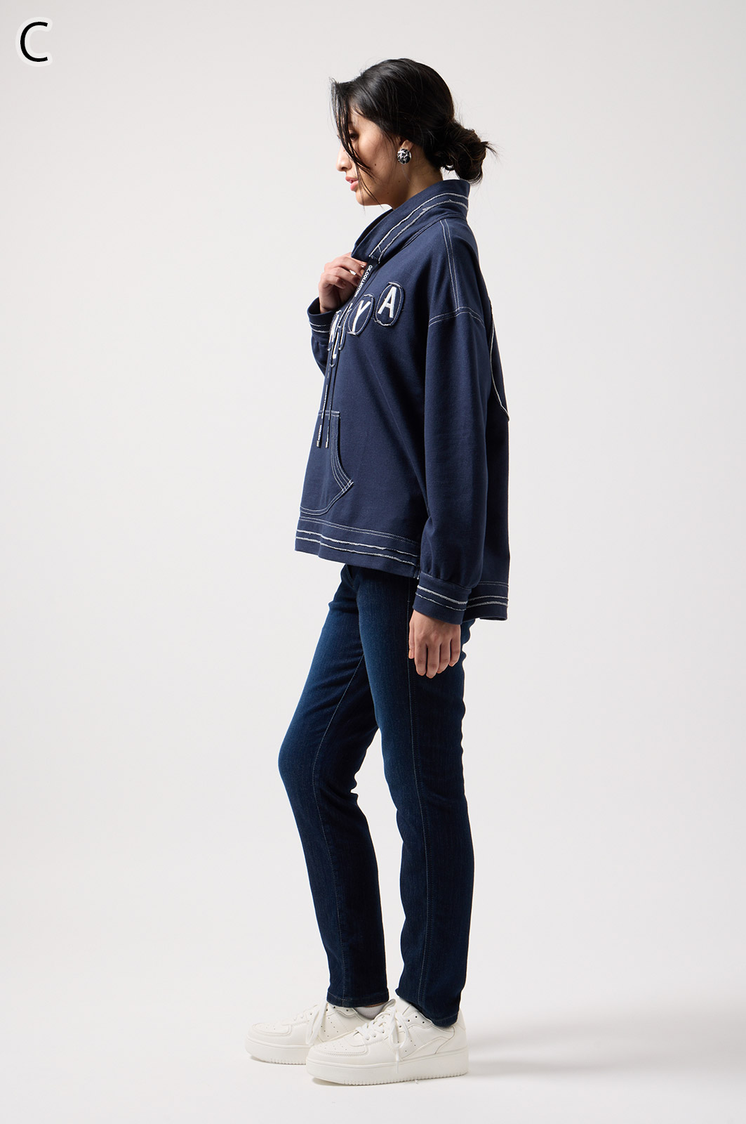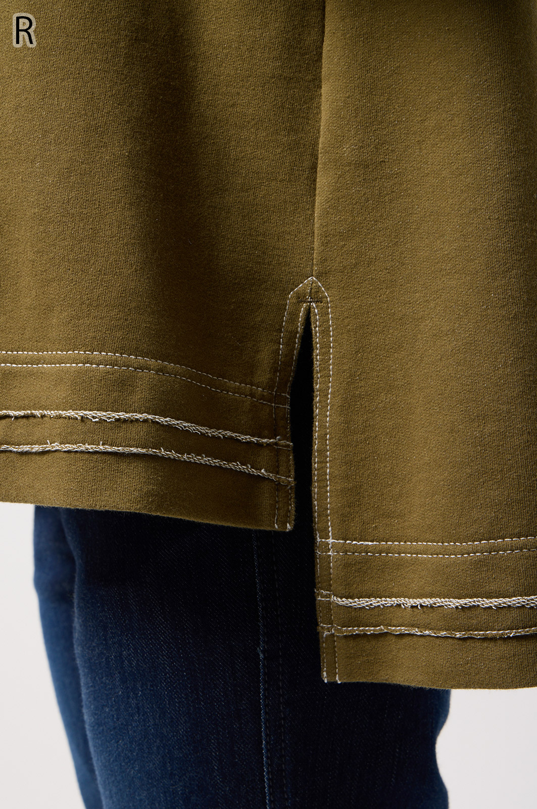 デニム風のやわらかいニット素材を使ったパーカー風Tシャツ。軽やかな着心地で季節を問わず活躍。ざっくり感のあるパッチワークがこなれたカジュアルさを演出します。