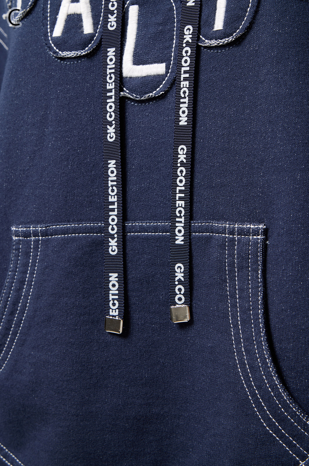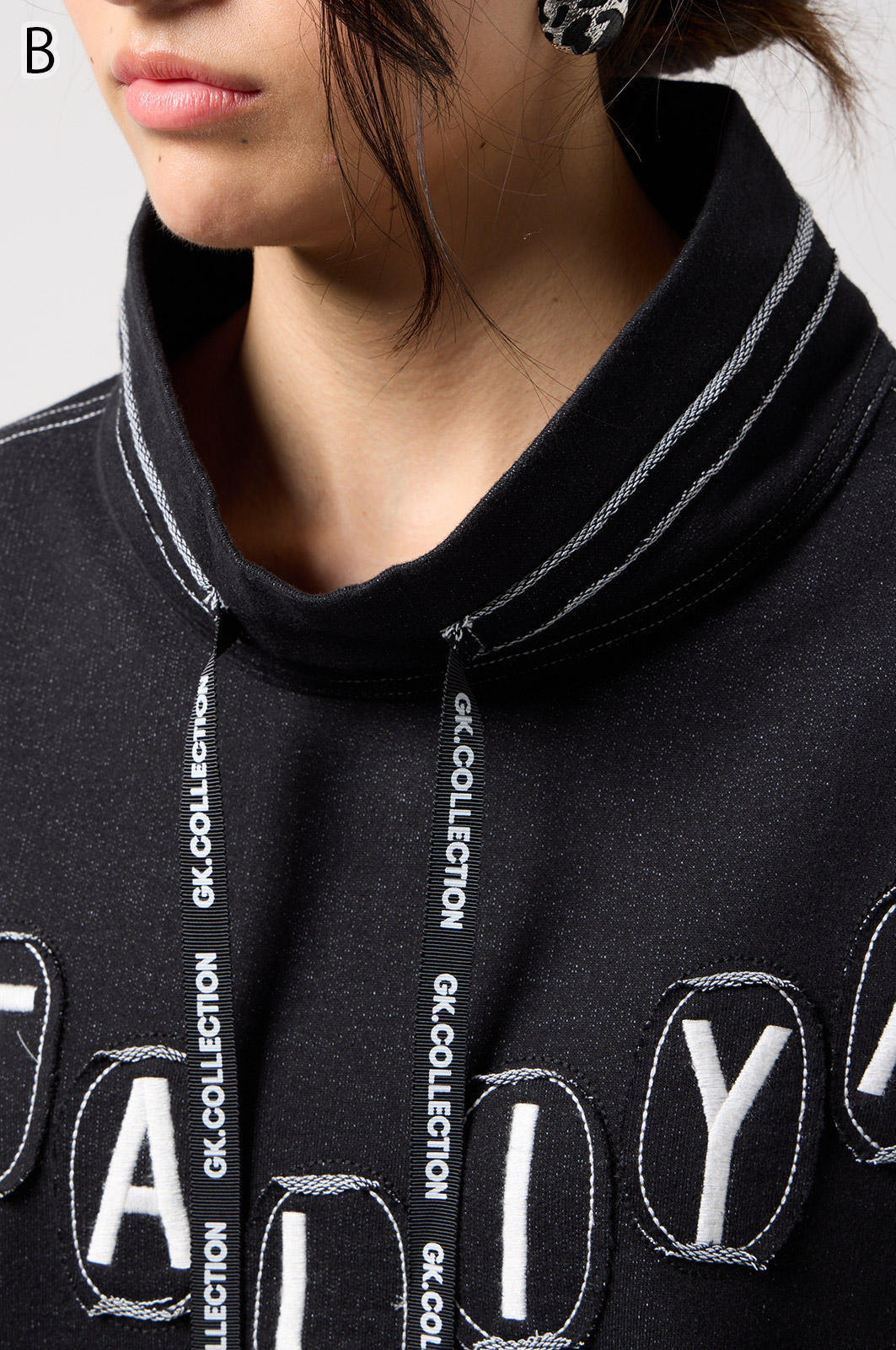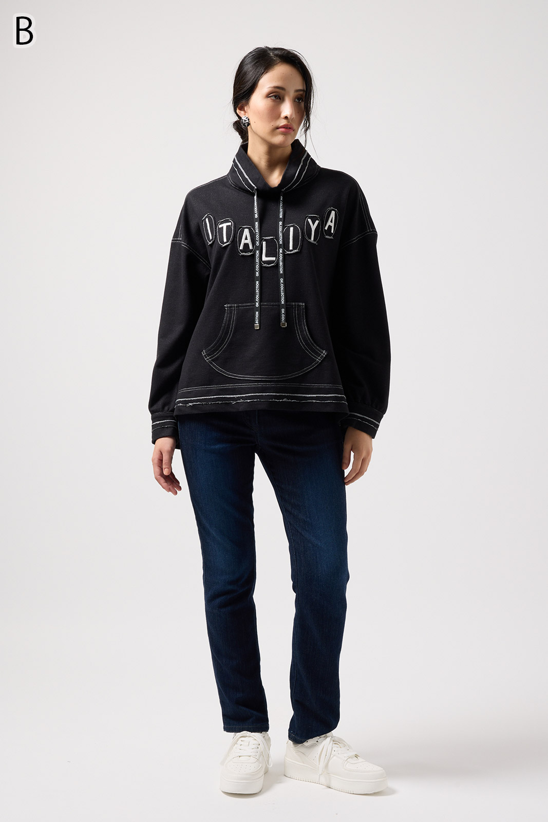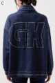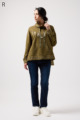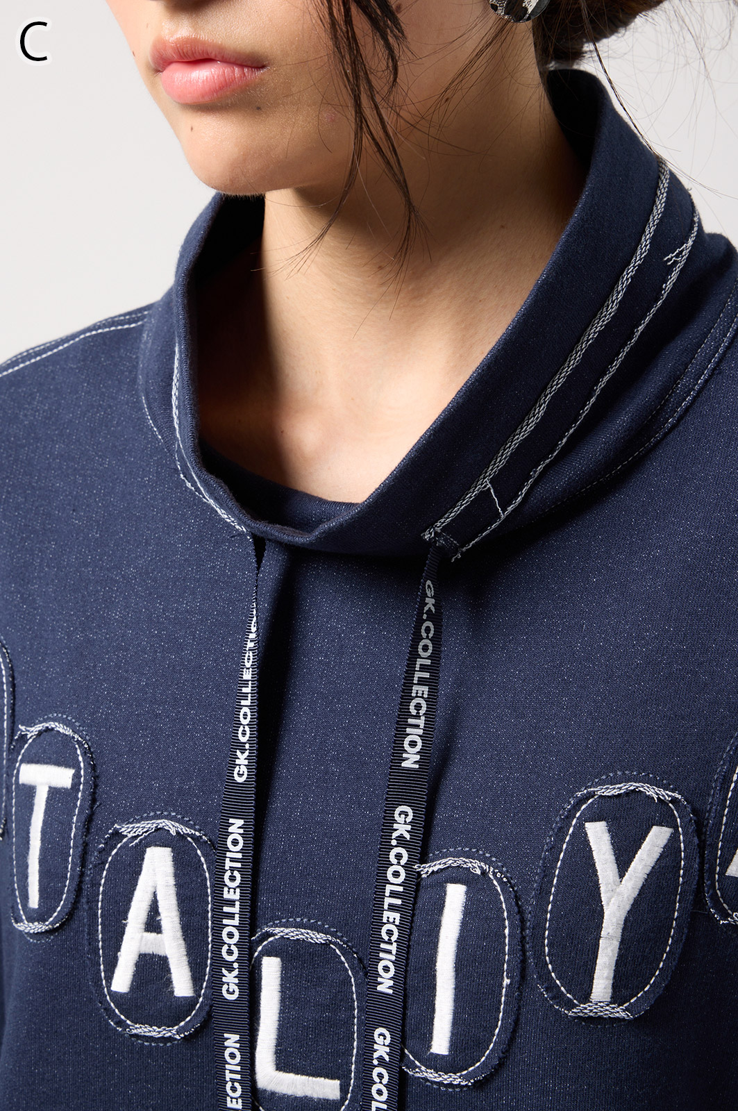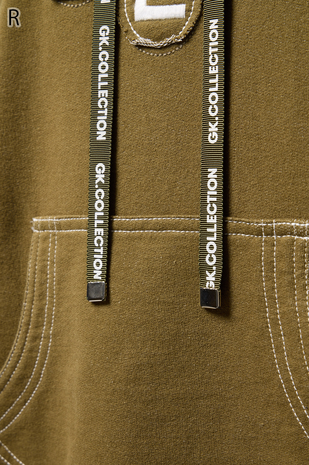 デニム風のやわらかいニット素材を使ったパーカー風Tシャツ。軽やかな着心地で季節を問わず活躍。ざっくり感のあるパッチワークがこなれたカジュアルさを演出します。