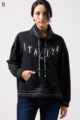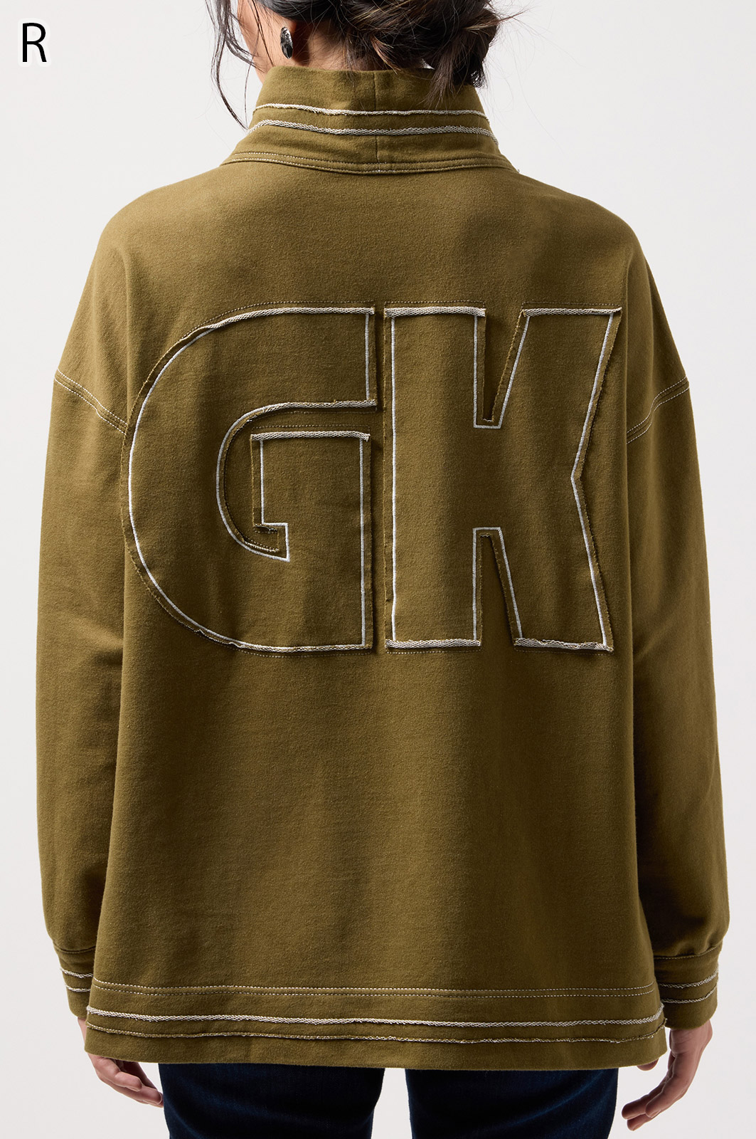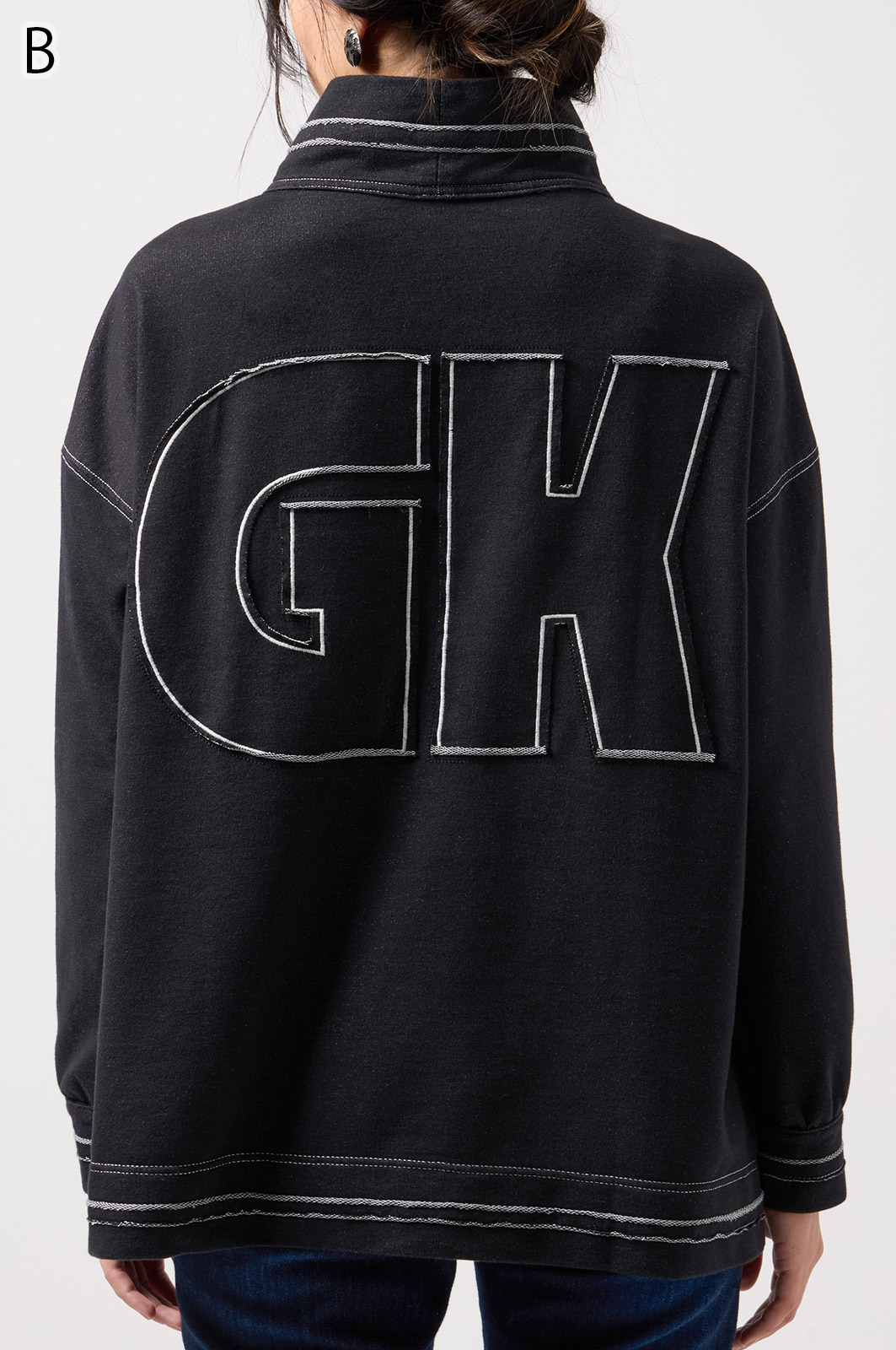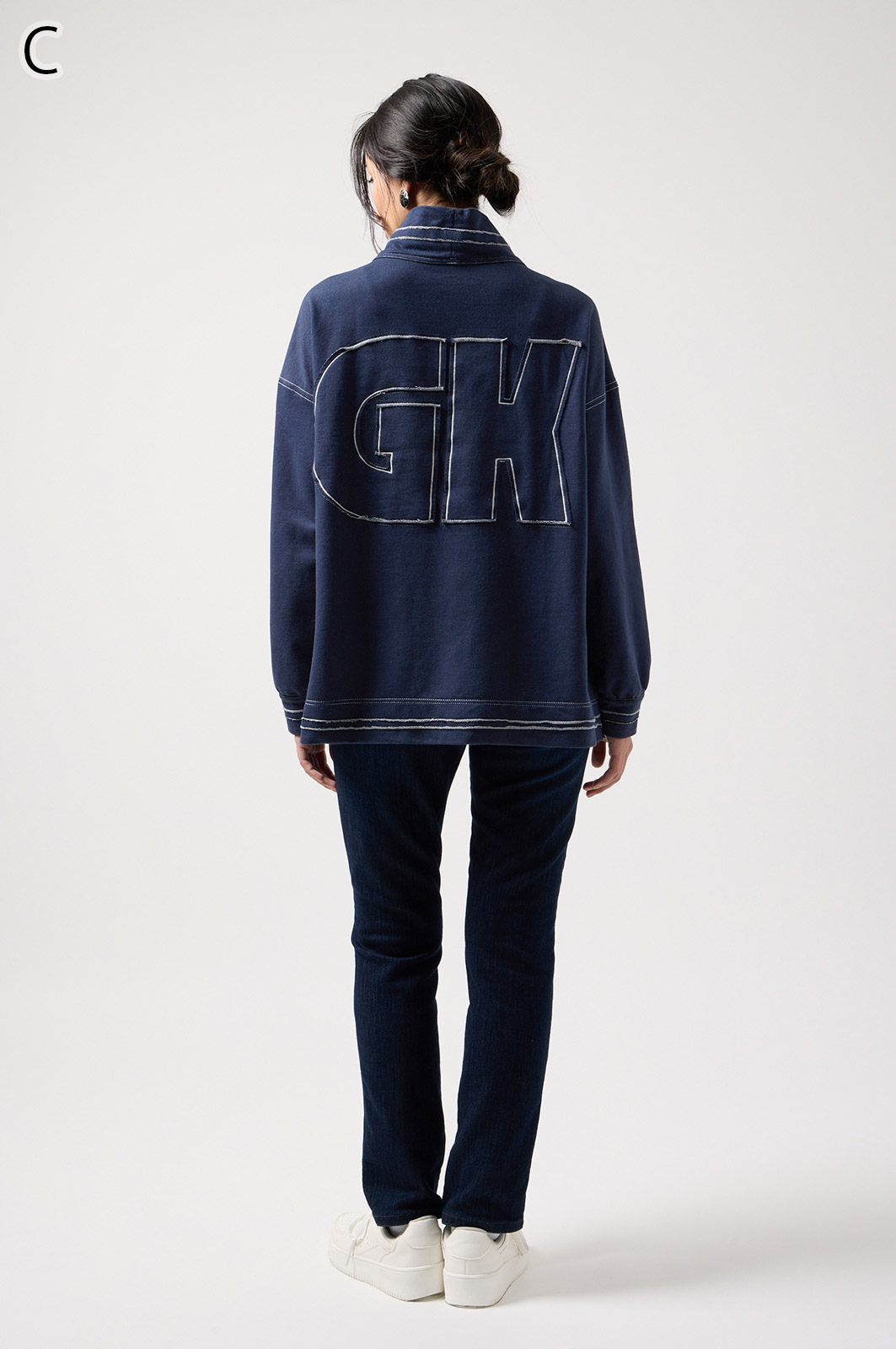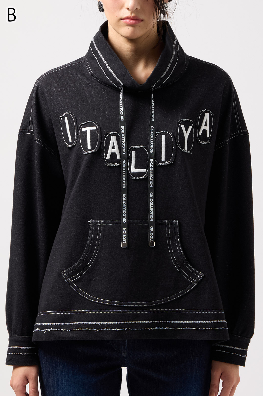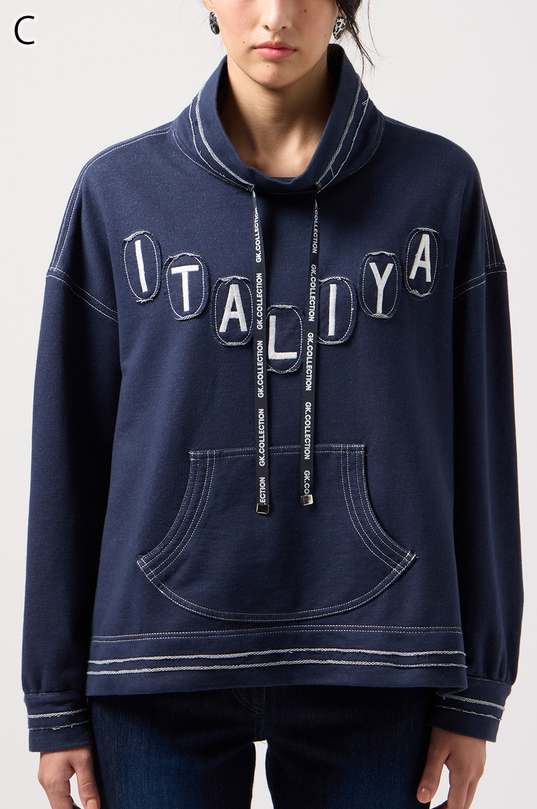 デニム風のやわらかいニット素材を使ったパーカー風Tシャツ。軽やかな着心地で季節を問わず活躍。ざっくり感のあるパッチワークがこなれたカジュアルさを演出します。