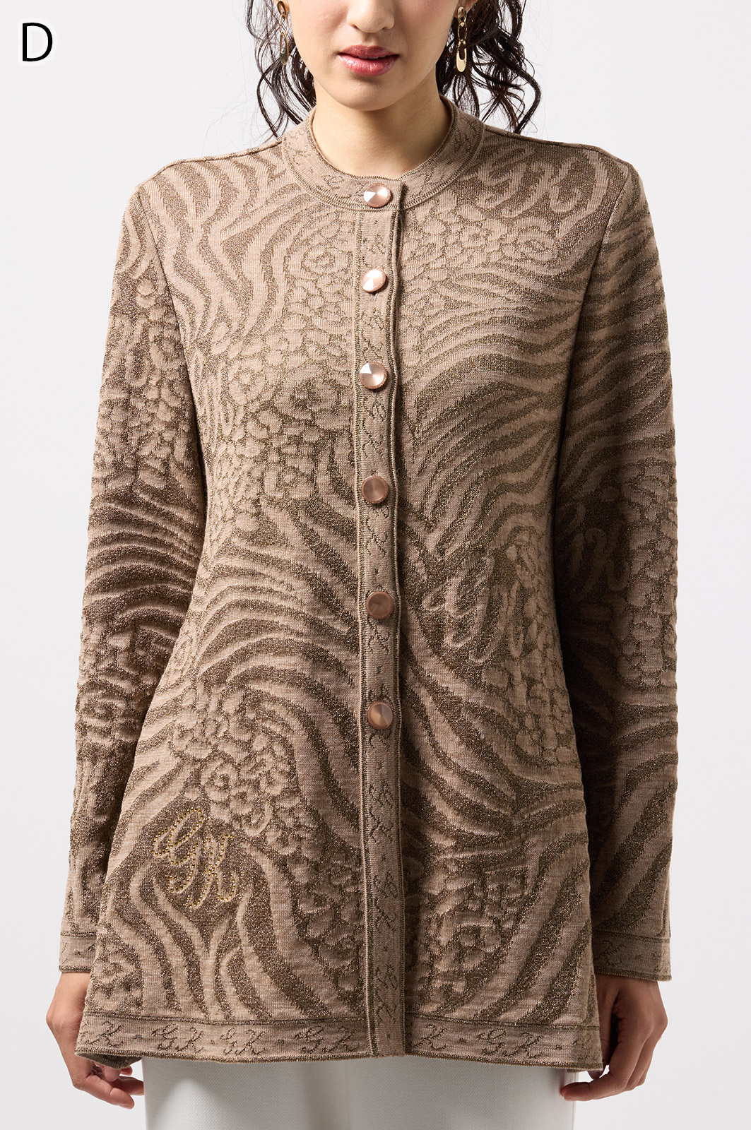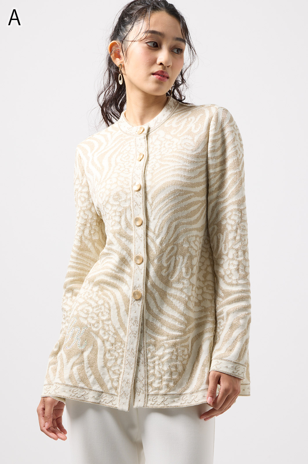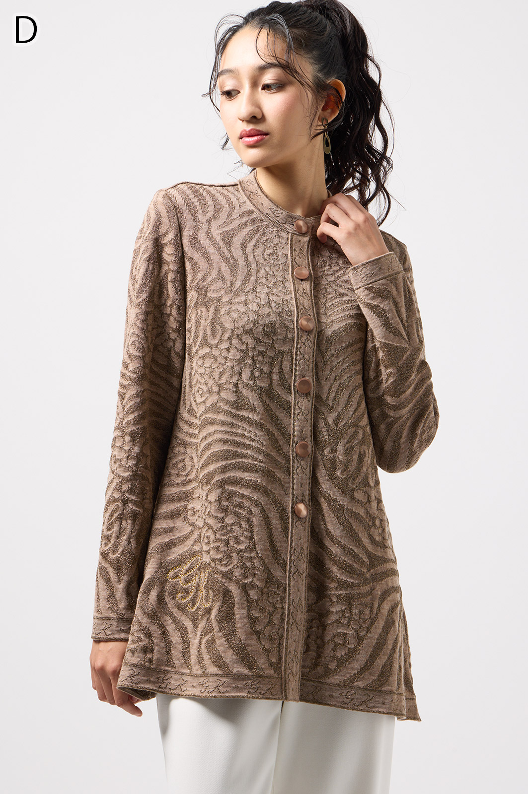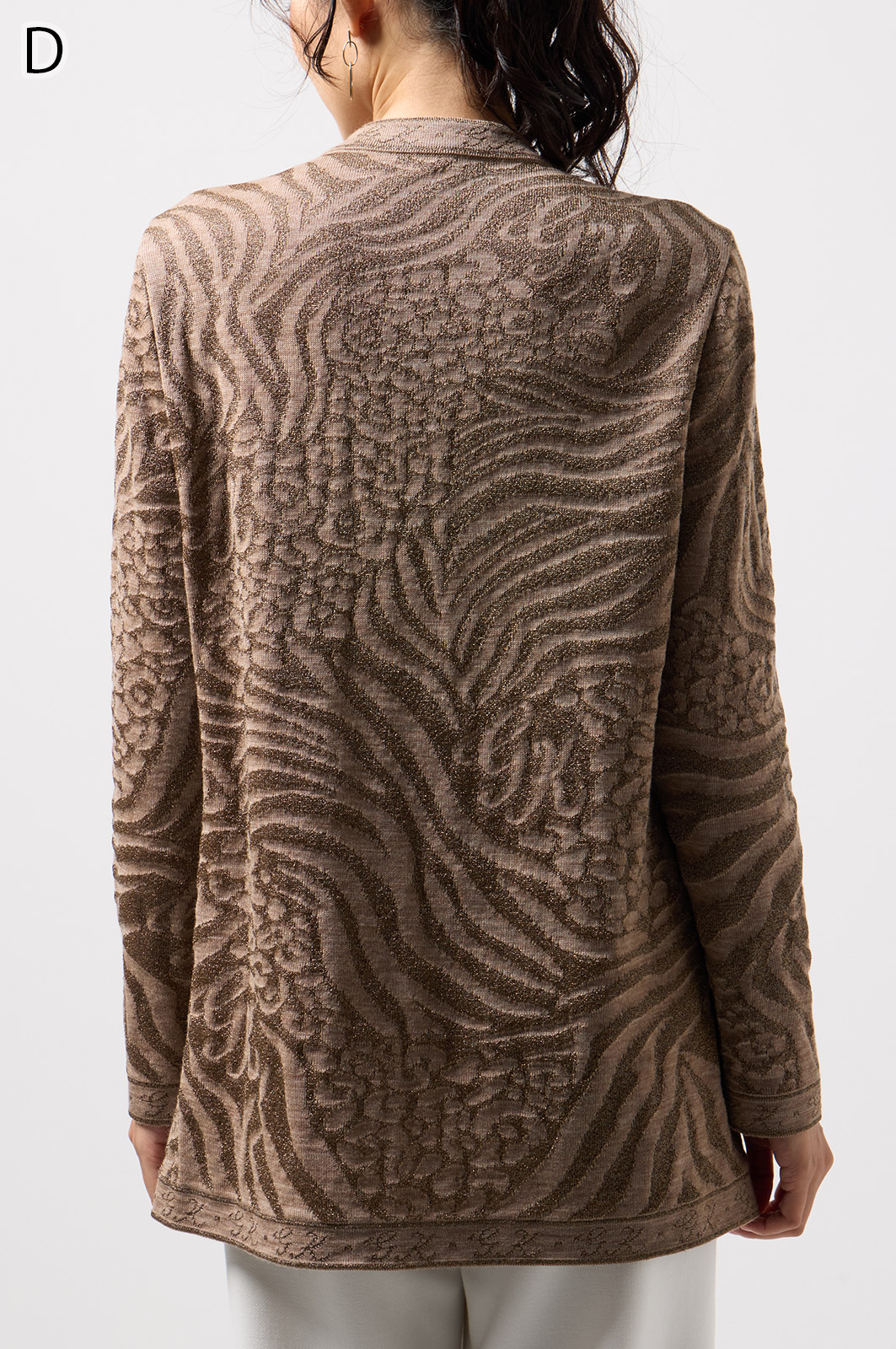 ウールにきらめく糸を織り込んだアニマル柄ニット。華やかで立体感のある編み模様が魅力です。特別な日のおしゃれにもぴったりな、大人のための主役トップス。