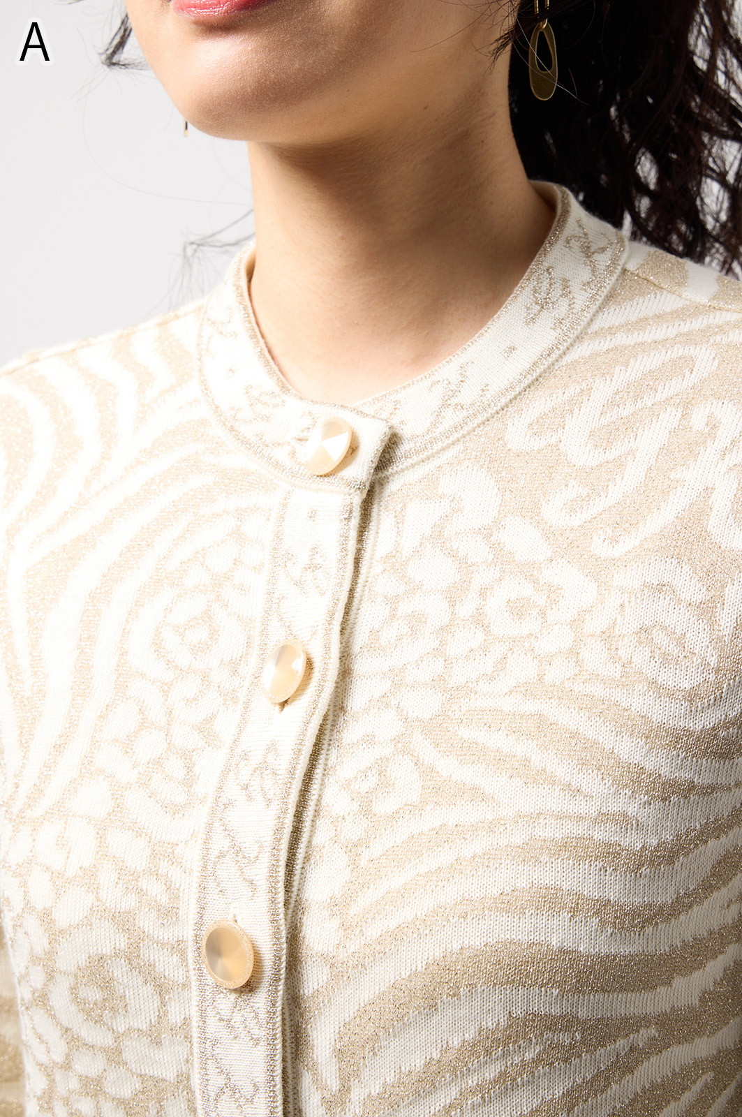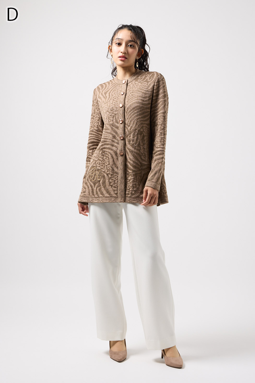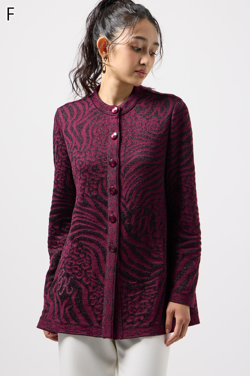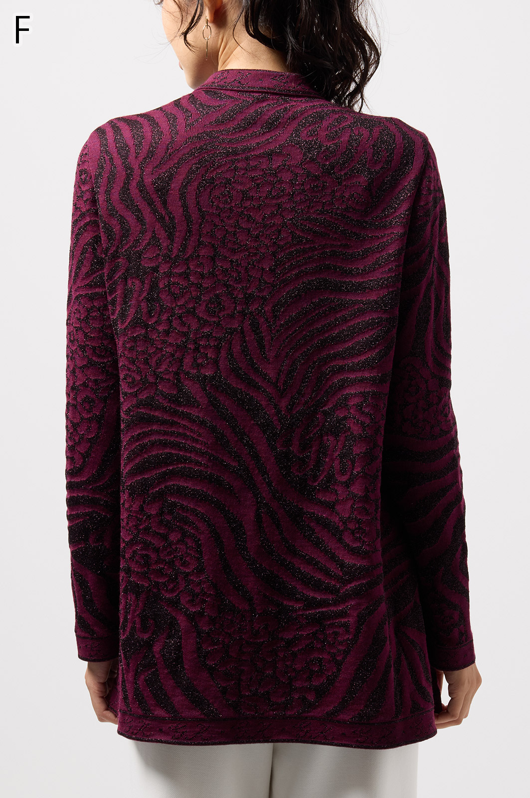 ウールにきらめく糸を織り込んだアニマル柄ニット。華やかで立体感のある編み模様が魅力です。特別な日のおしゃれにもぴったりな、大人のための主役トップス。