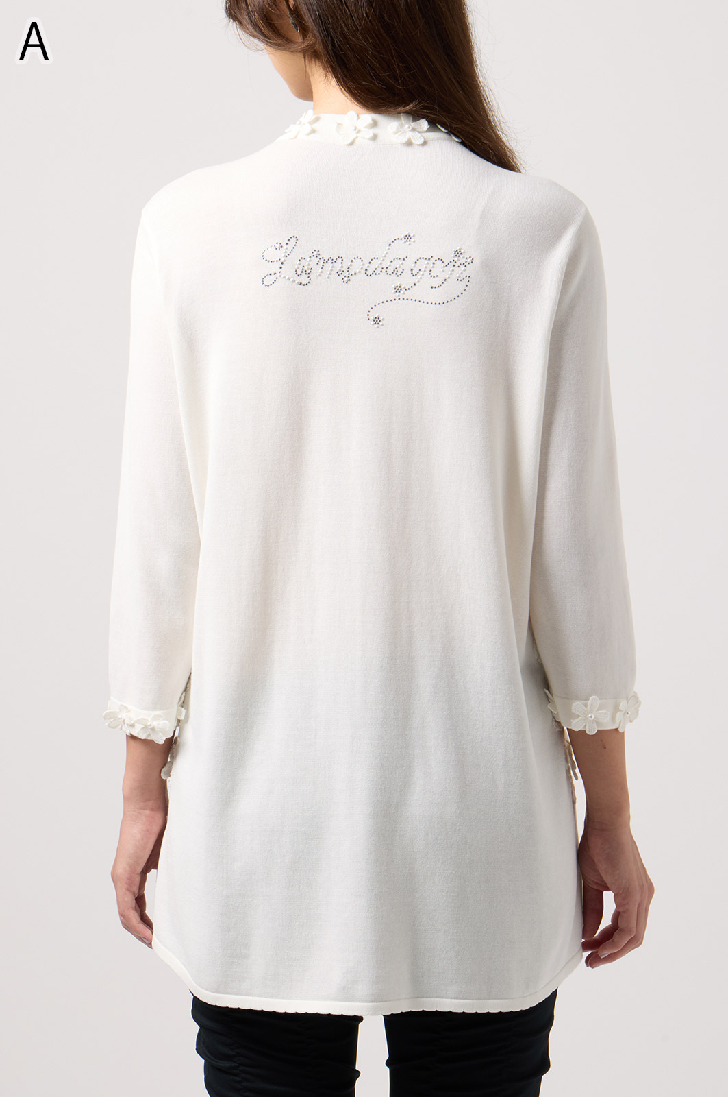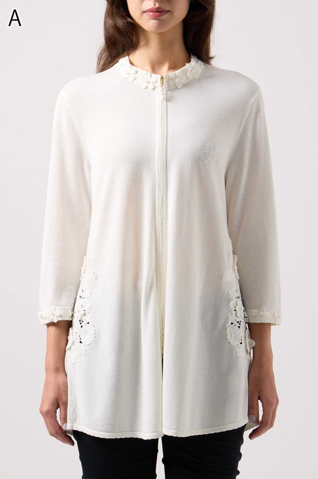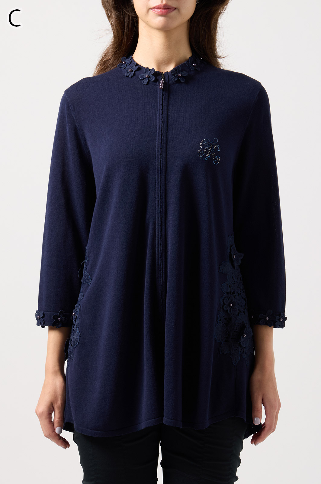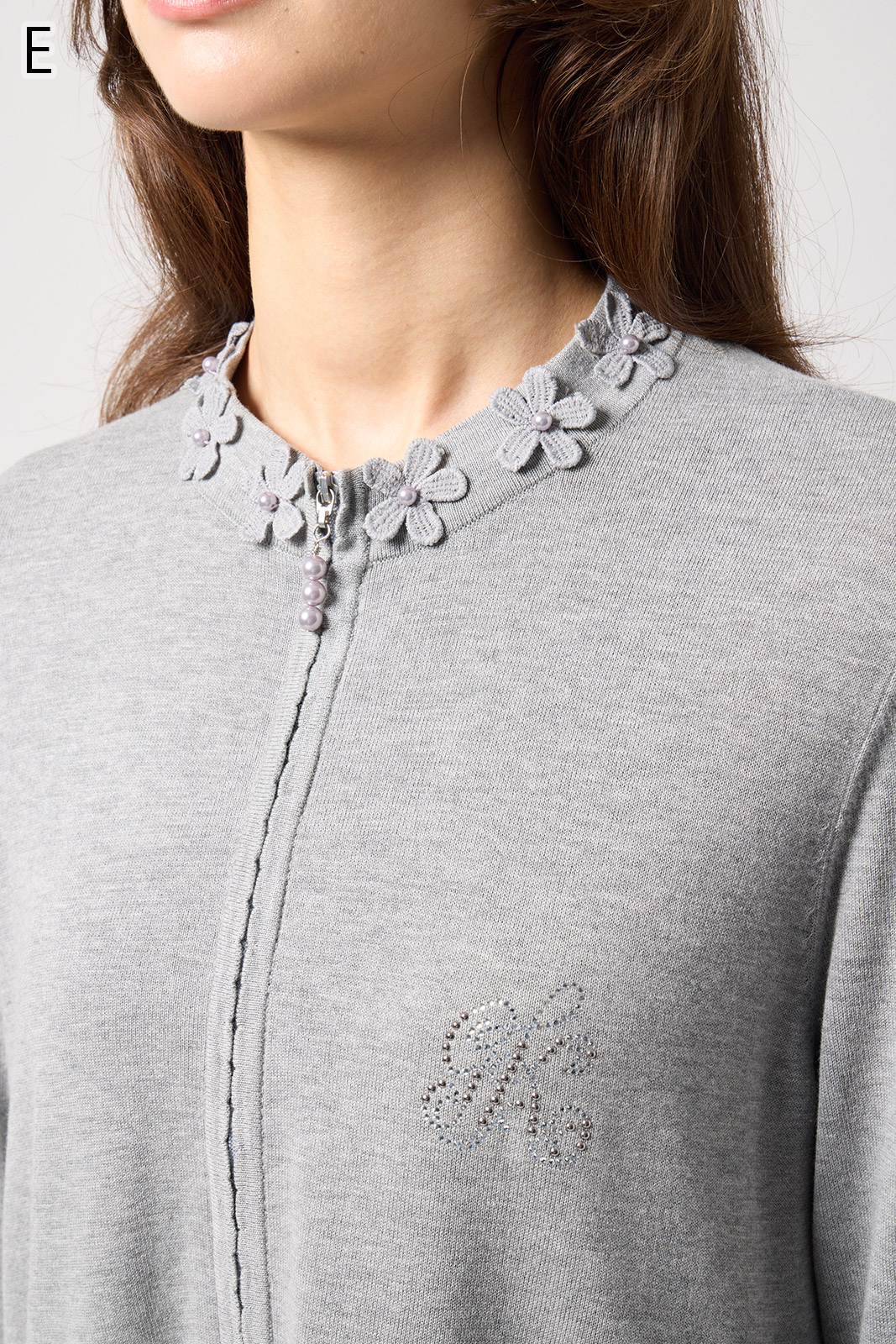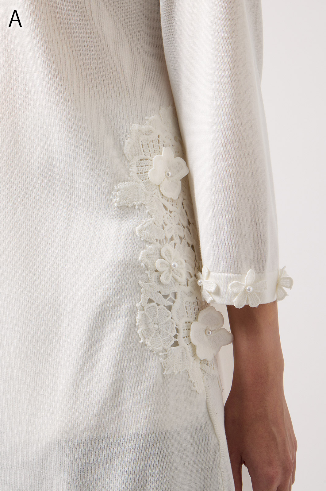 やわらかな綿混ニットに、同じ色のレースを組み合わせた花モチーフがポイント。可憐でやさしい印象のカーディガンは、羽織るだけでふんわり女性らしさをプラスしてくれます♪