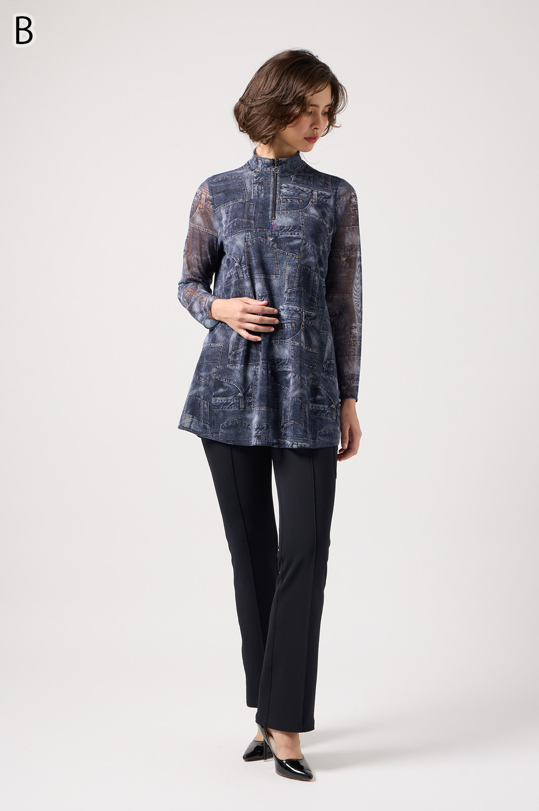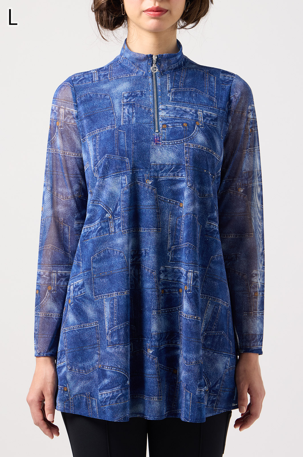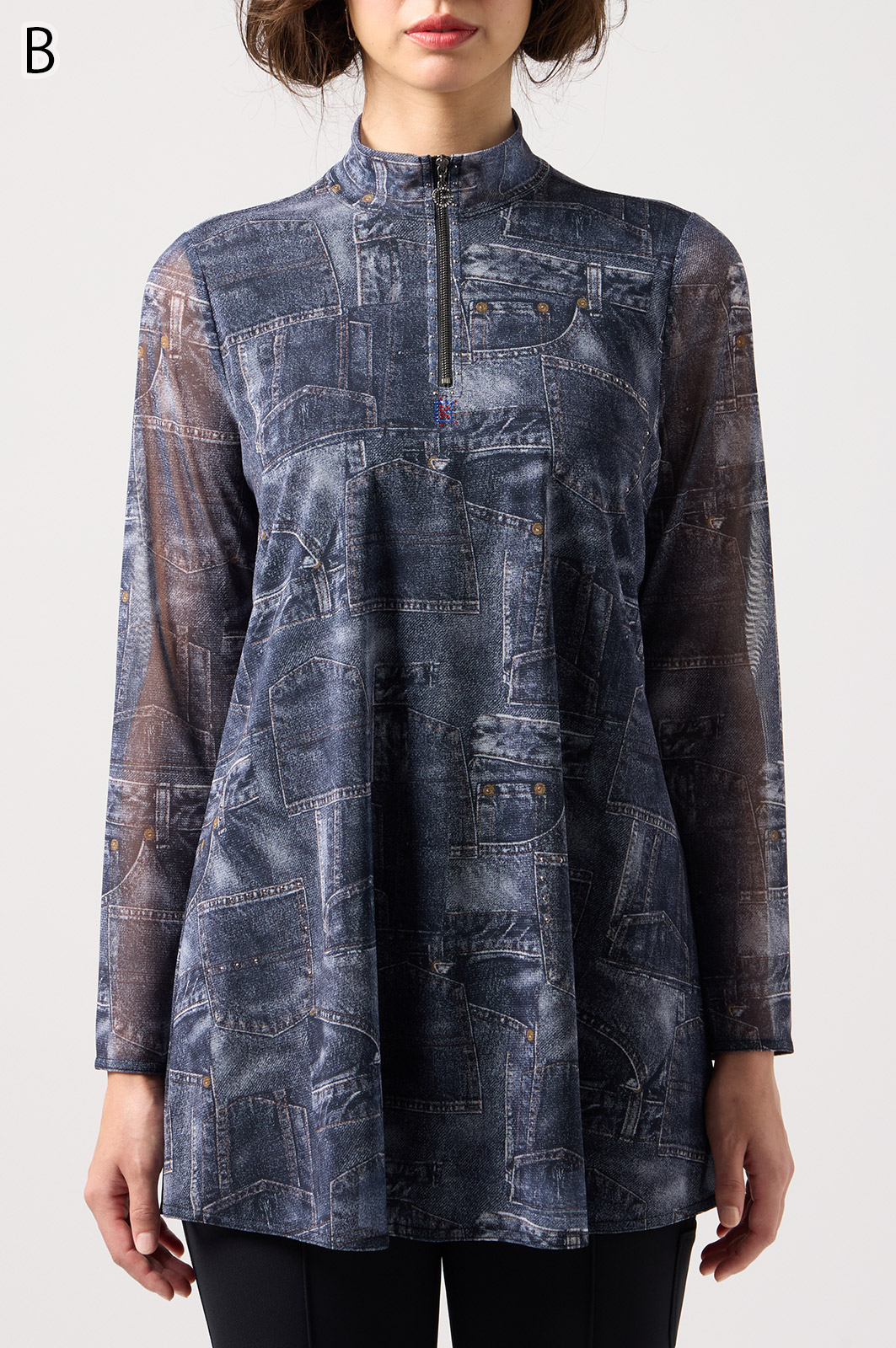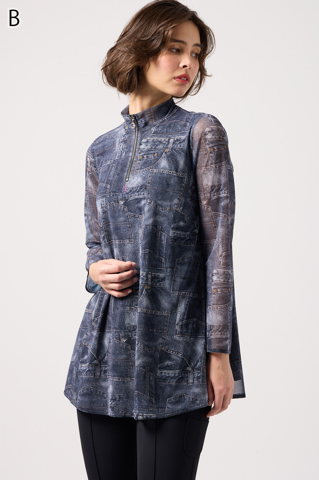 ジーンズ風プリントの透け感ある素材に、前身ごろだけ柔らかなニットを重ねたAラインTシャツ。動きやすく、体のラインをきれいに見せてくれるデザインです。