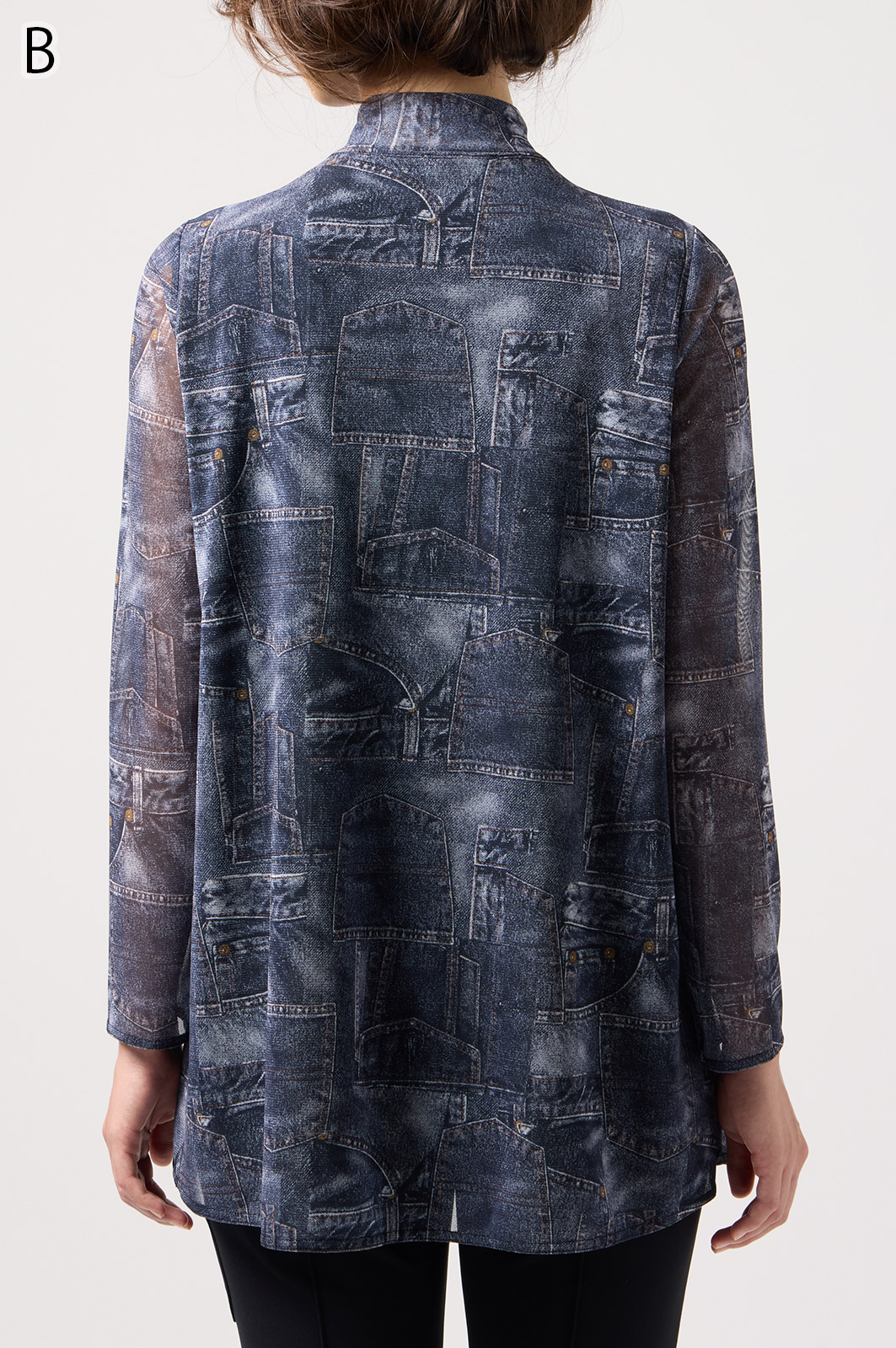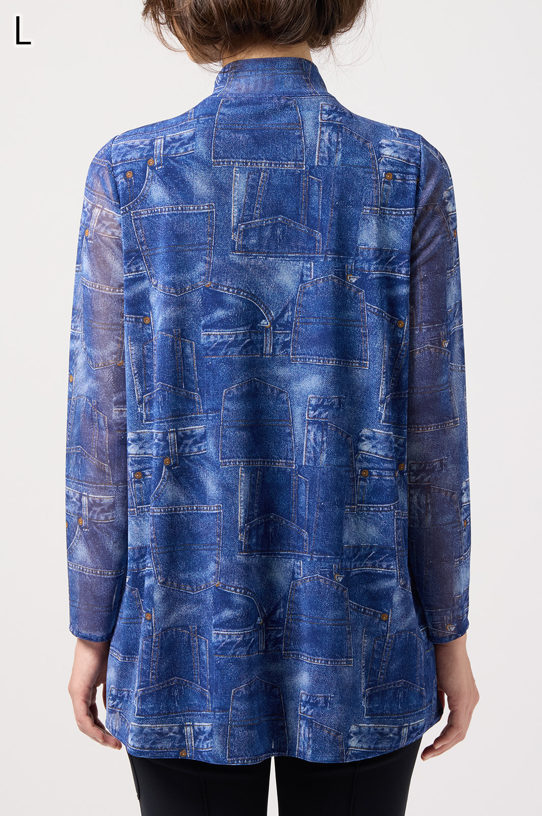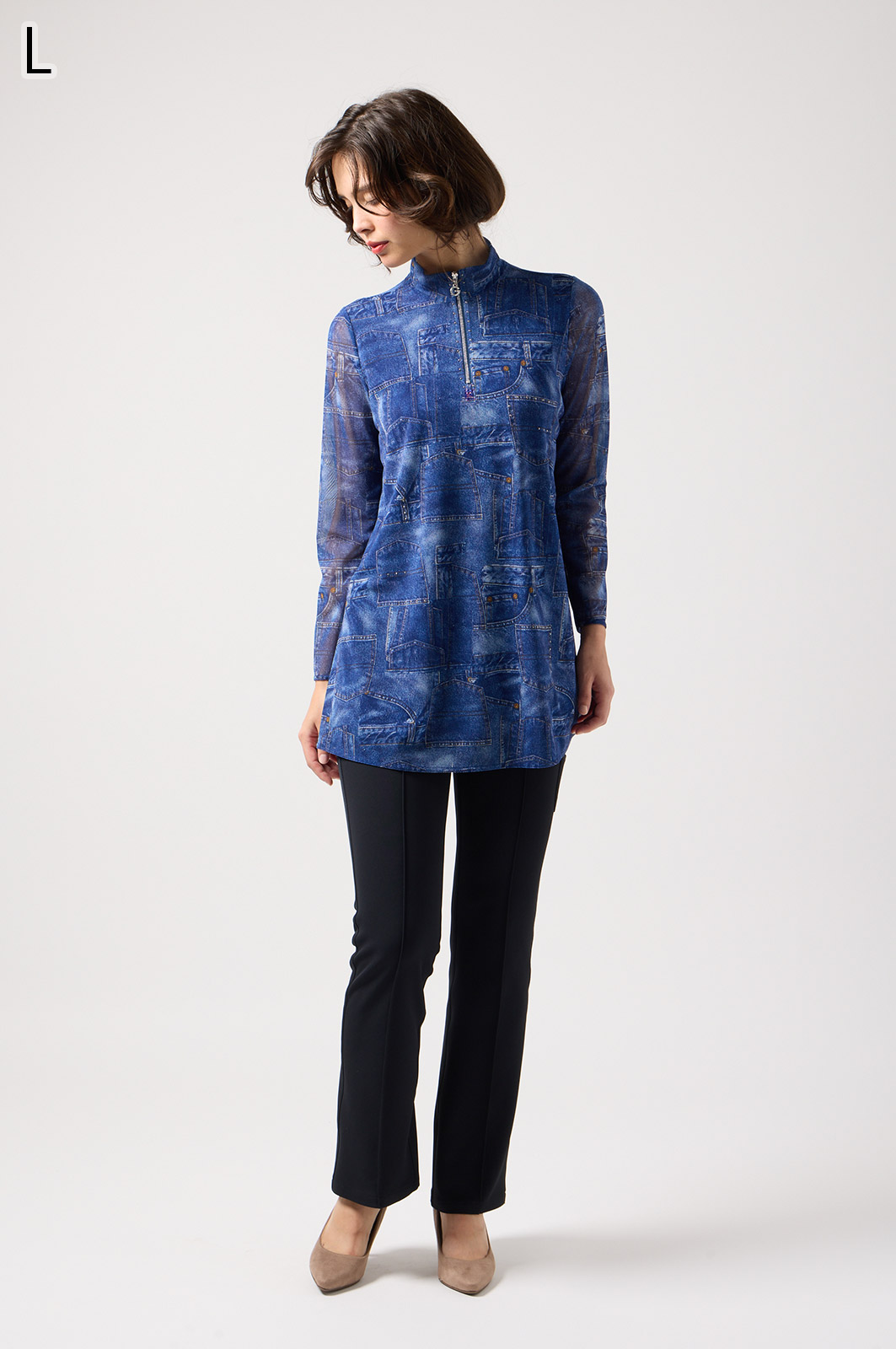 ジーンズ風プリントの透け感ある素材に、前身ごろだけ柔らかなニットを重ねたAラインTシャツ。動きやすく、体のラインをきれいに見せてくれるデザインです。
