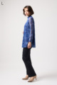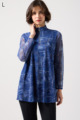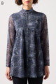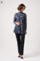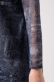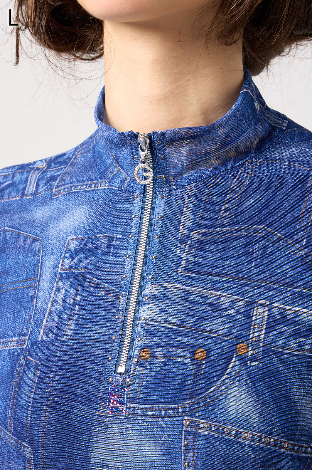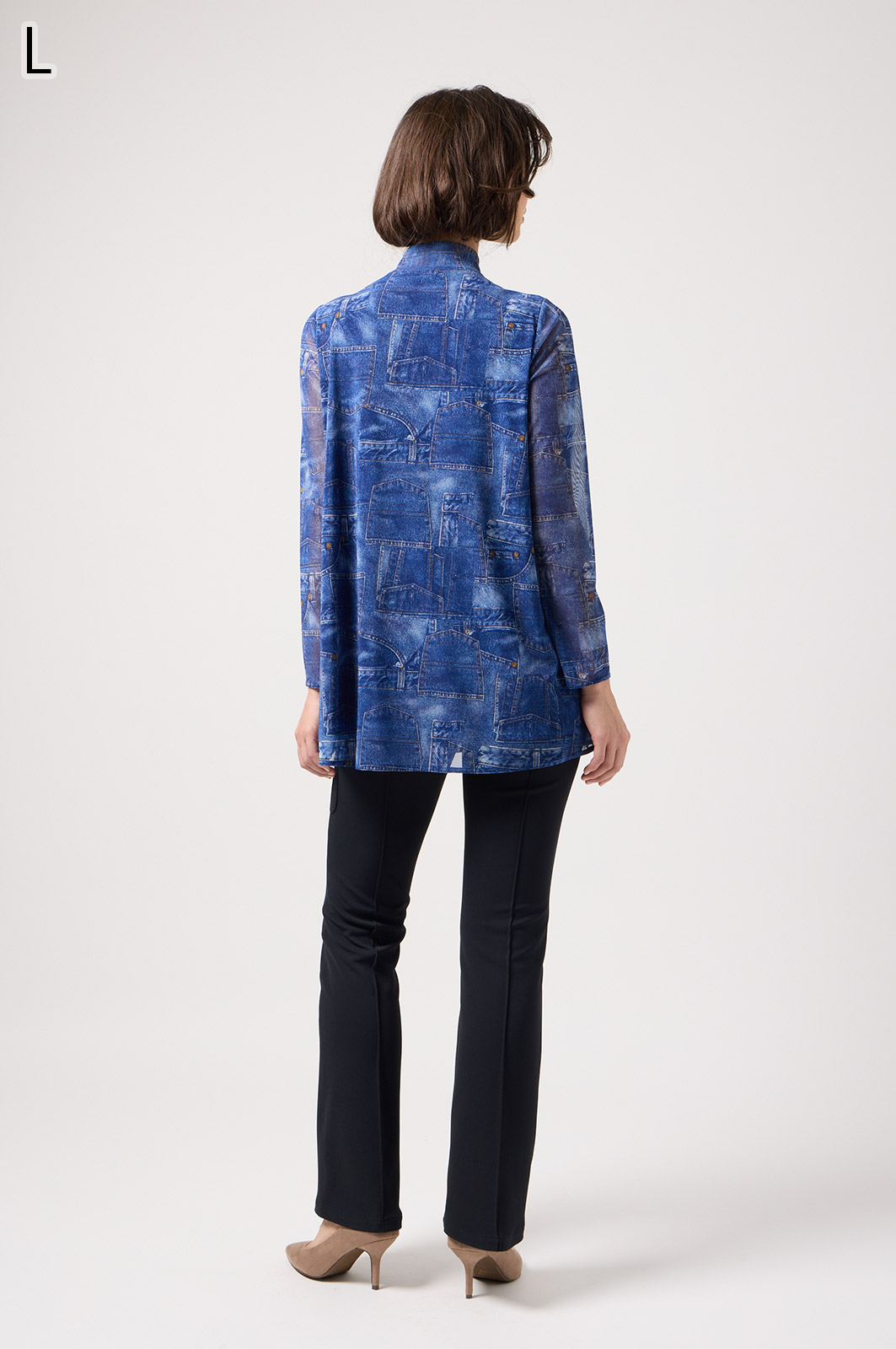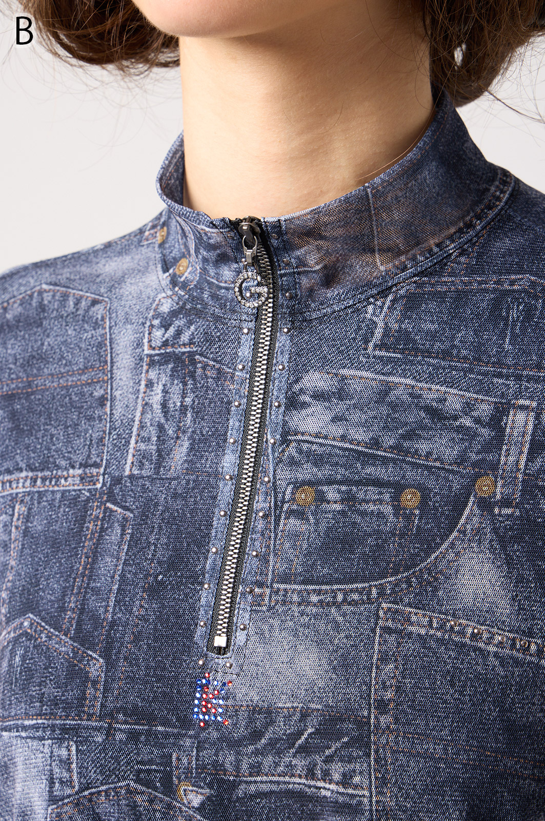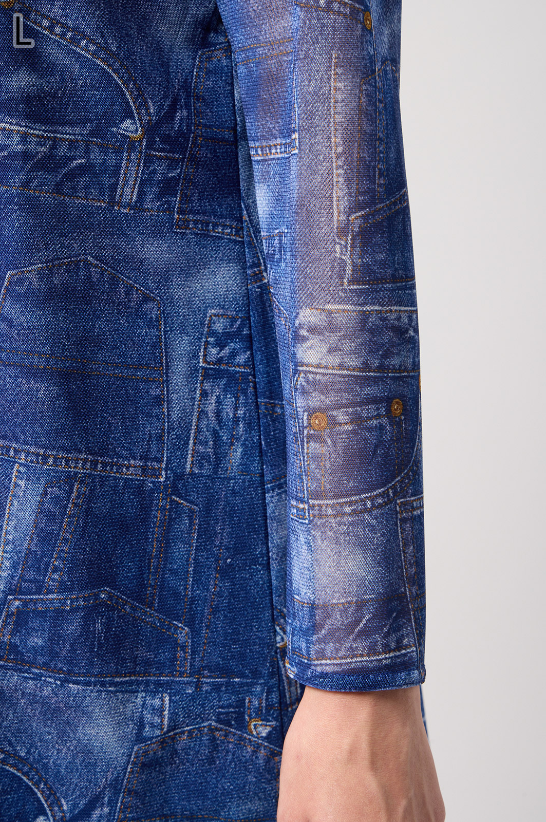 ジーンズ風プリントの透け感ある素材に、前身ごろだけ柔らかなニットを重ねたAラインTシャツ。動きやすく、体のラインをきれいに見せてくれるデザインです。