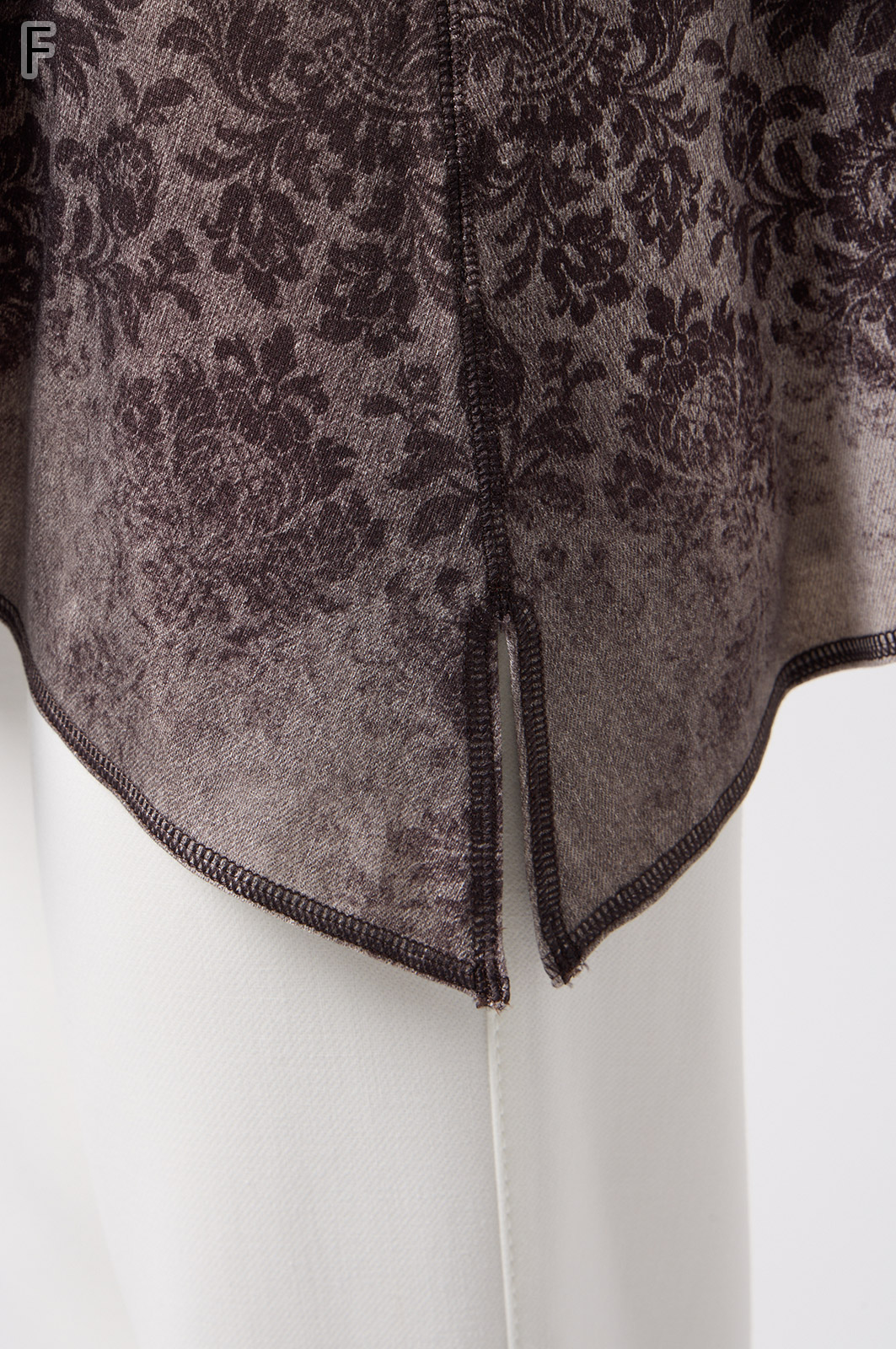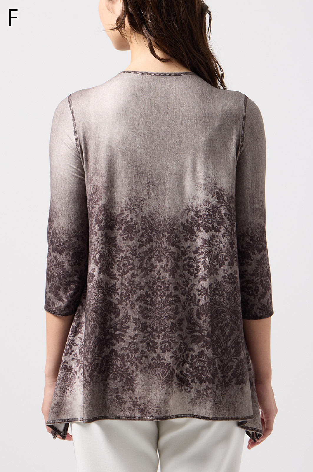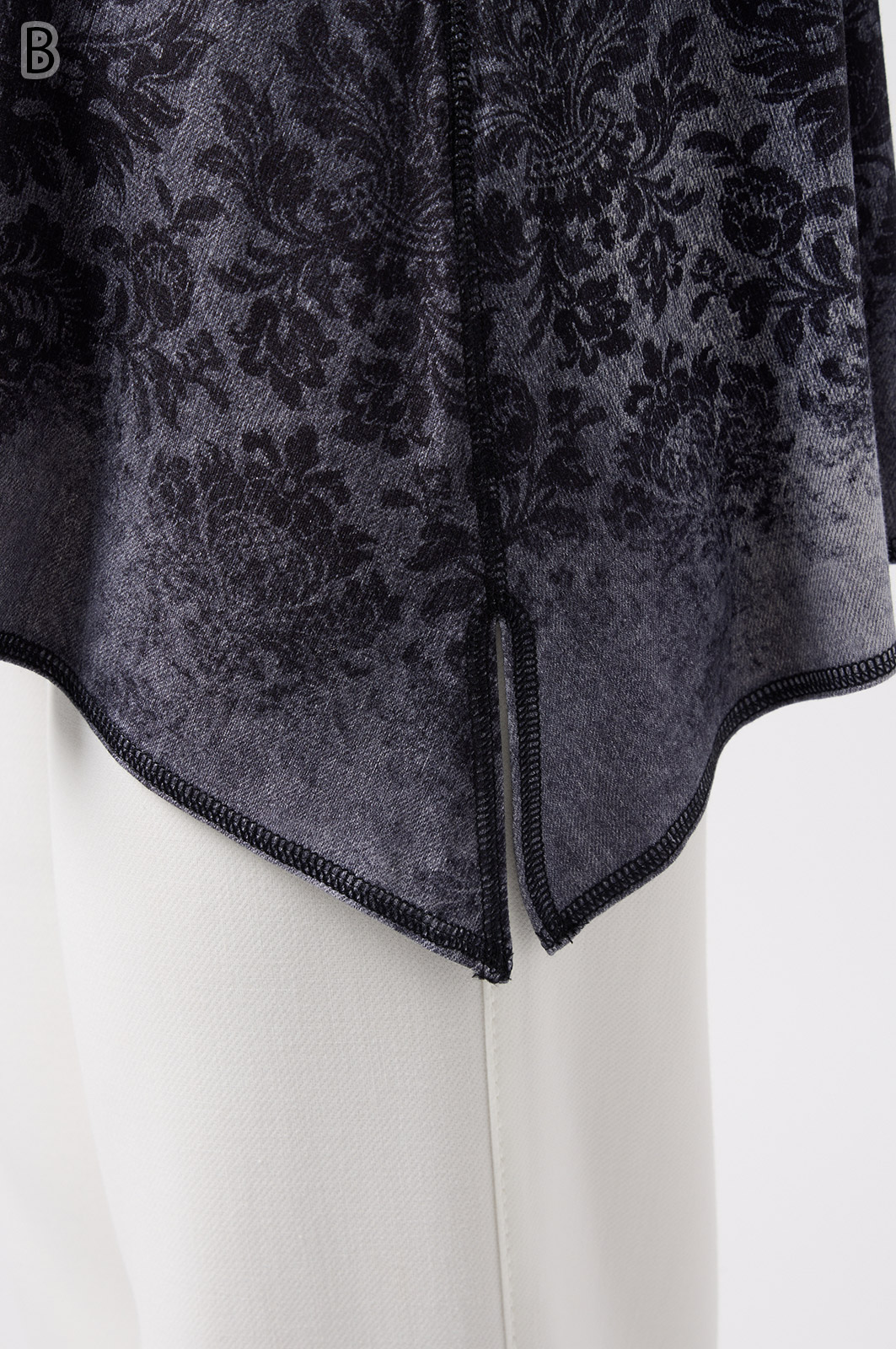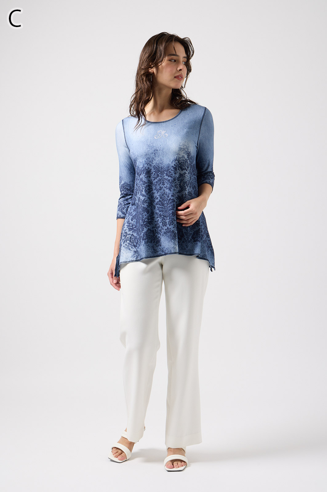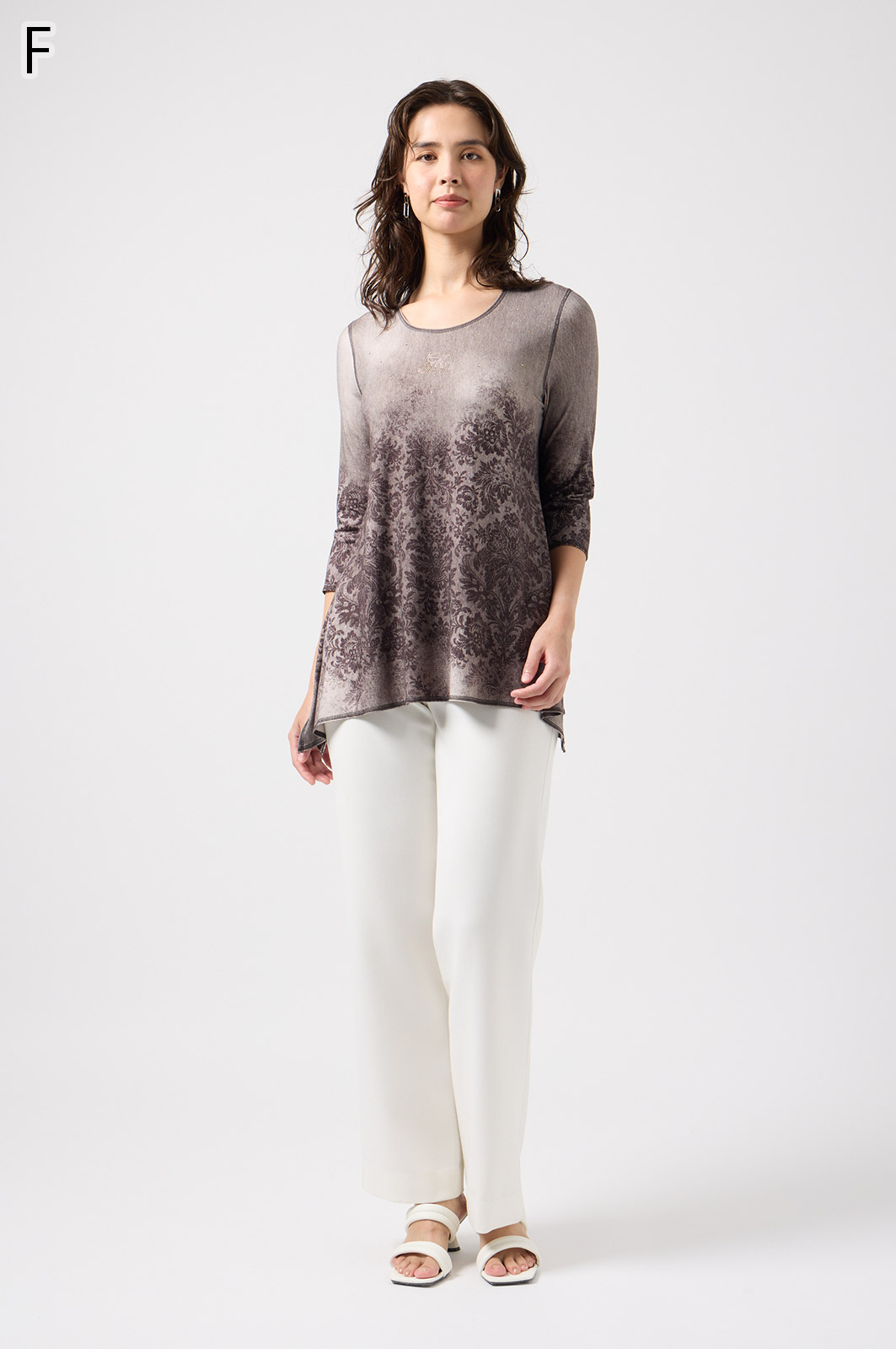 柔らかなレーヨンニットでドレープが美しいAラインTシャツ。腰をすっぽり隠す安心丈に、アラベスク調のプリントが上品な華やかさを添えます。